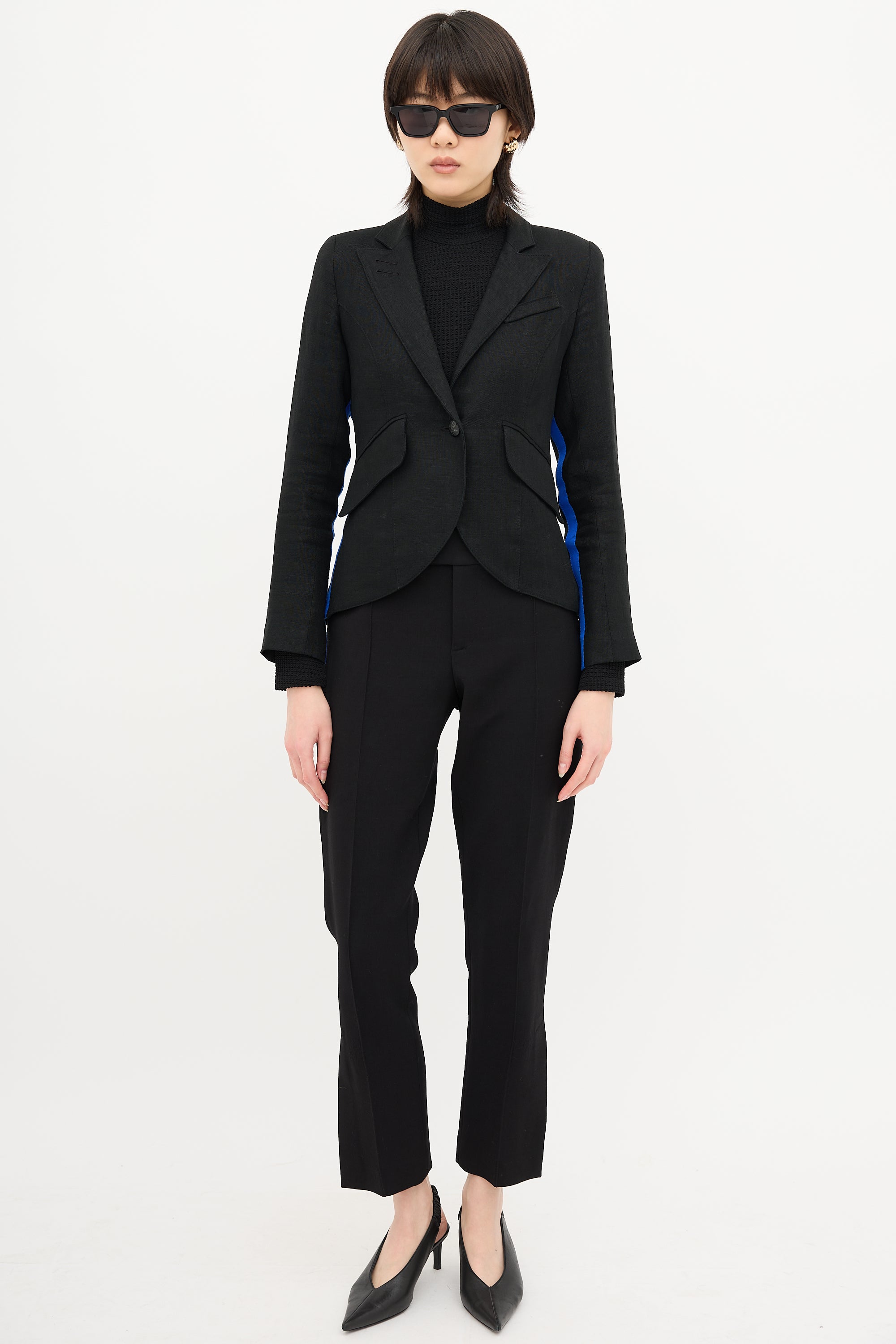 Pre-owned Smythe black linen One Button Tux Stripe blazer featuring peak lapel, single button front, decorative welt at left chest, two front pockets, blue side stripes, back double vent, and buttoned cuffs. Lined.