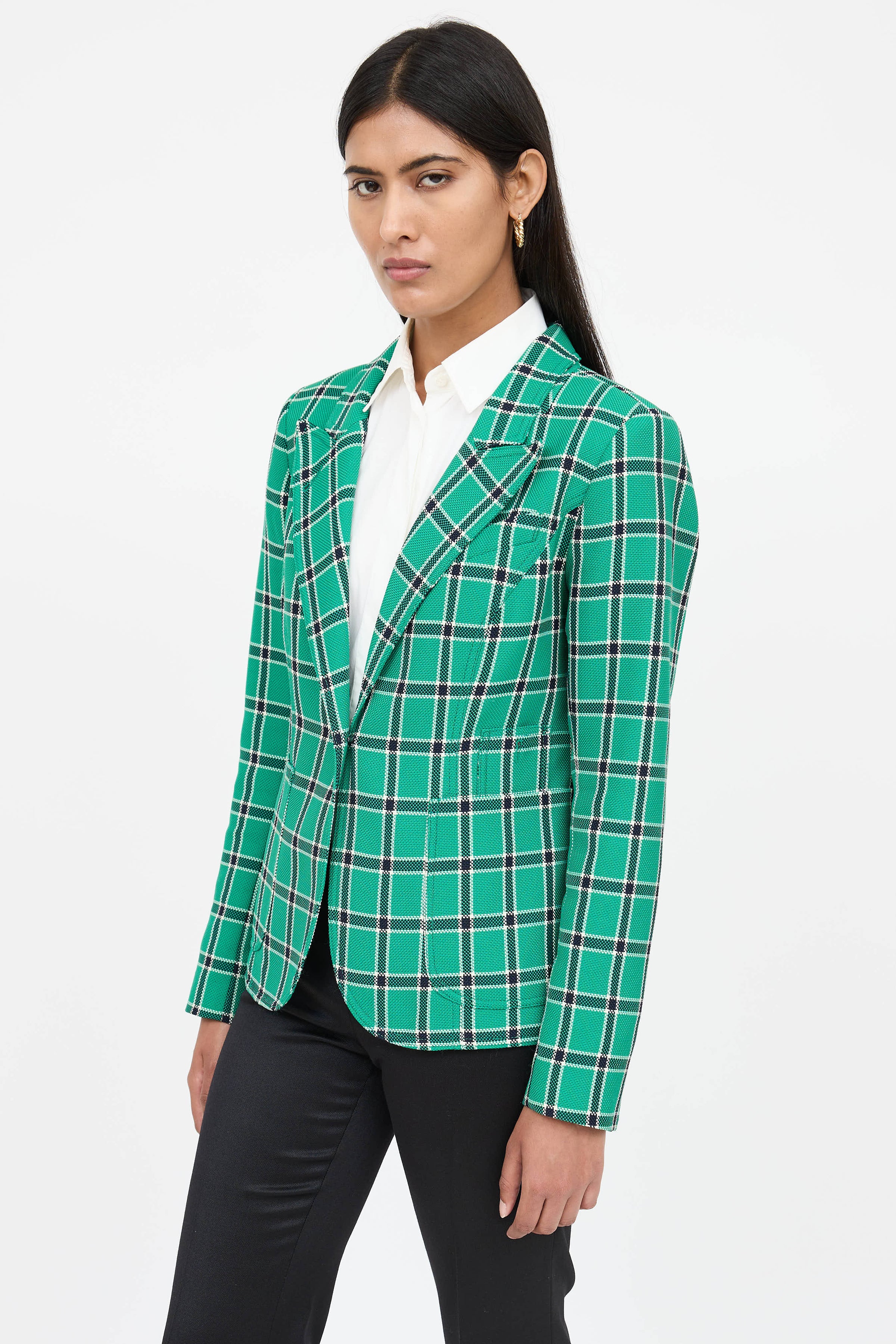 Pre-owned Smythe green plaid long sleeve blazer featuring peak lapel collar, decorative pocket at chest, embellished single button front, shoulder pads, patch pockets at side, gold tone buttoned cuffs, and back vent. Lined.