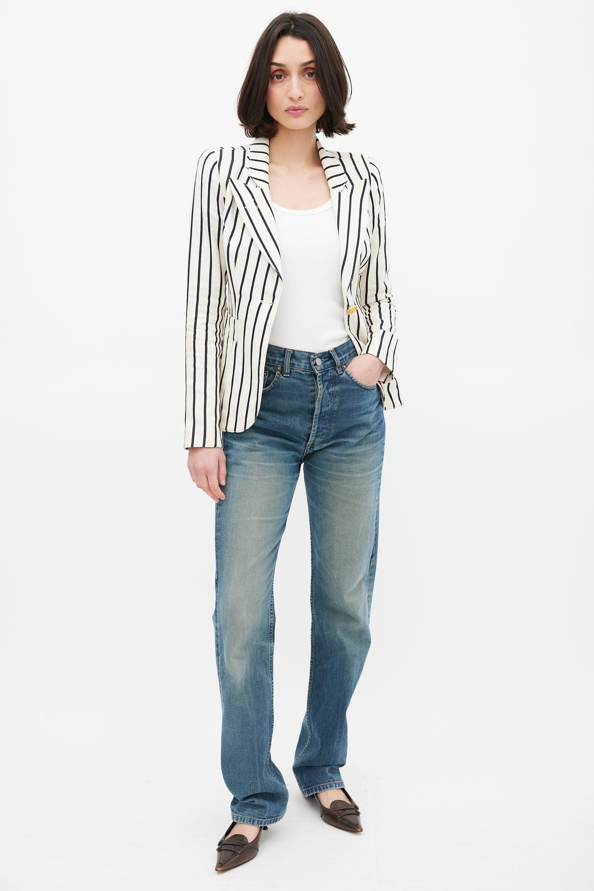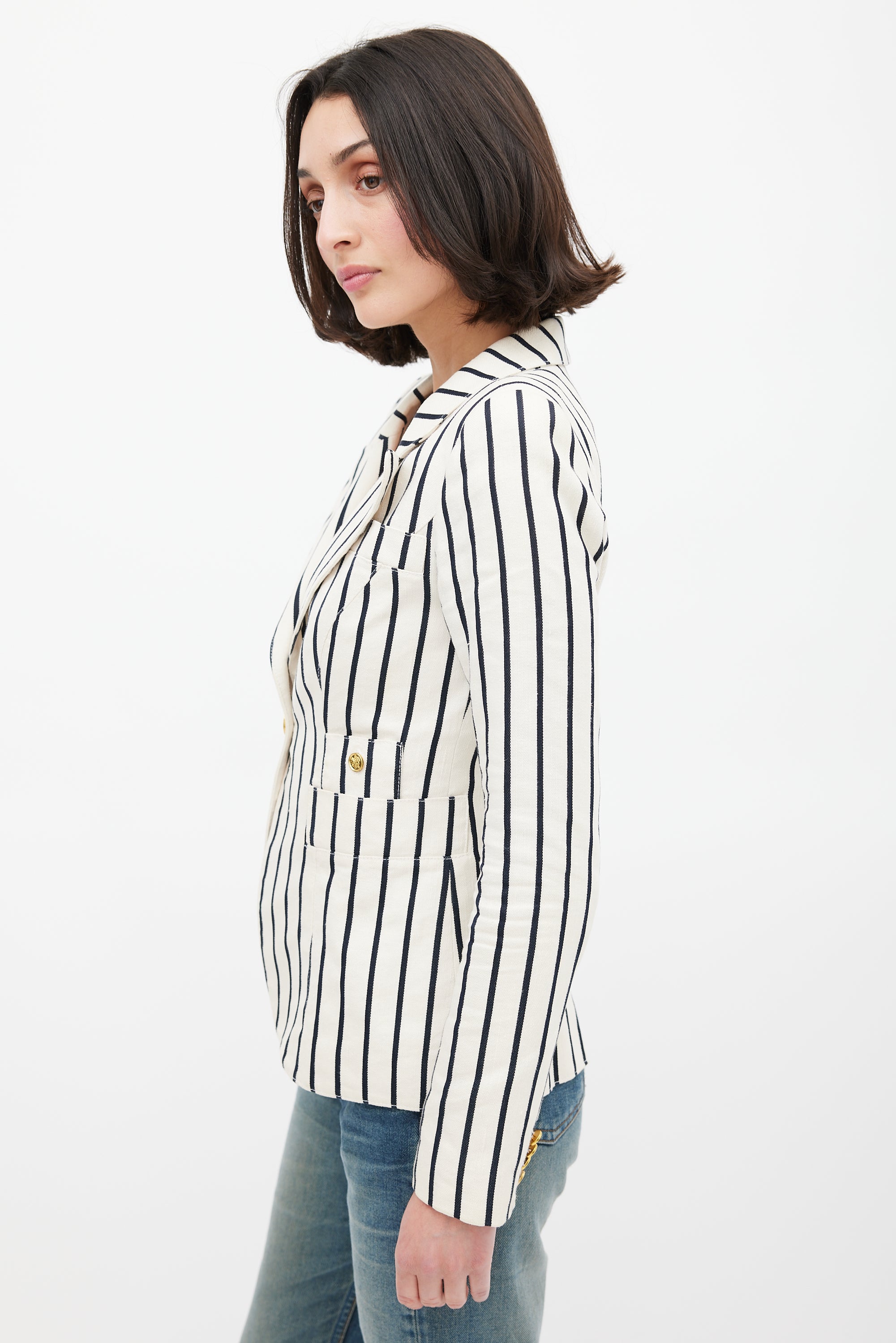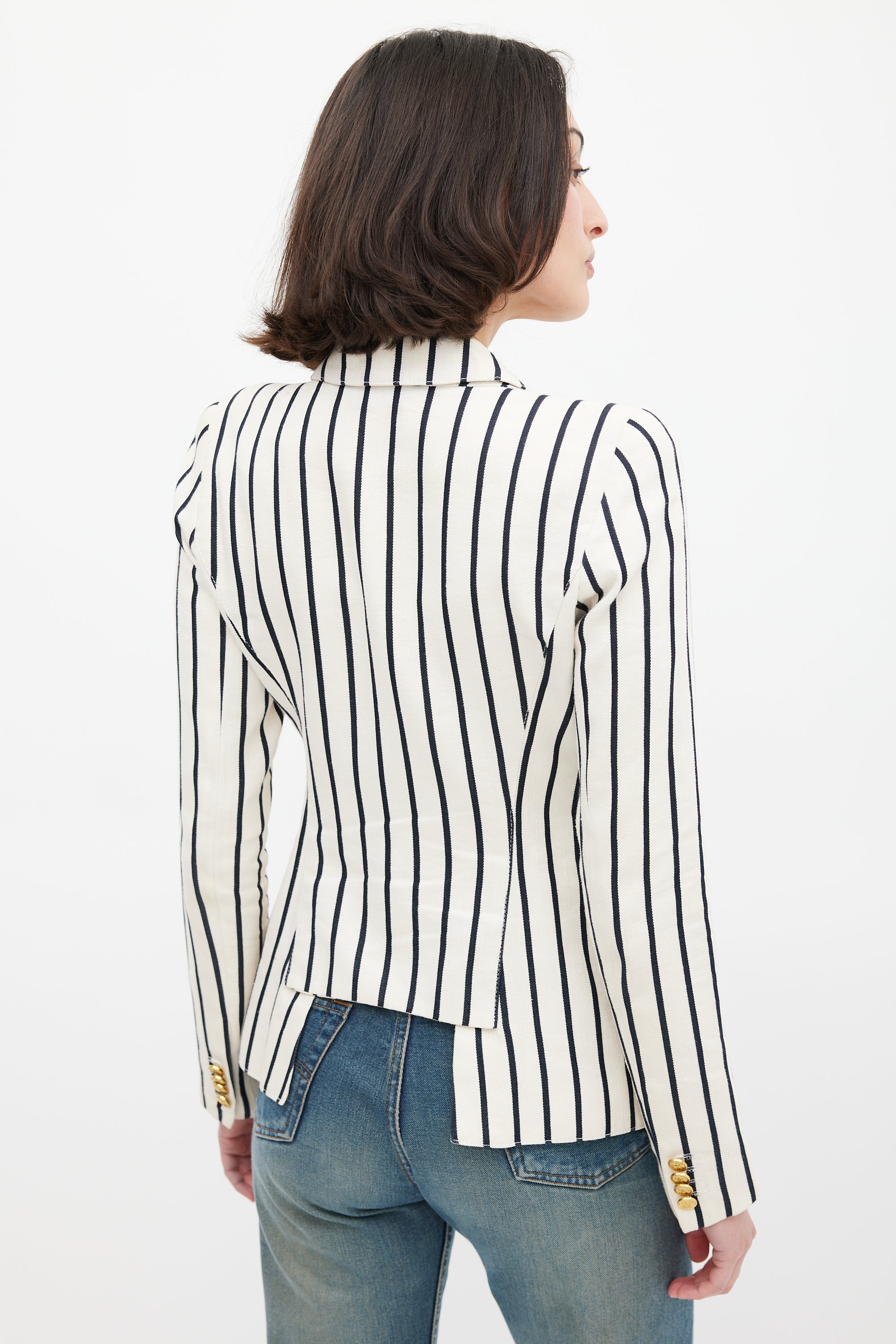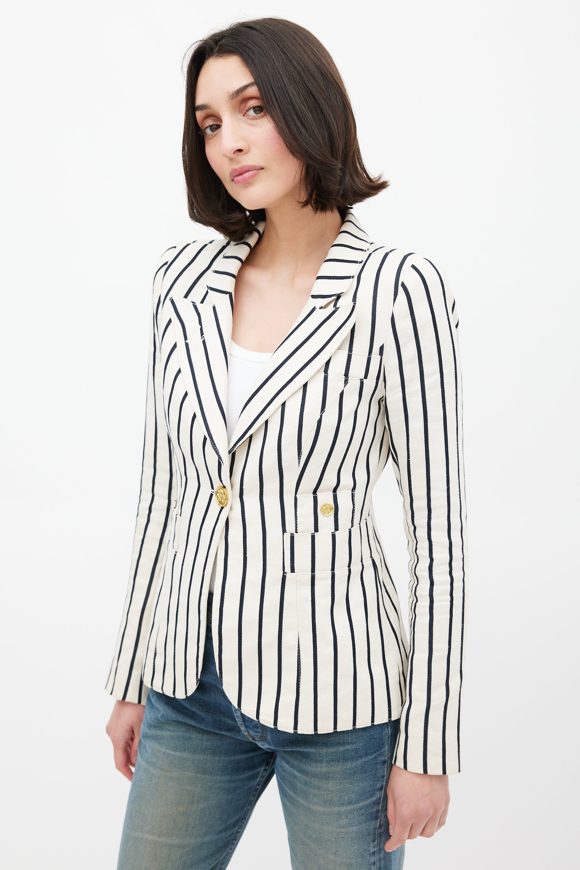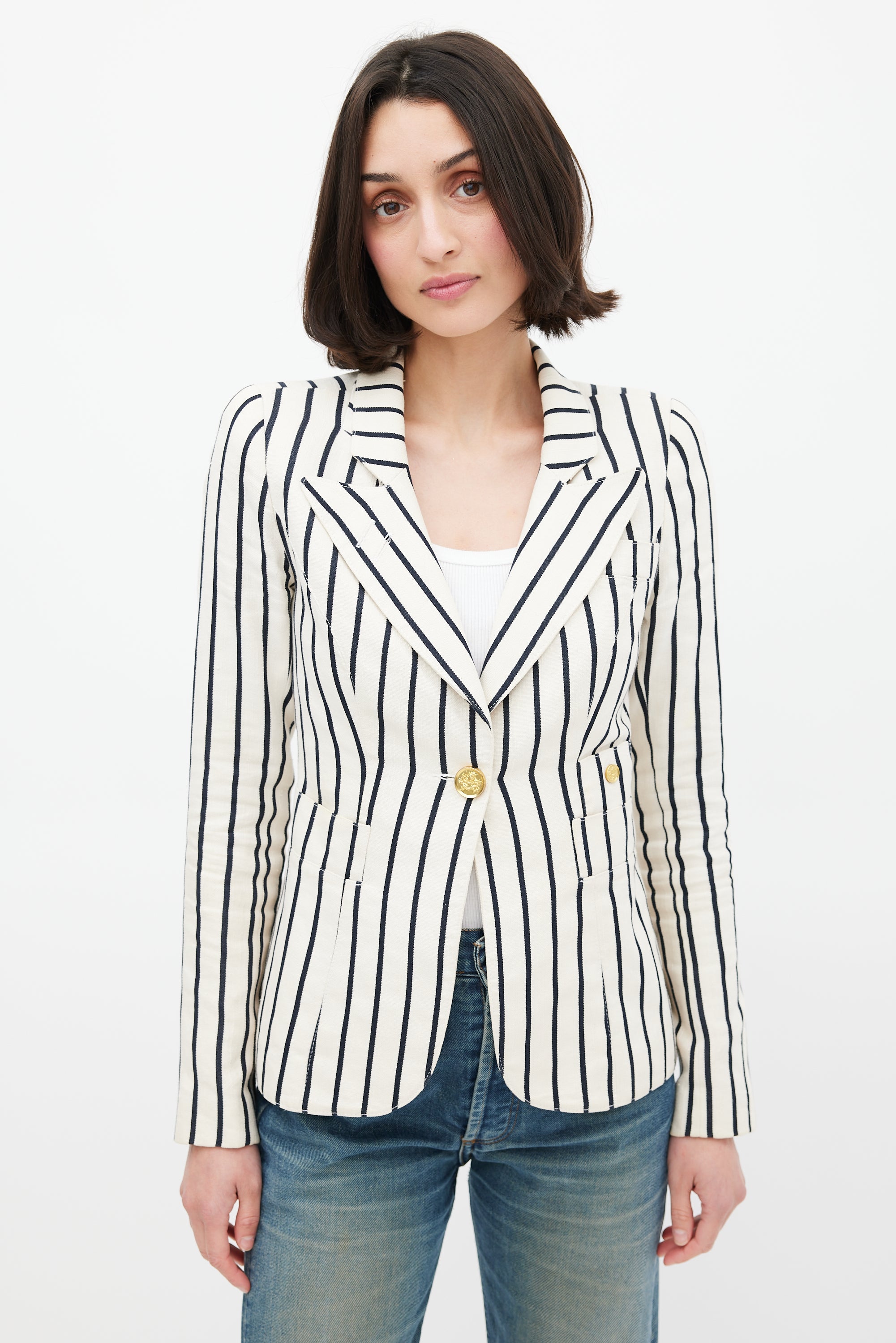 Pre-owned Smythe white and black Classic Duchess blazer featuring vertical stripes, peak lapel, single button front, decorative welt at left chest, three front pockets, cut out back vent, and buttoned cuffs. Lined.