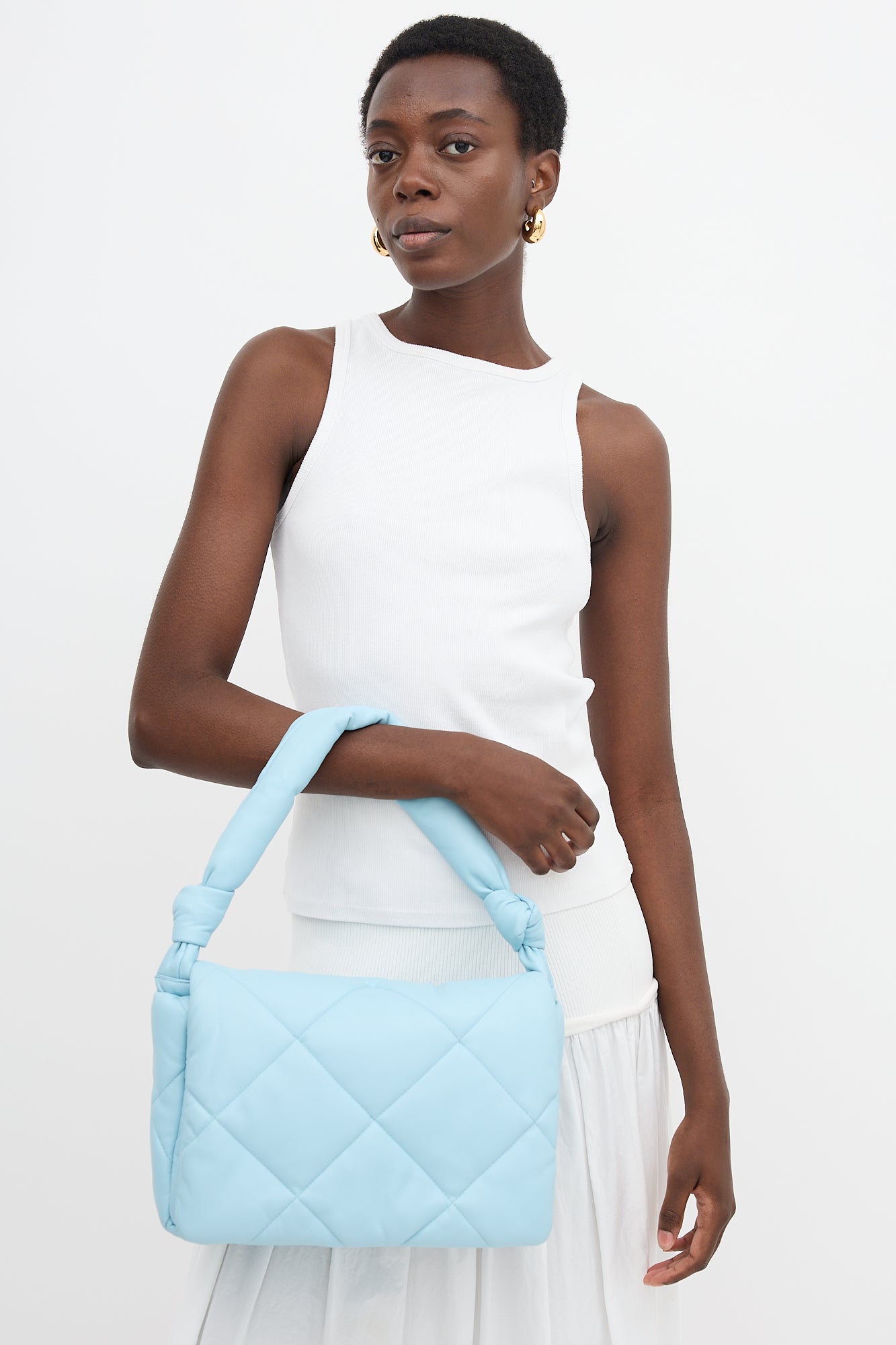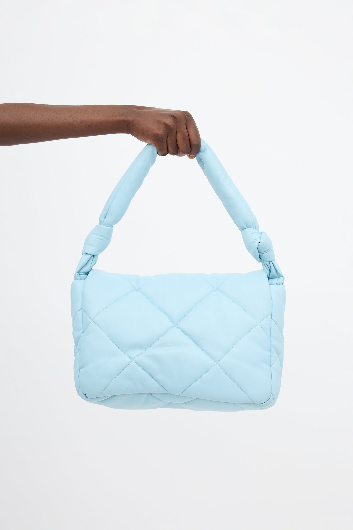 Pre-owned Stand Studio blue faux leather Mini Wanda bag featuring quilted detailing throughout, detachable padded shoulder strap, front flap with snap button closure, and one lined main compartment with one zip pocket. Comes with original dust bag.