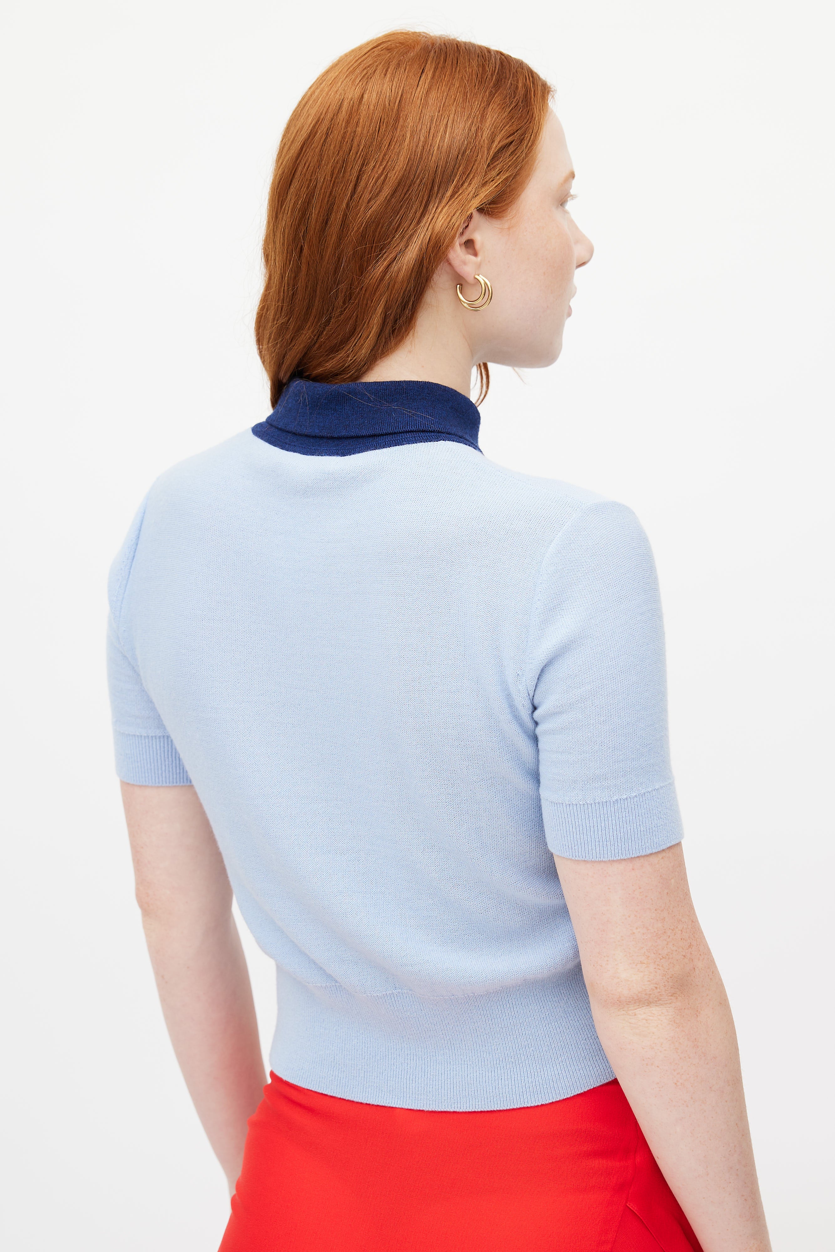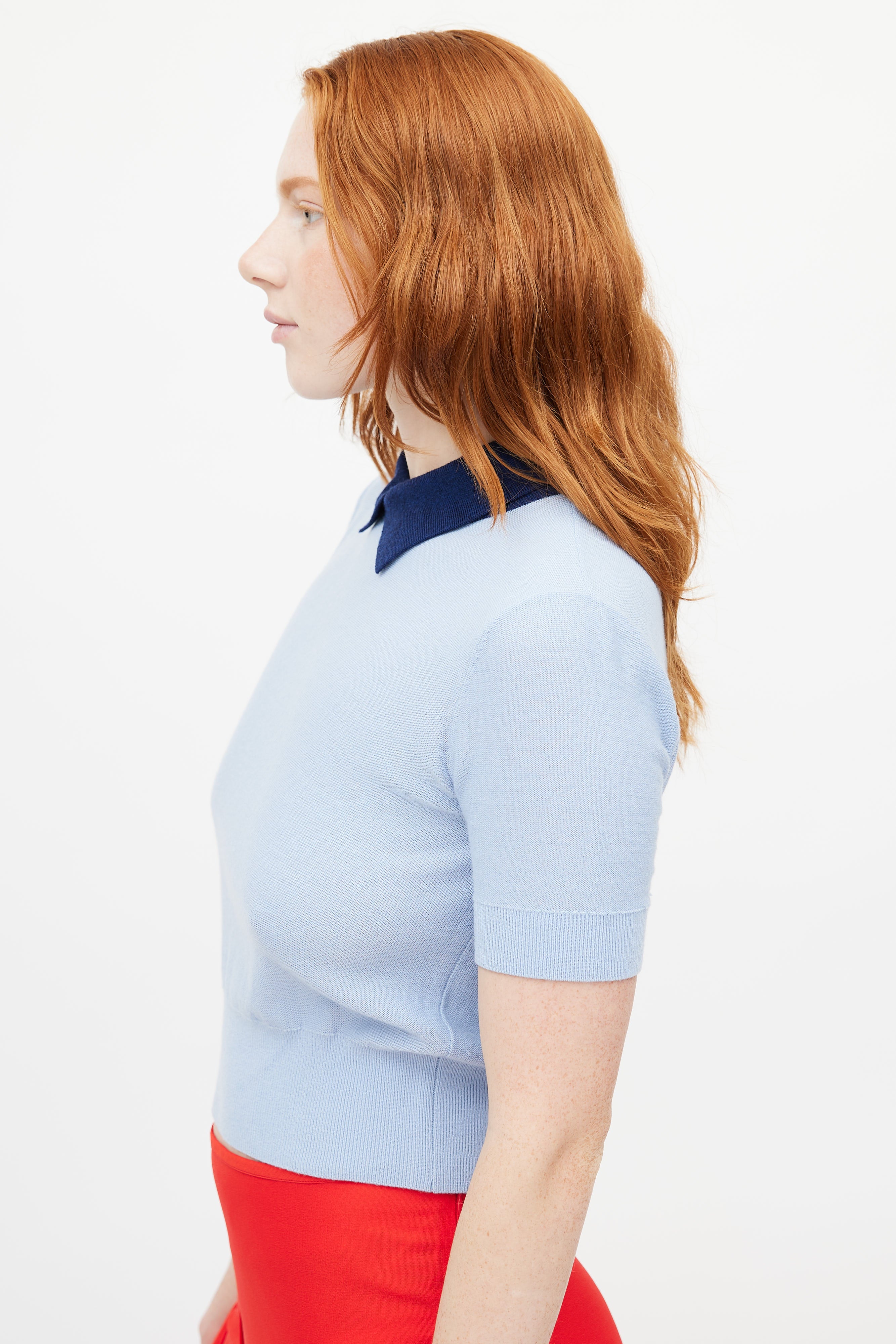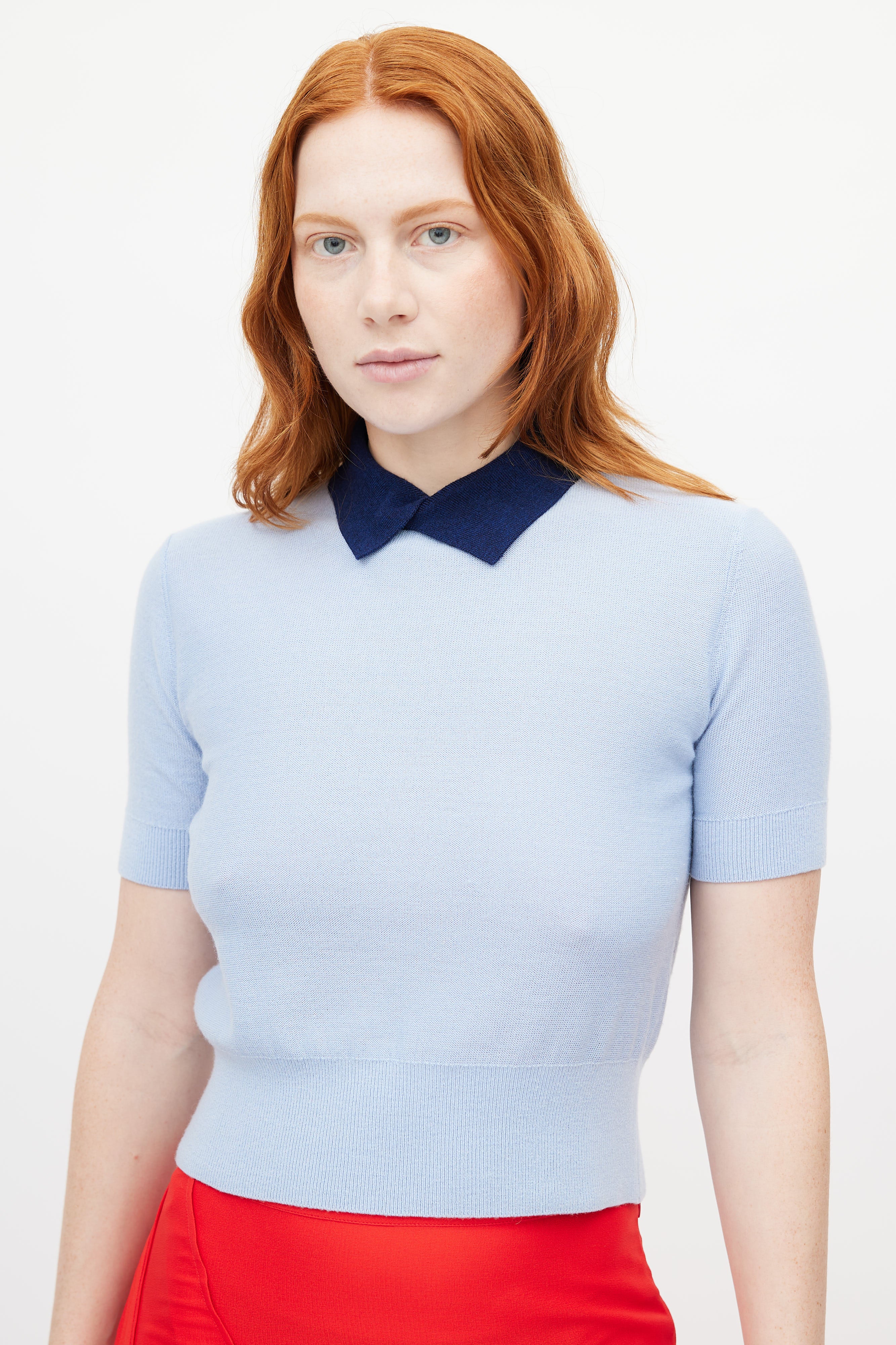 Pre-owned Staud blue knit top featuring a pointed collar, short sleeves, and ribbed hem.