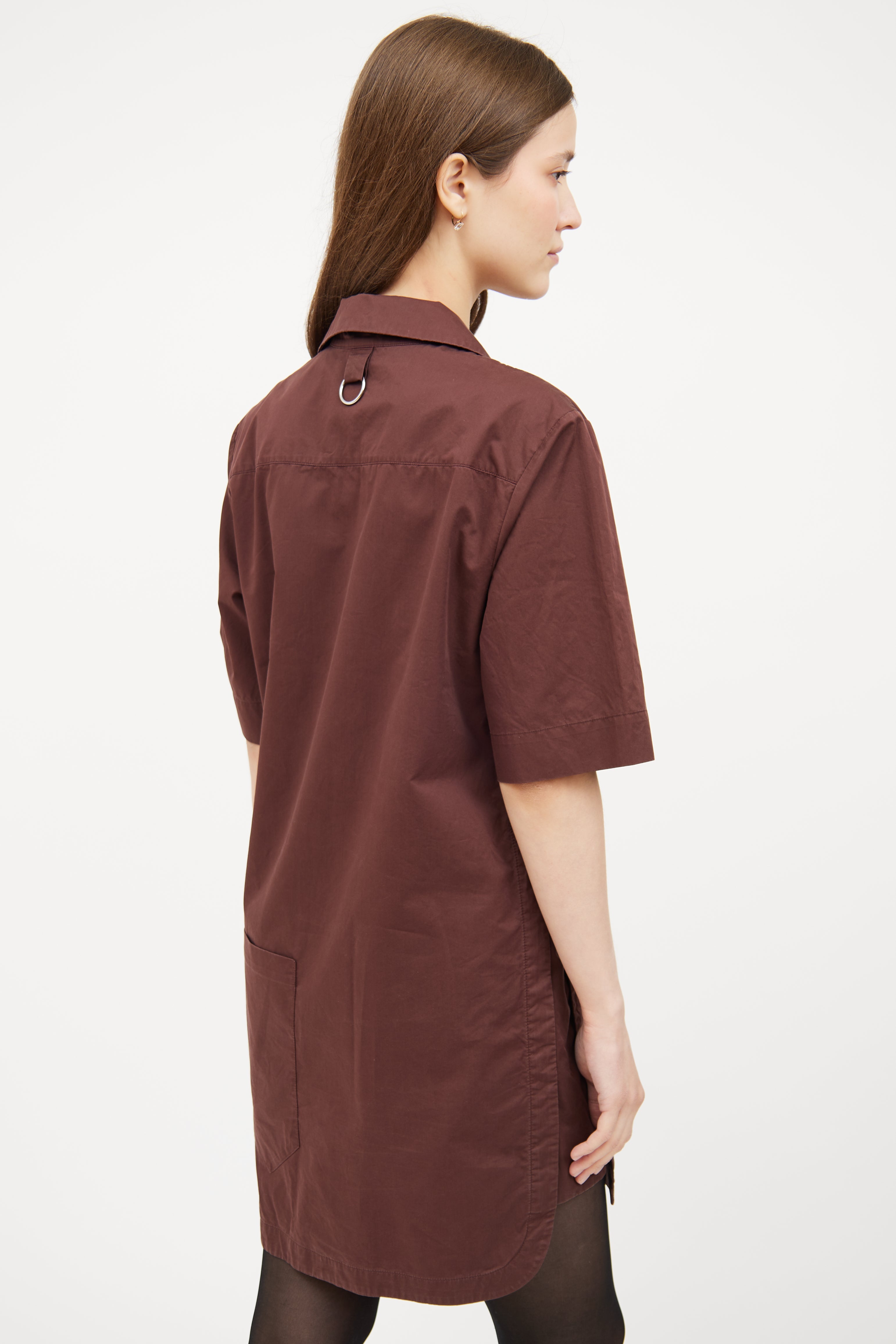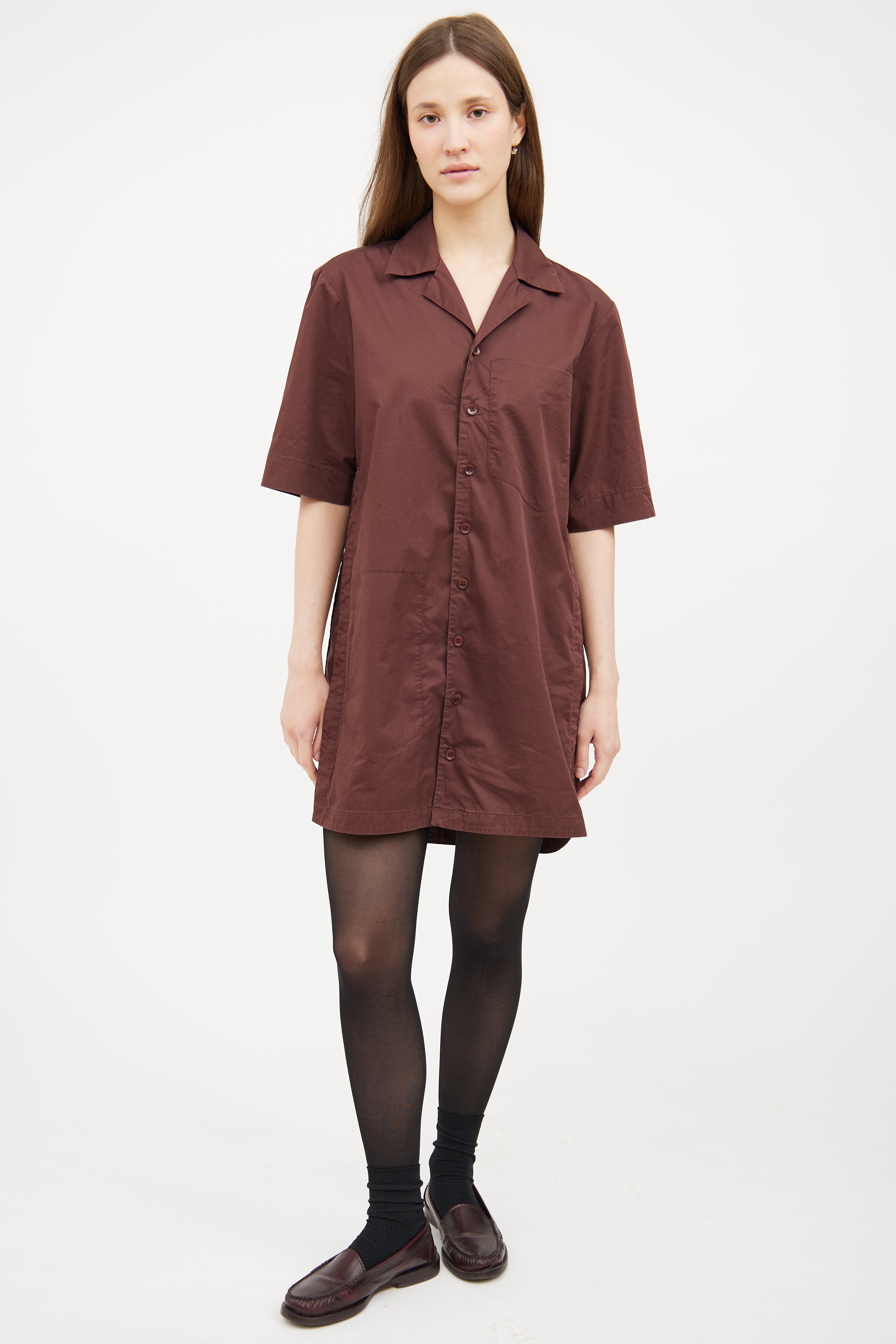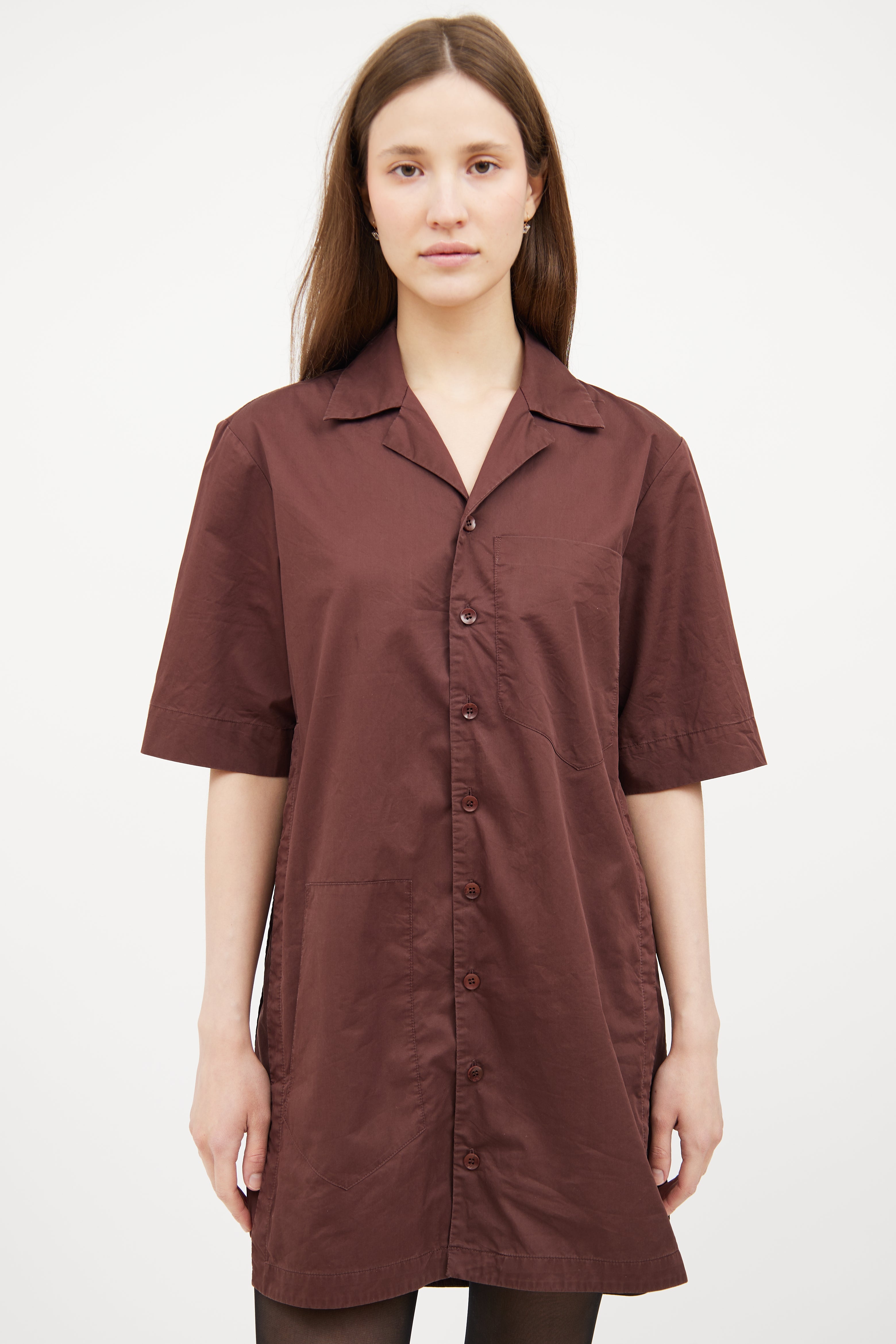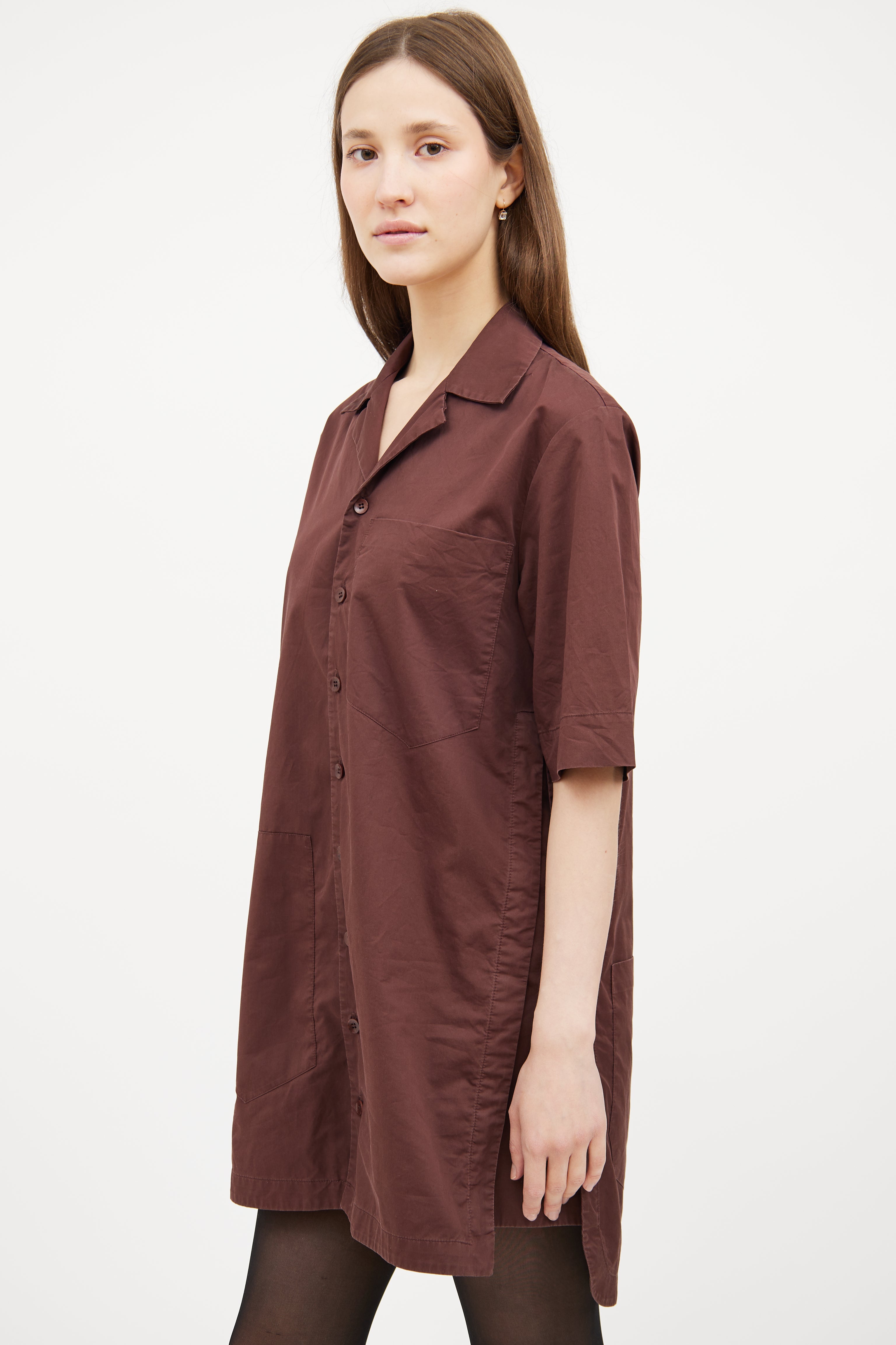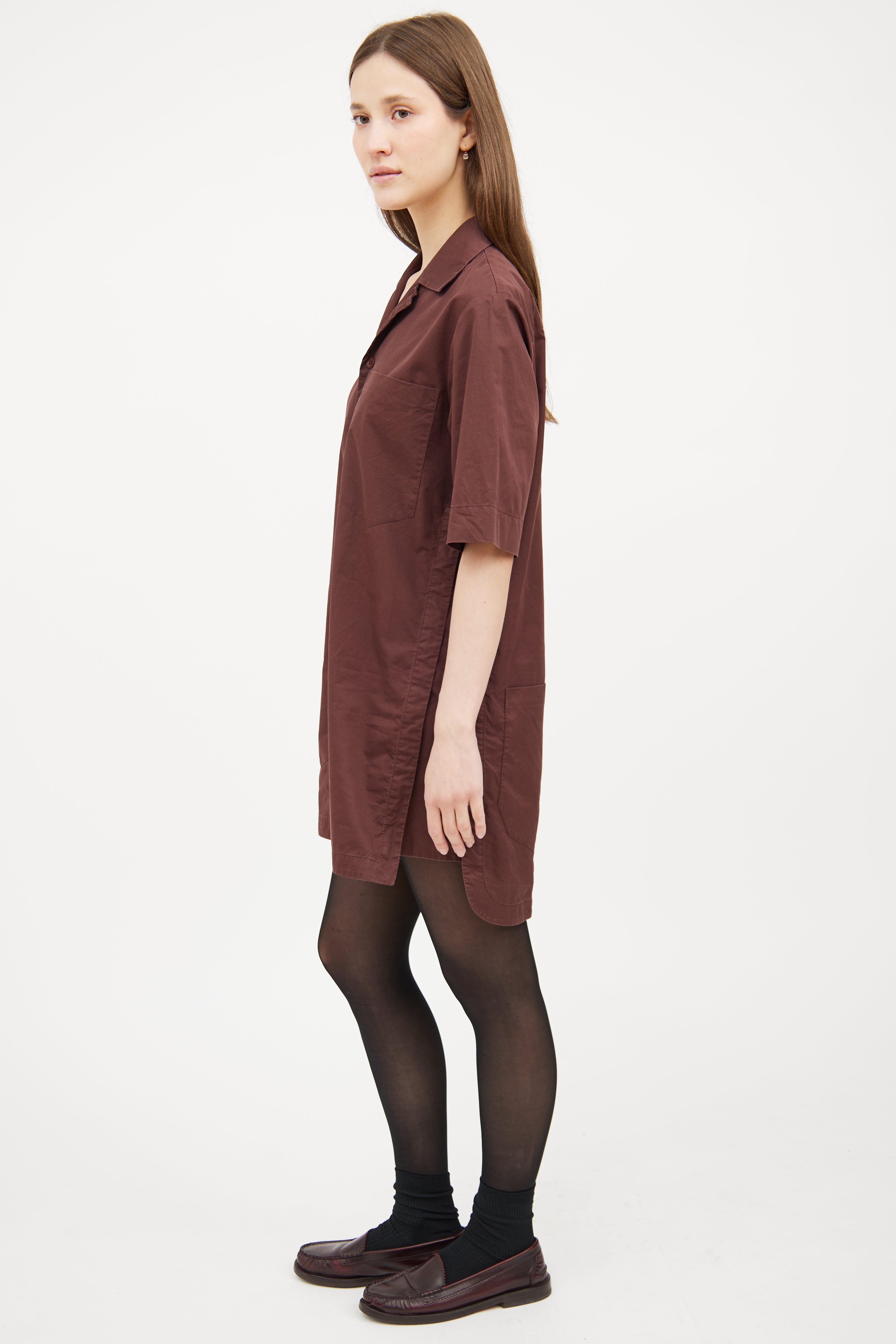 Pre-owned Tibi brown short sleeve shirt dress featuring notch lapel collar, button up, slip pocket on left chest. slip pocket on back near hem, closed side vents and pull tab with silver tone hardware on back of neck.