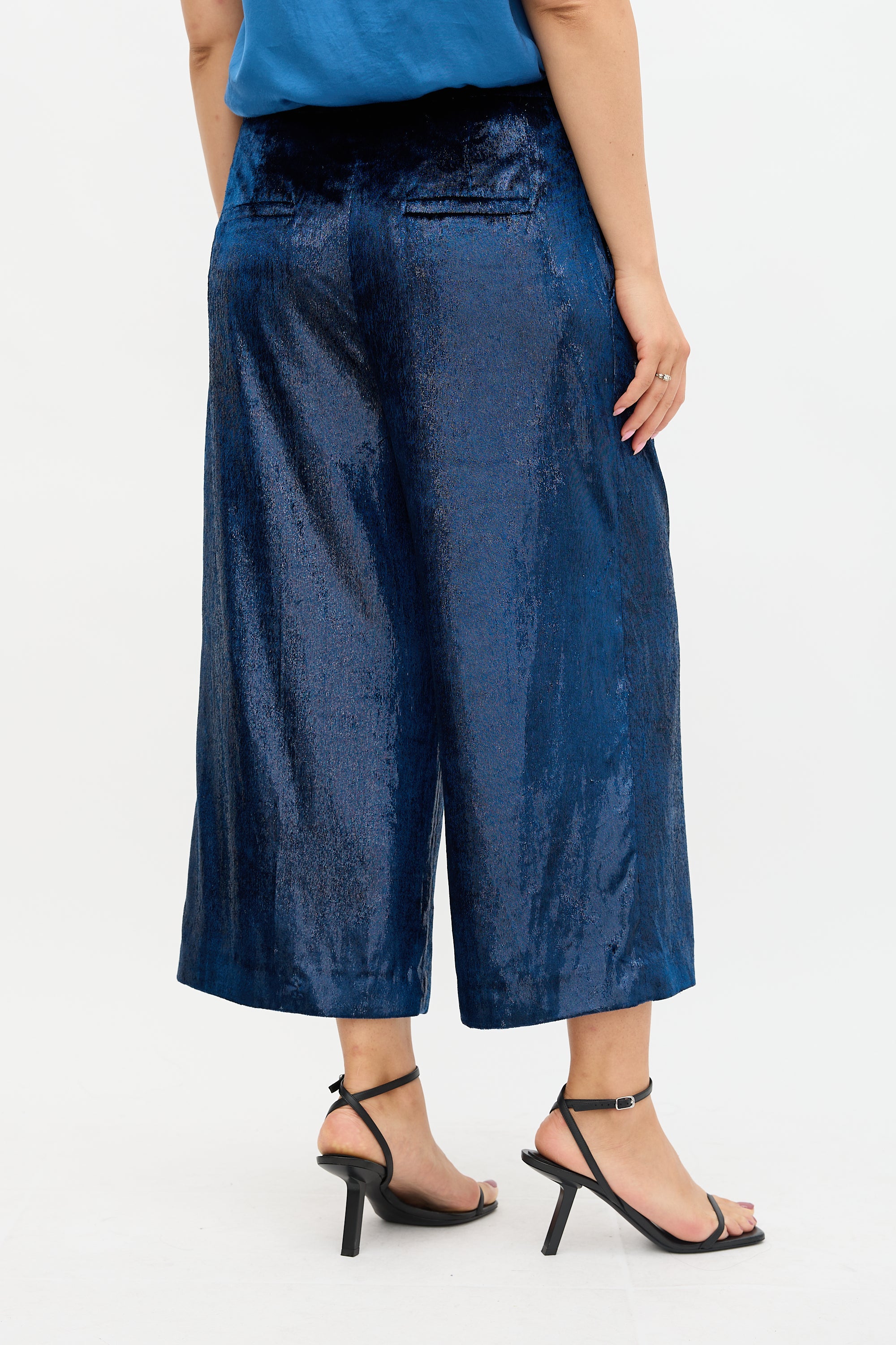 Pre-owned Tibi blue metallic shiny velvet pants featuring a zip fly with hook fastening, pleated front, four pocket styling, and a wide leg with a cropped hem.