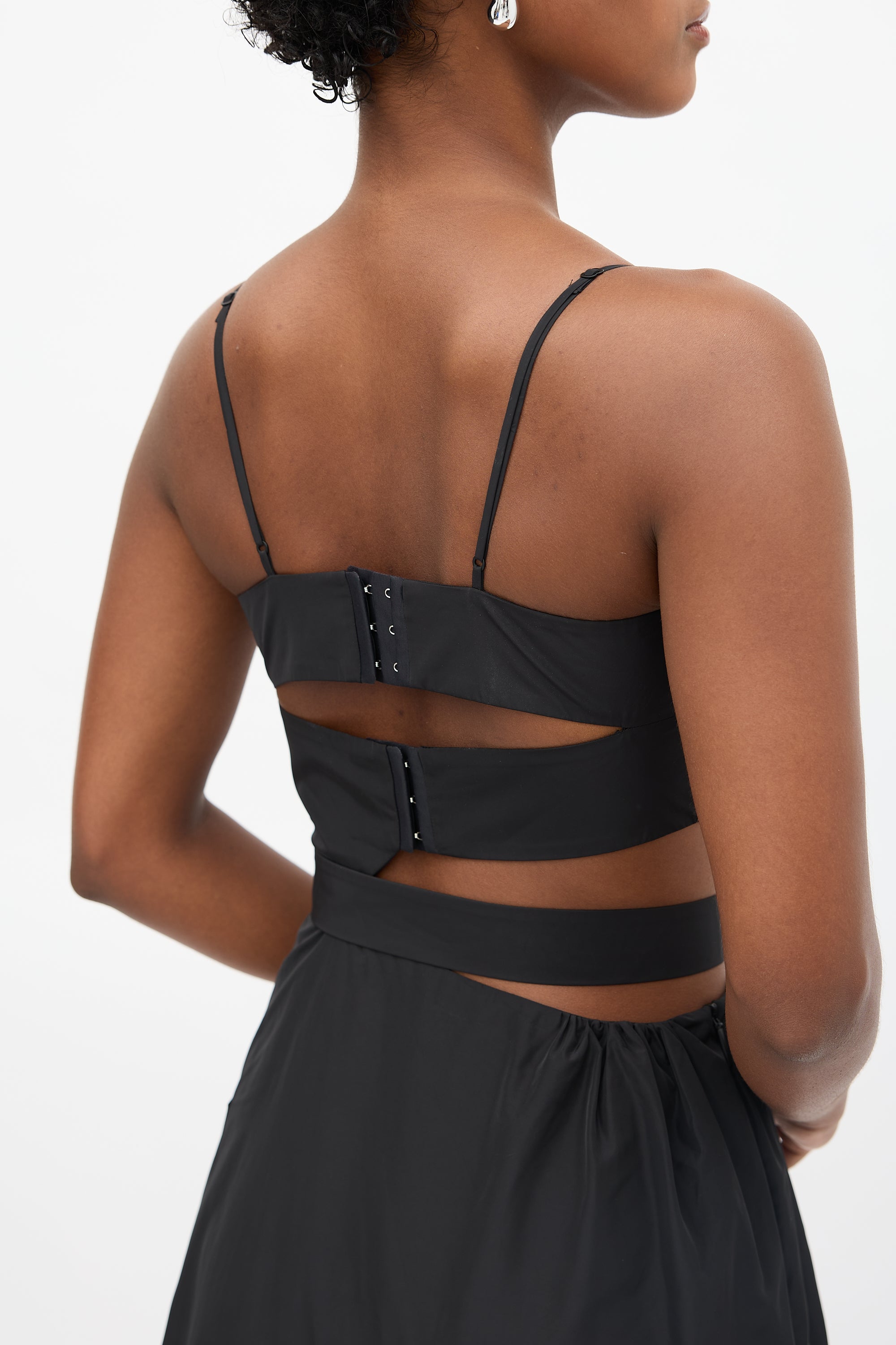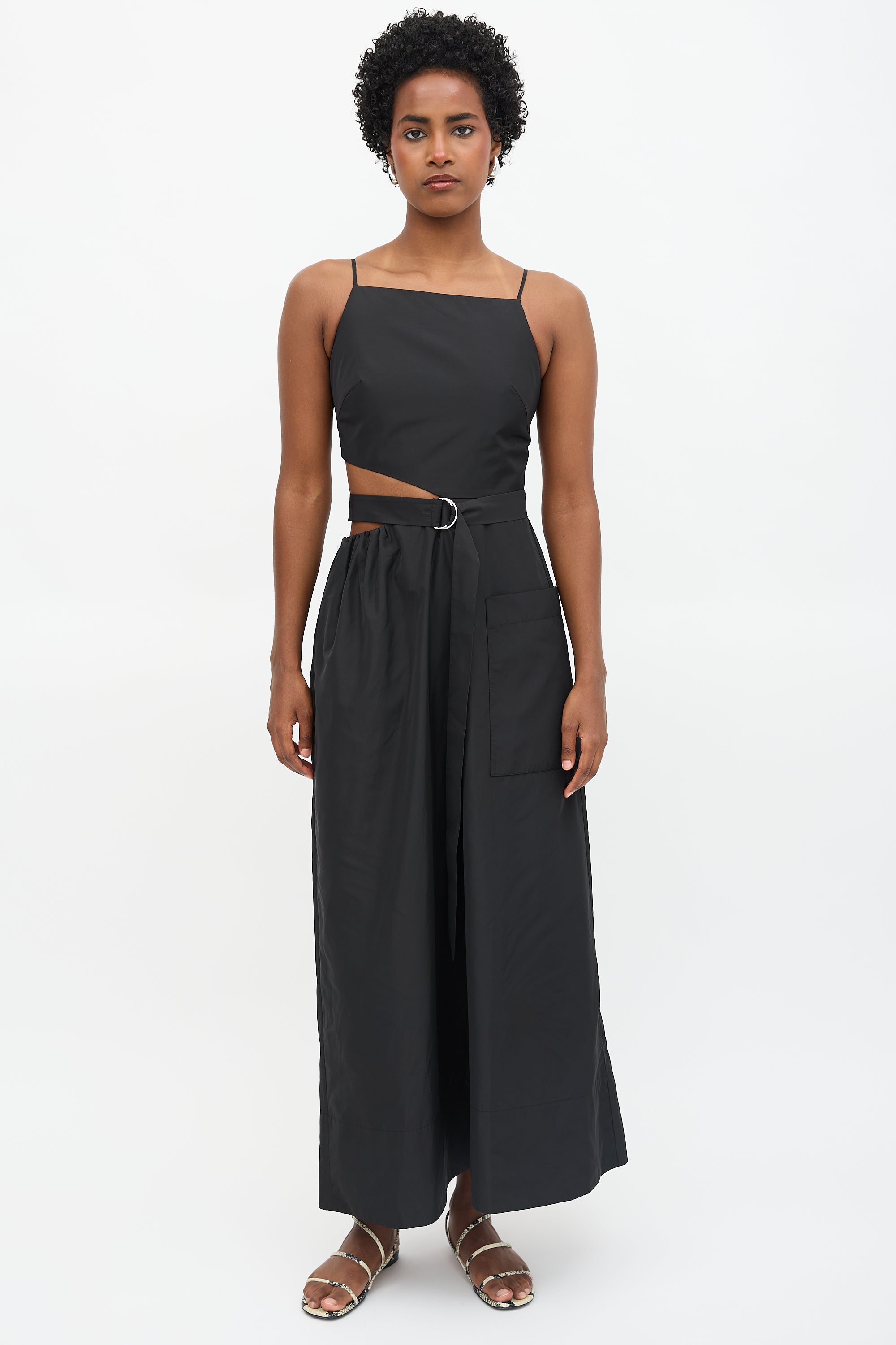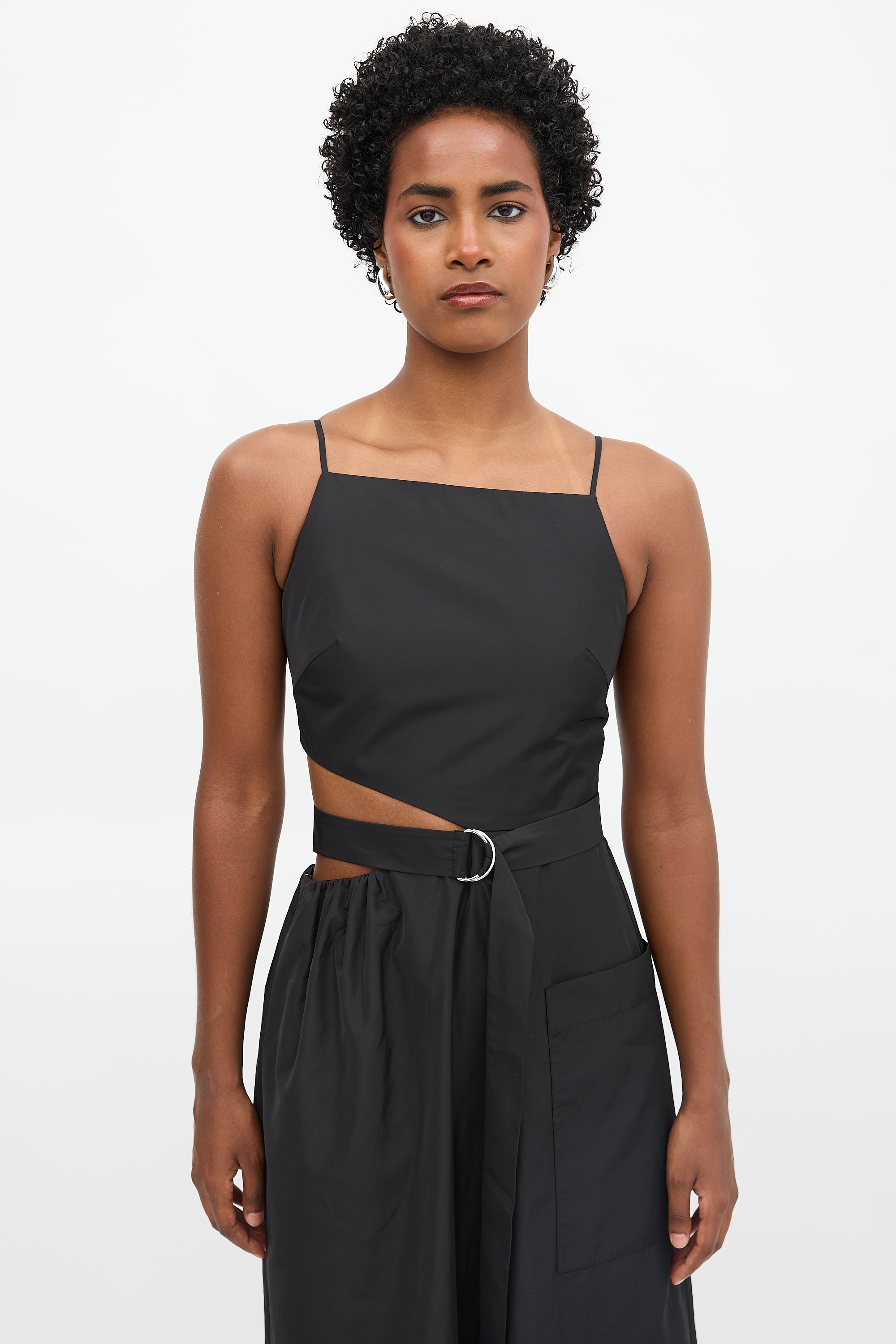 Pre-owned Tibi black Strappy Cut Out dress featuring adjustable spaghetti shoulder straps, cutout back with hook and eye closure, cutout right side with ruched detail, adjustable belt, patch pocket at left hip, and concealed side zip.