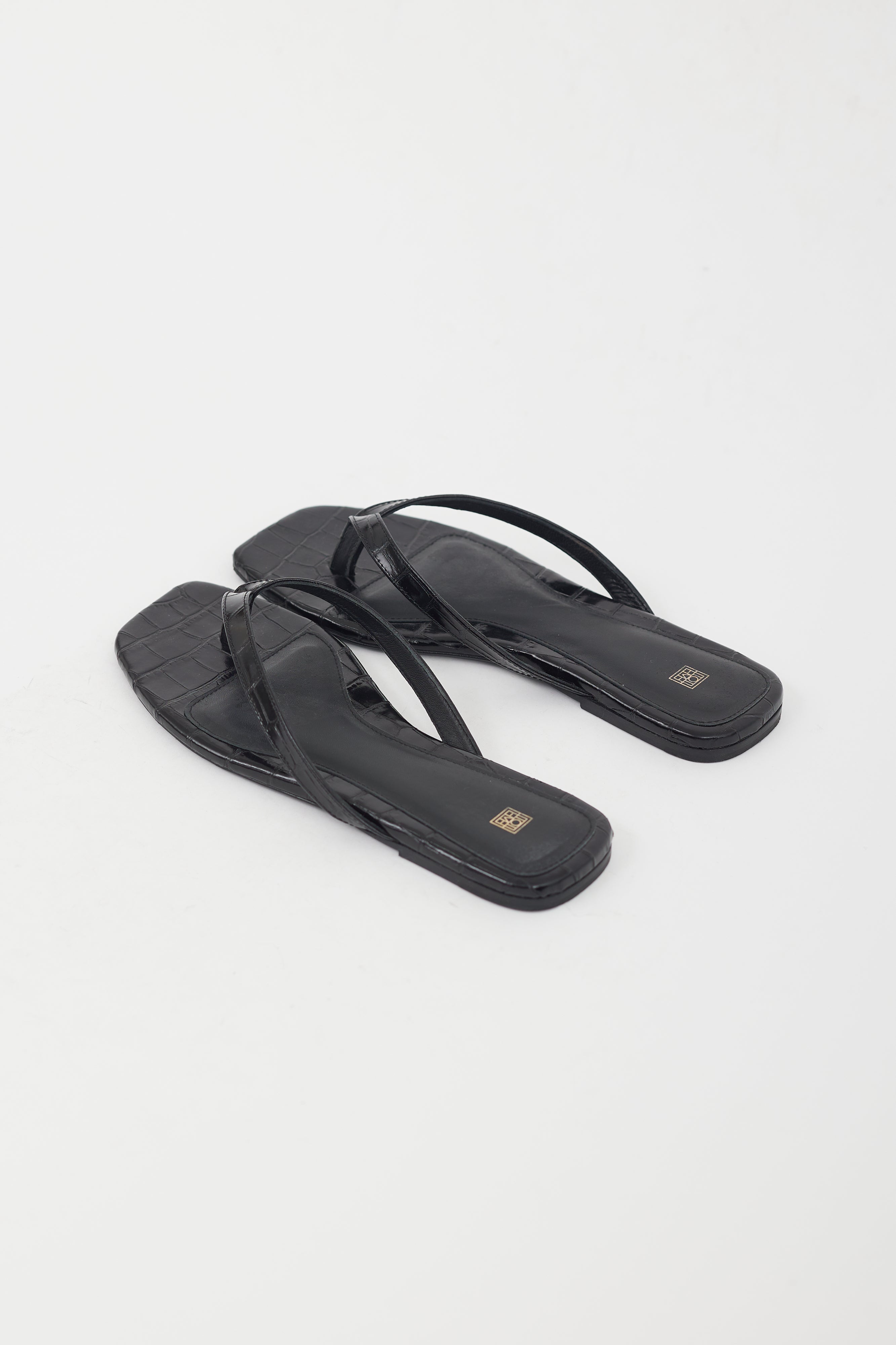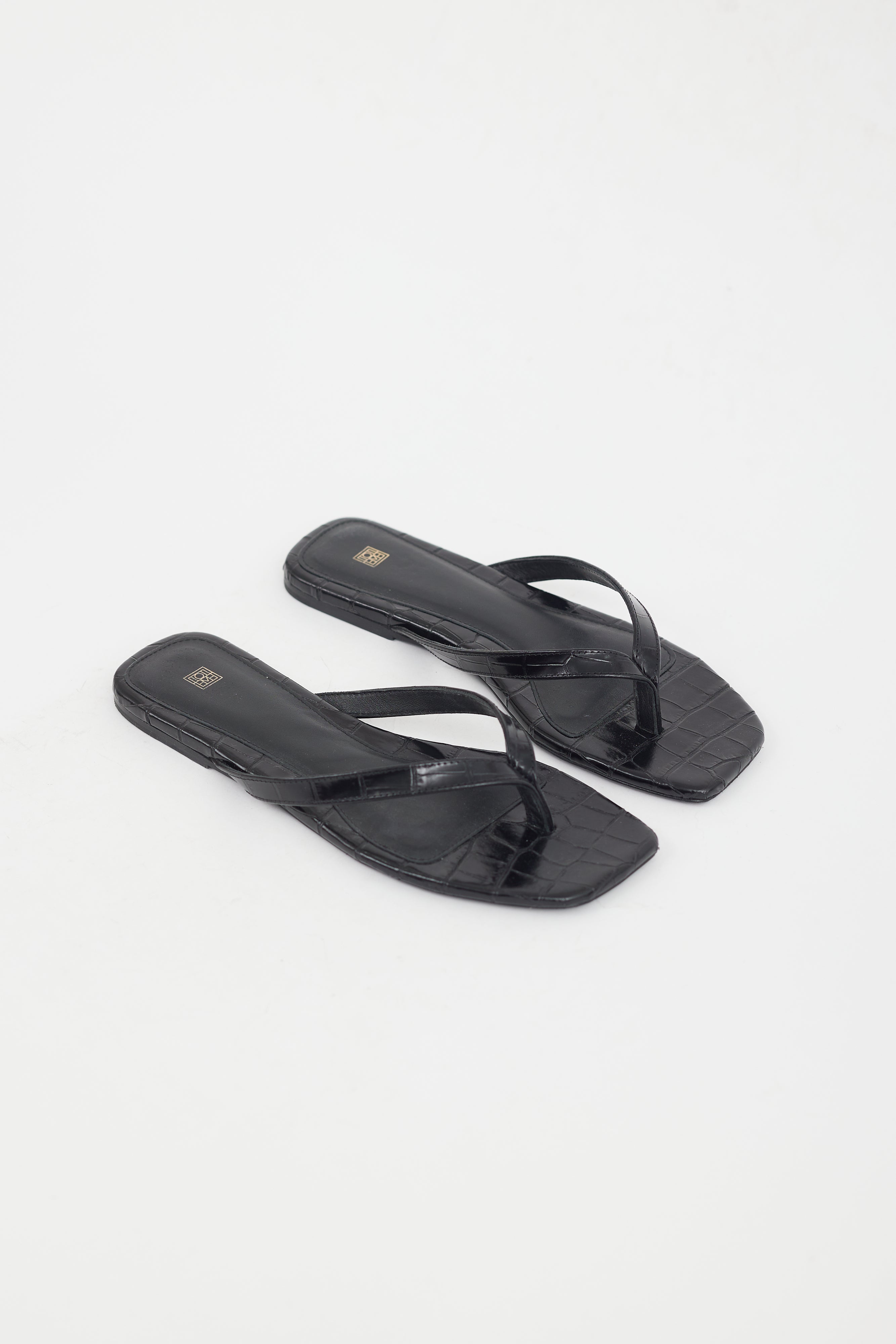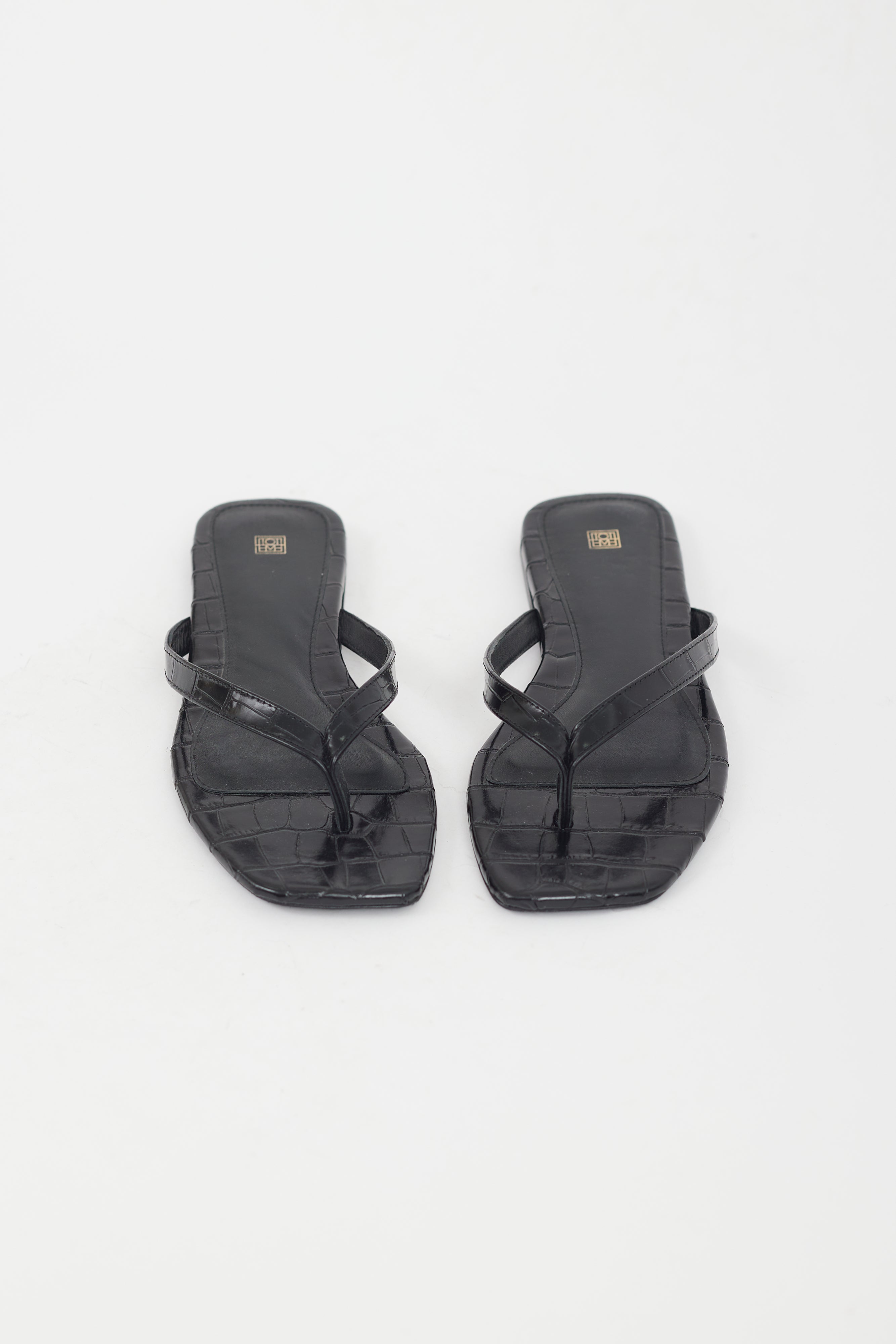 Pre-owned Totême black shiny leather crocodile embossed flip flops featuring square toe, printed logo at insole, and leather insoles.