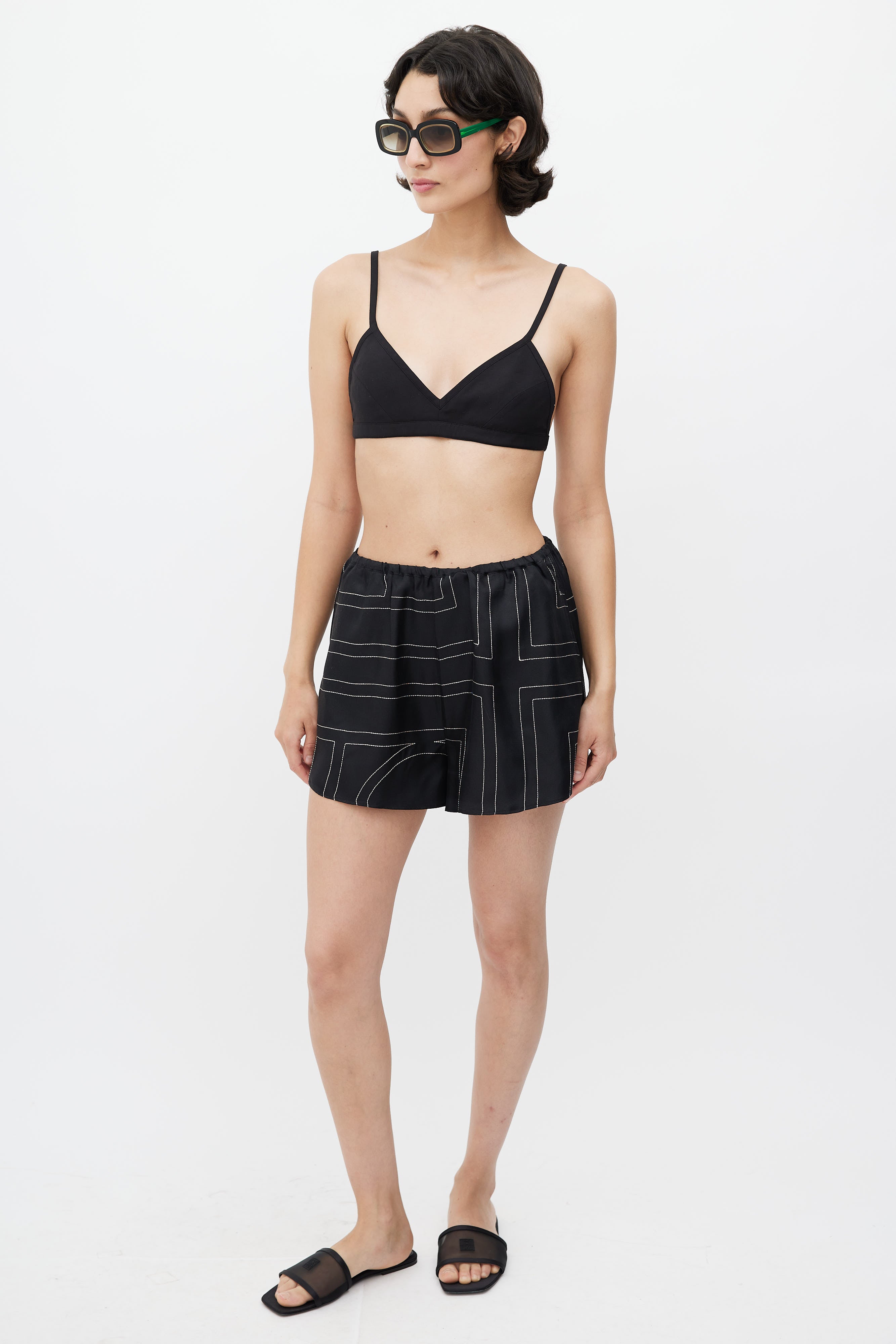 Pre-owned Totême black shorts featuring white geometric embroidery throughout, elasticized waist, and two slash pockets at hip.