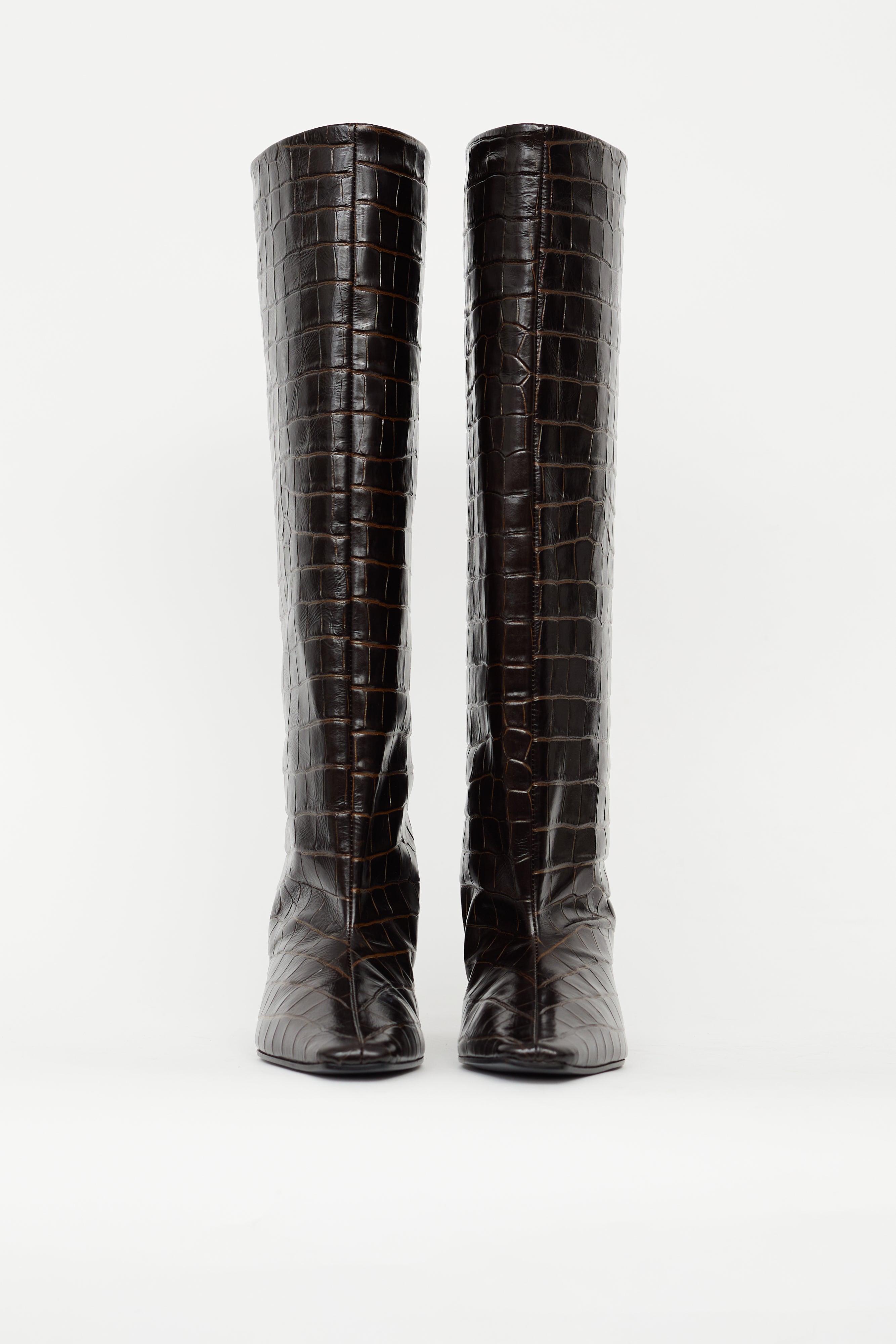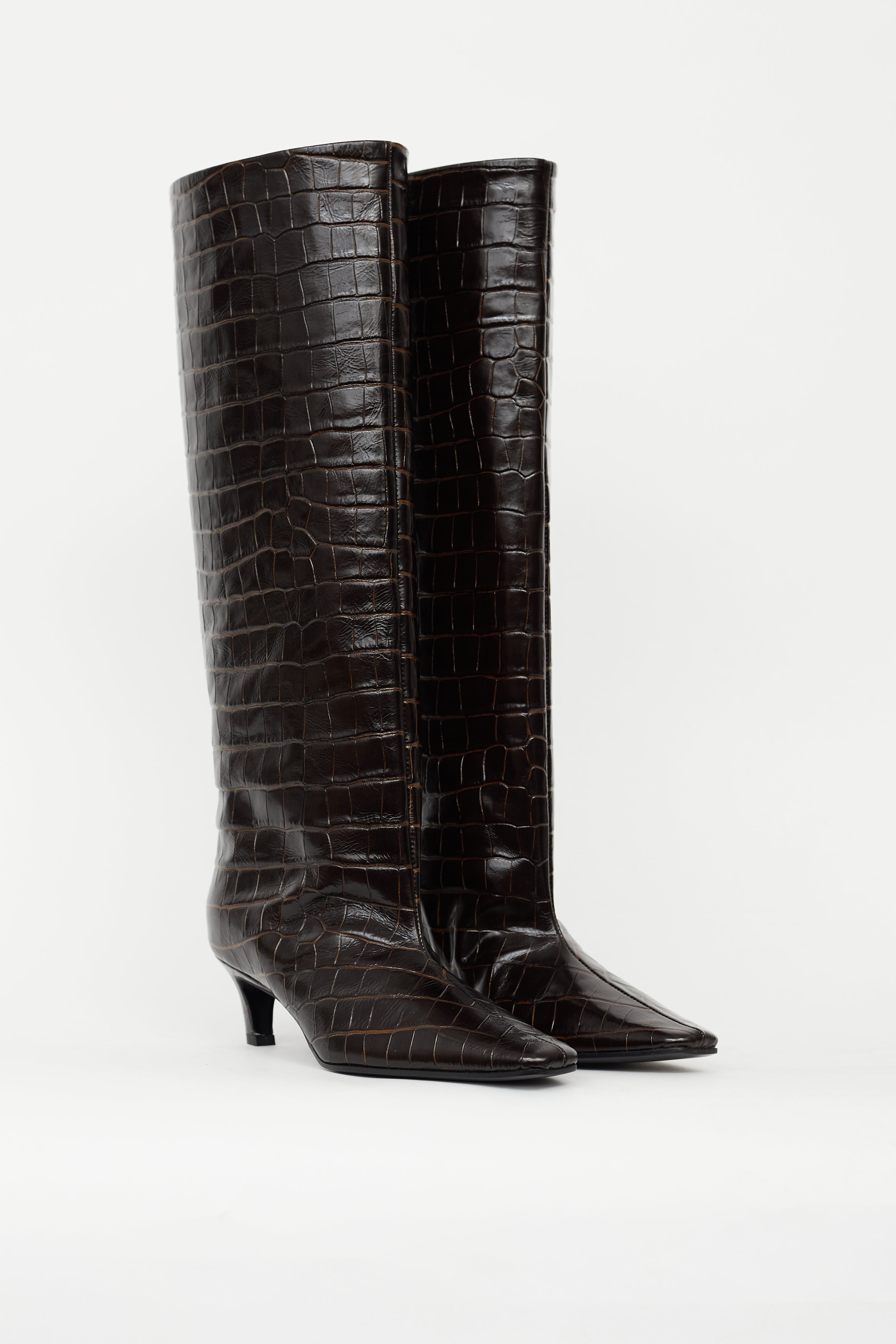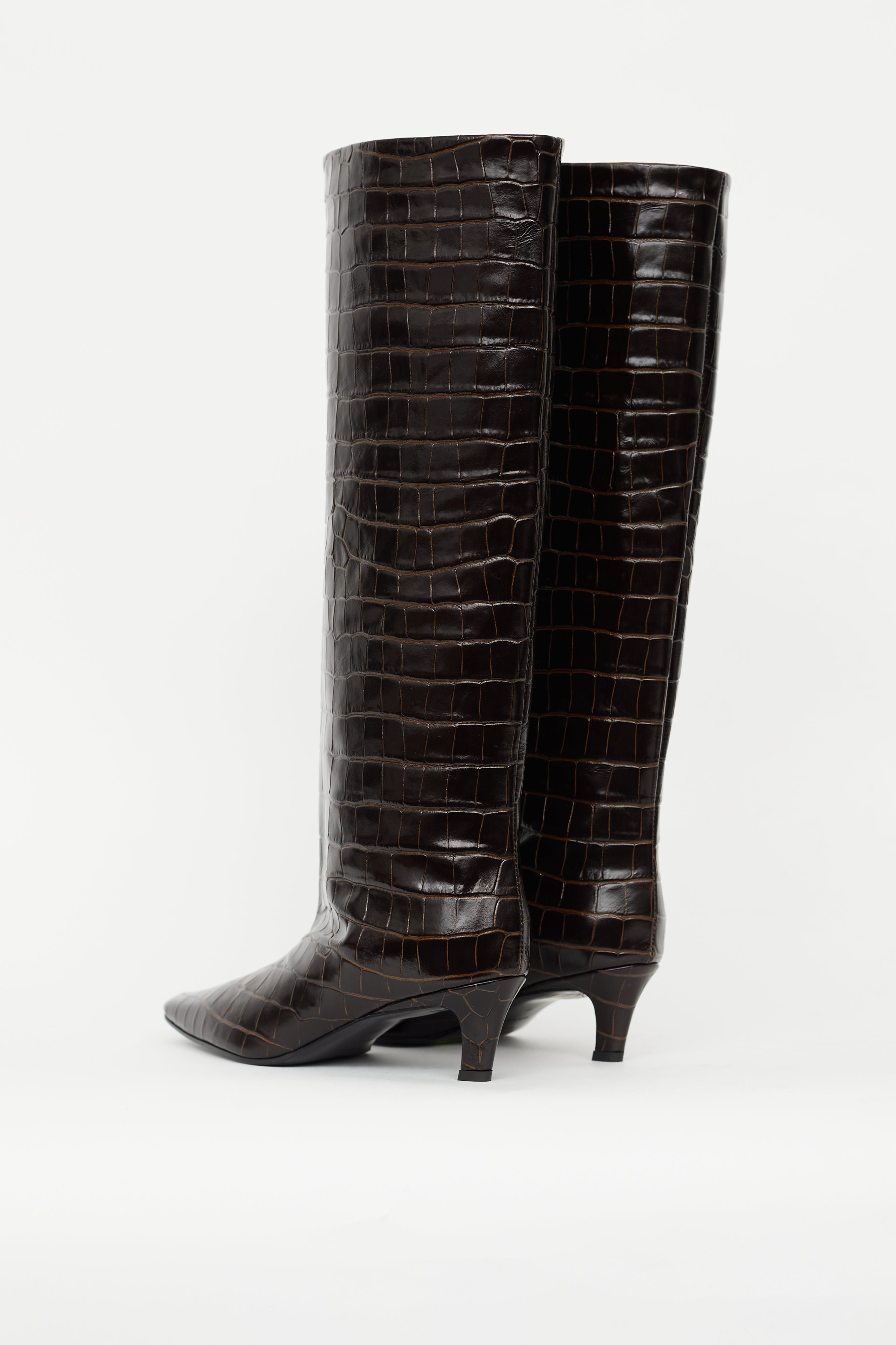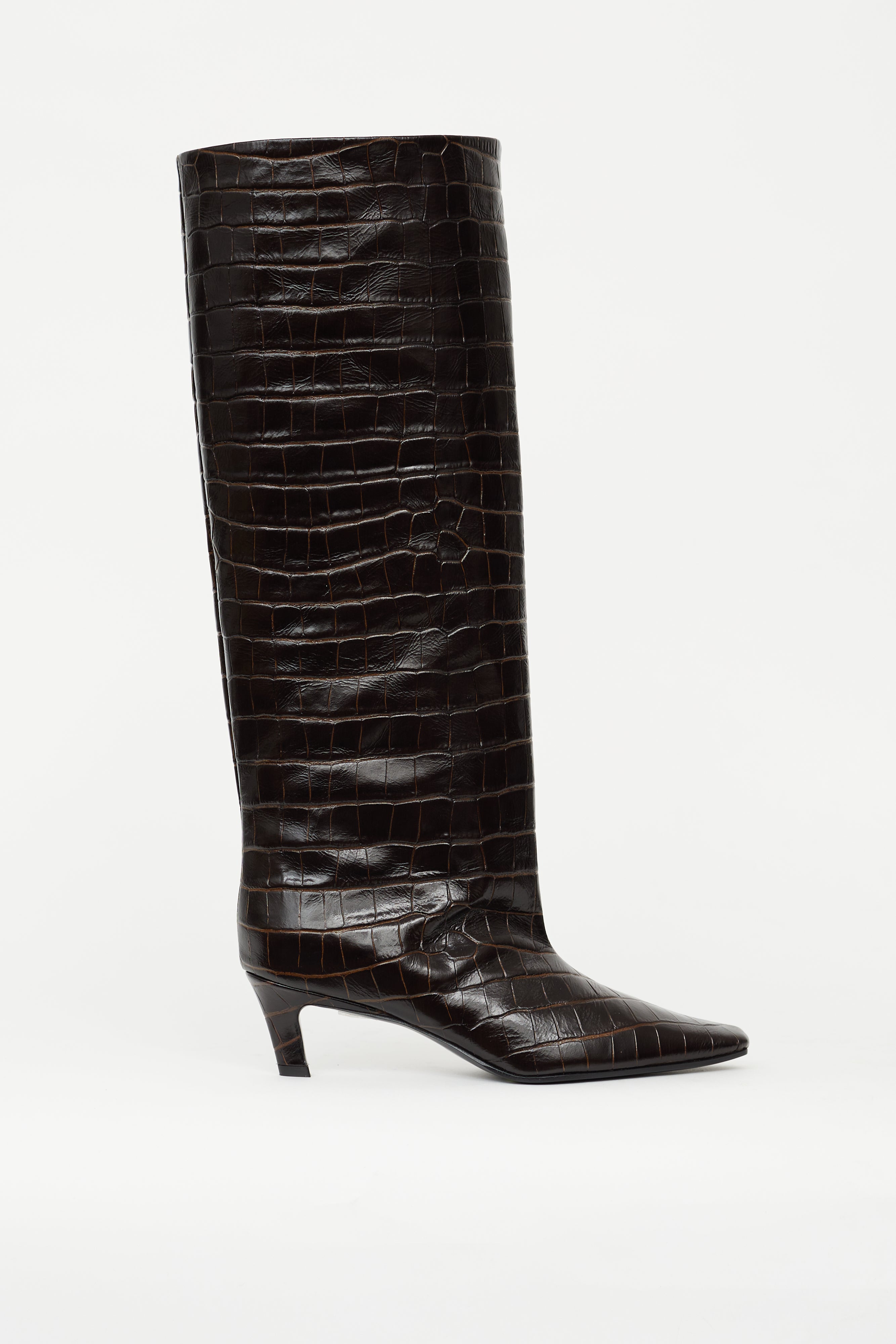 Pre-owned Totême knee high boot in dark brown featuring embossed leather, wide shaft opening for slip on entry, tapered square toe and slanted kitten heel. Comes with original box.