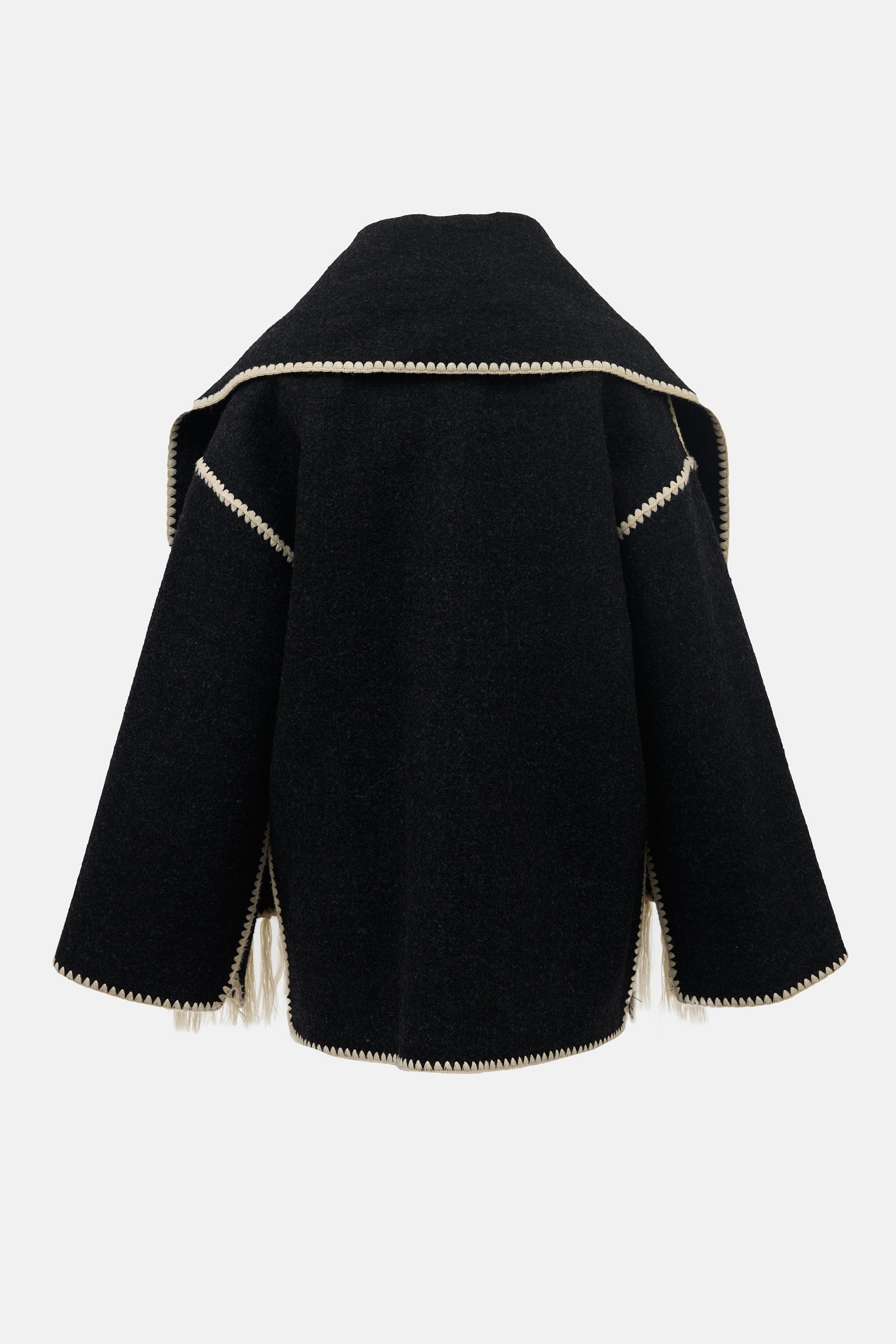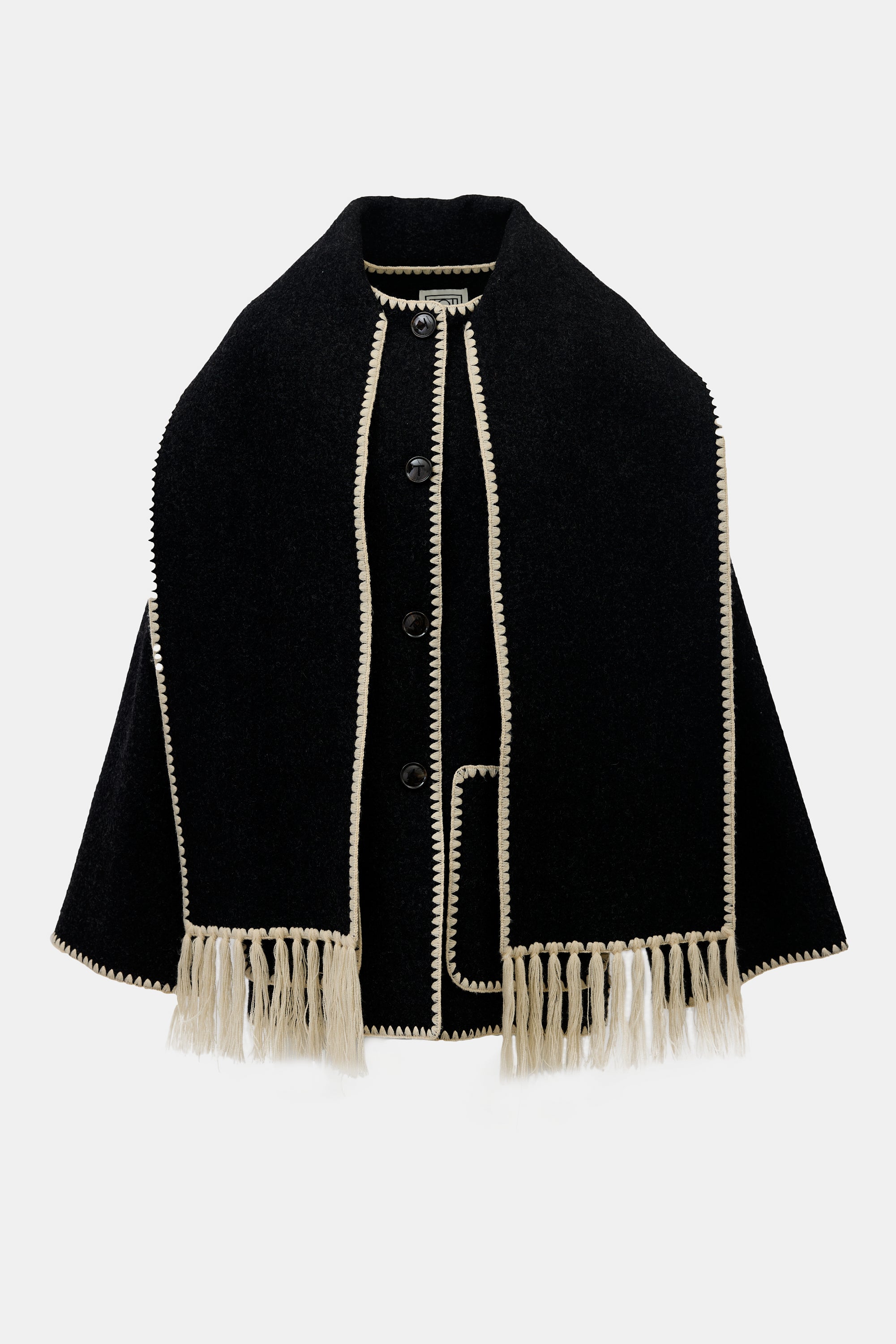 Pre-owned Toteme dark grey jacket featuring attached scarf with tassel end, white embroidered trim, wide sleeve, button front with embroidered T, and two pockets at front. Unlined.