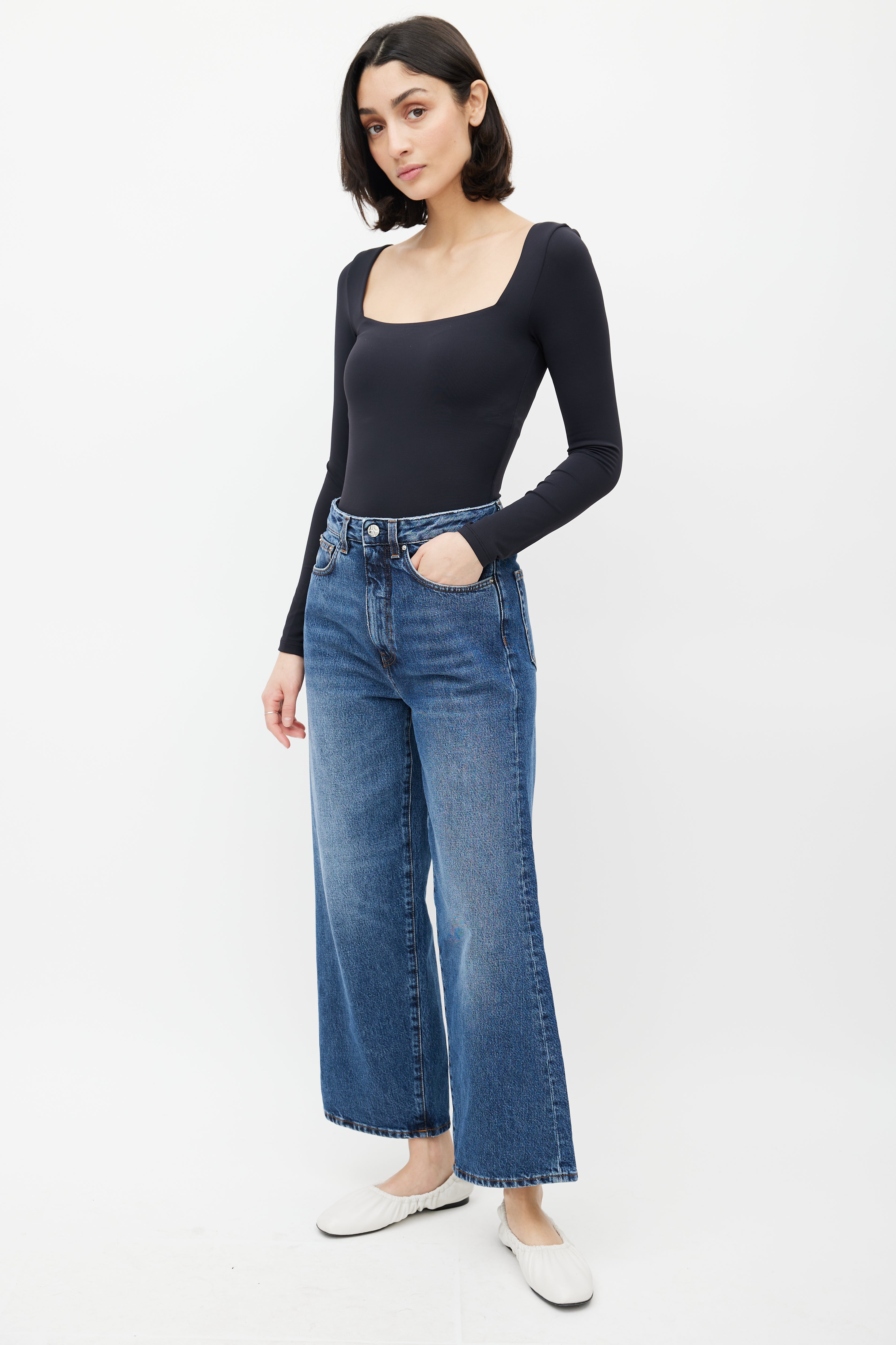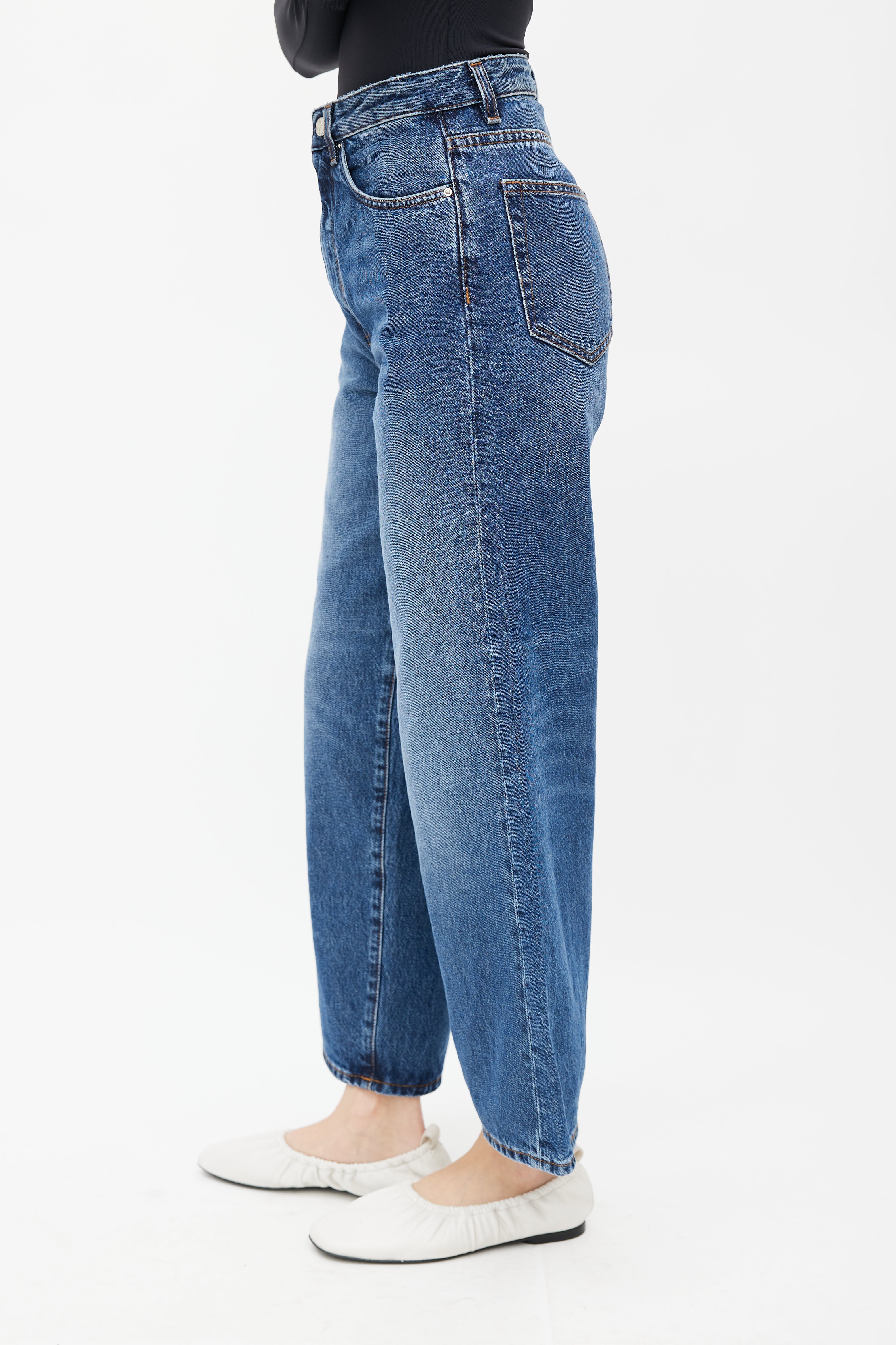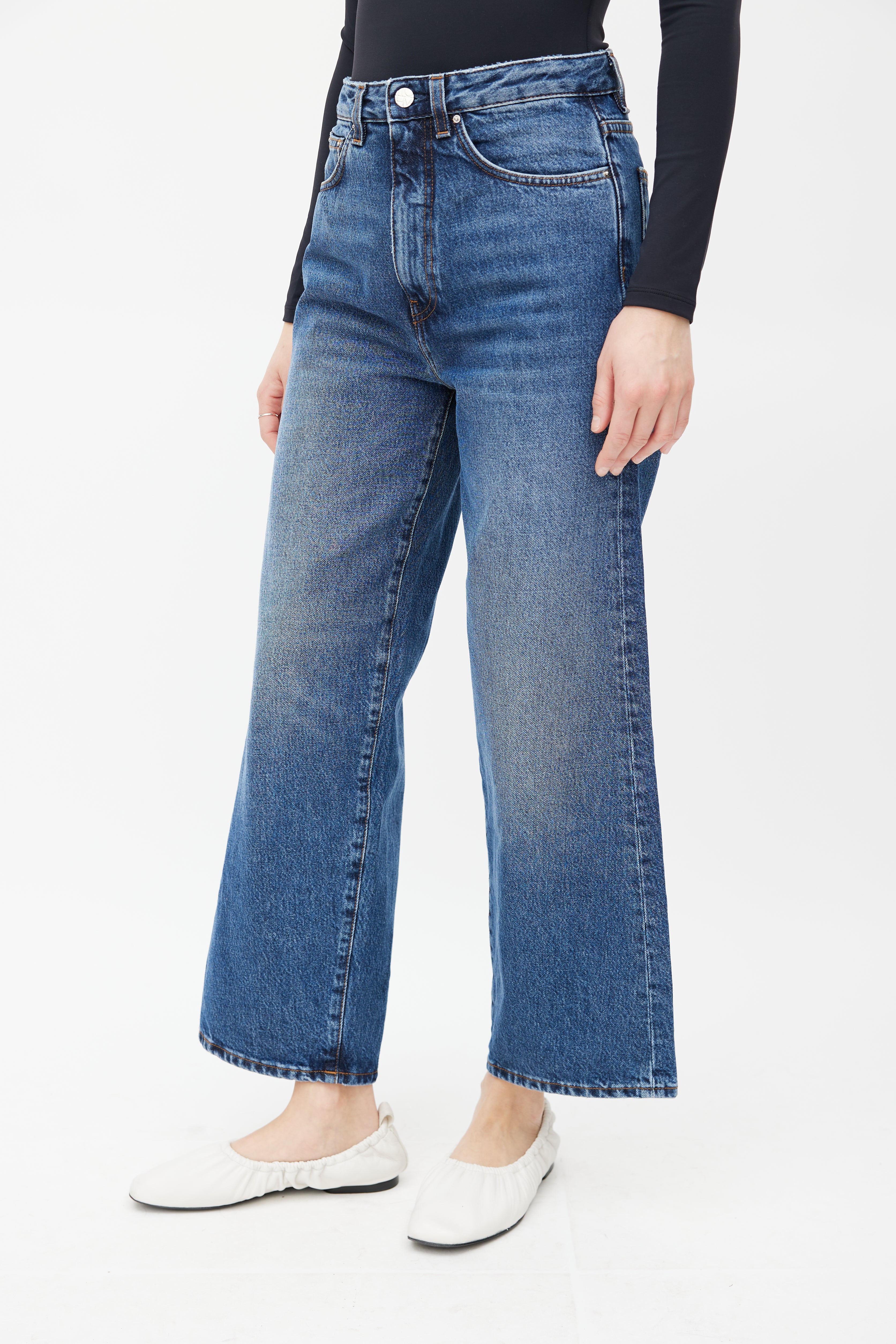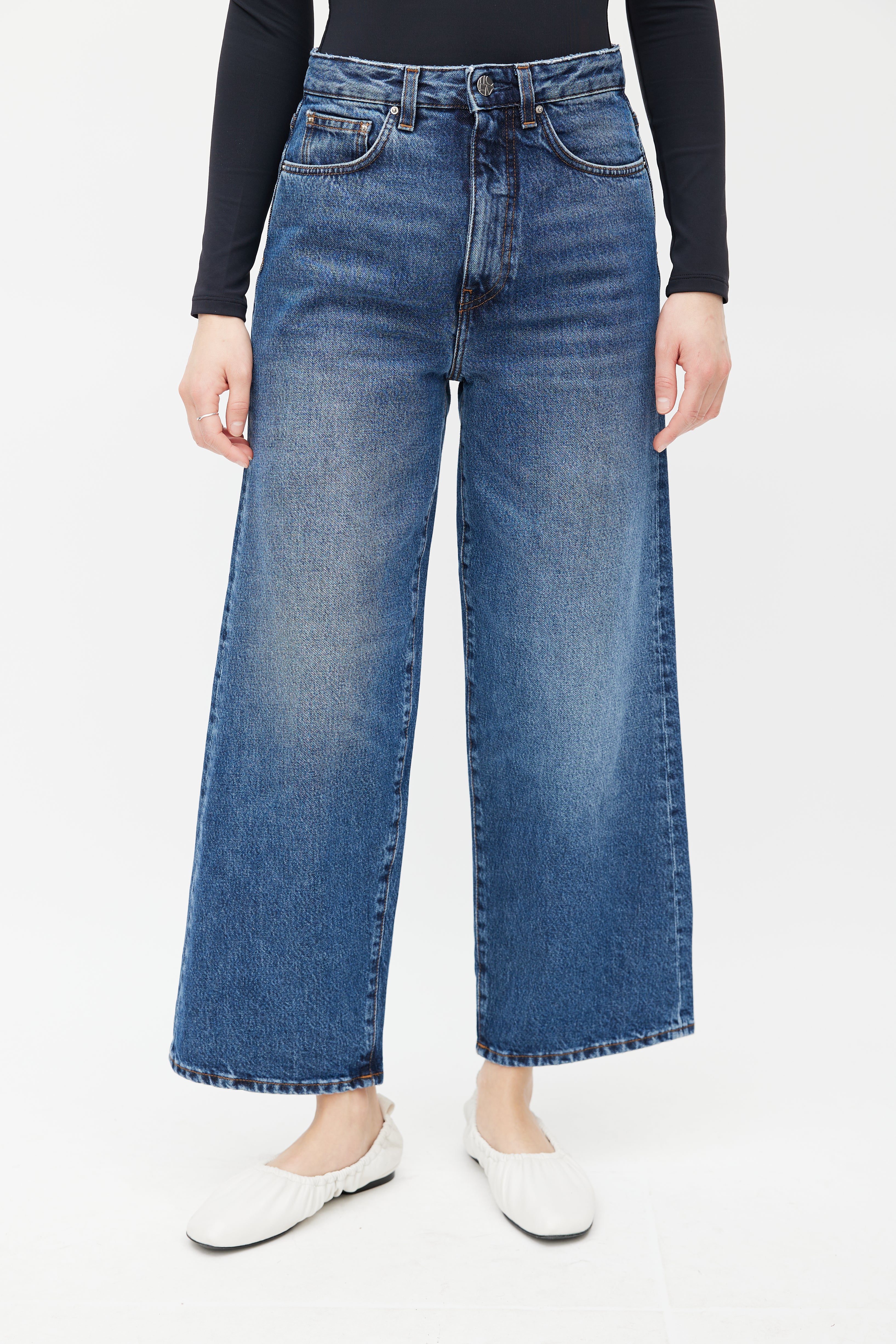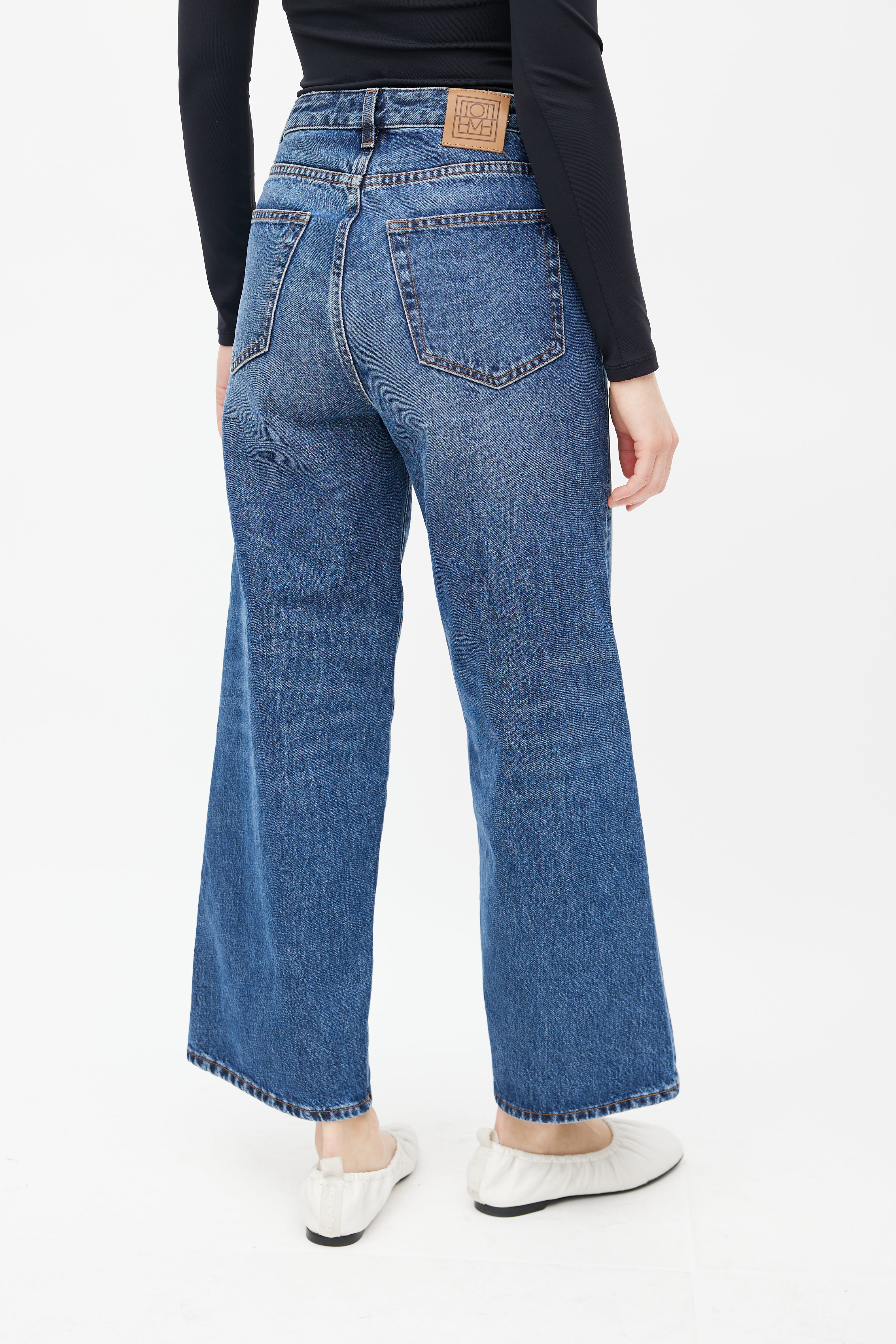 Pre-owned Toteme mid wash denim jean featuring wide leg, five pocket styling, embroidered logo jacron patch at back, and embroidered logo zip fly with button closure.