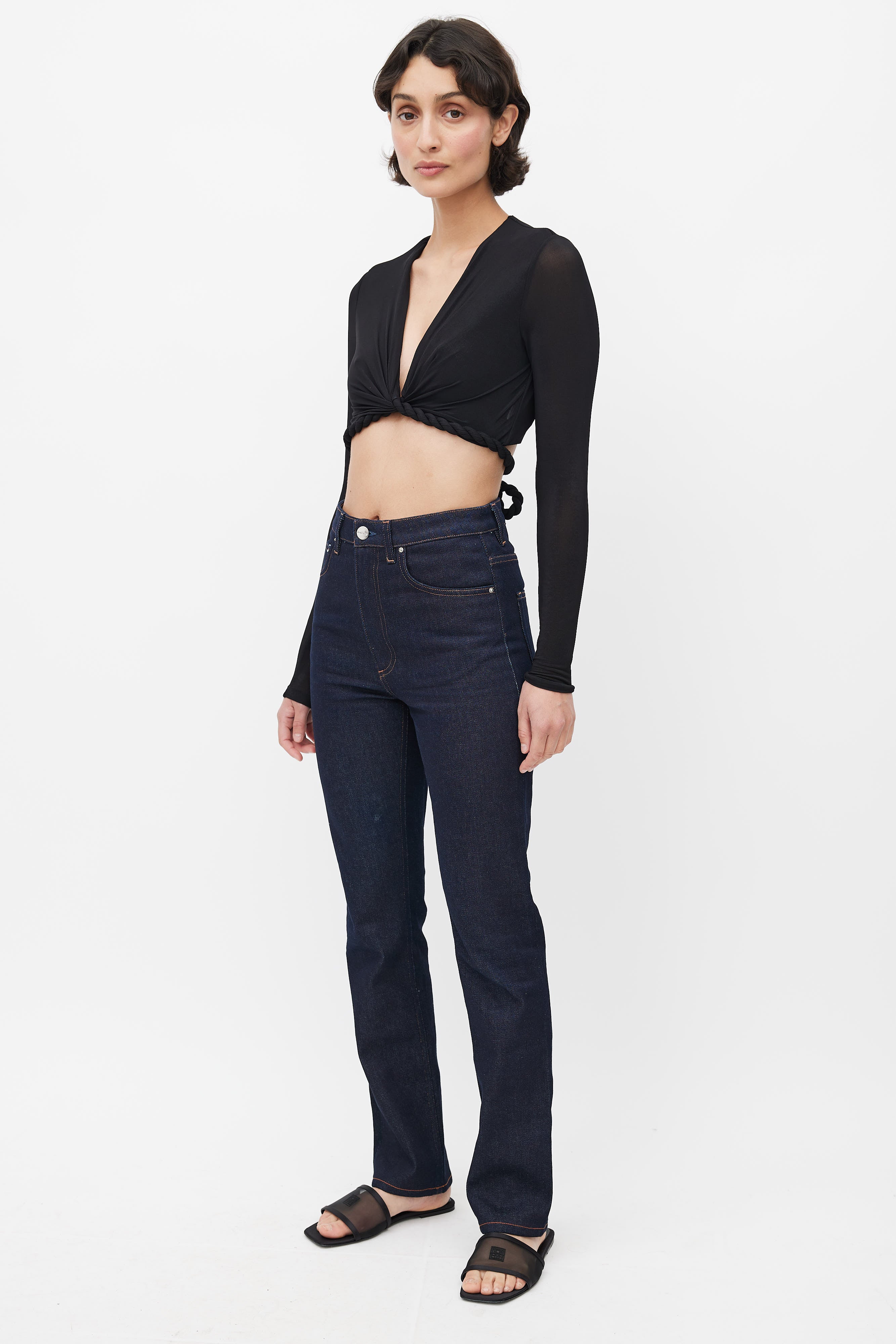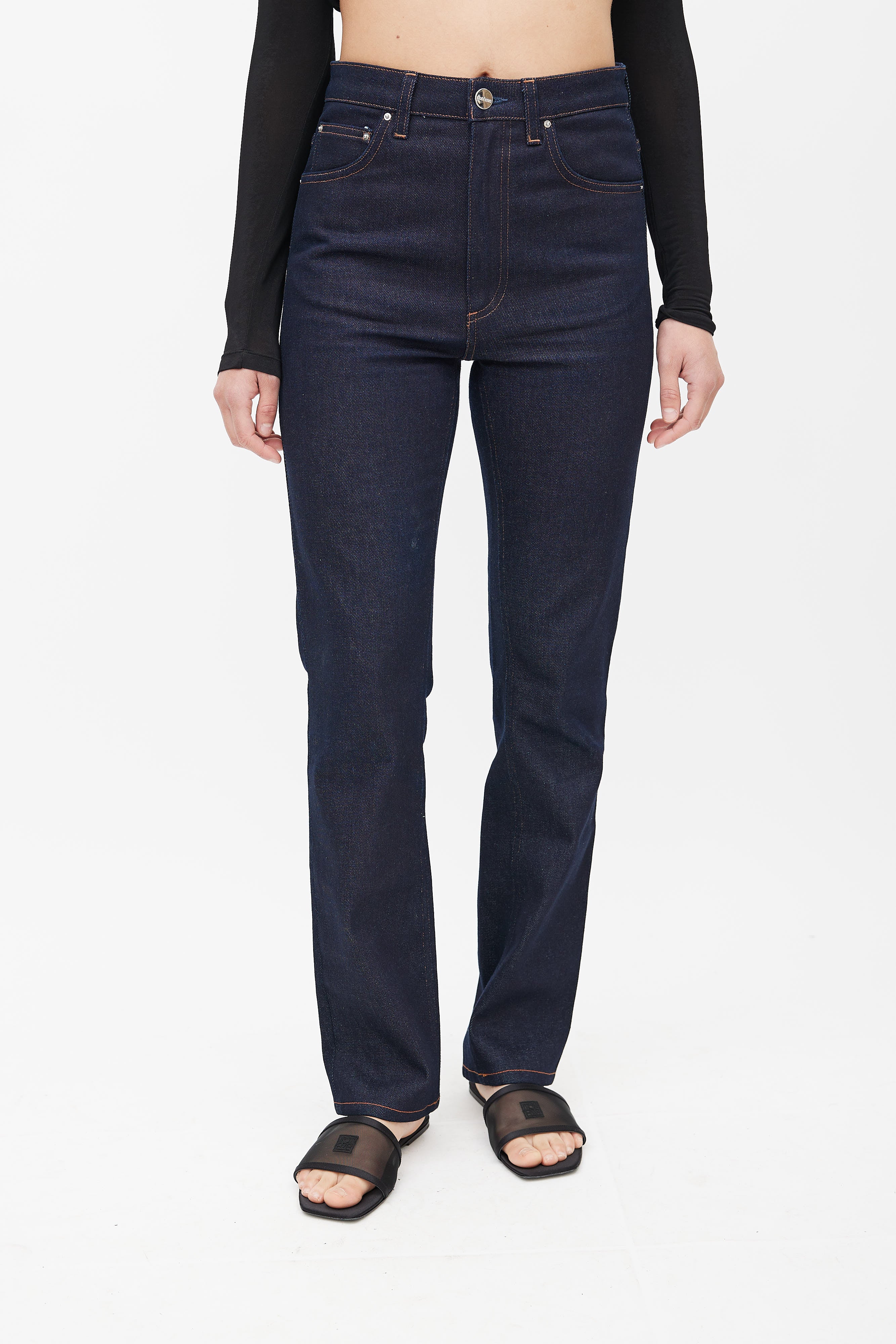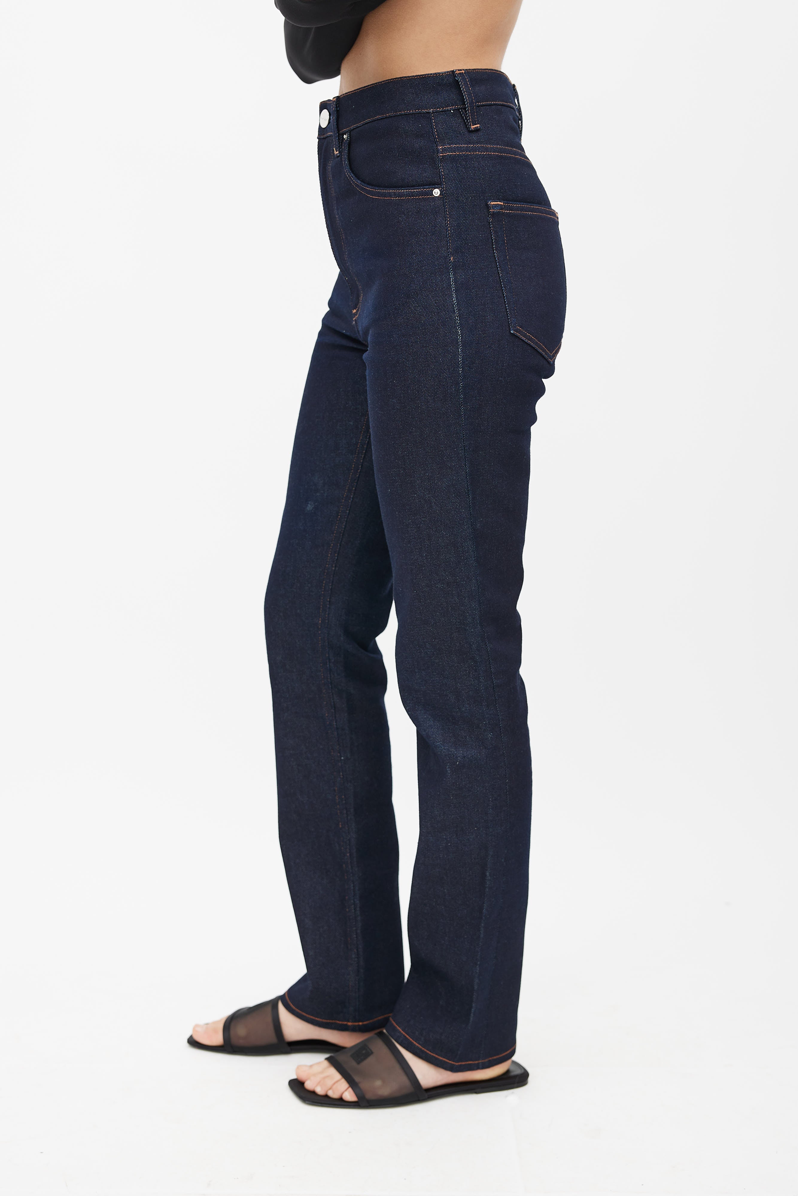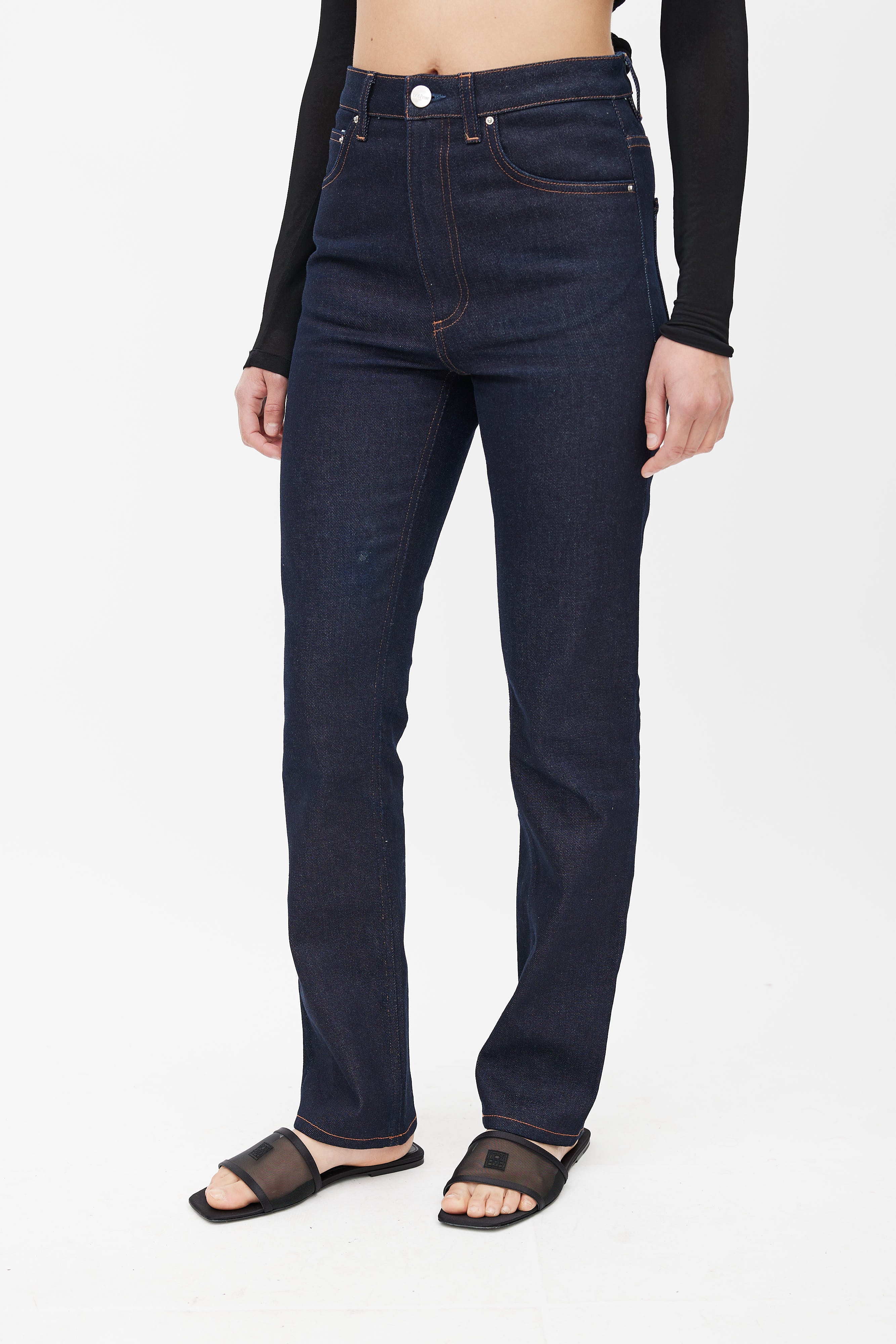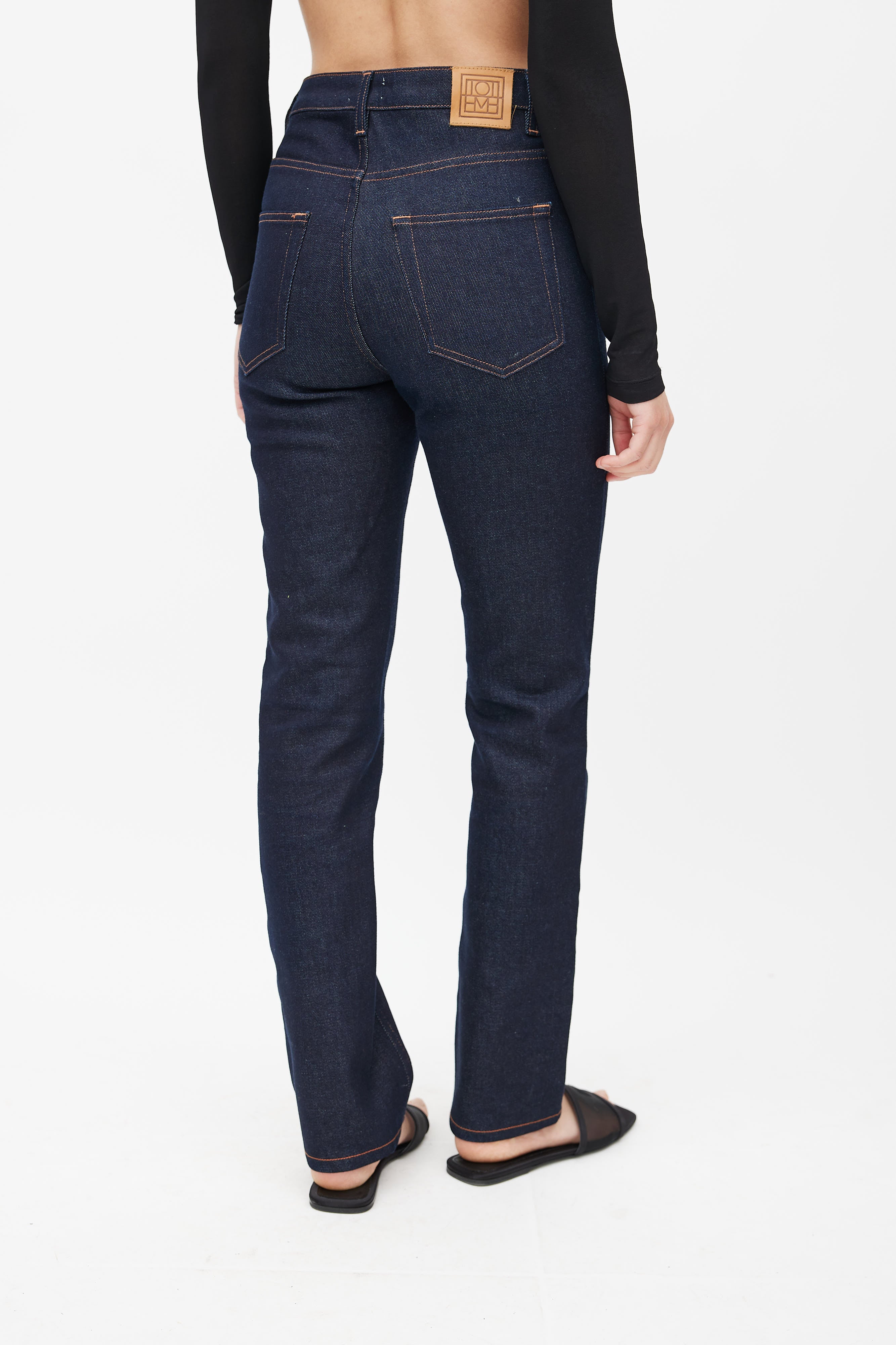 Pre-owned Totême navy denim jeans featuring contrast stitching, five pocket styling, logo patch at back, slim leg, and zip fly with button closure.