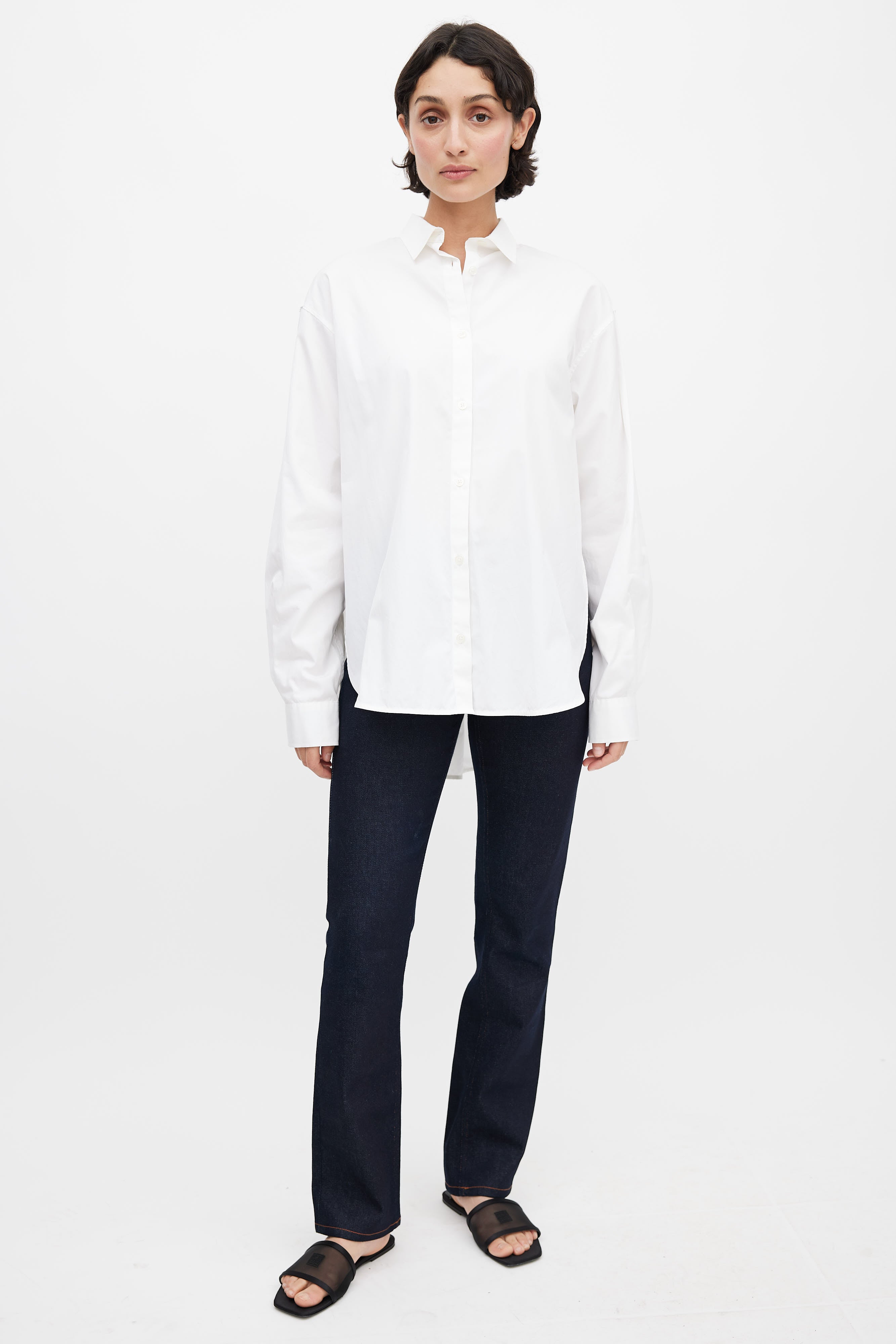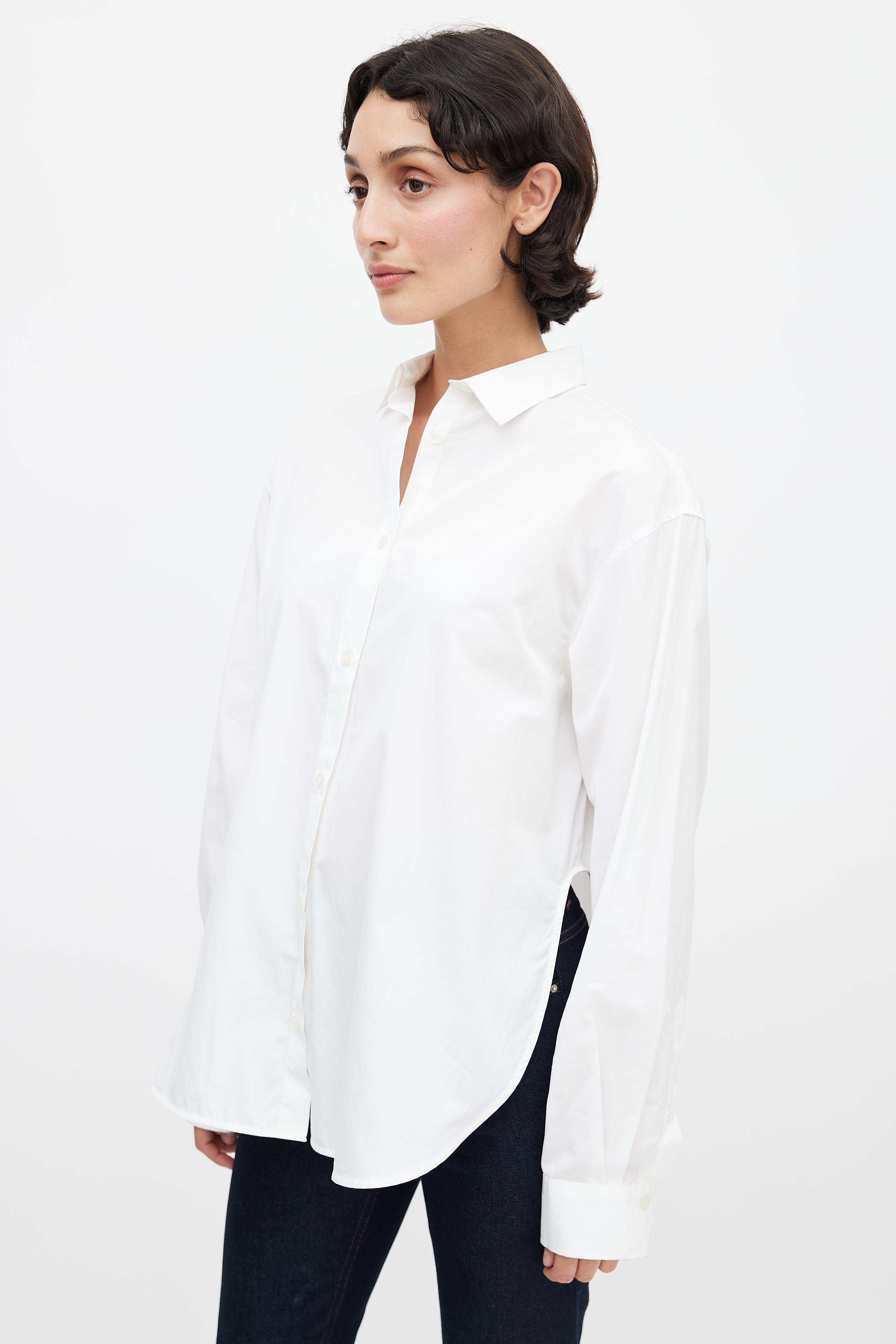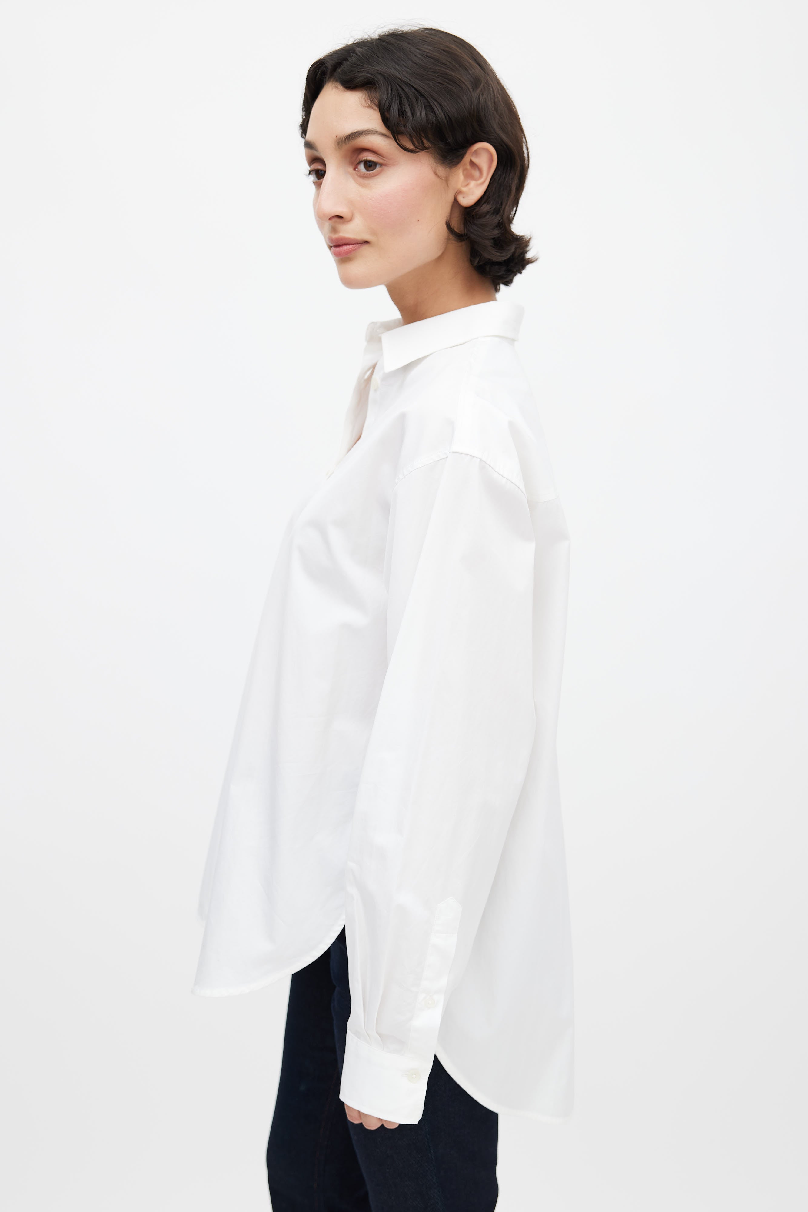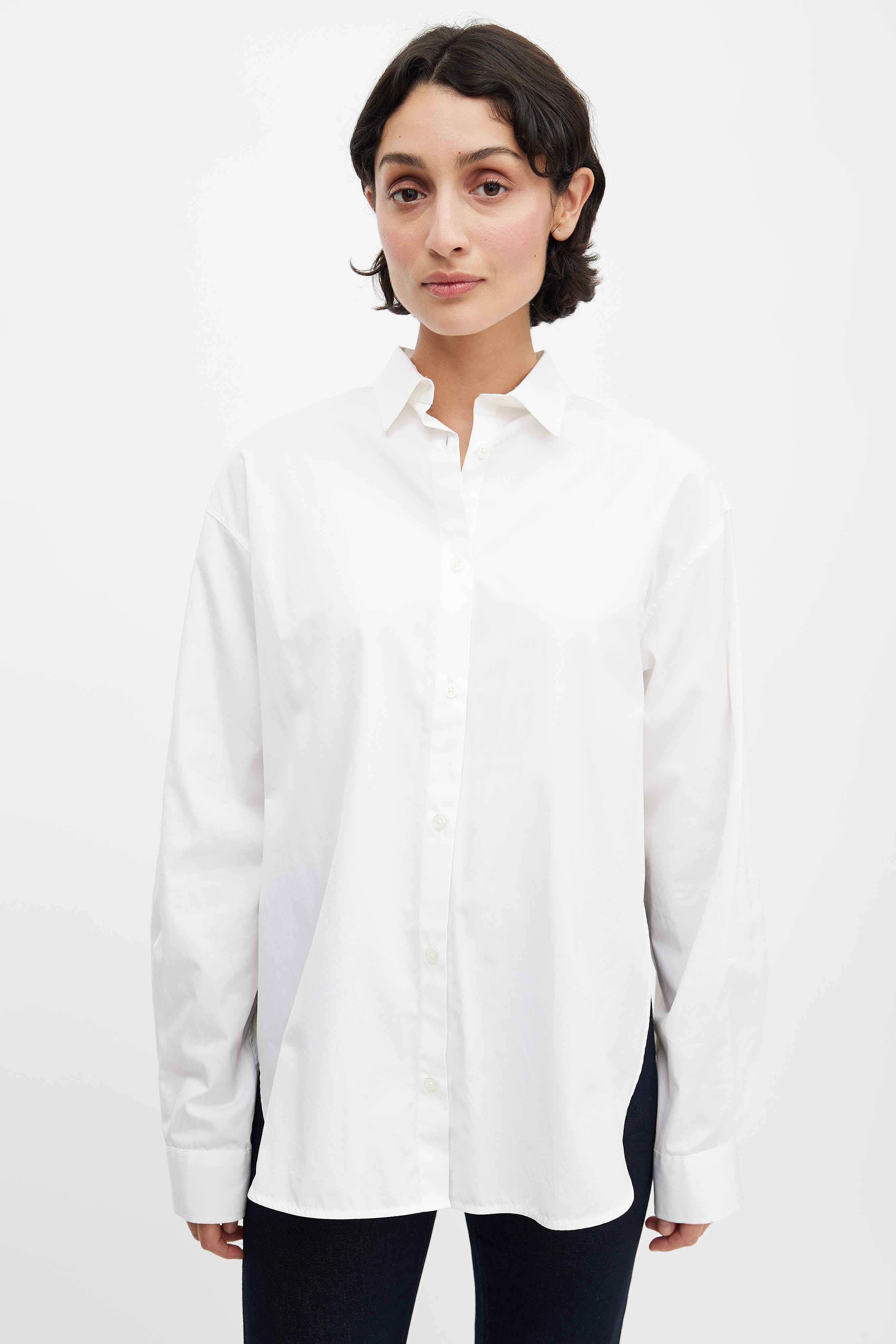 Pre-owned Totême white oversized button up shirt featuring a classic fold over collar, full button up front, long sleeves with buttoned cuffs, dropped shoulders, and a dolphin hem.