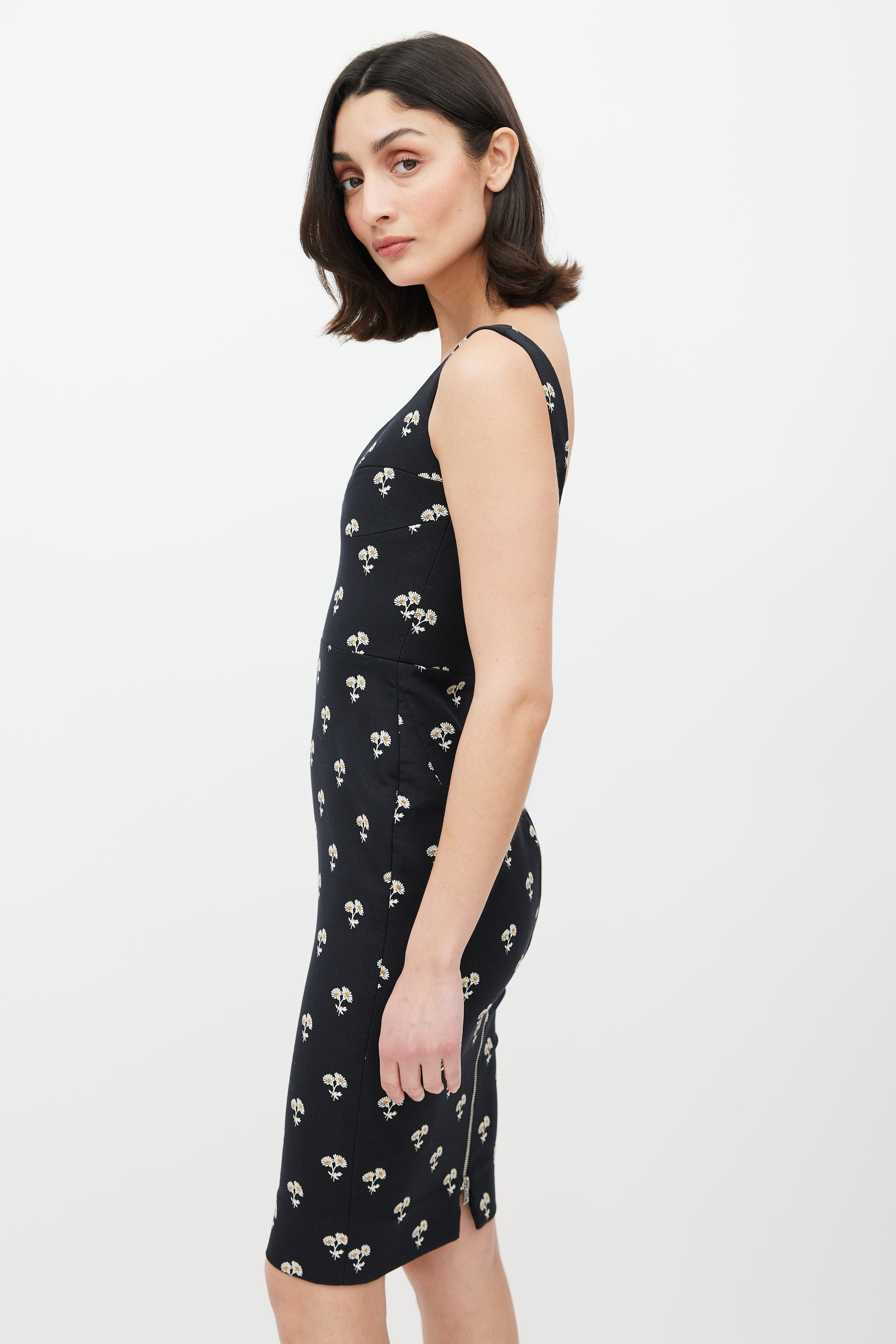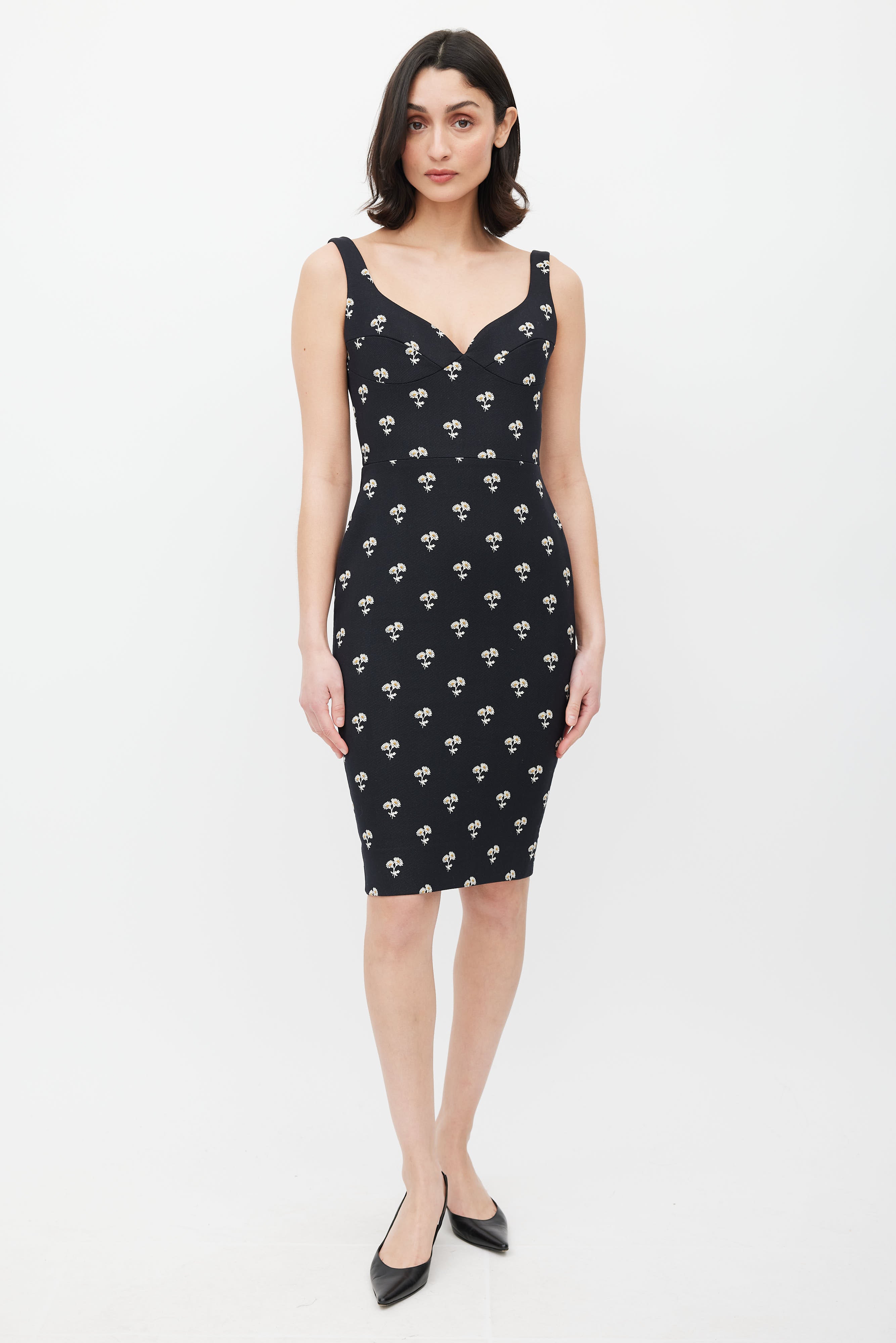 Pre-owned Victoria Beckham black dress featuring a multicolour floral jacquard pattern throughout, sweetheart neckline, structured bust, sleeveless styling, and zip closure at back. Lined.