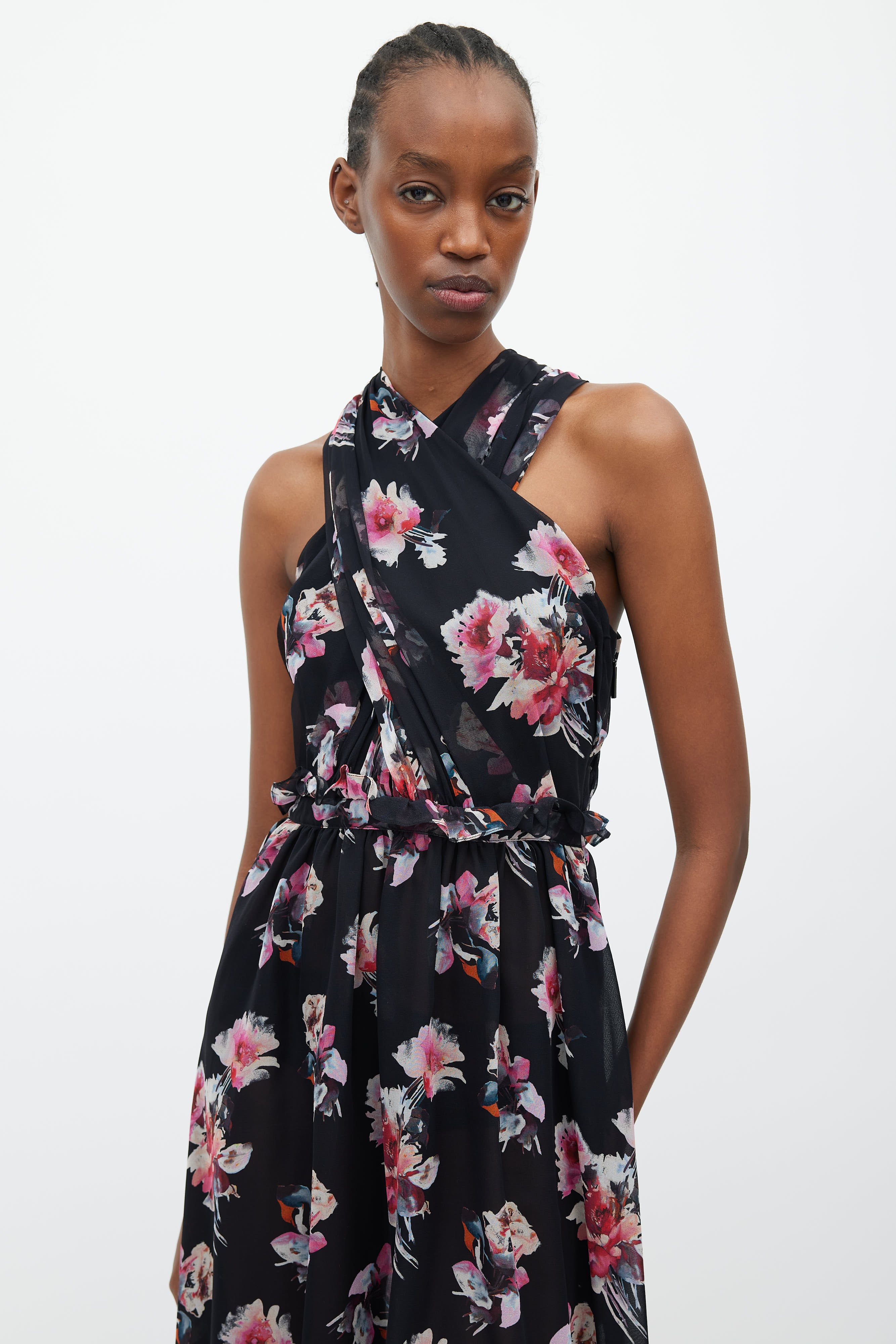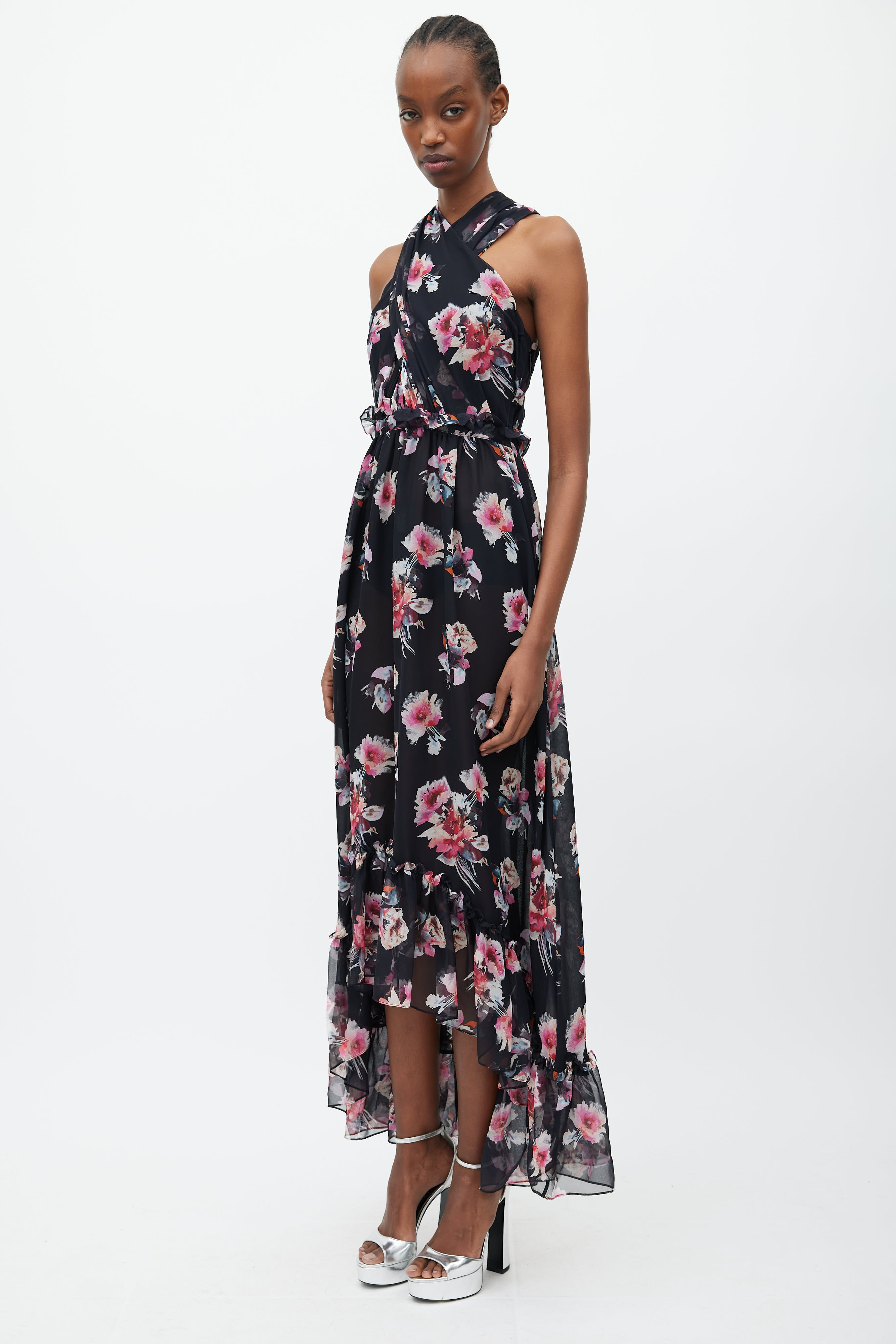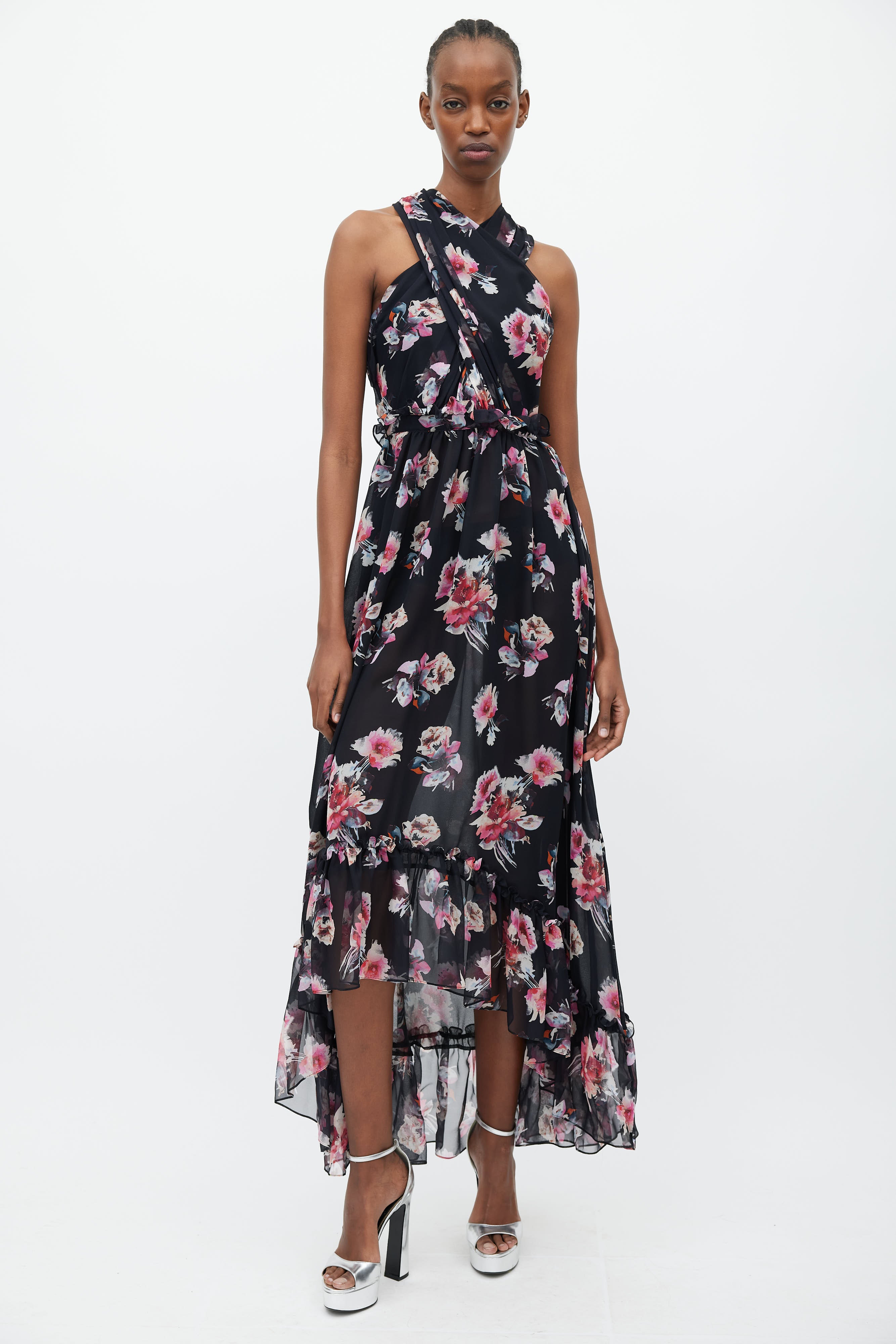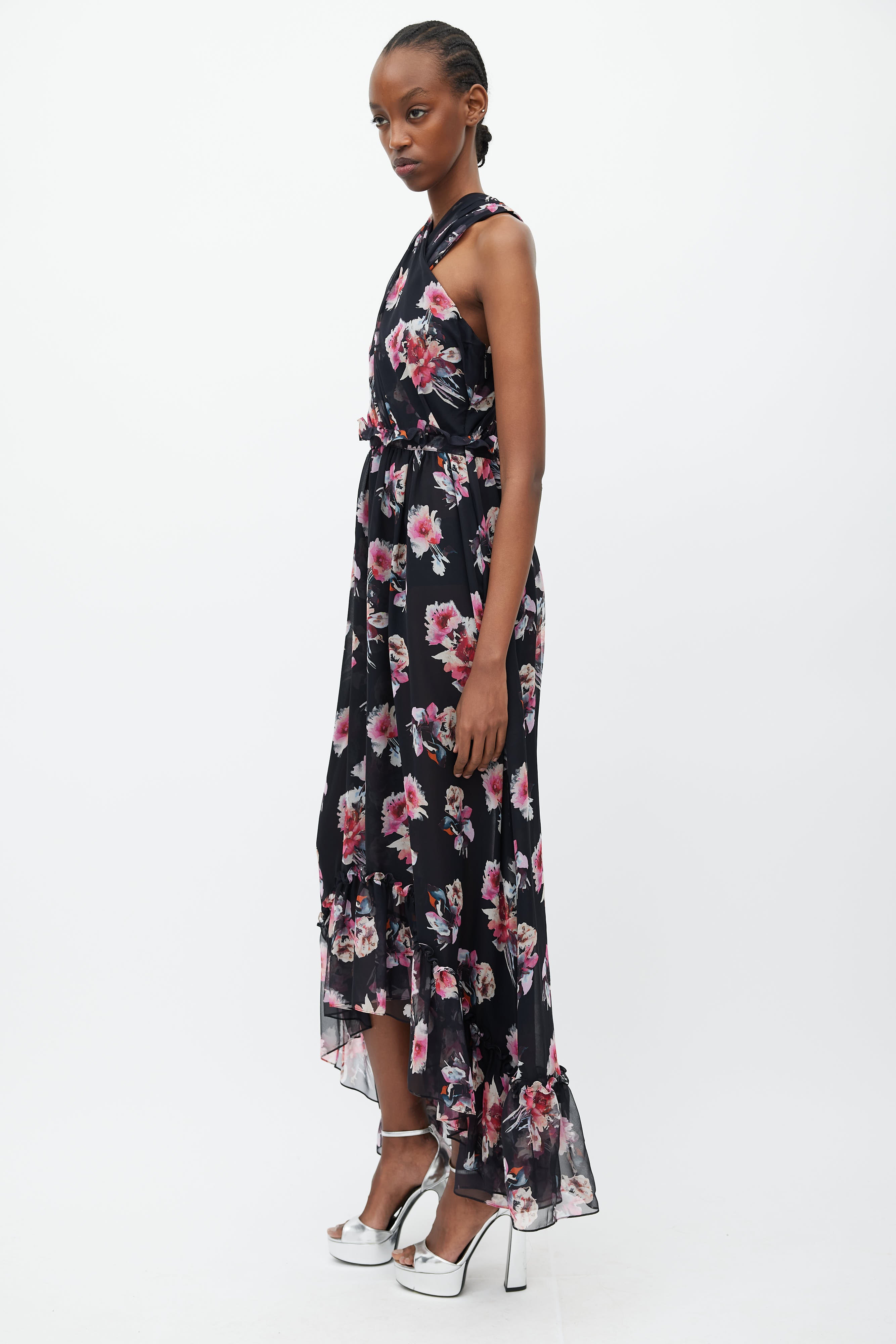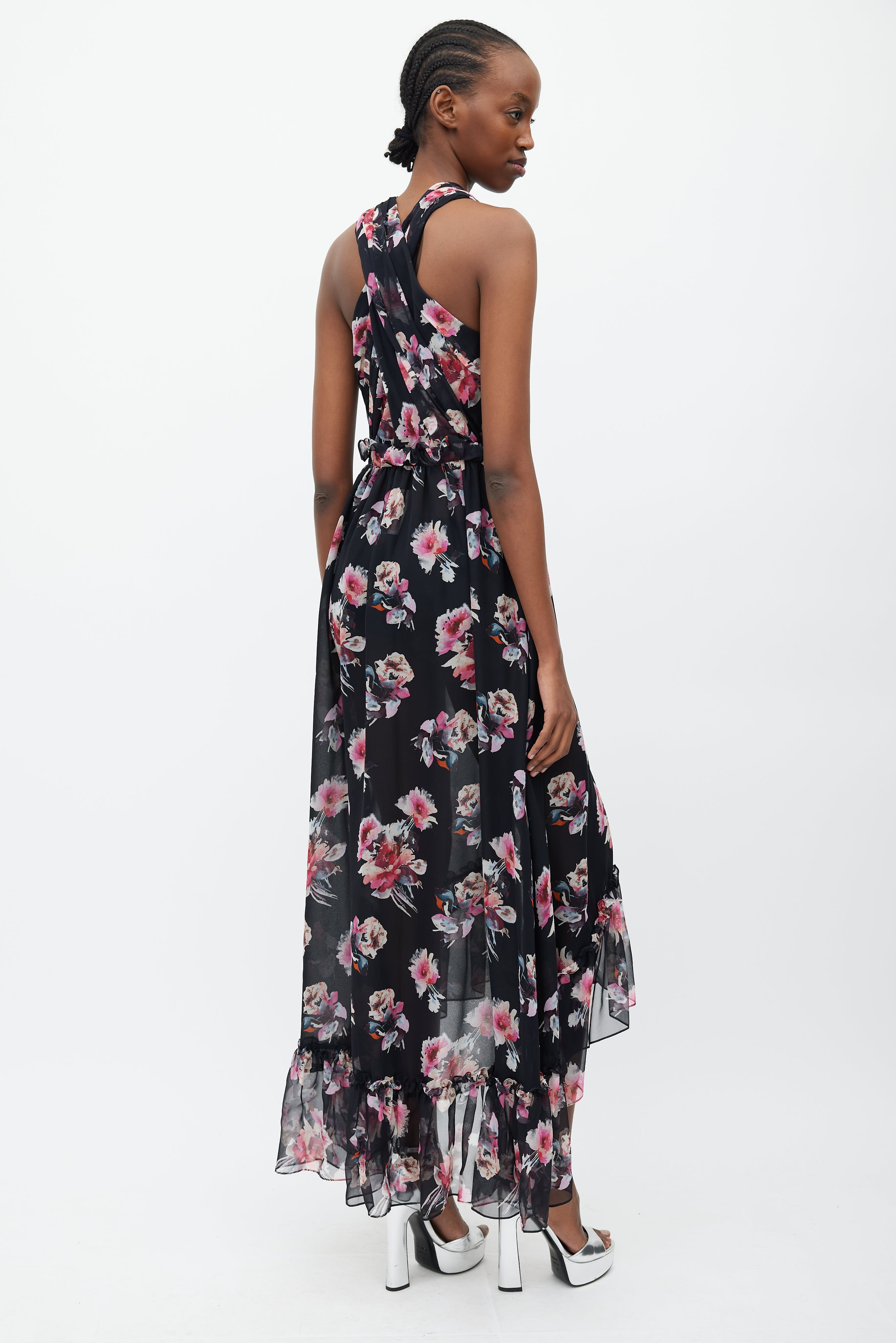 Pre-owned Victoria Beckham black silk dress featuring a multicolour floral pattern throughout, V-neckline, sleeveless styling, ruffled high low hem, and zip at side with hook and eye closure. Lined.