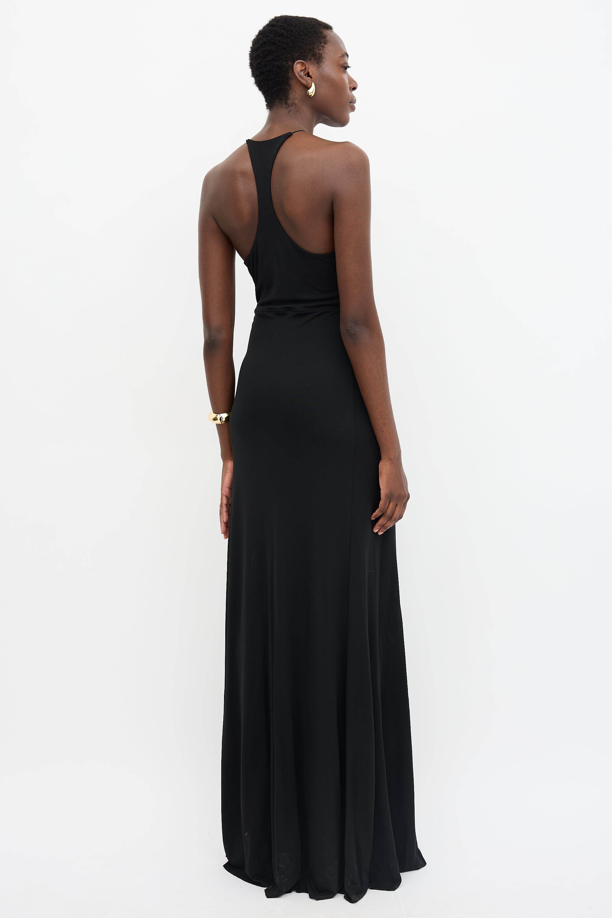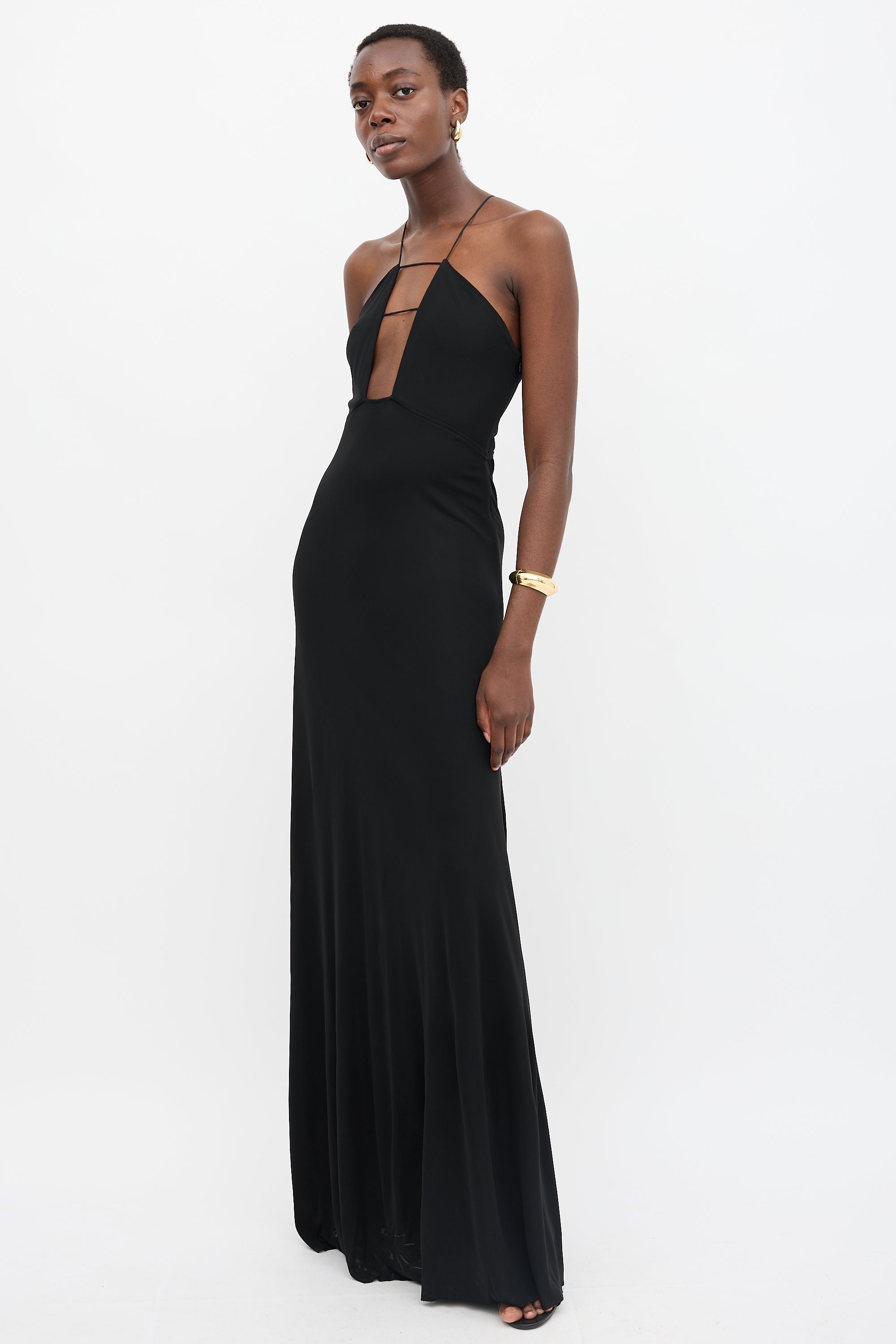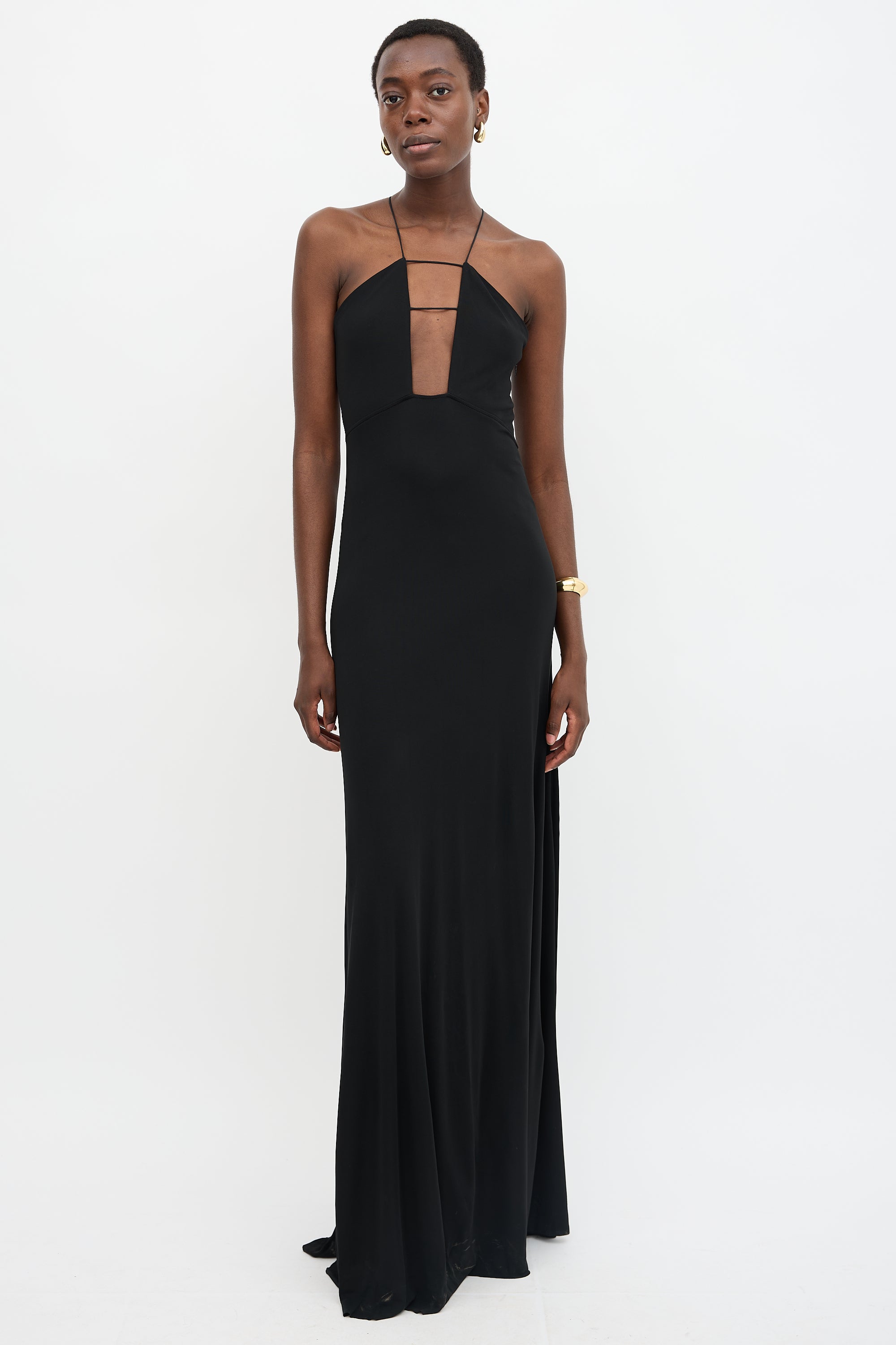 Pre-owned Victoria Beckham black crepe gown featuring thin straps, plunging cut out chest with boning, racer back, and concealed side zip. Lined.