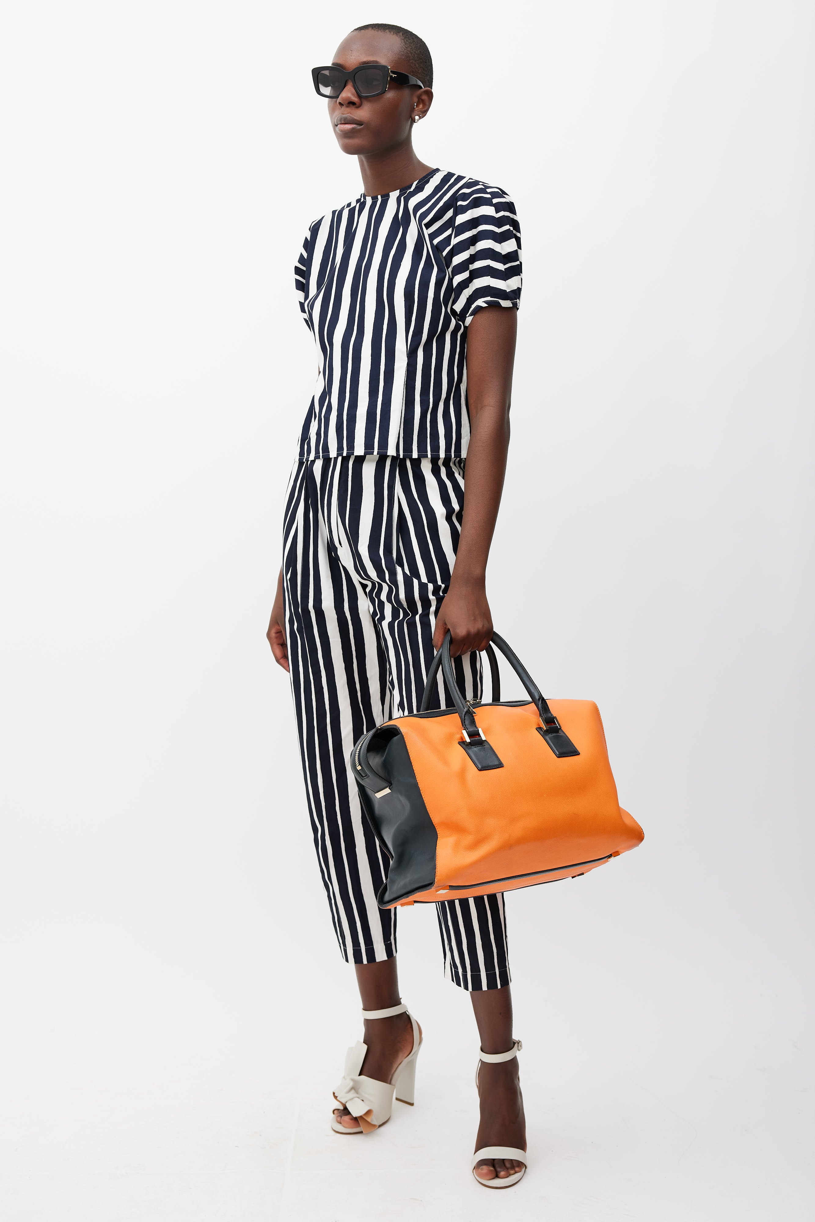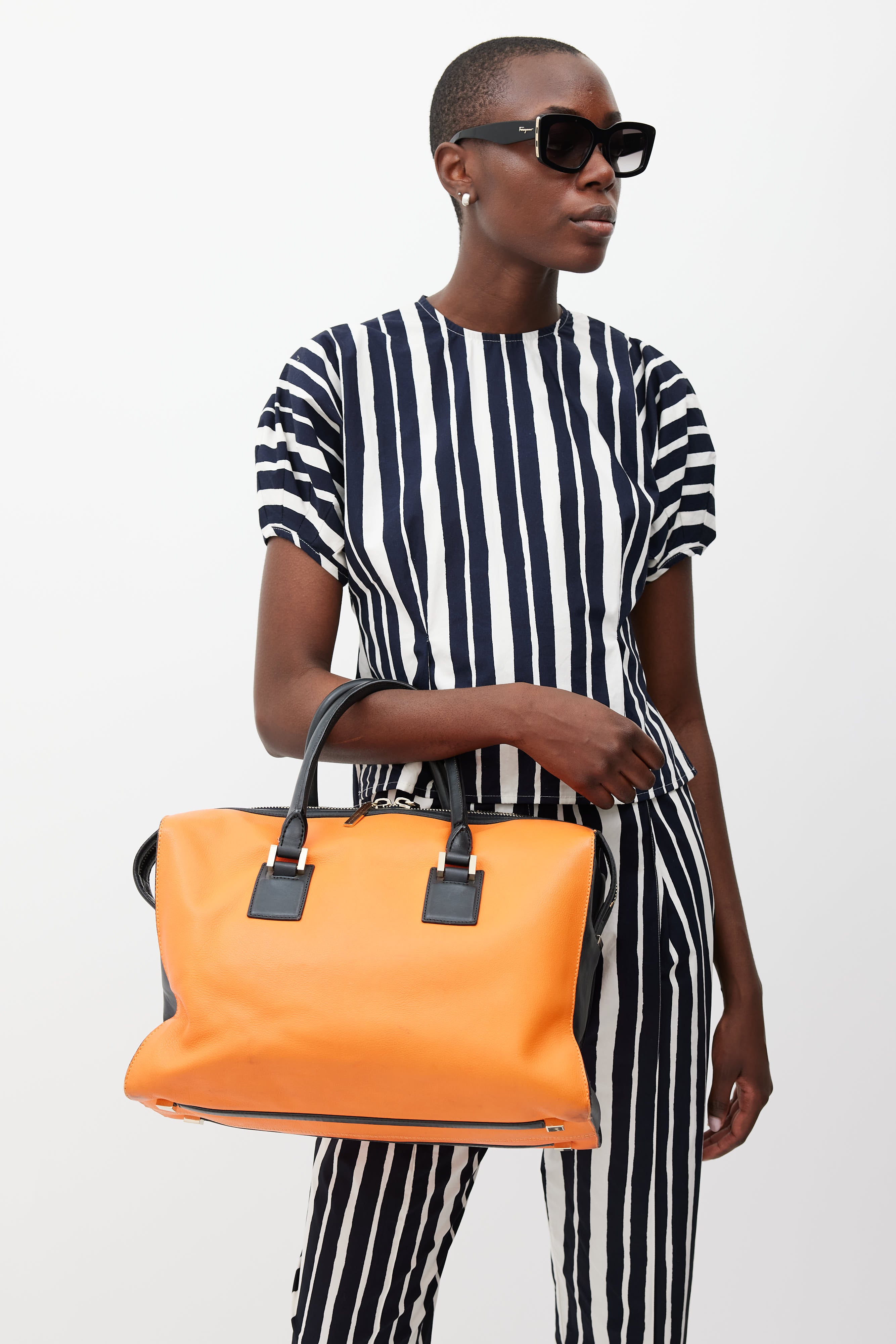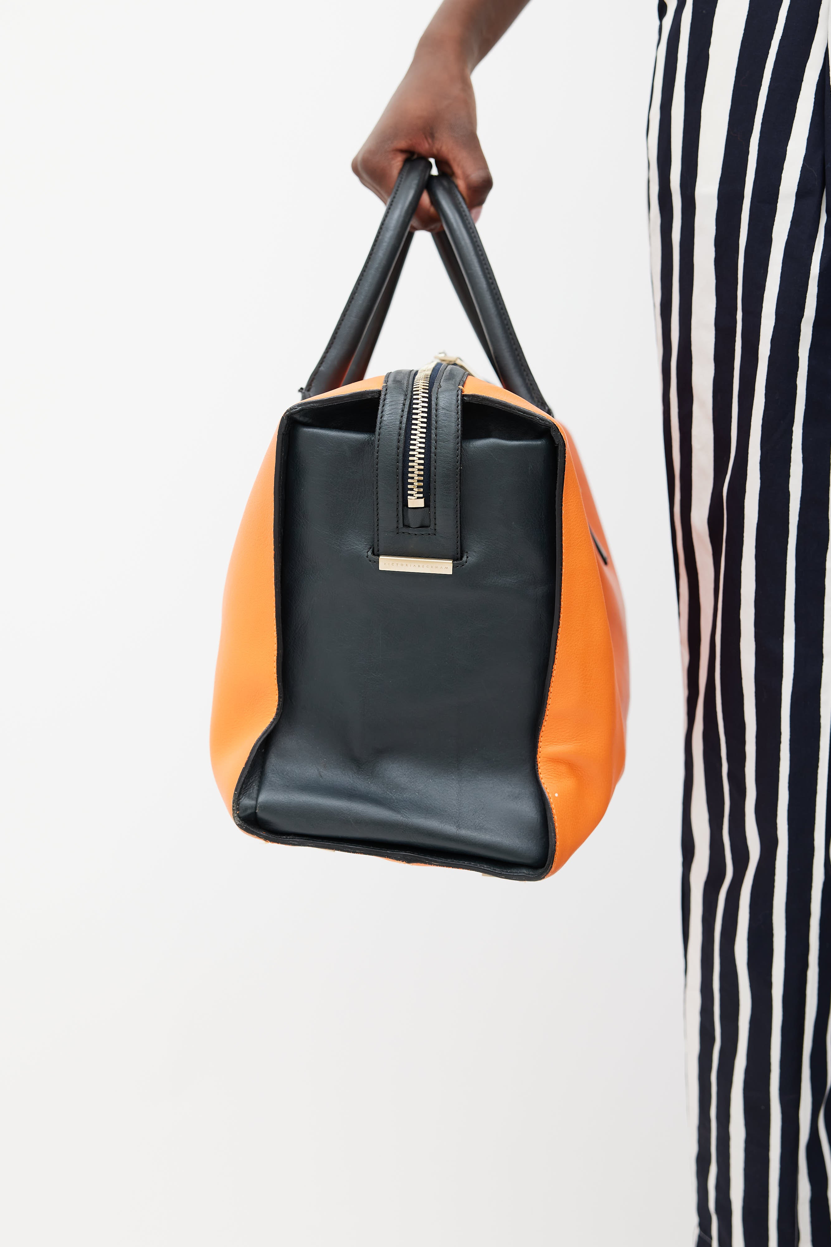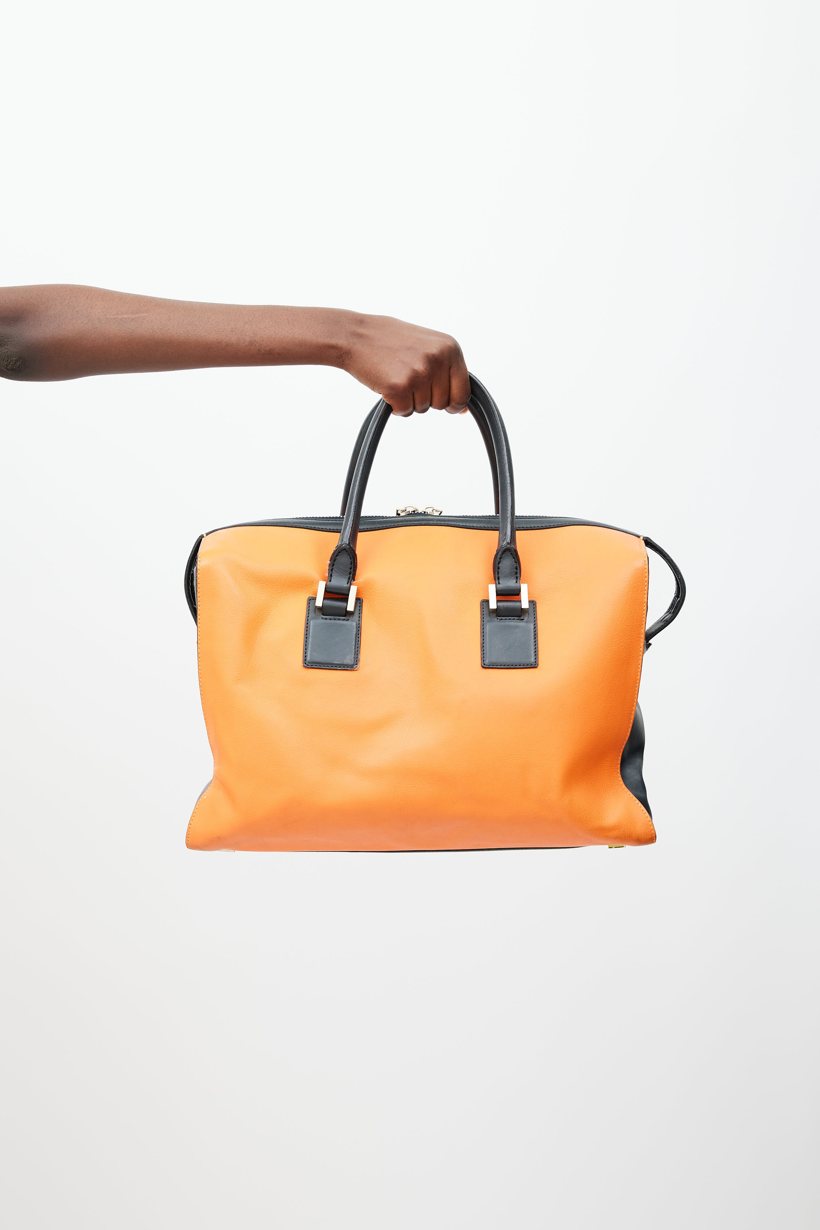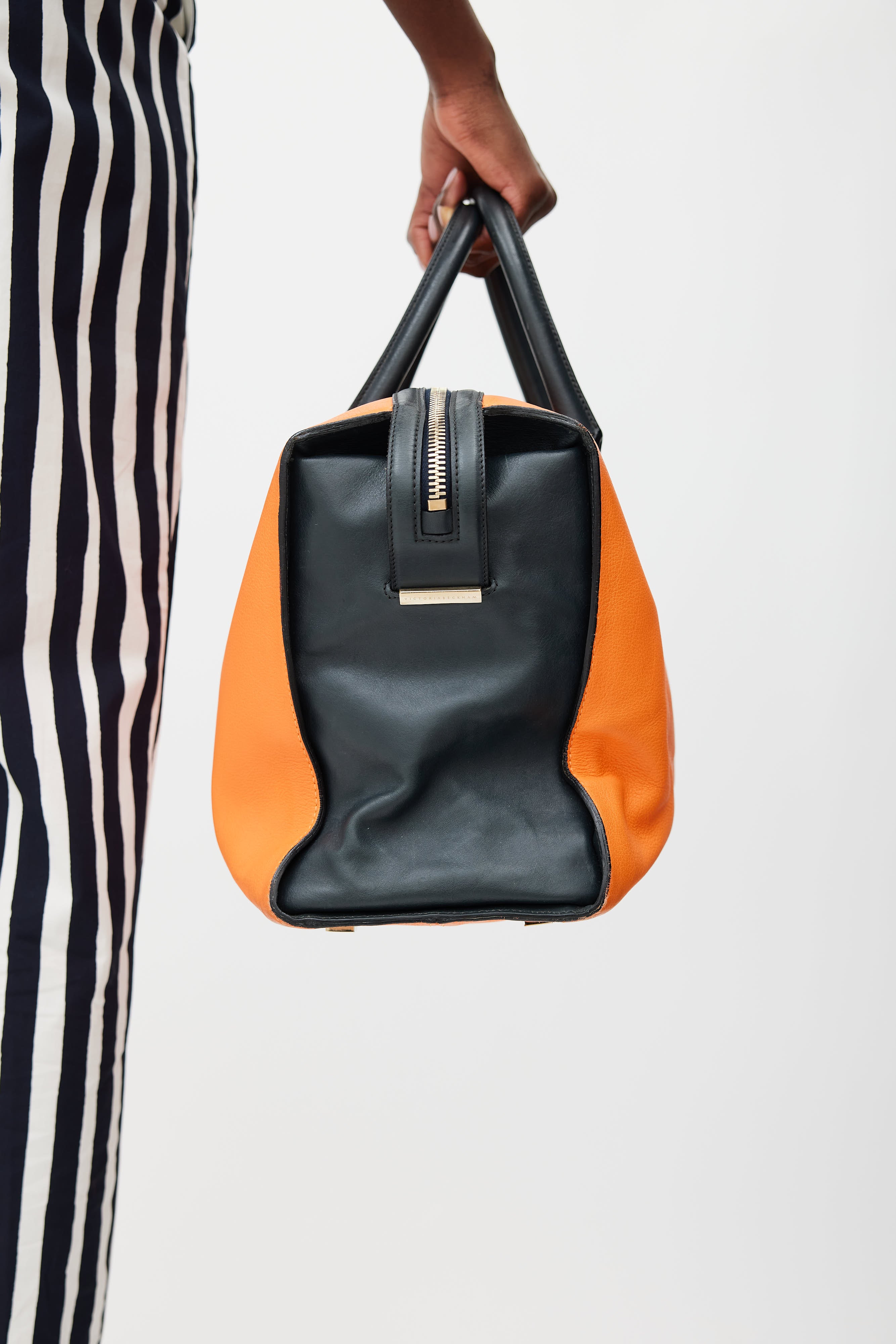 Pre-owned Victoria Beckham orange leather bag featuring two wrapped top handles, black trim at sides, one main compartment with two slip pockets and one zip pocket, gold tone hardware at bottom of bag, and top zip closure. Comes with original dust bag.