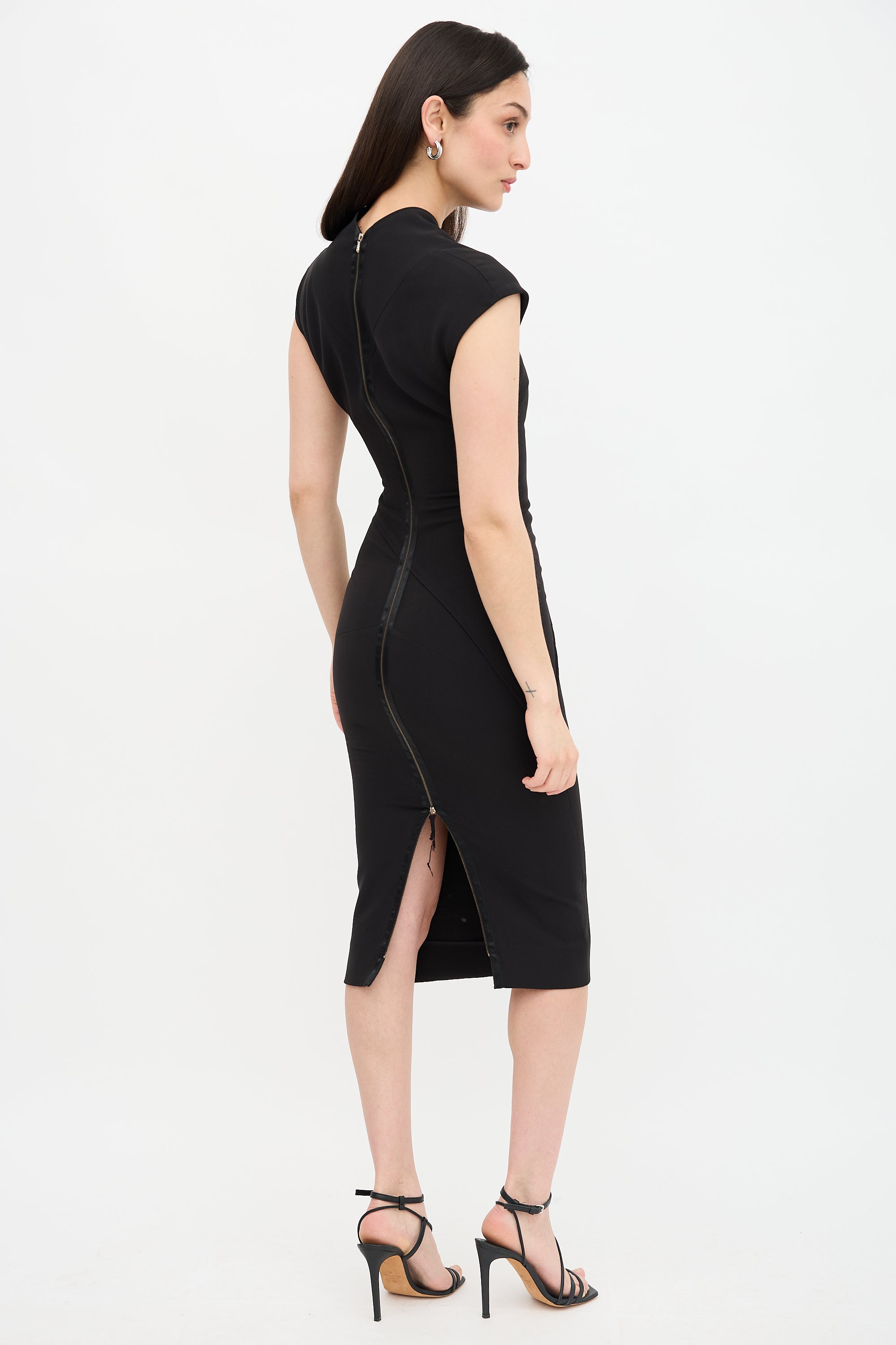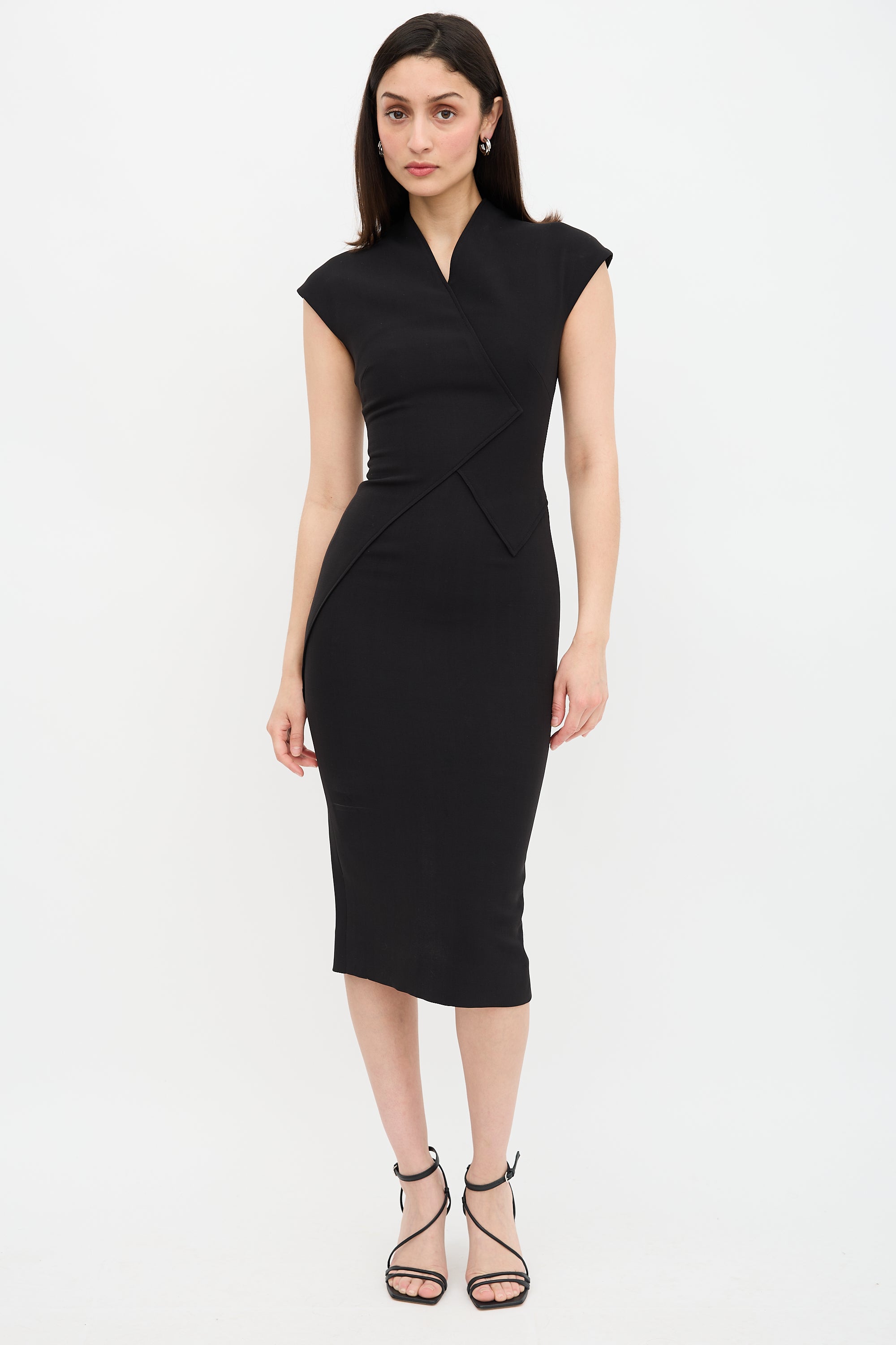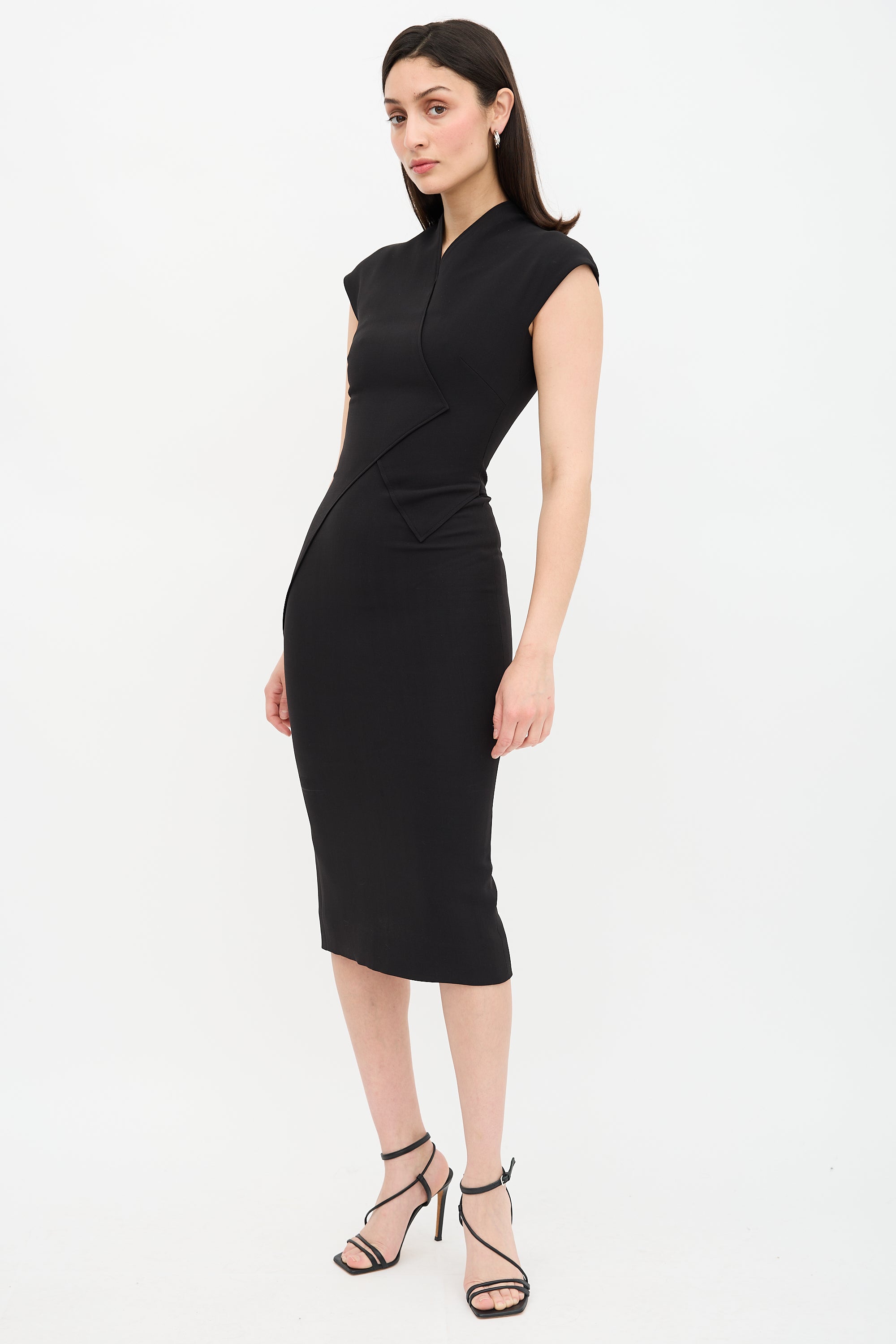 Pre-owned Victoria Beckham black silk and wool dress featuring V-neckline, front asymmetrical panels, cap sleeves, and back two-way zip with tonal silk trim. Unlined.