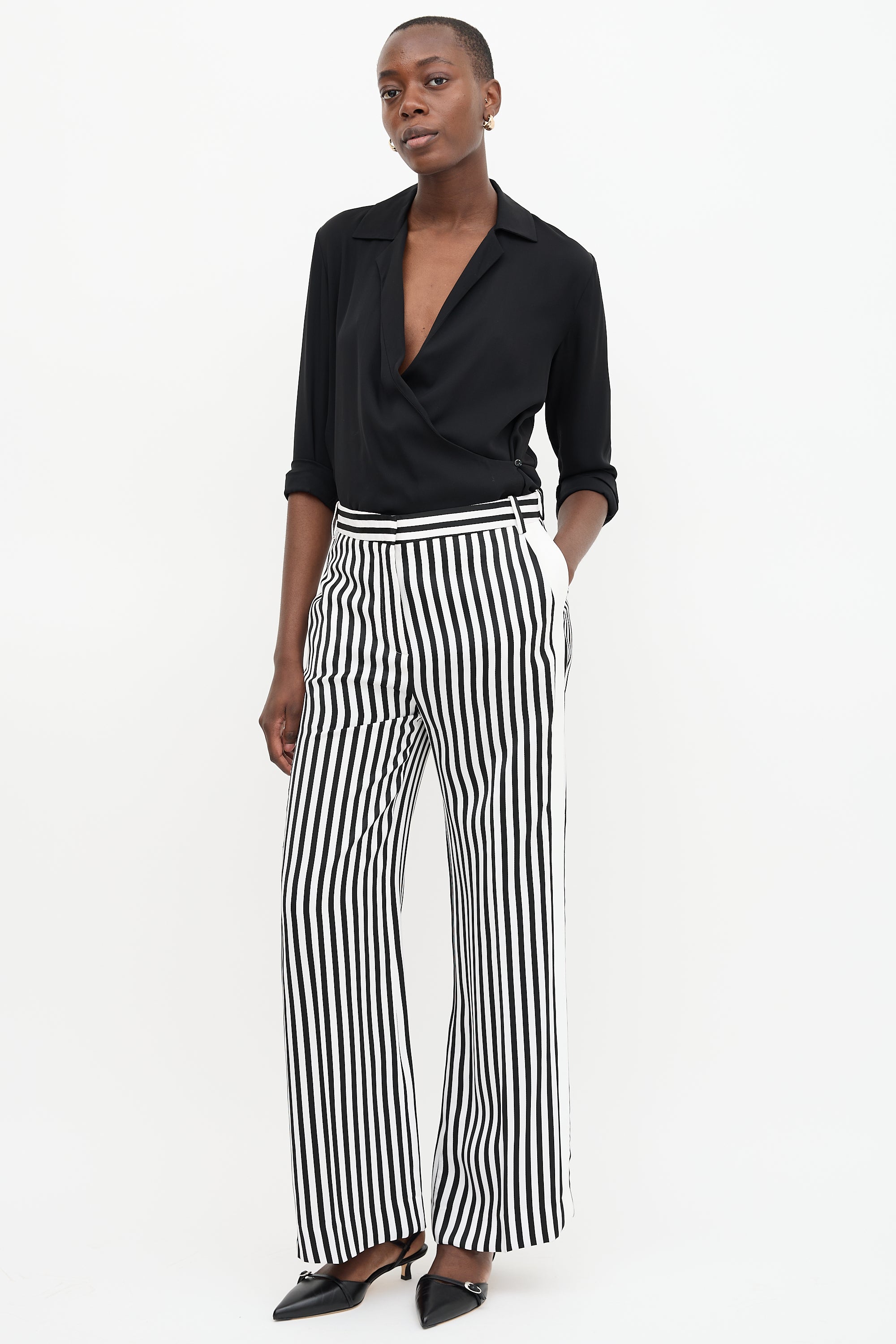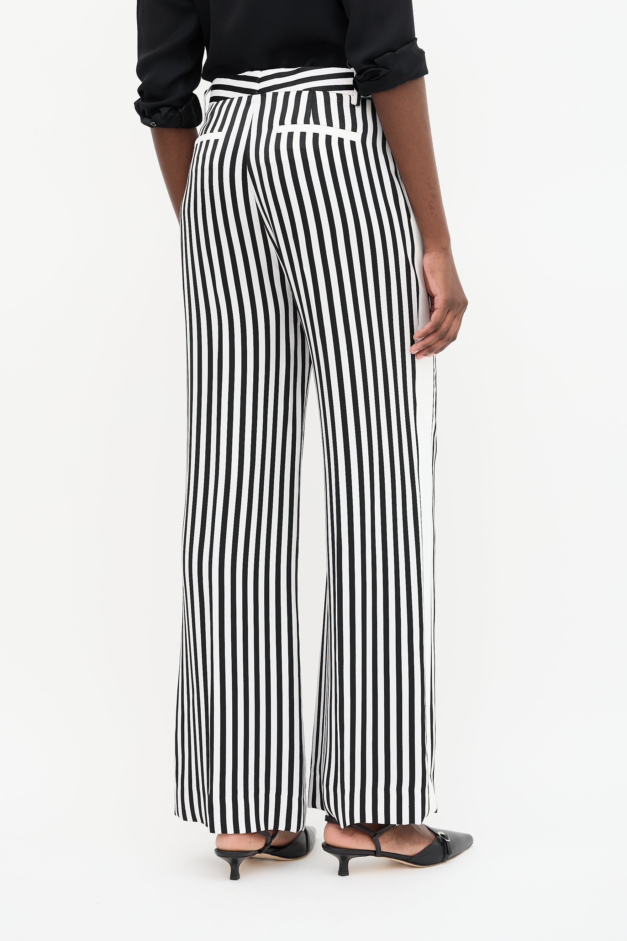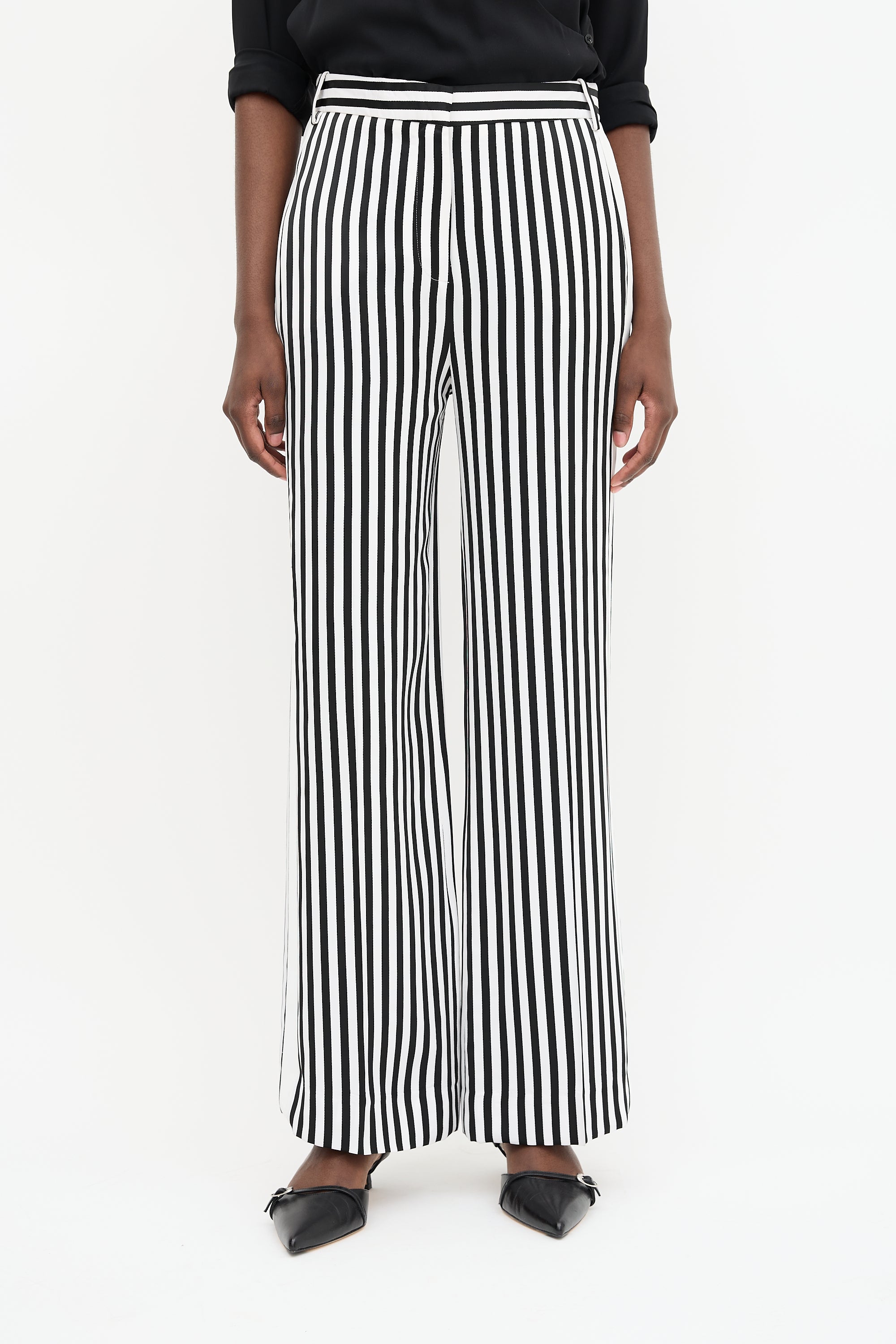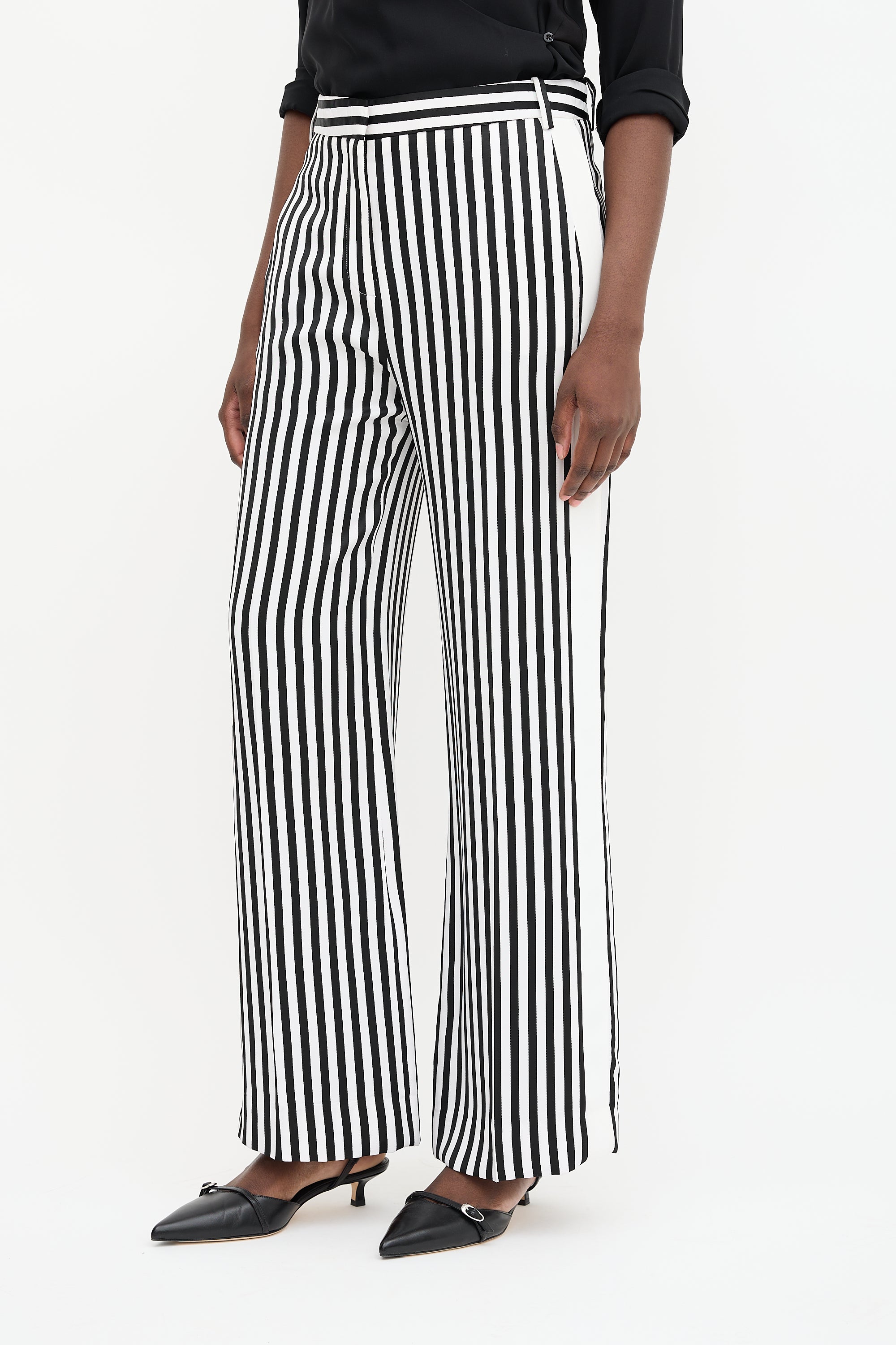 Pre-owned Victoria Beckham black and white striped wide leg pants featuring high waist, in seam pockets, and concealed front zip.