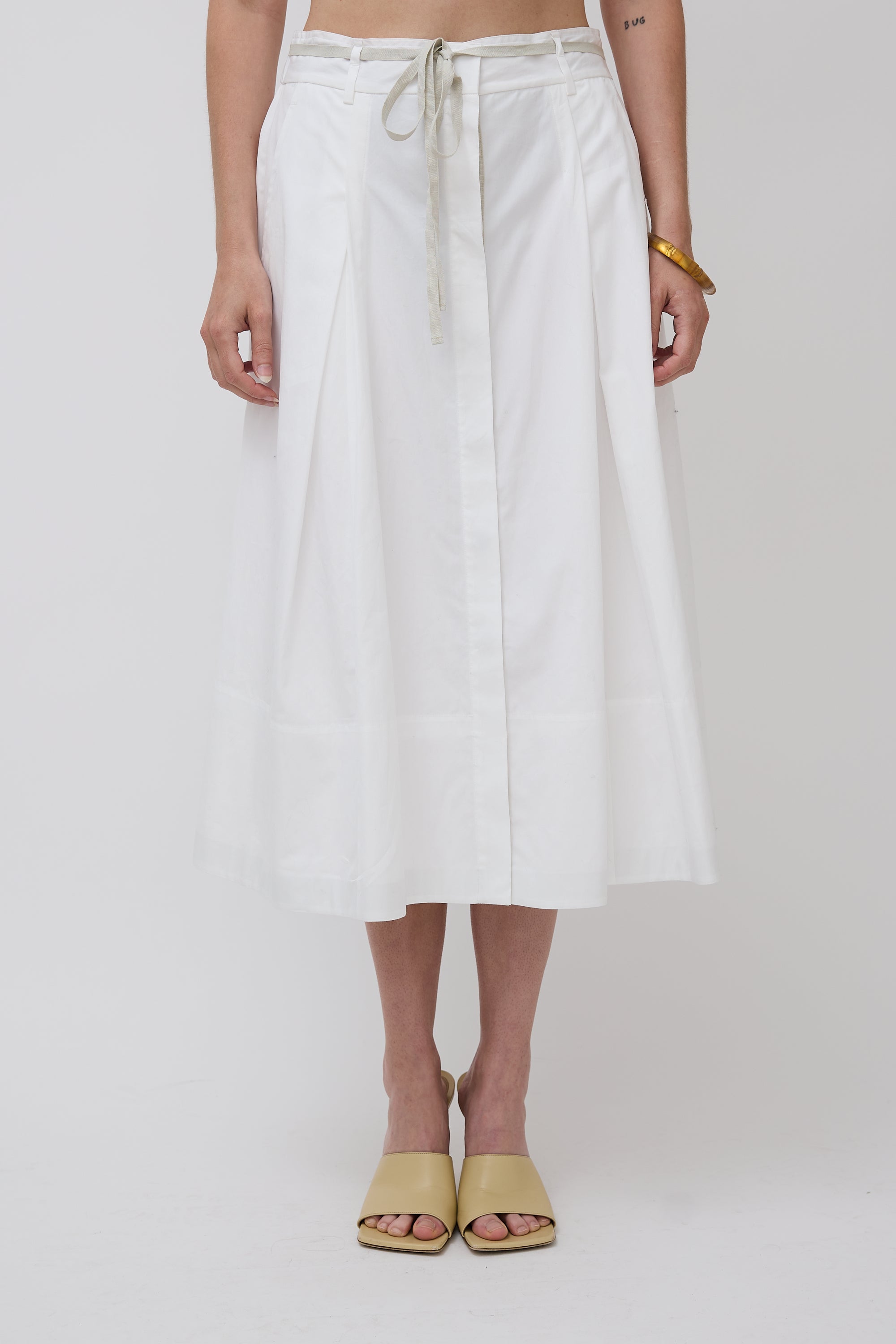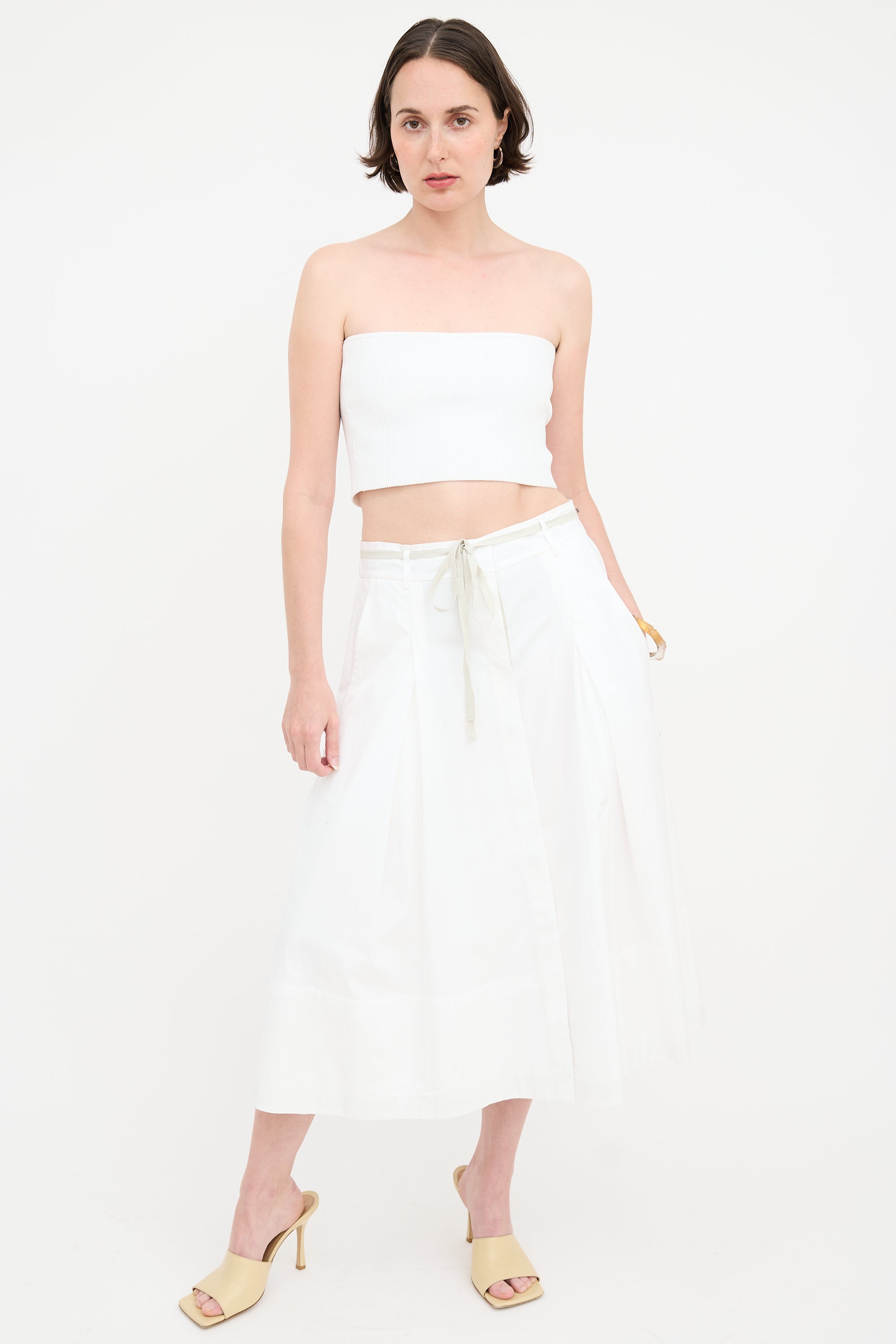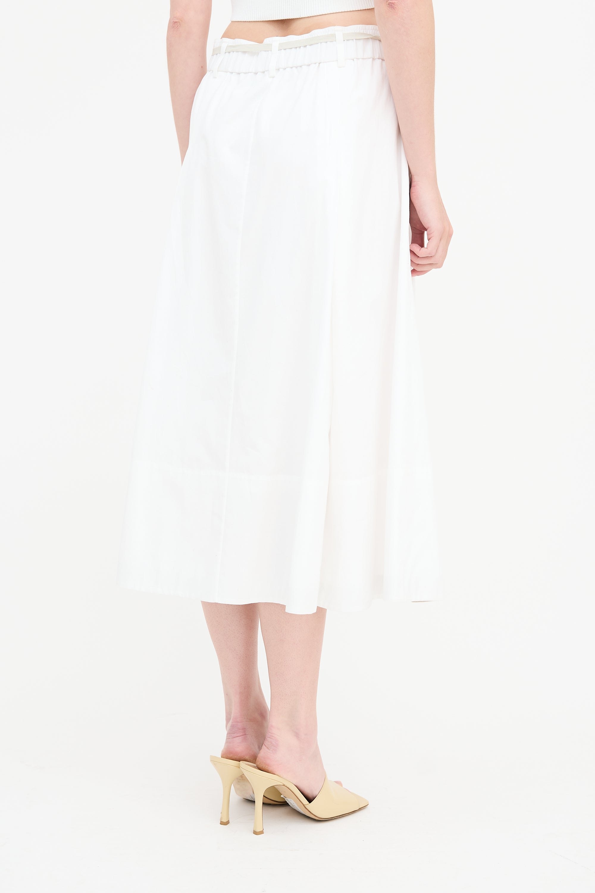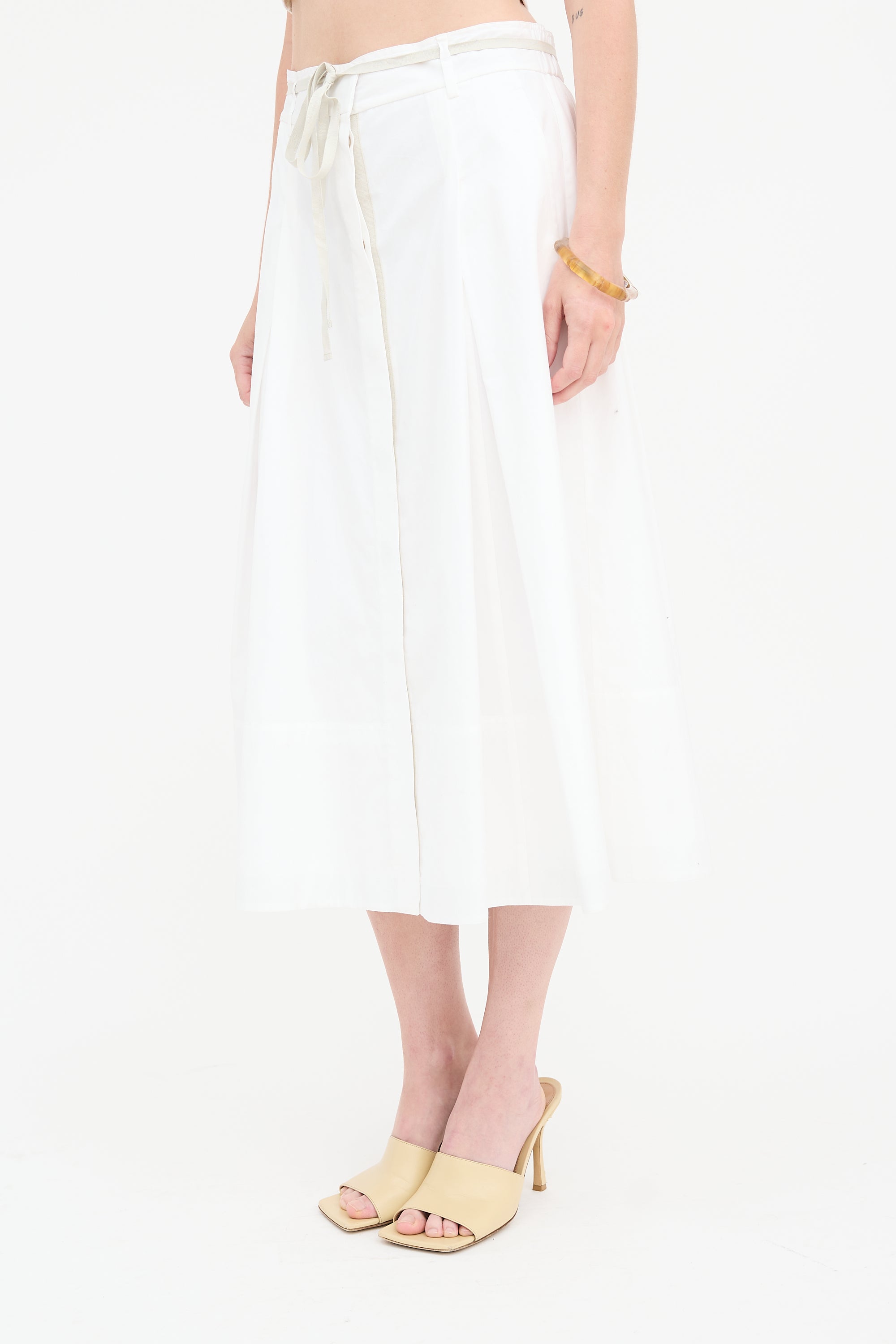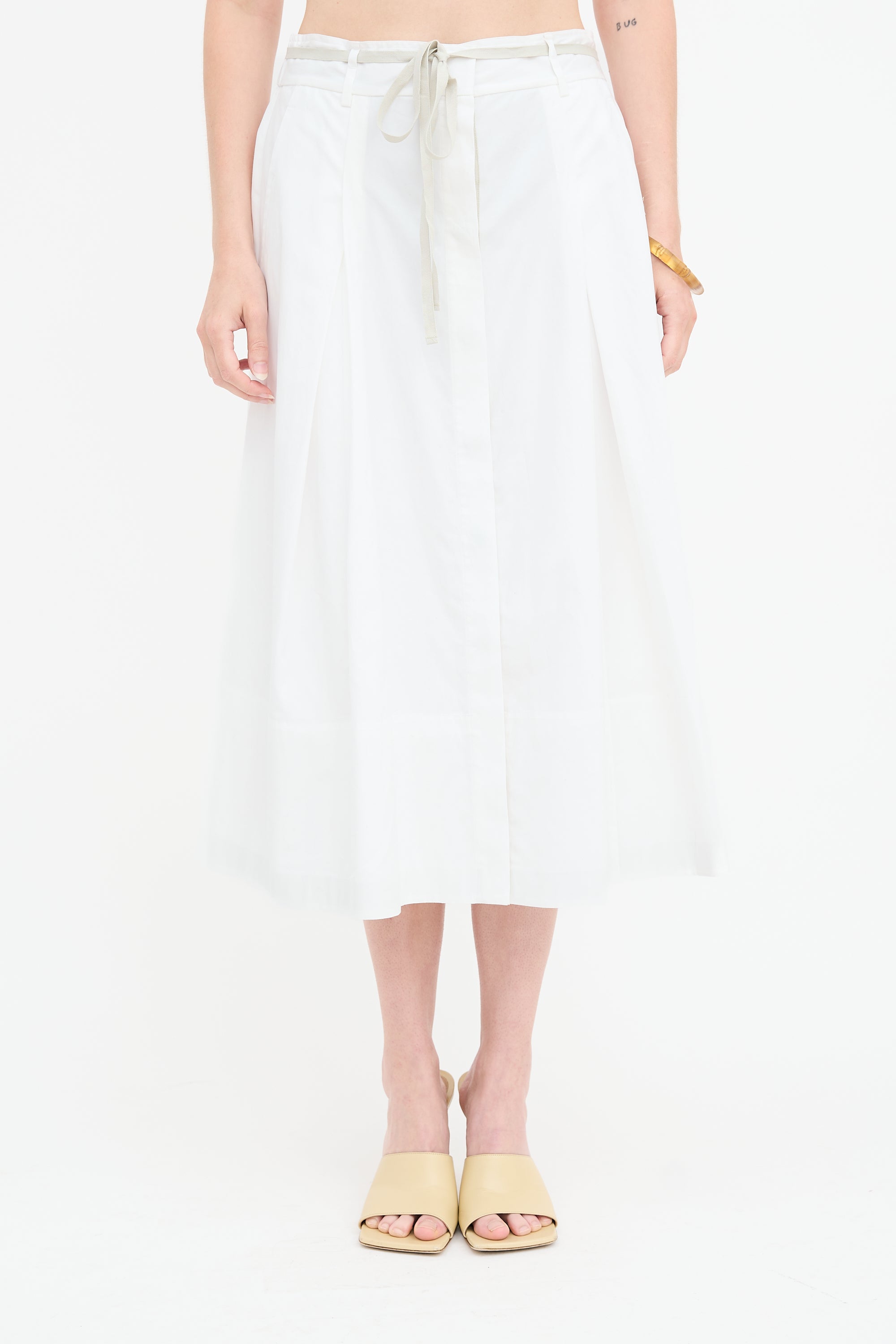 Pre-owned Vince white midi skirt featuring elasticized waist, ribbon belt, two front slash pockets, front and back pleating, front vent, and concealed button front closure. Lined.