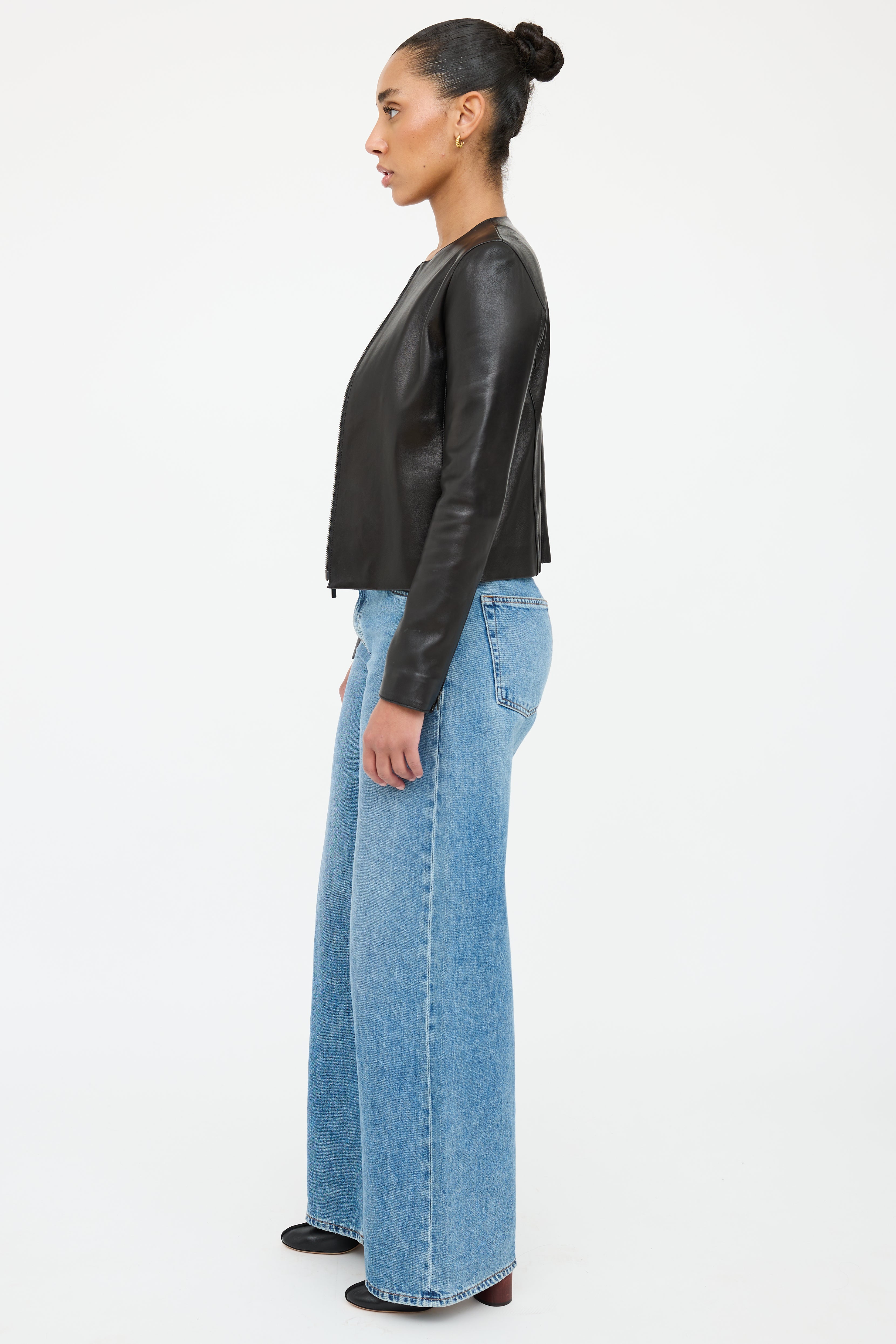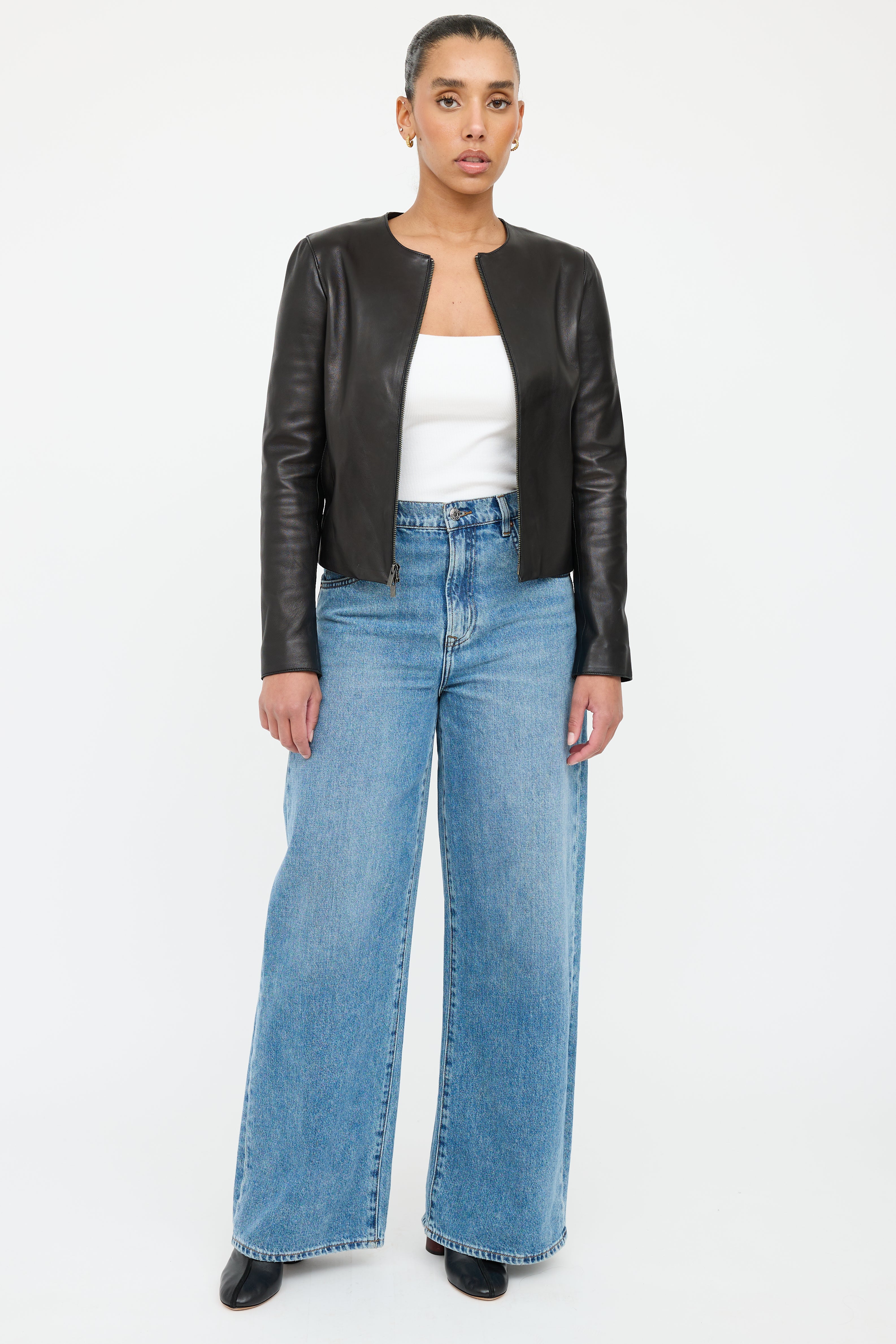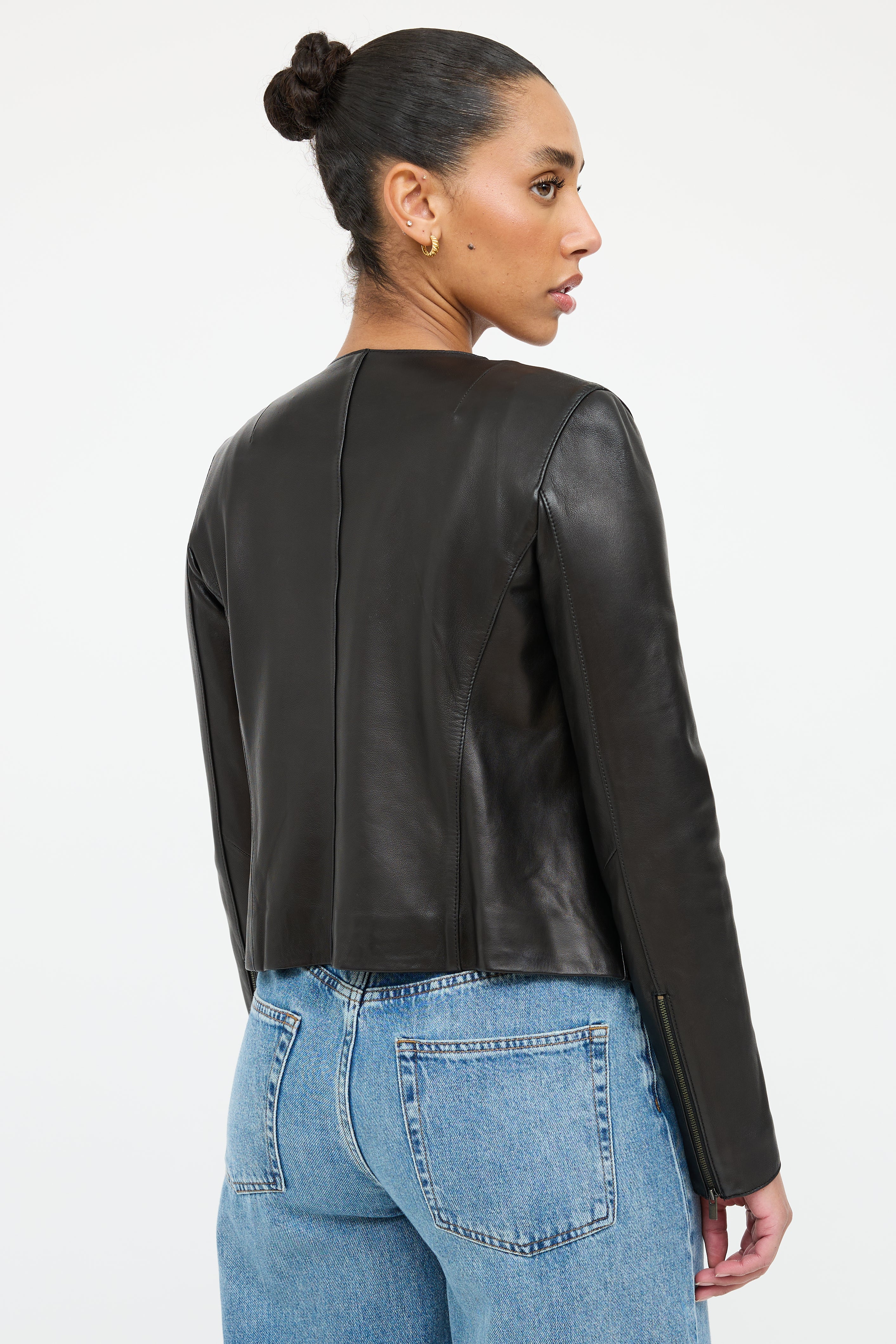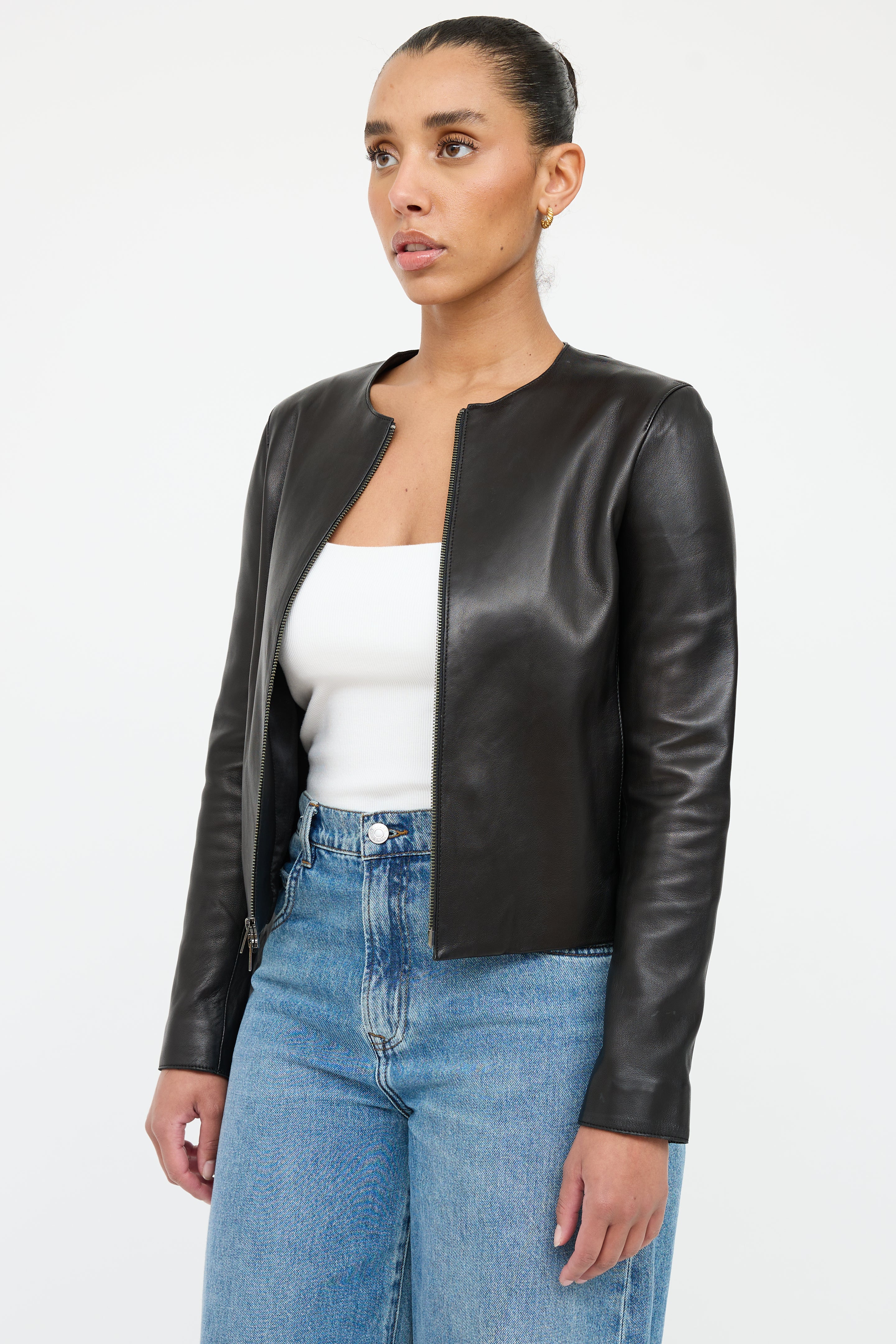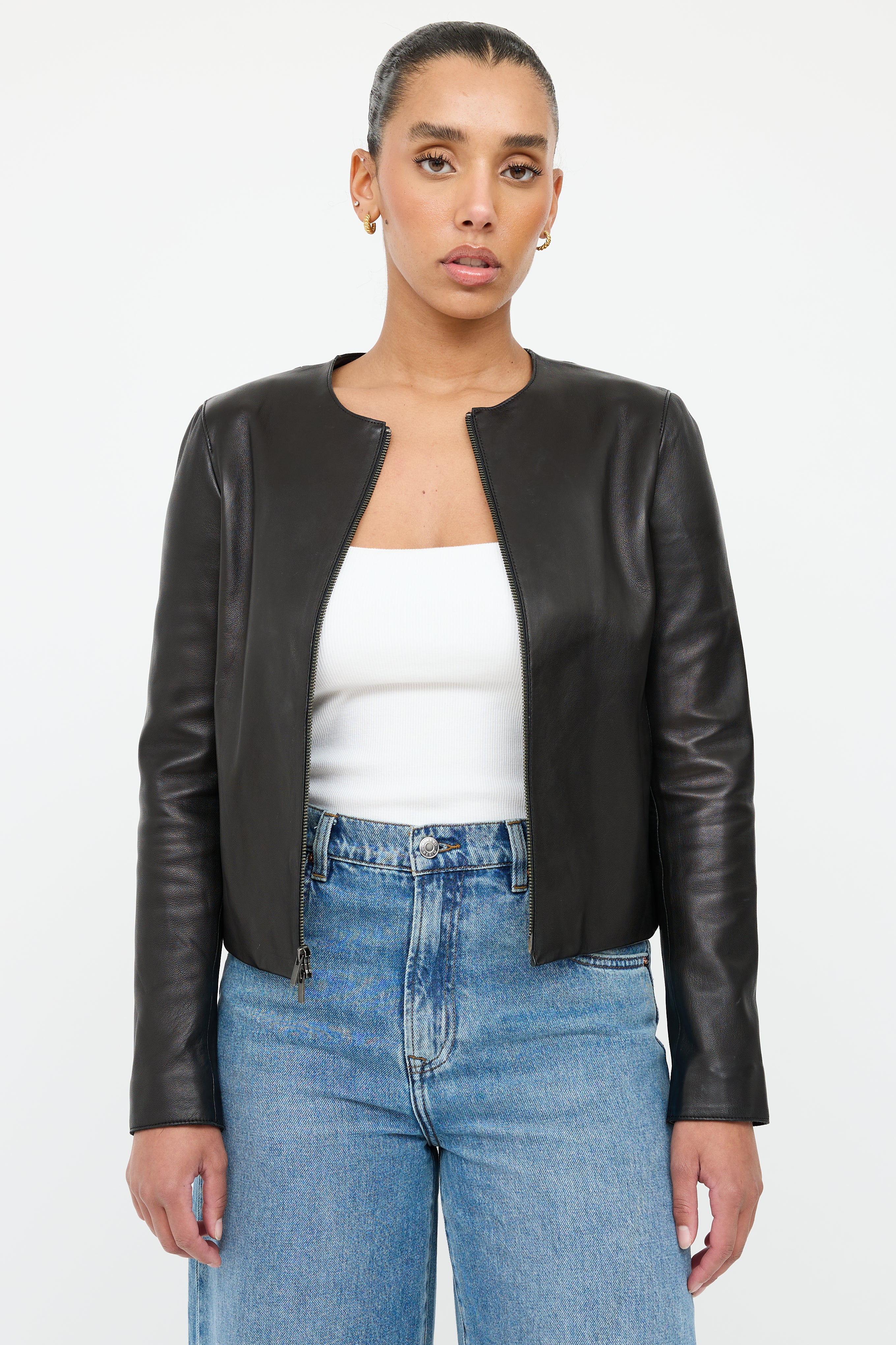 Pre-owned Vince black lamb leather cafe jacket featuring a round neckline, long sleeves with zipped cuffs, two slip pockets at hip, and zip closure. Lined.