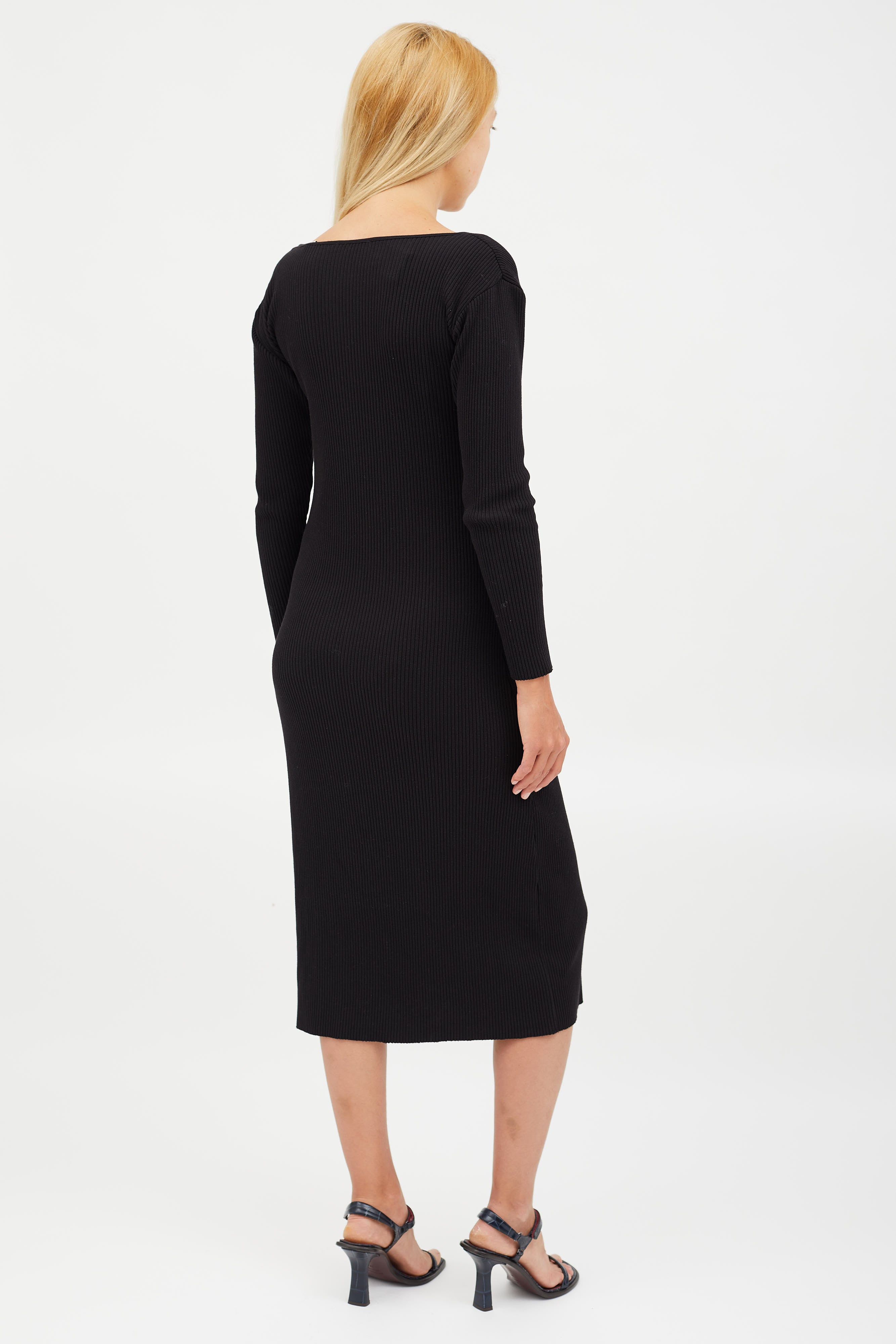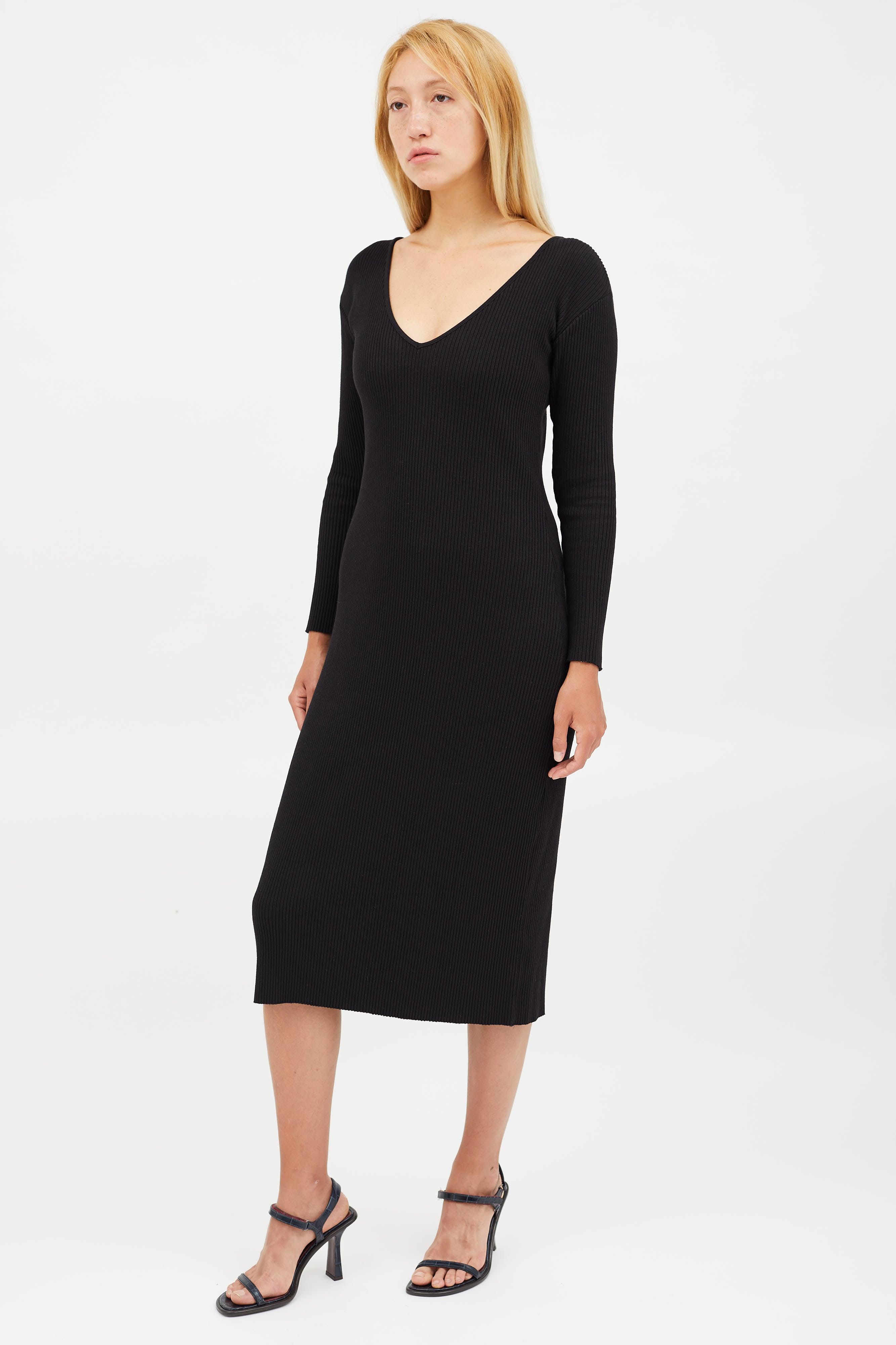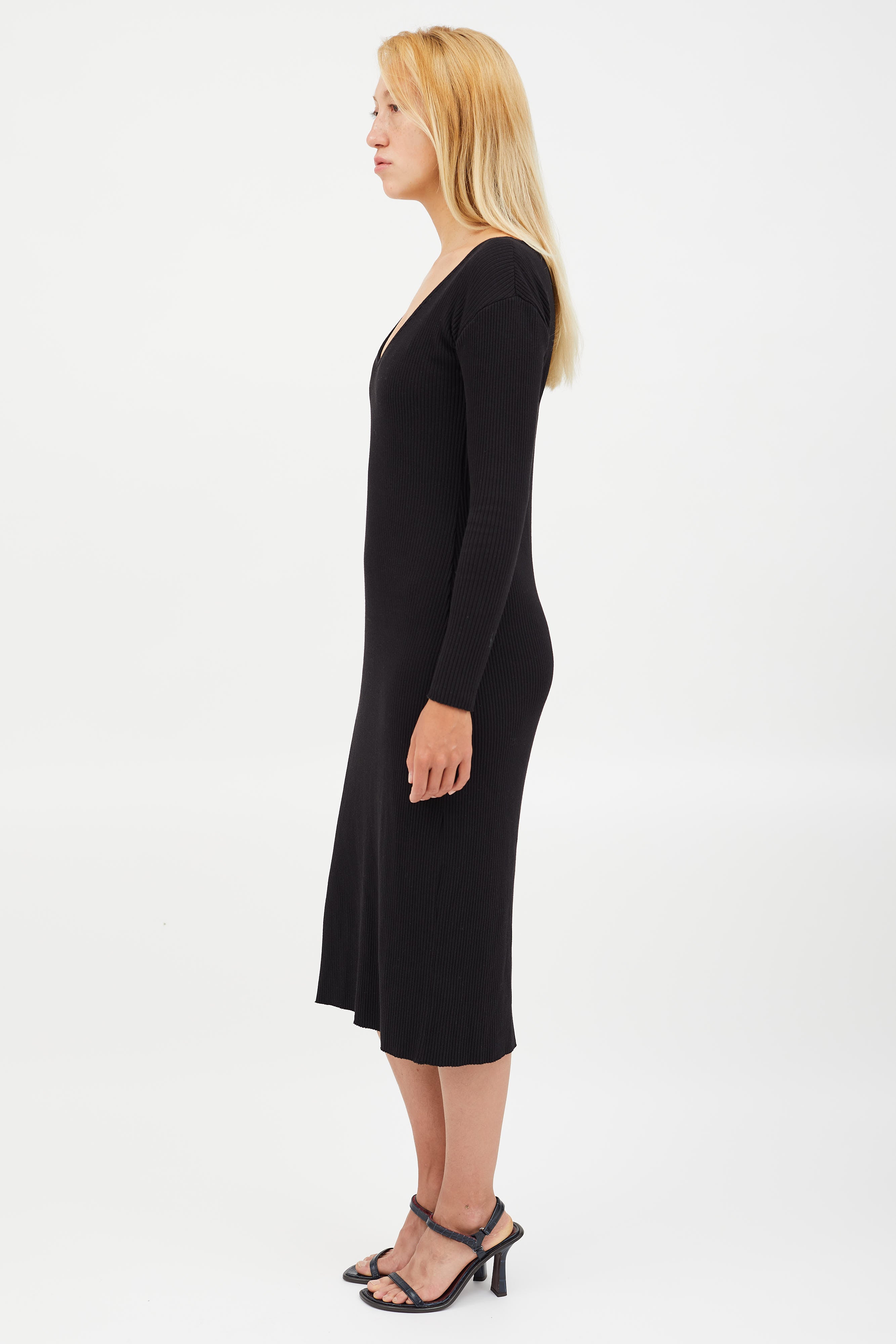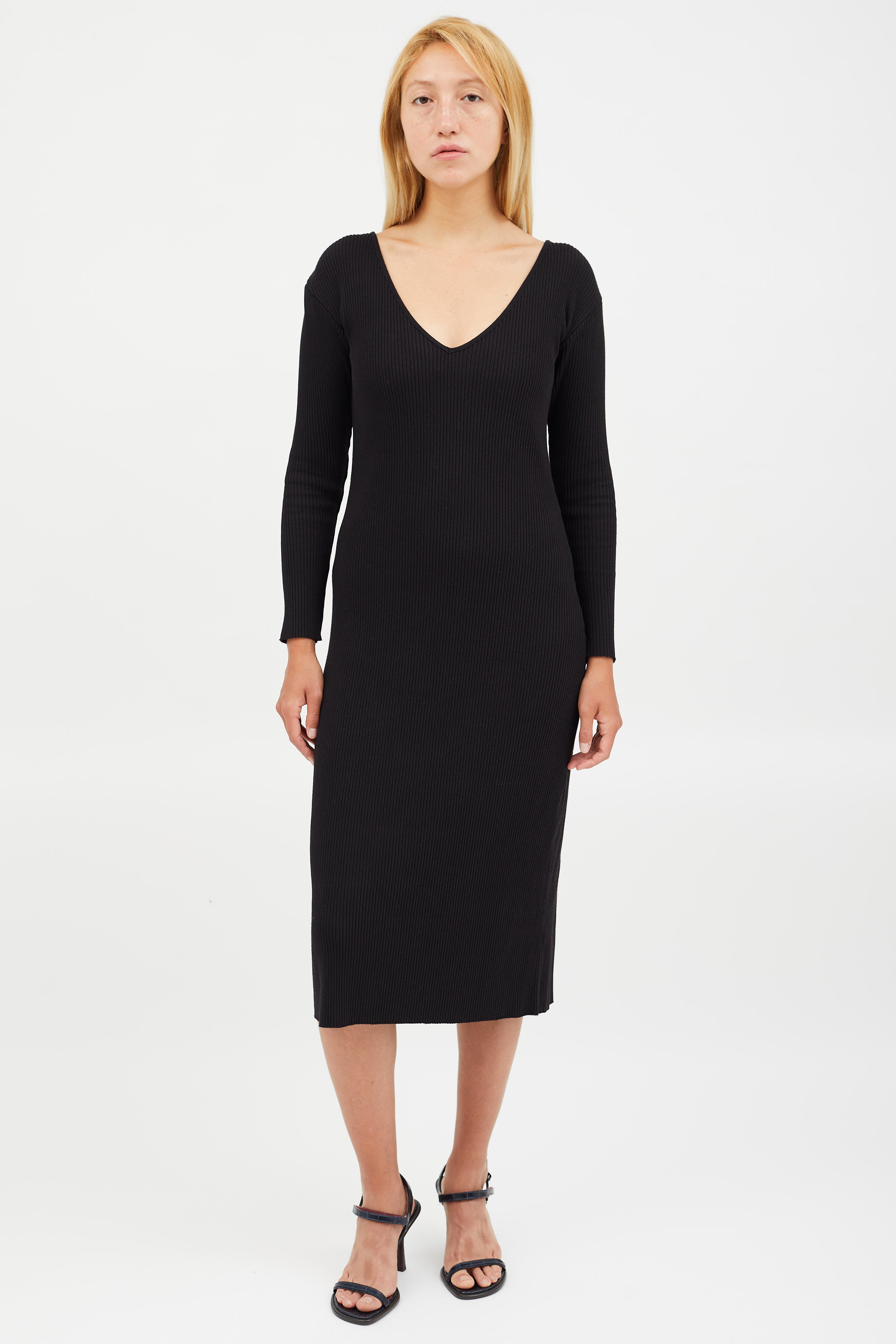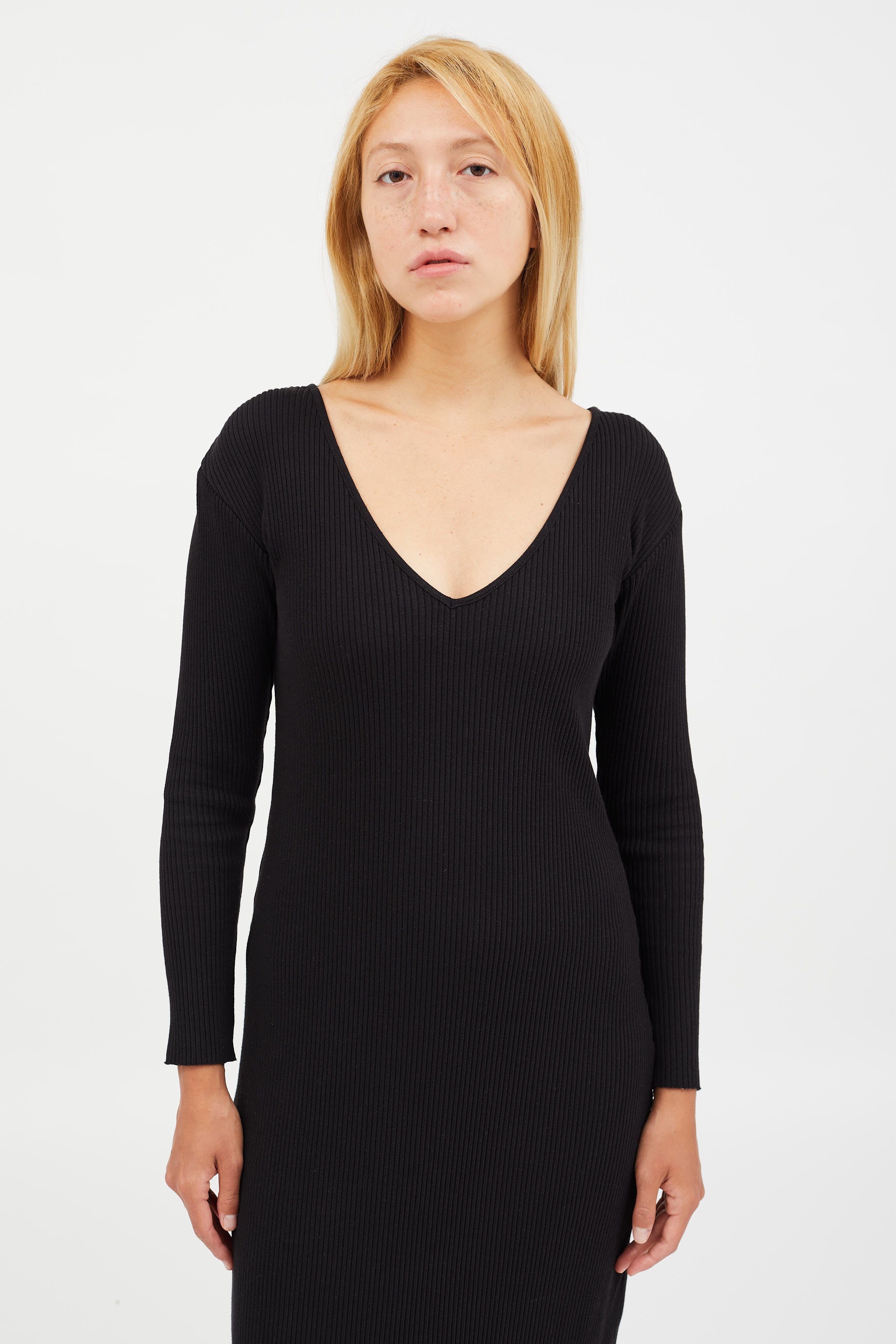 Pre-owned Vince black ribbed midi dress featuring a V-neckline, long sleeves with raw look hem, relaxed fit and a mid length skirt.