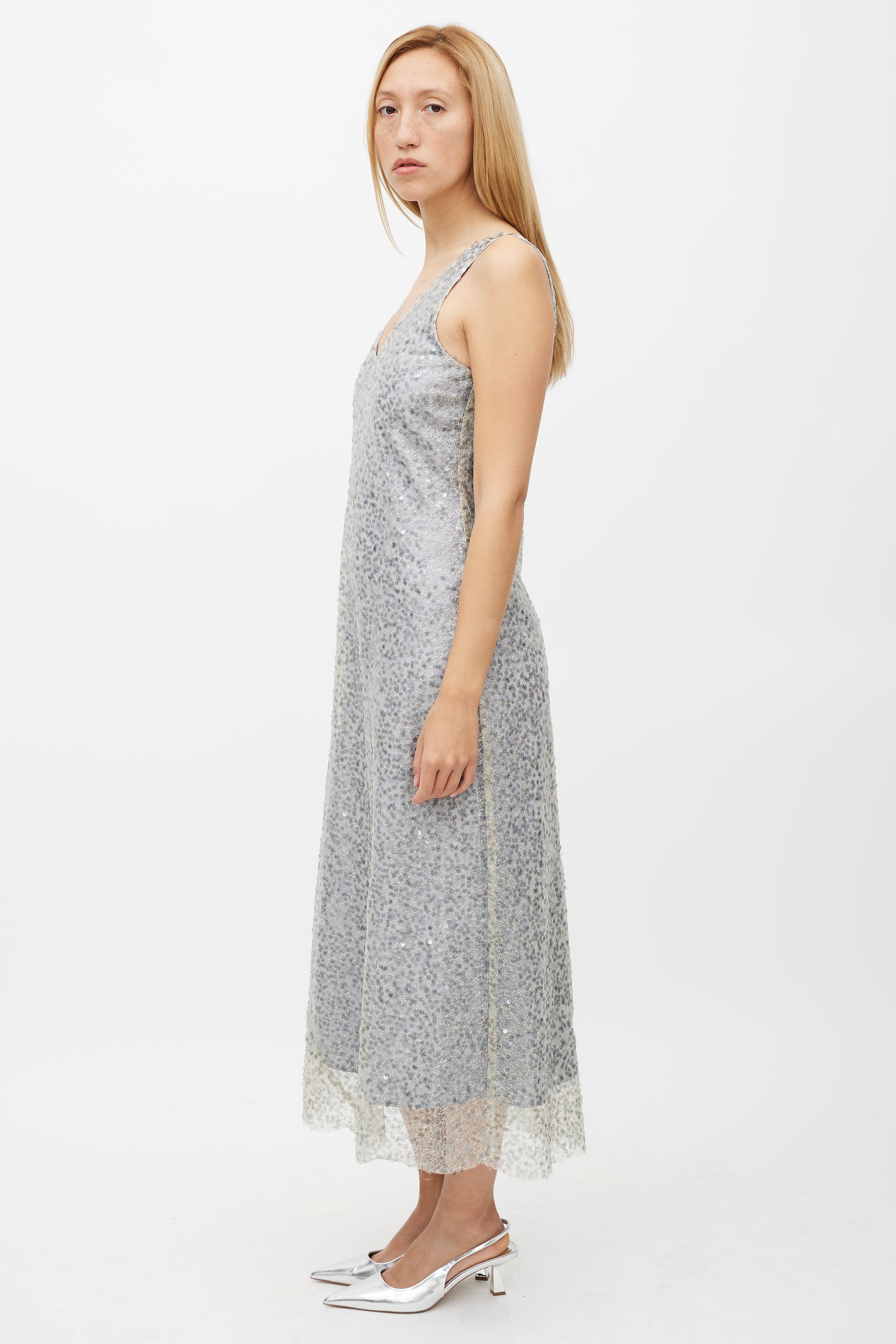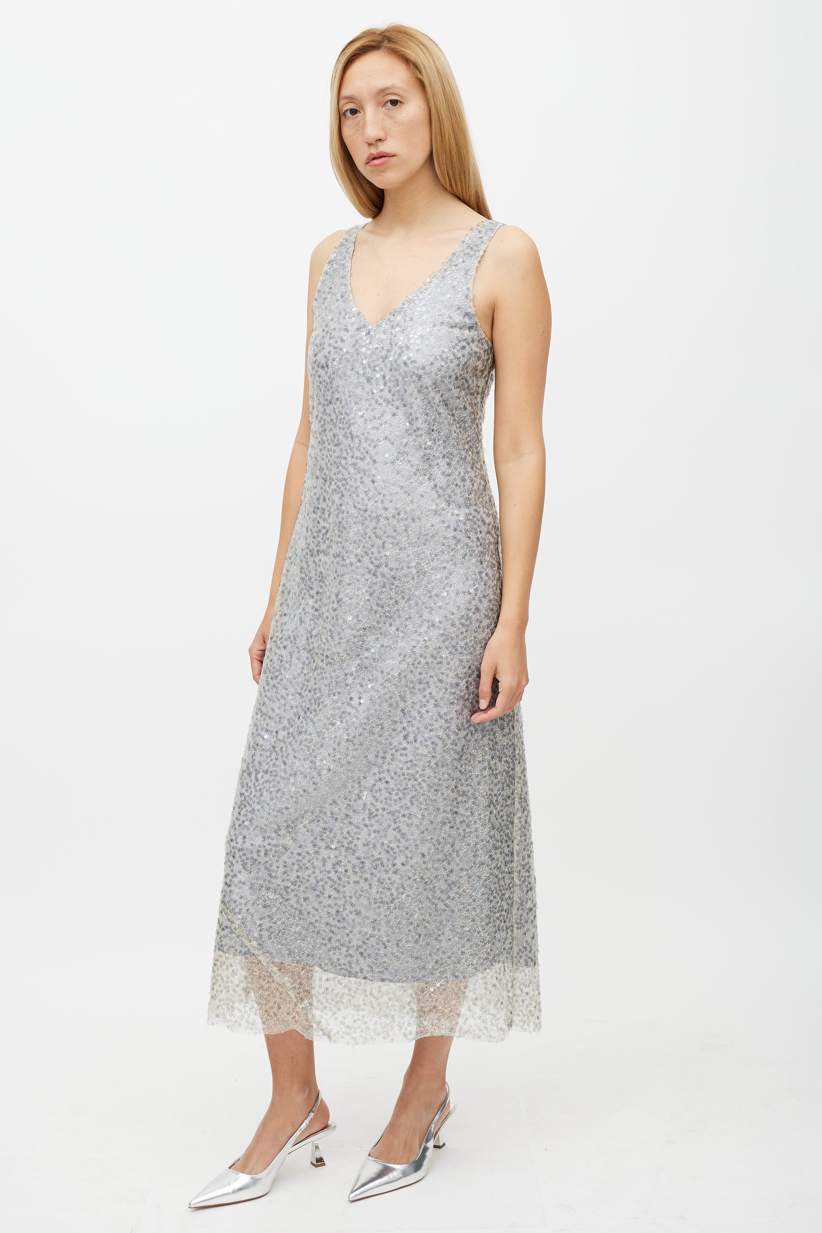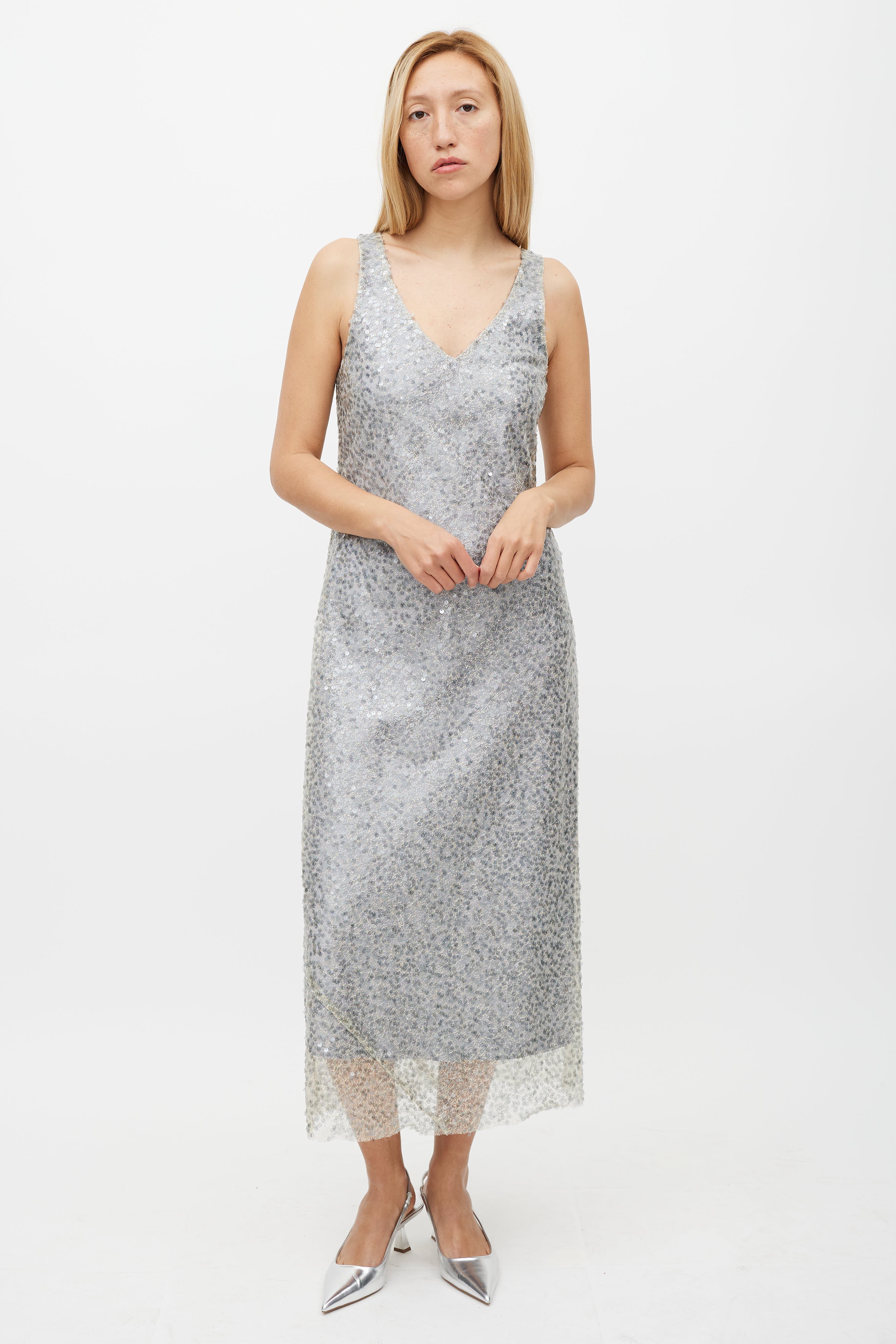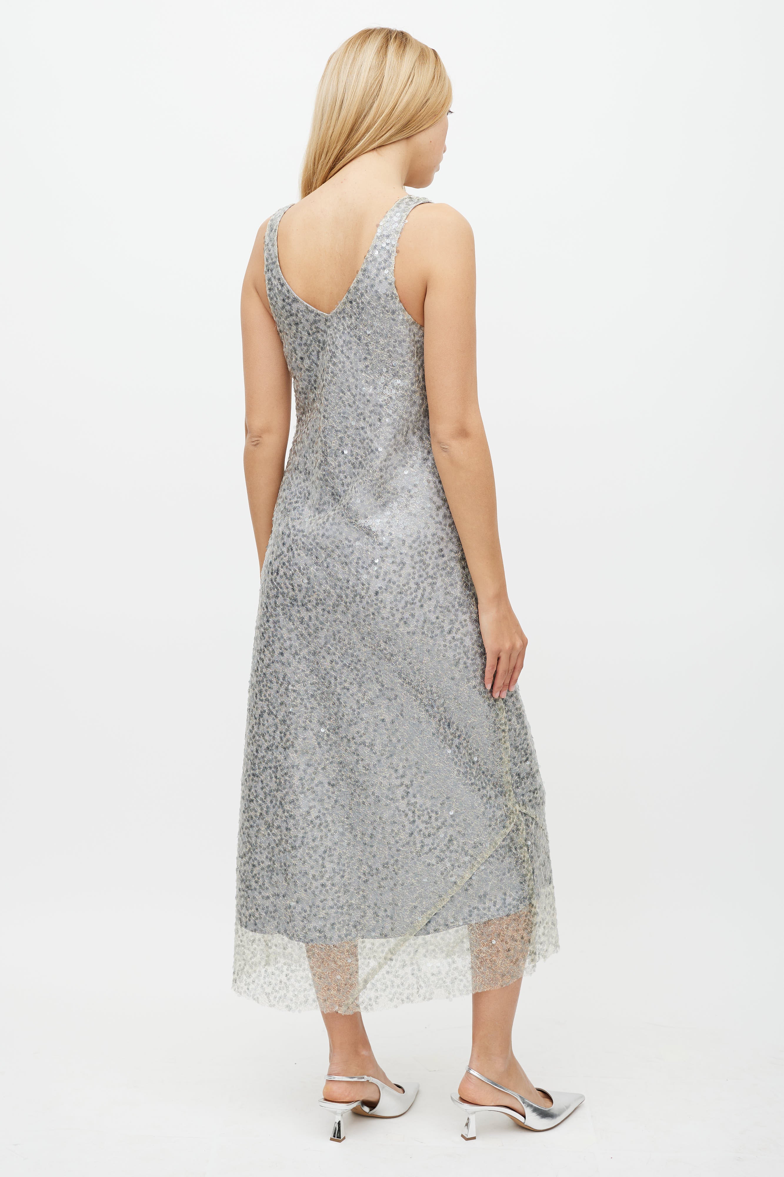 Pre-owned Vince silver dress featuring mesh sequin overlay, V-neckline, and sleeveles styling. Lined.
