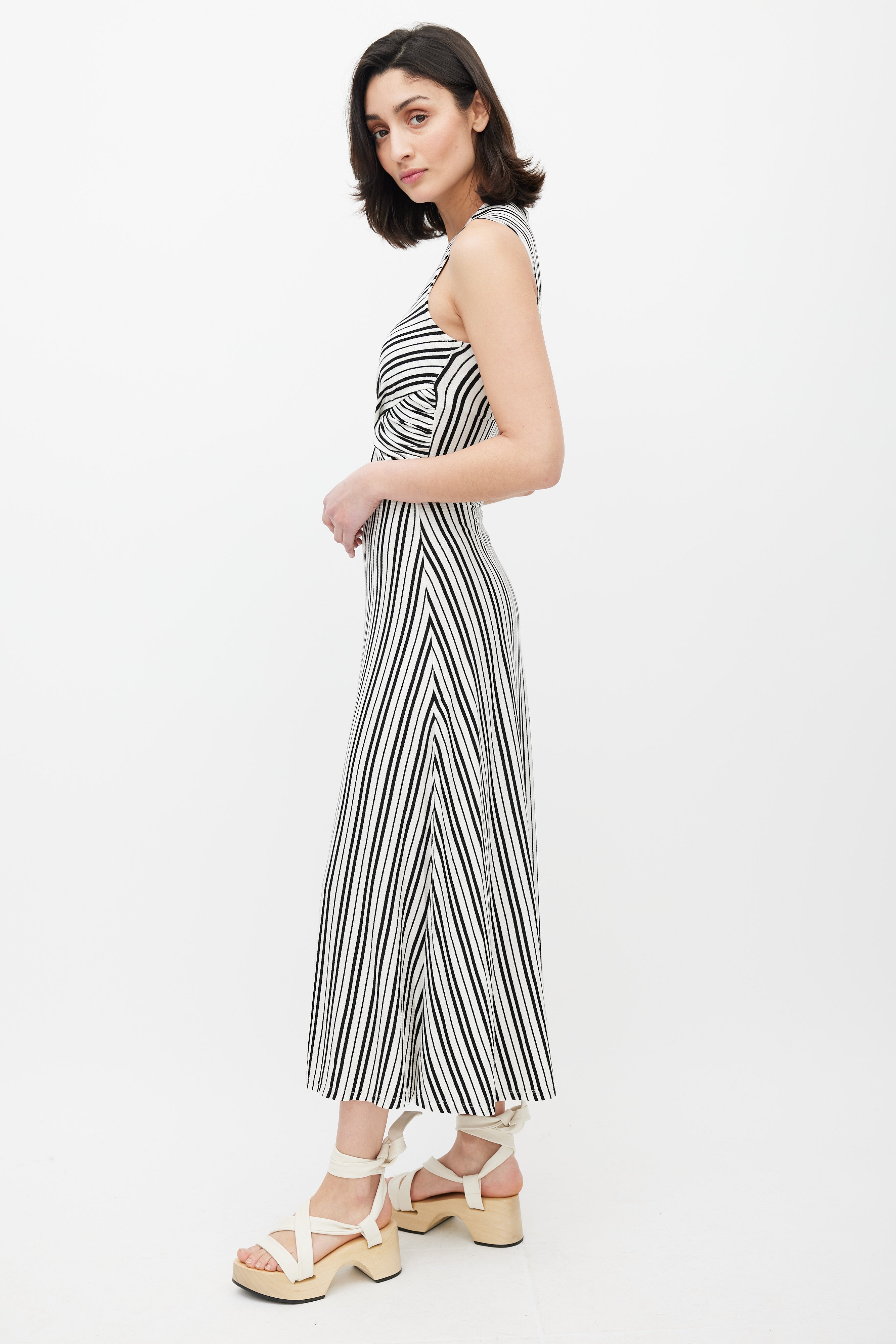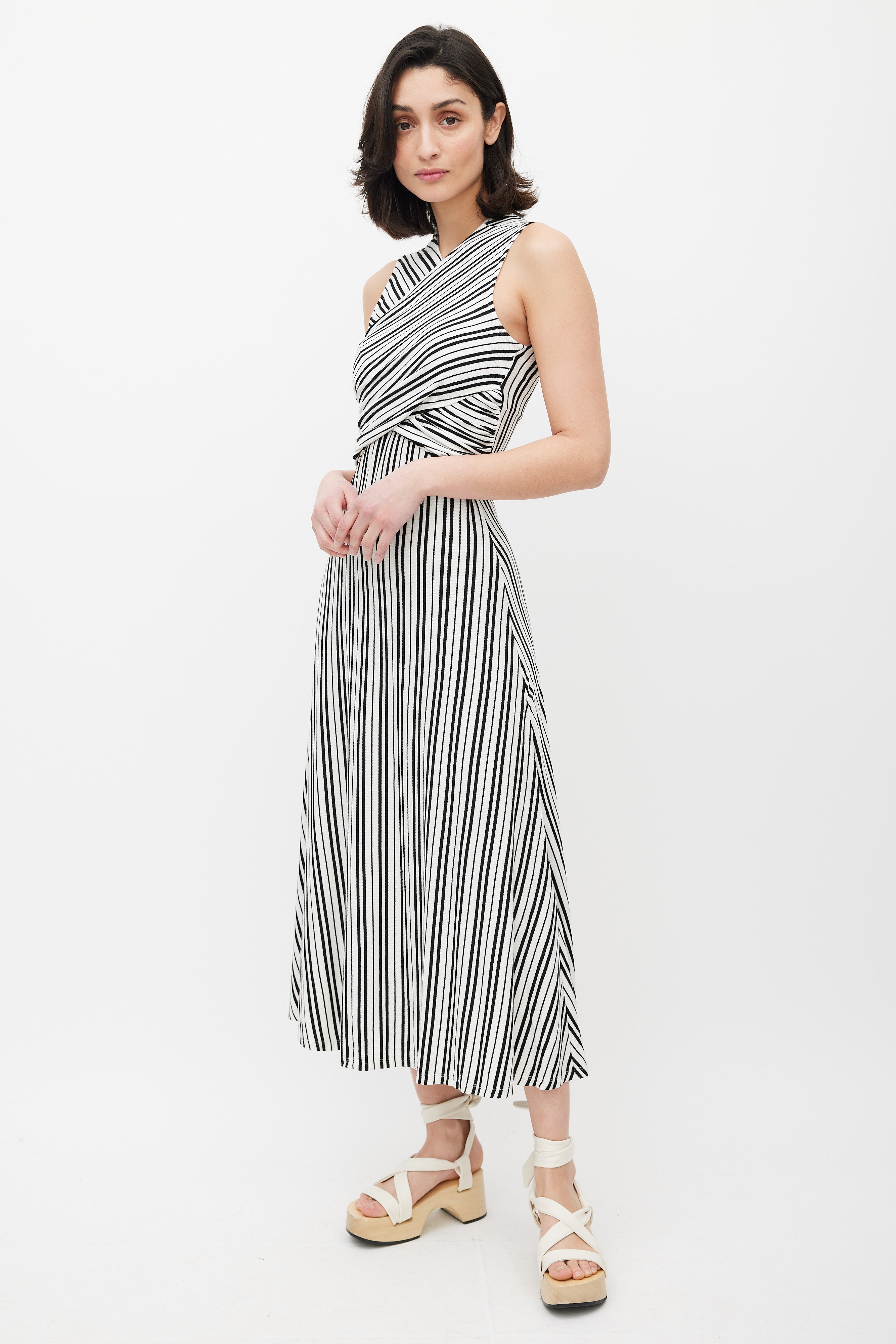 Beaufille white and black Damia dress featuring crew neckline, stripes, A-line skirt, and twist at front.