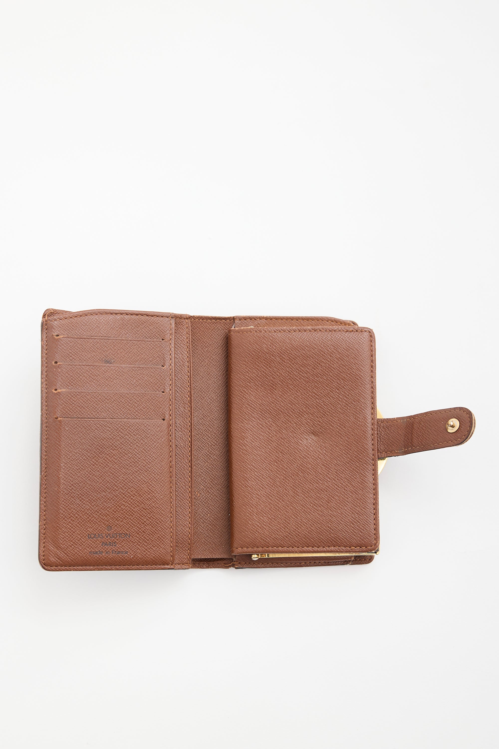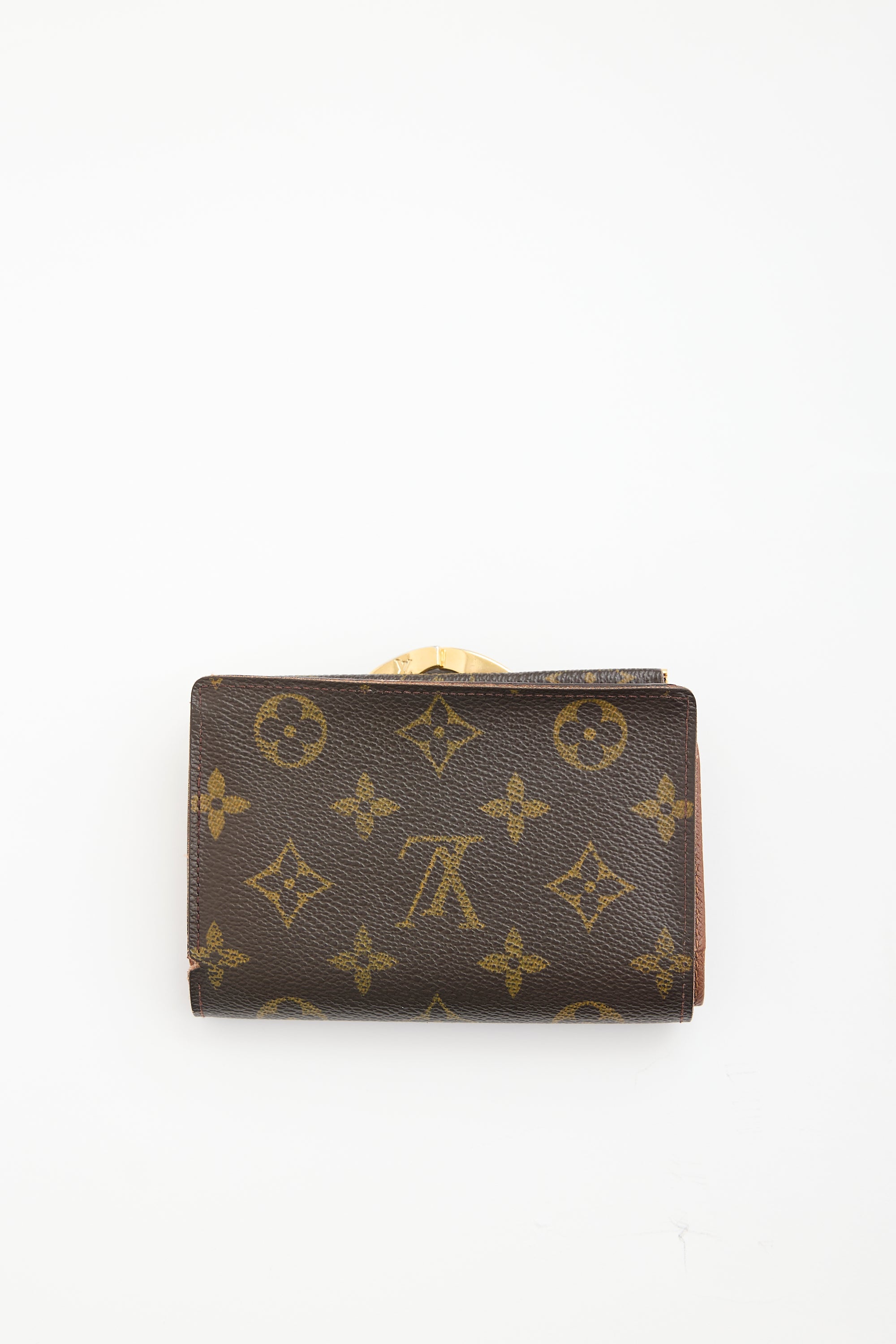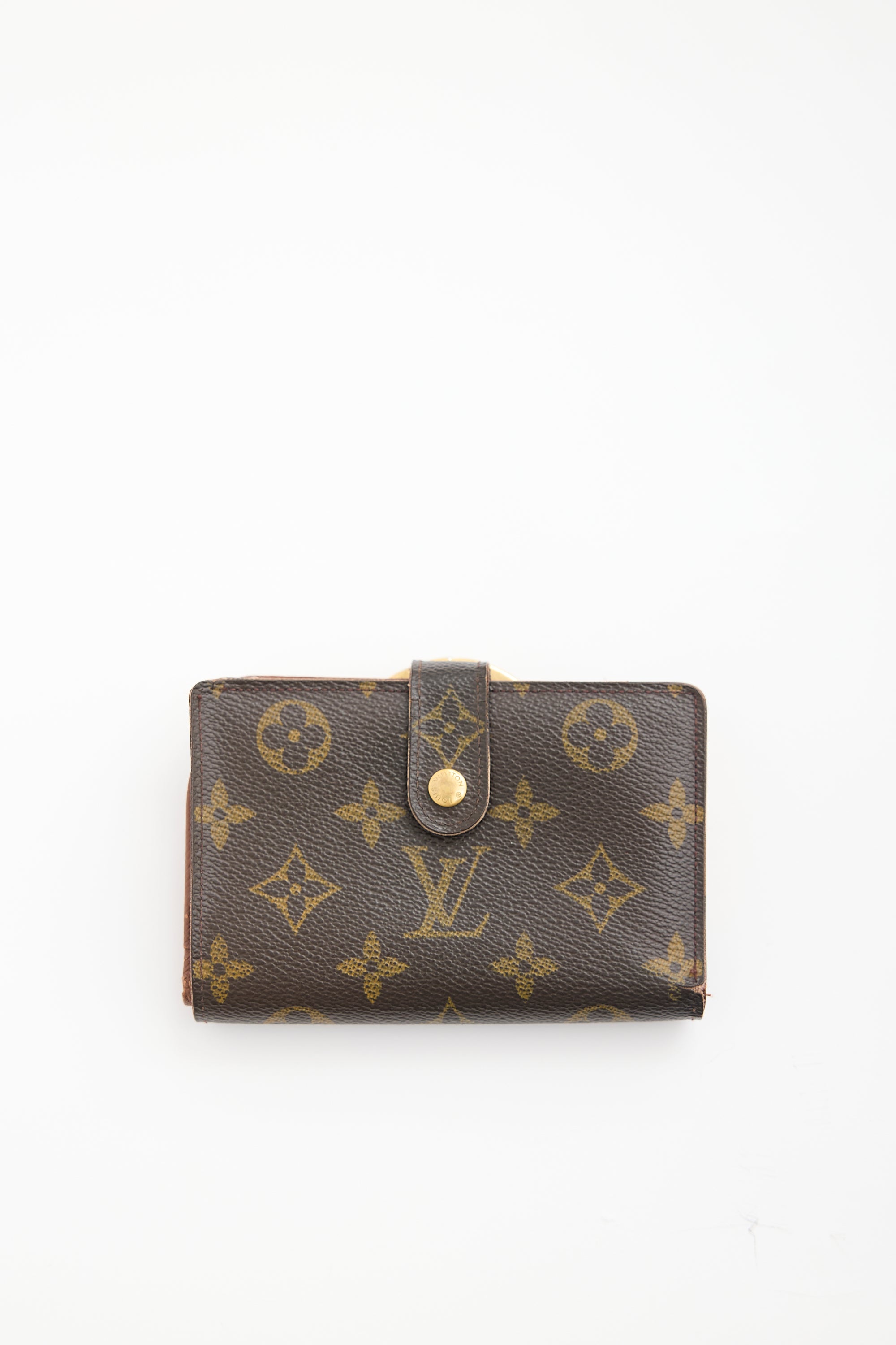 Pre-owned Louis Vuitton 2004 brown Viennois bifold wallet featuring signature monogram coated canvas, snap button closure, and lined interior with one bill slot, two slip pockets, four card slots, and compartment with kiss lock closure.