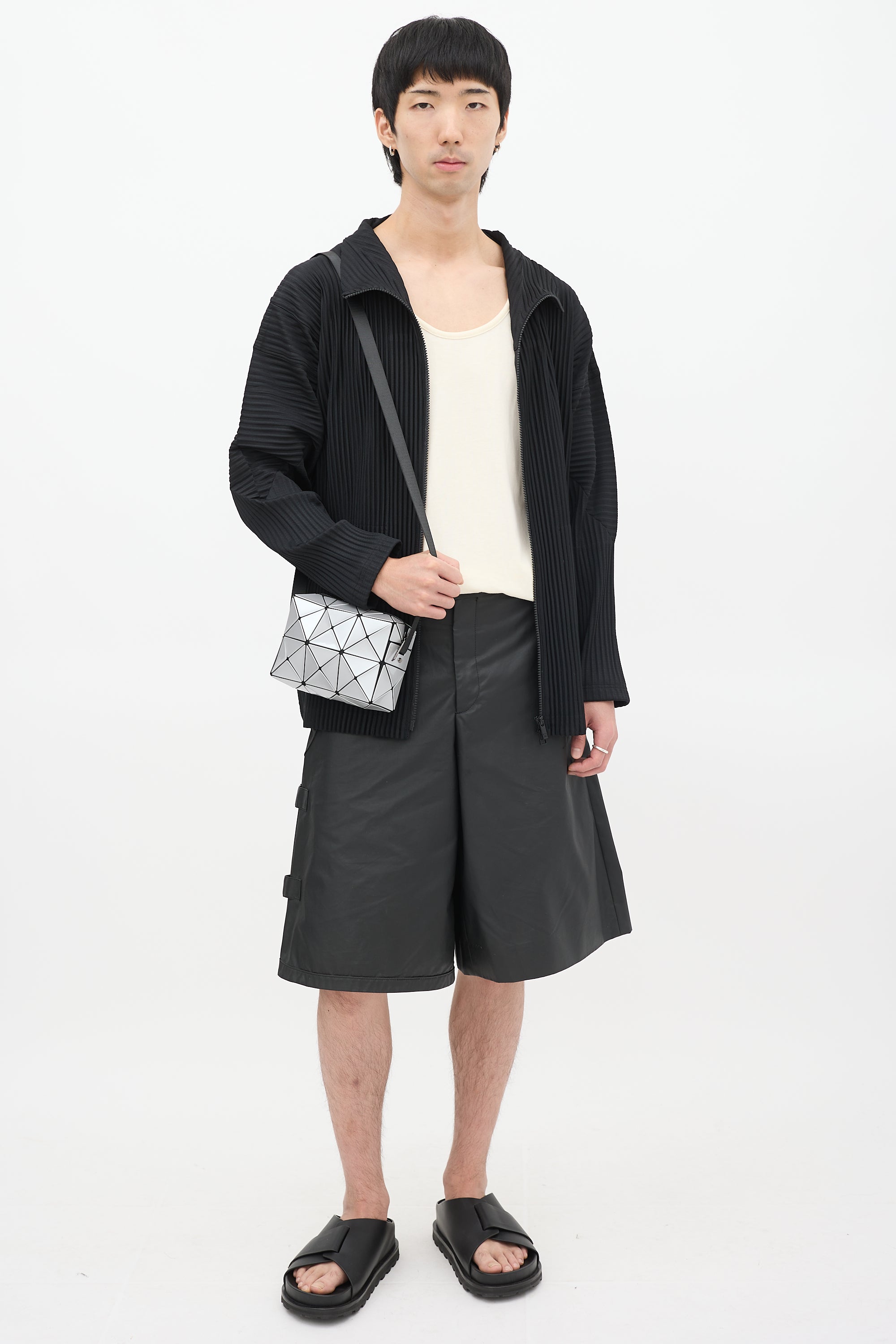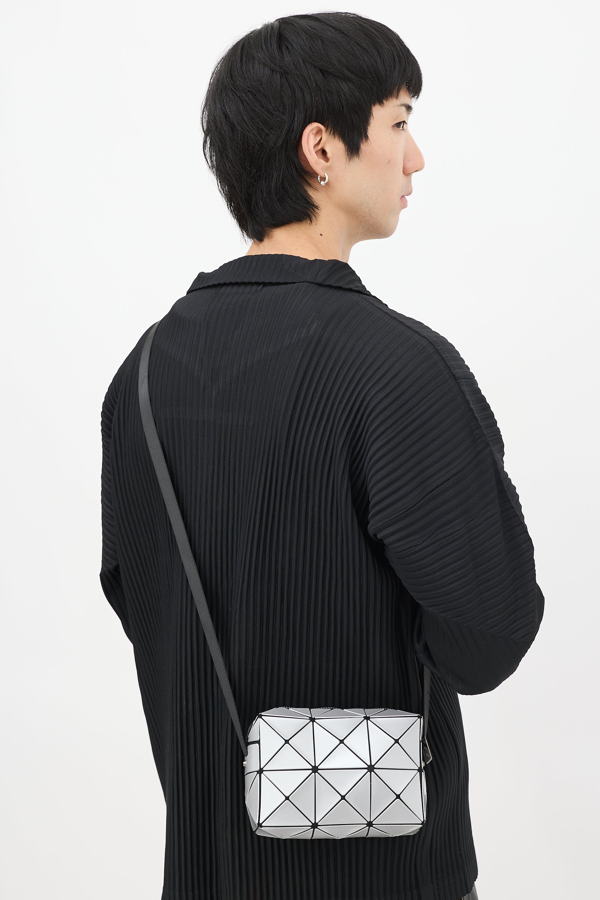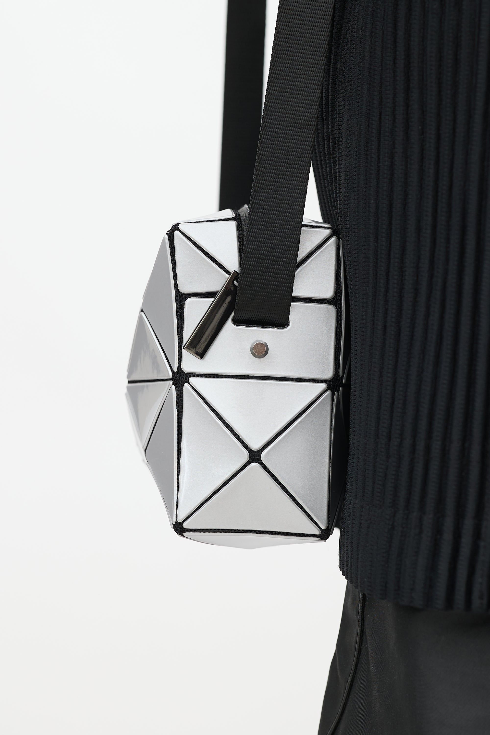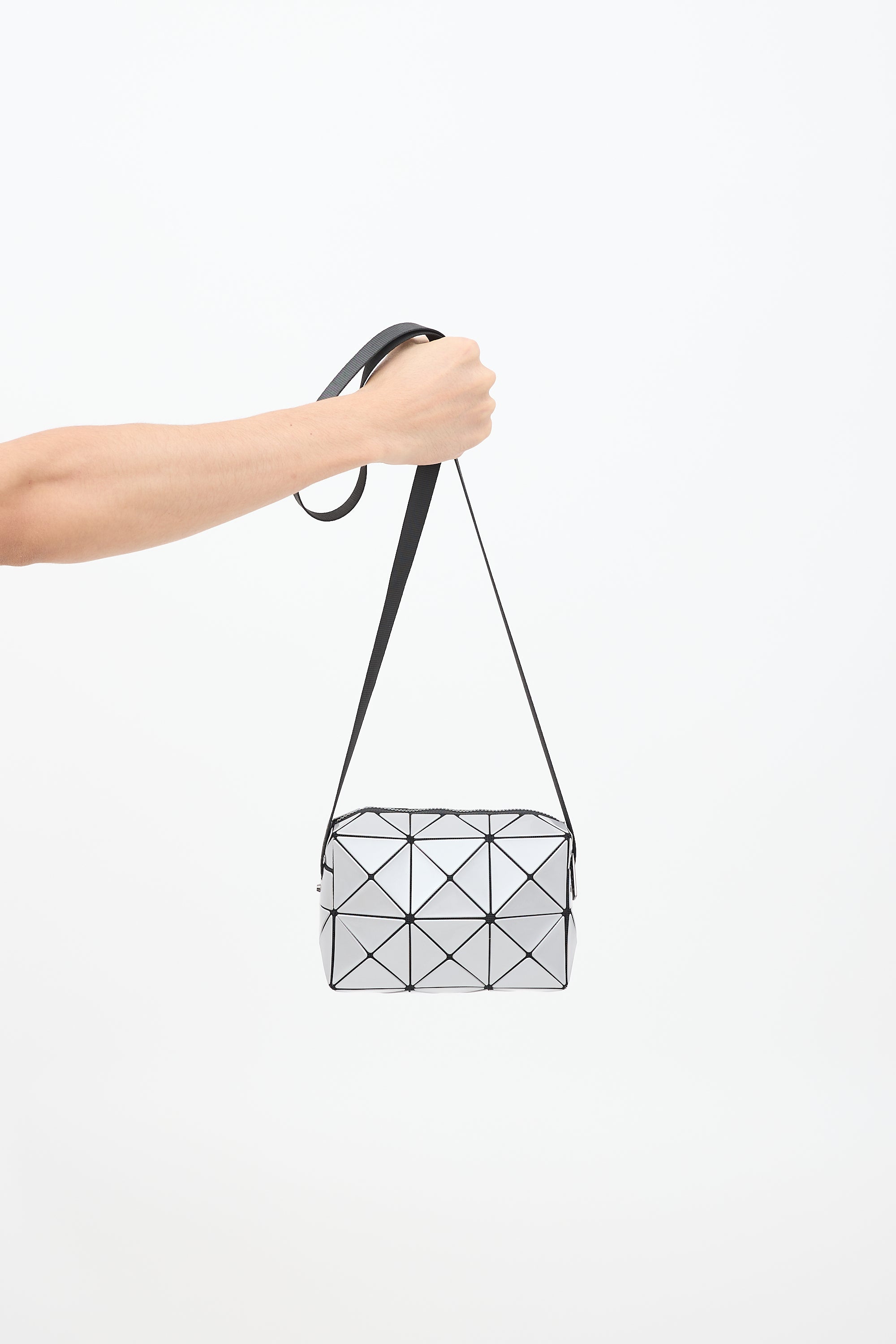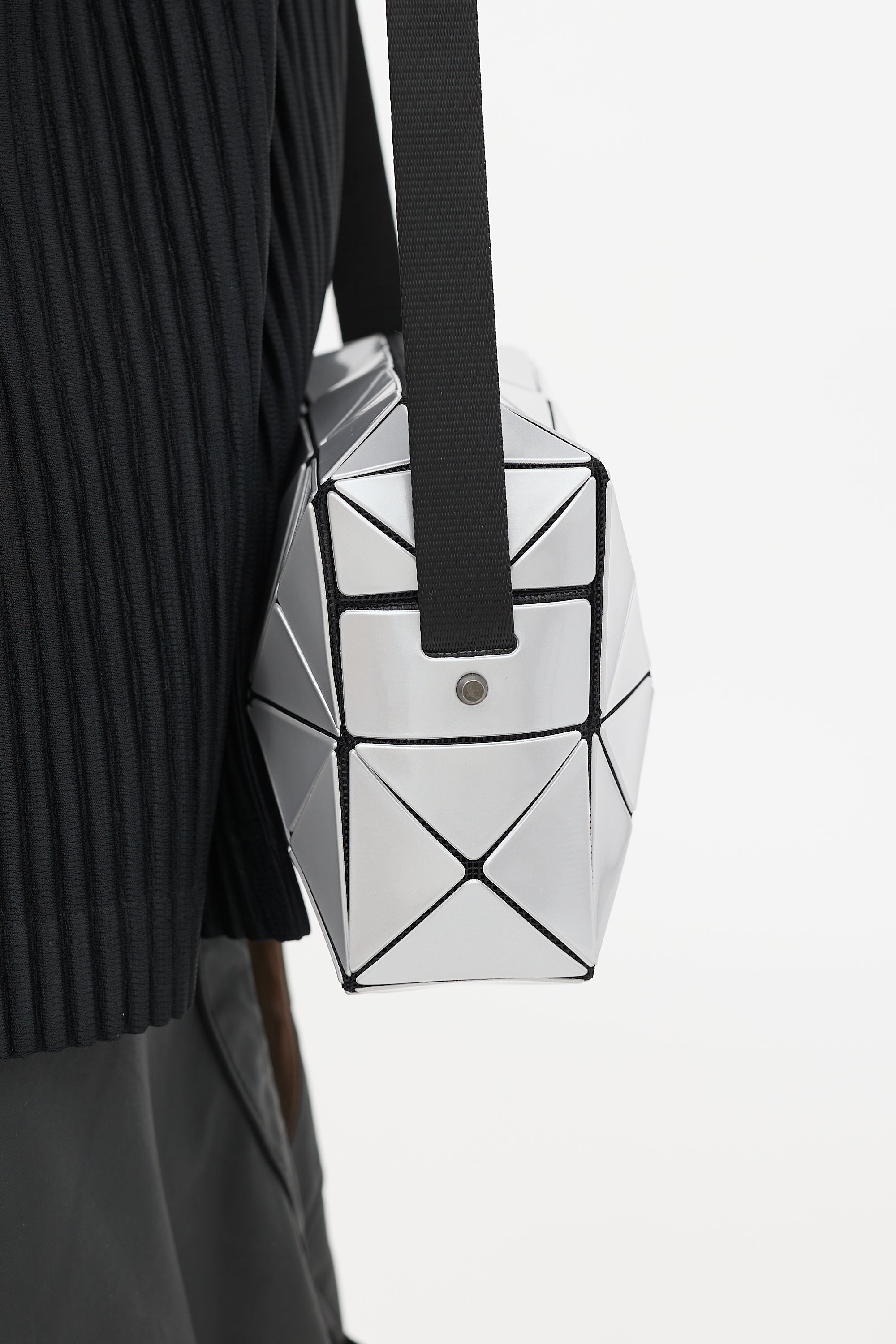 Pre-owned Bao Bao Issey Miyake silver tone Cuboid crossbody bag featuring signature triangular vinyl appliqués throughout body, adjustable webbed shoulder strap, top zip closure, and one lined main compartment with single slip pocket. Comes with original dust bag.