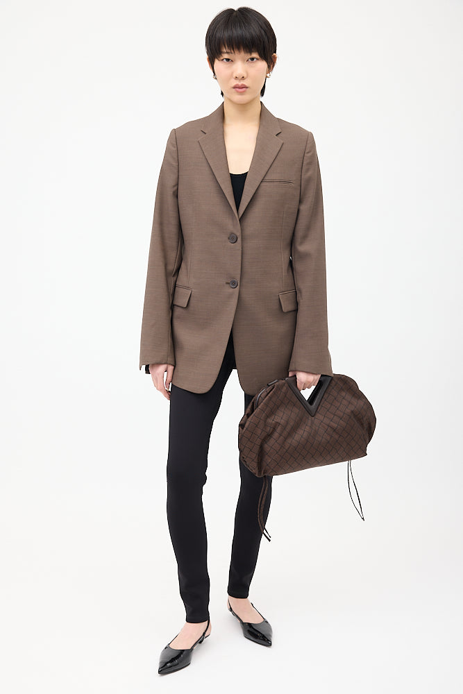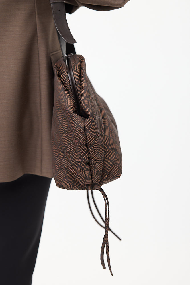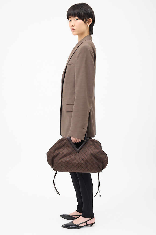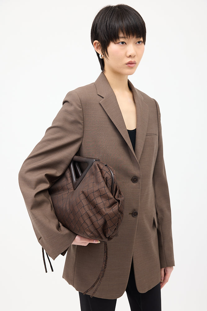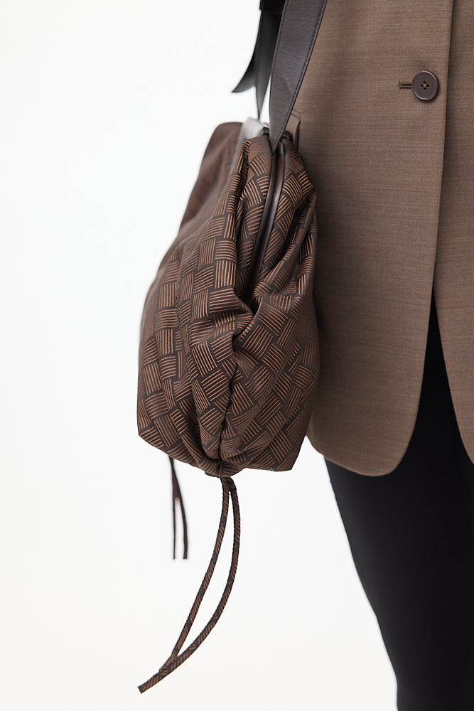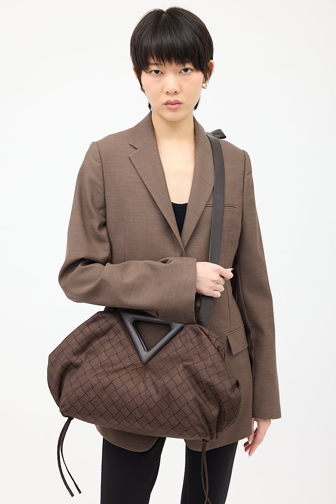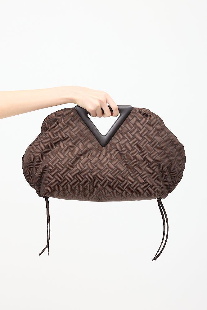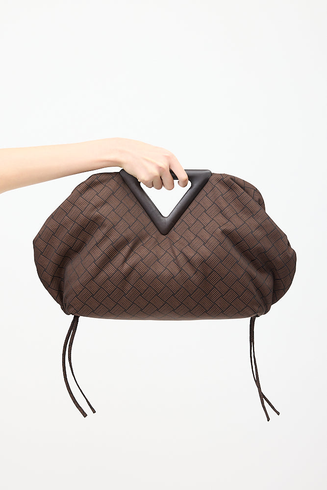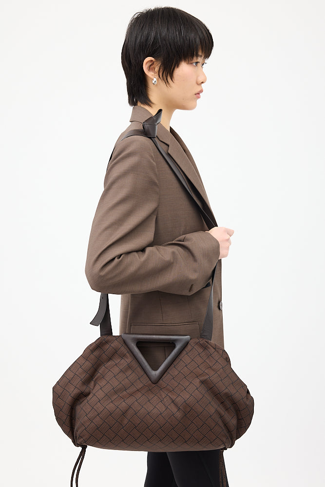 Pre-owned Bottega Veneta brown large The Point Triangle bag featuring Intrecciato inspired jacquard body, drawstring sides, triangle cutout handle, removable and adjustable knotted leather shoulder strap, magnetic frame closure, and one lined main compartment. Comes with original dust bag.