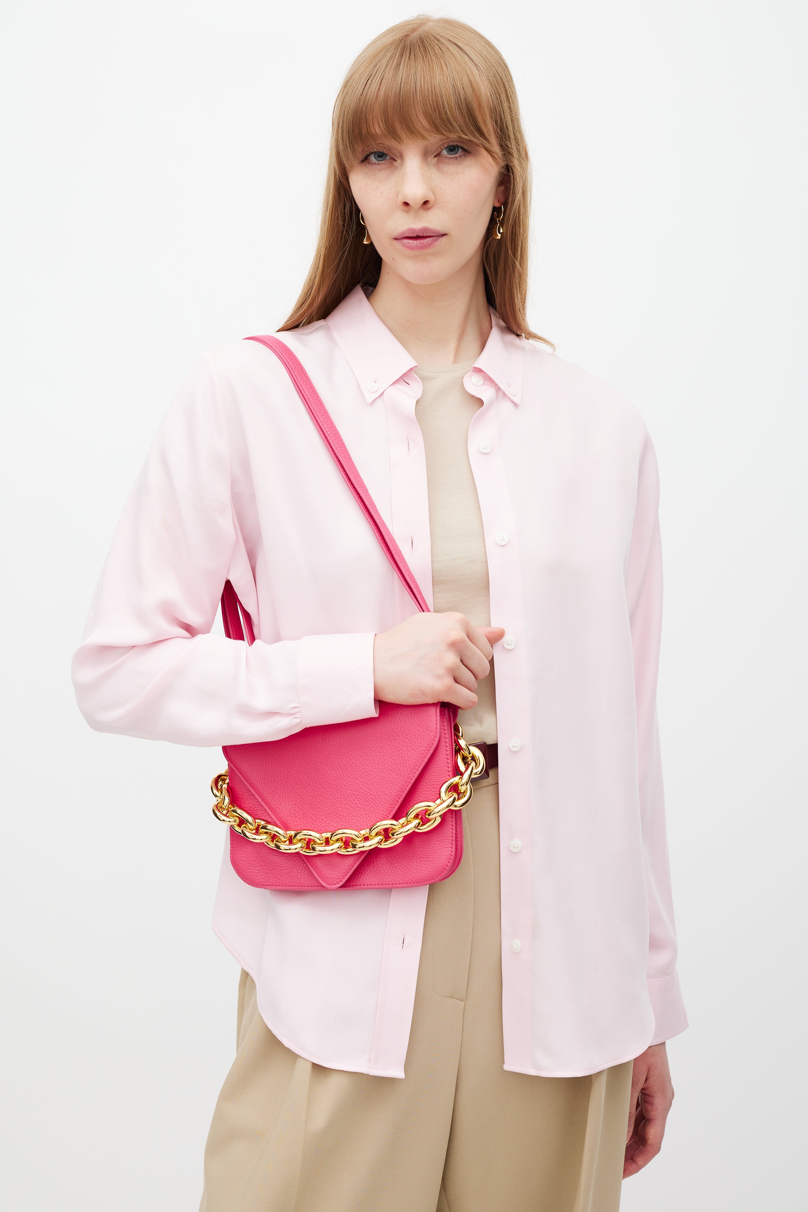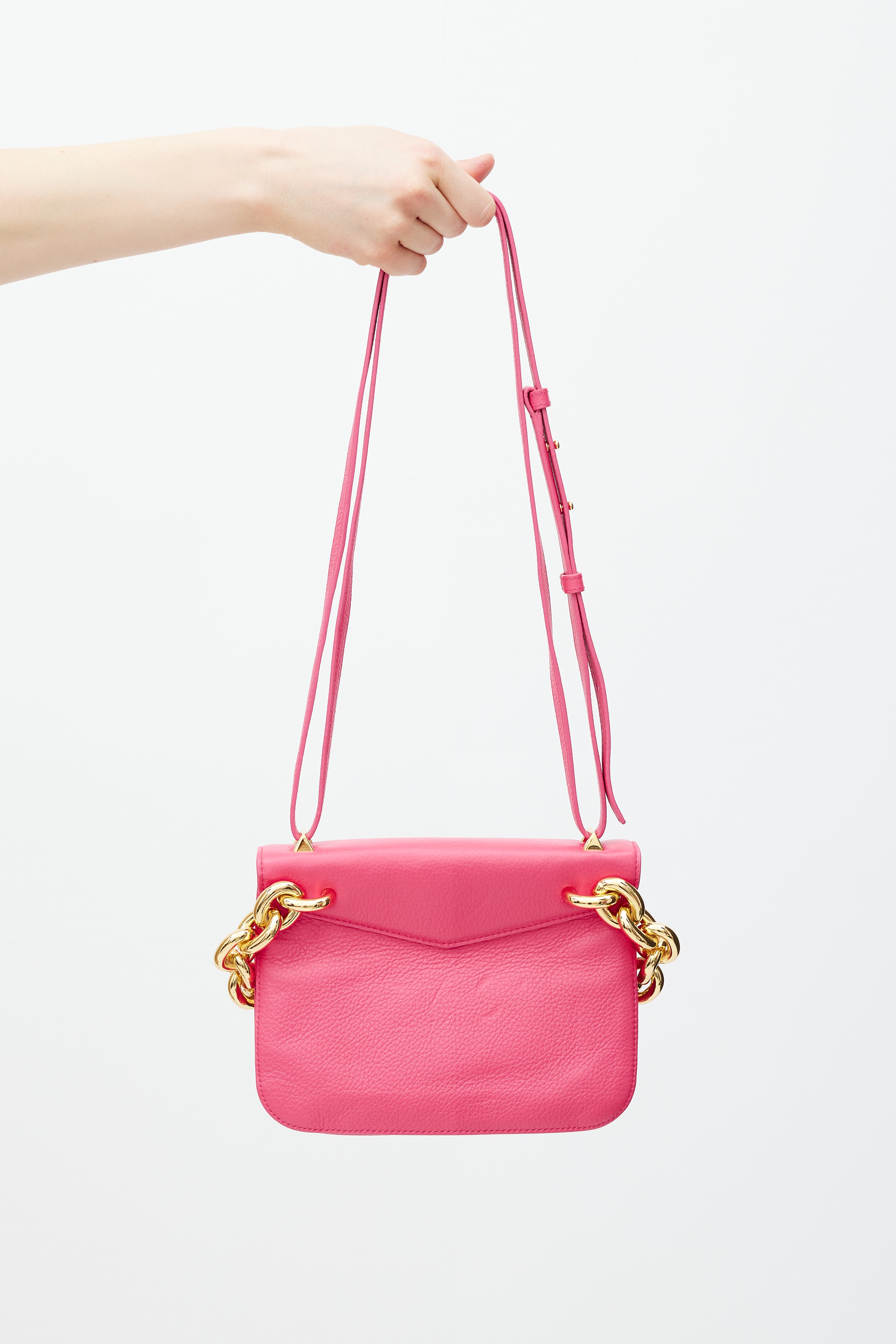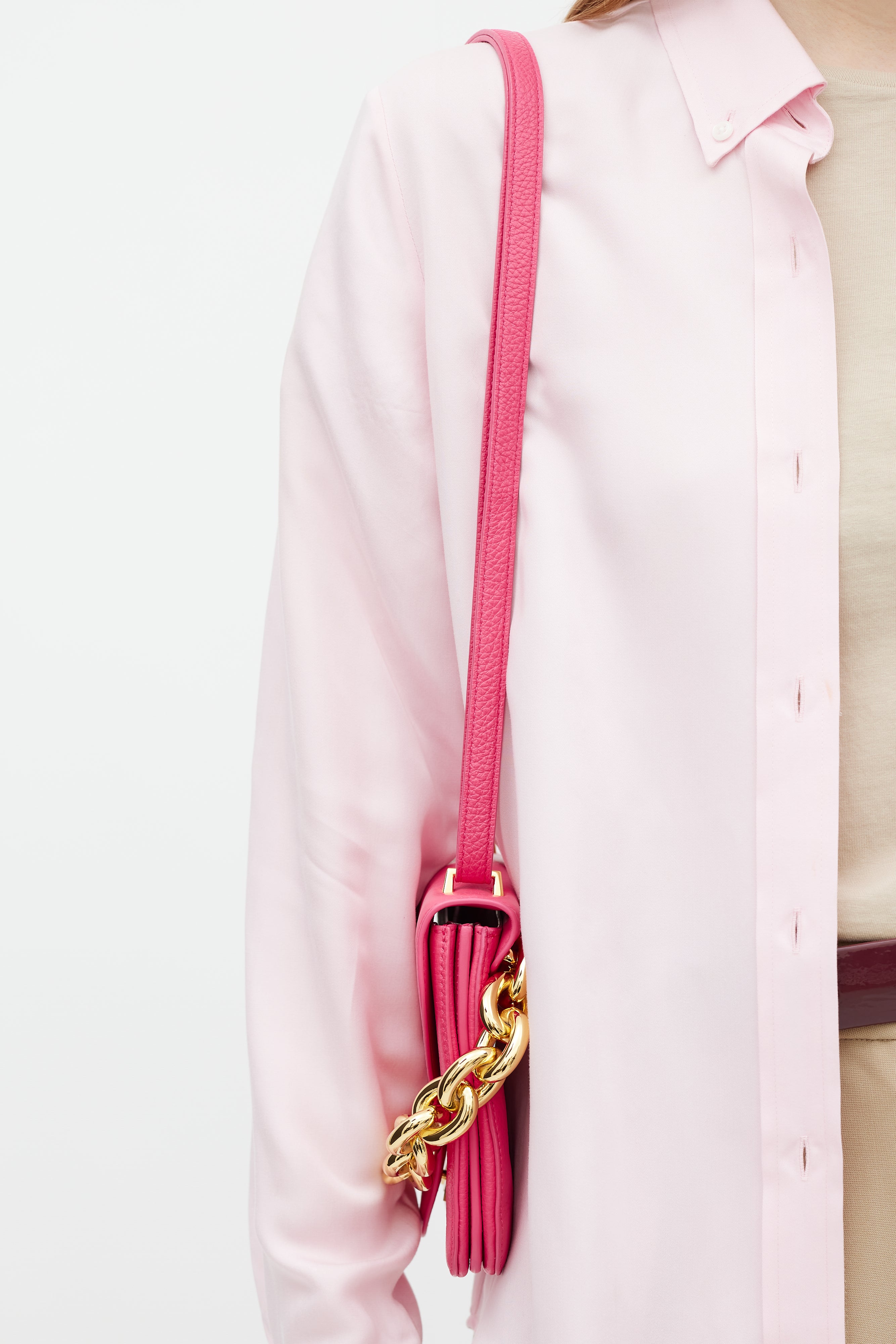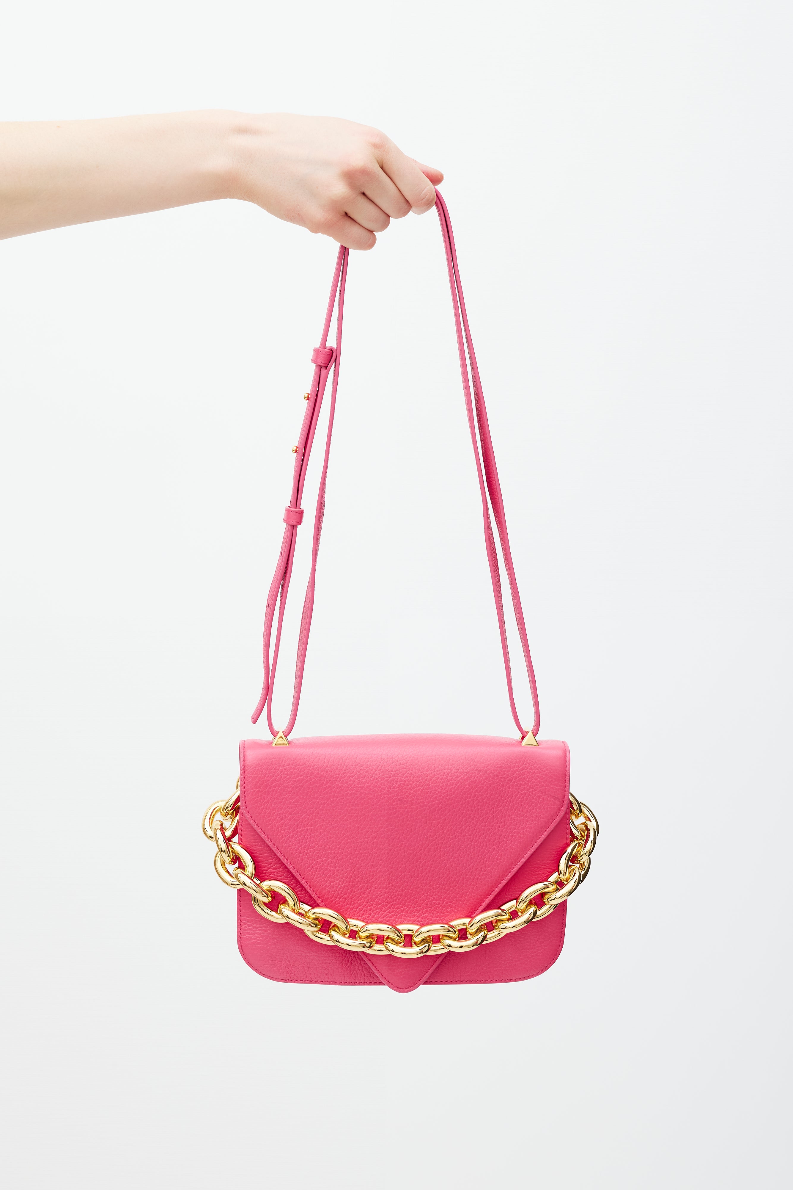 Pre-owned Bottega Veneta pink leather Mount bag featuring gold tone hardware, fixed chunky metal chain at back side, detachable leather shoulder strap, front envelope flap with engraved logo closure, and two main compartments with single slip pocket.