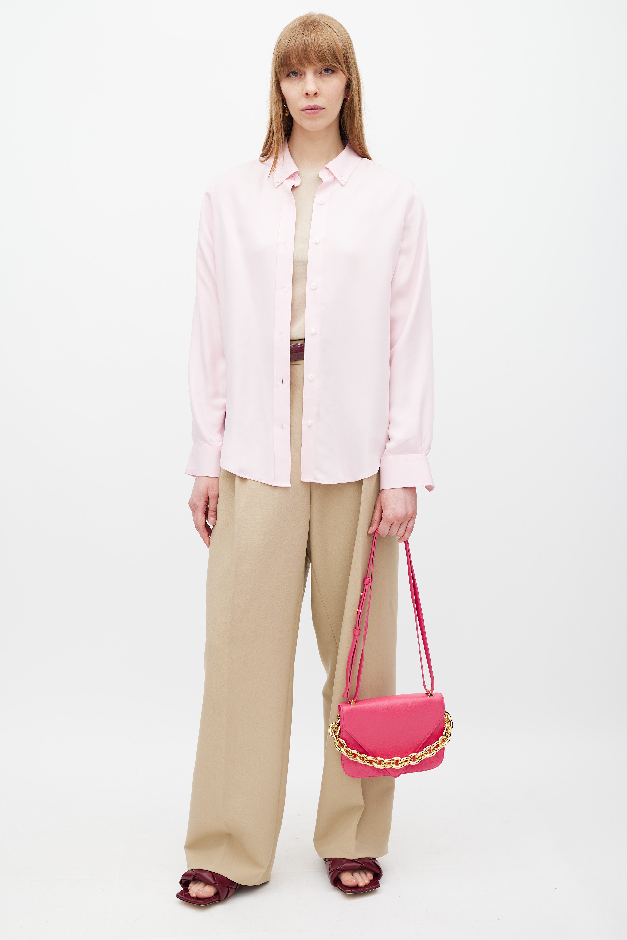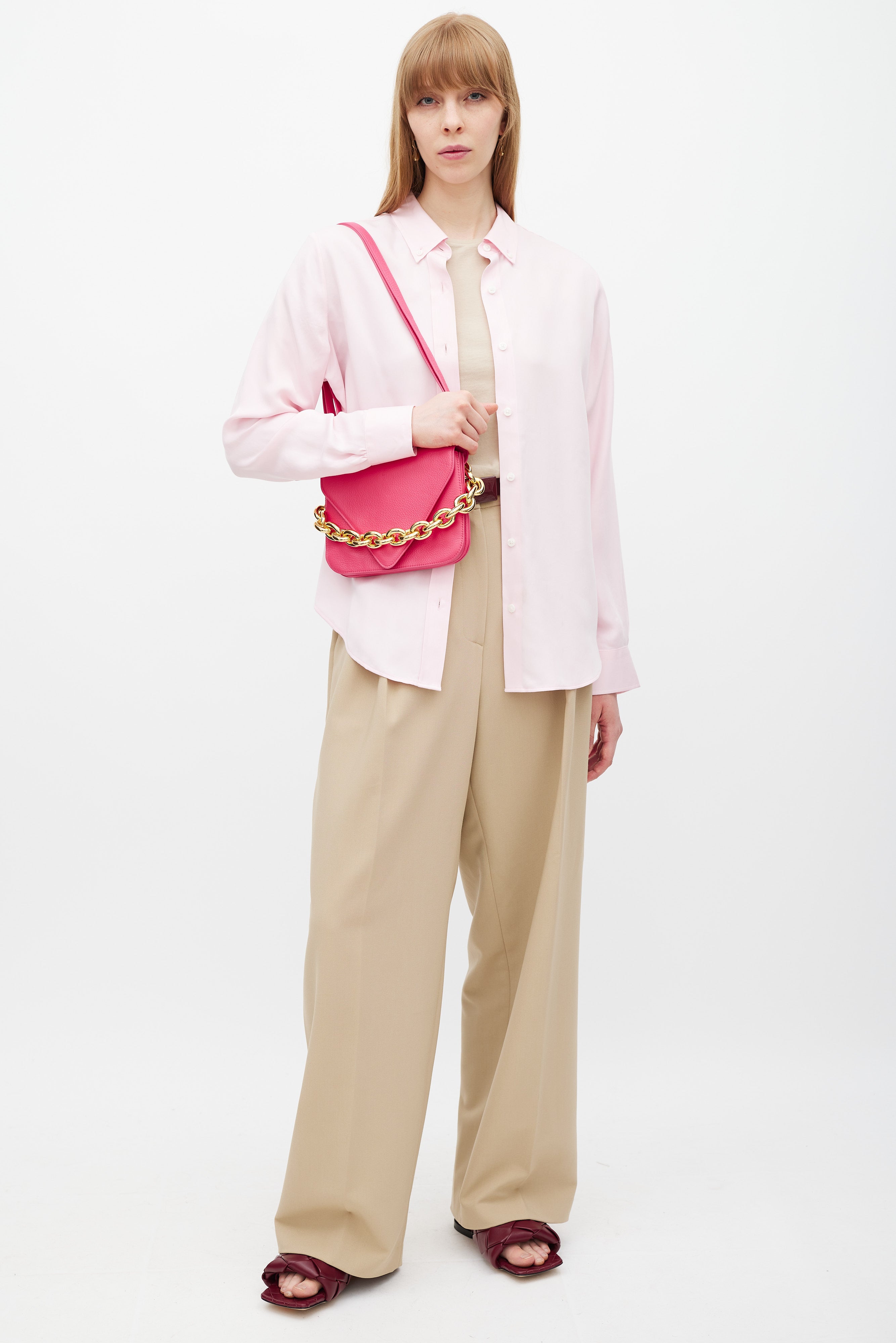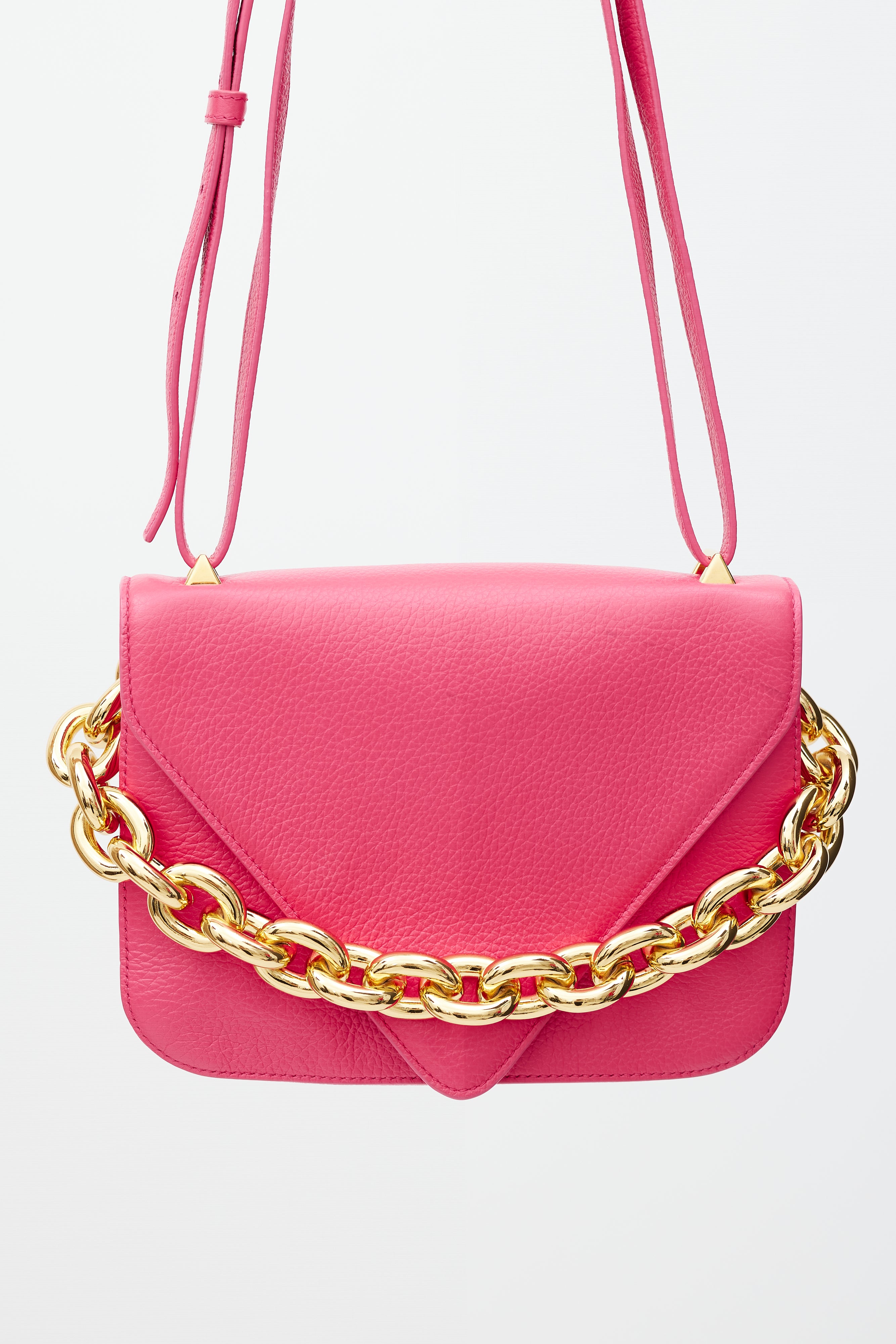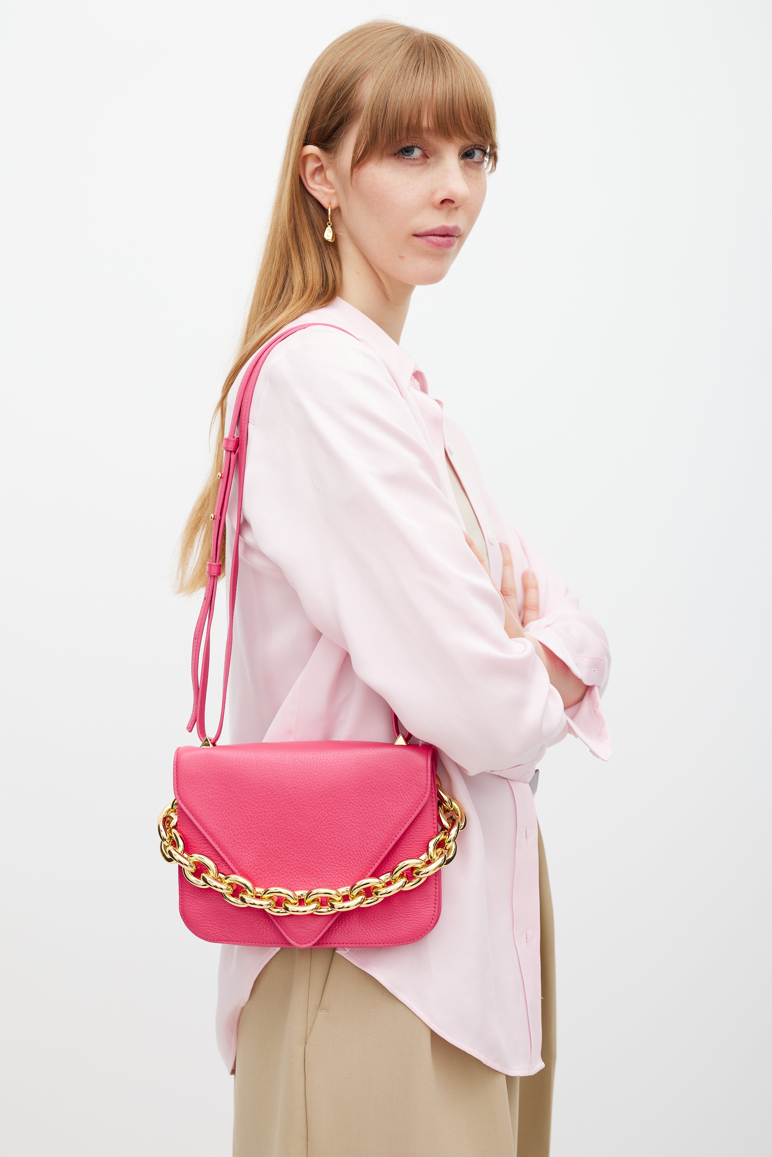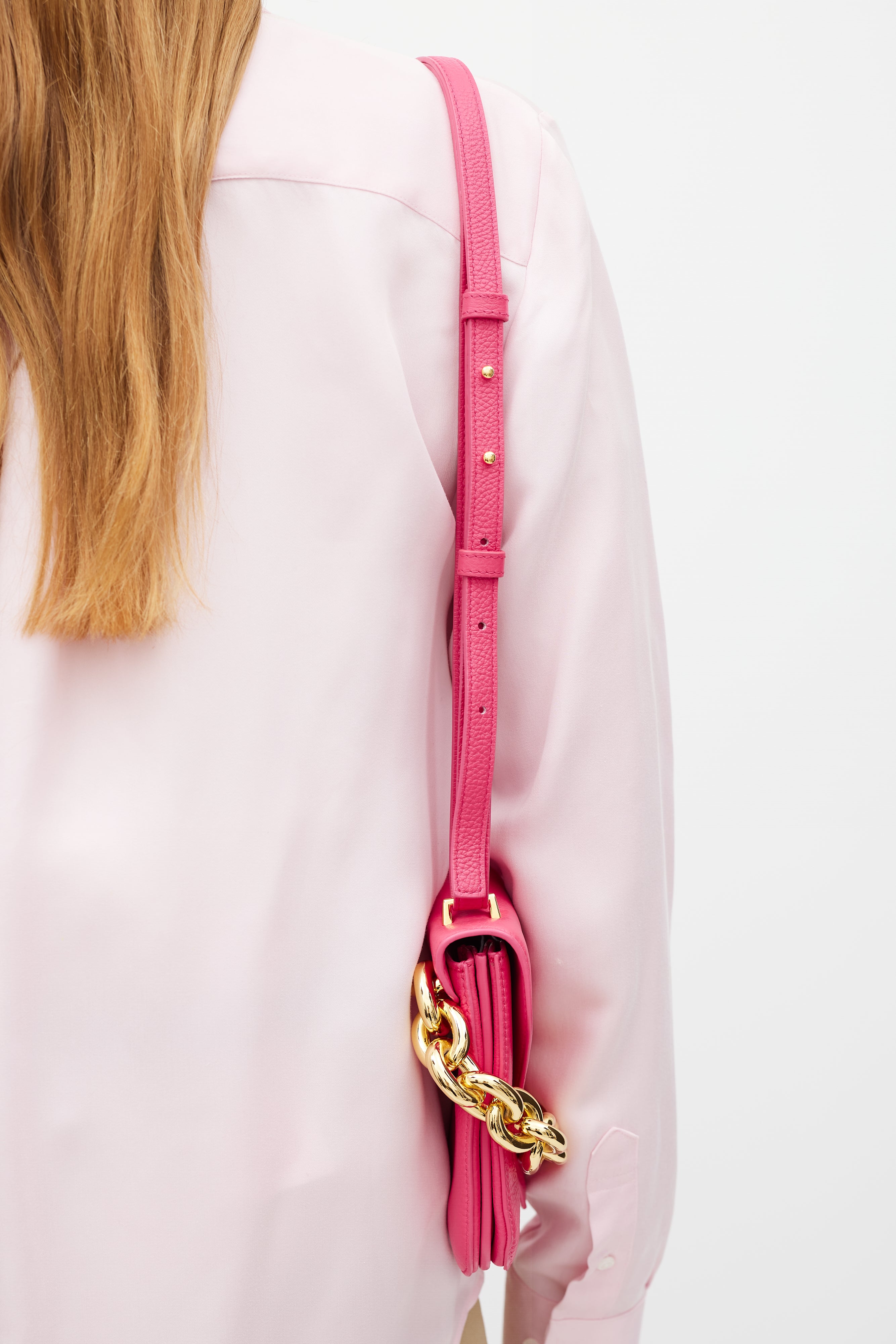 Pre-owned Bottega Veneta pink leather Mount bag featuring gold tone hardware, fixed chunky metal chain at back side, detachable leather shoulder strap, front envelope flap with engraved logo closure, and two main compartments with single slip pocket.