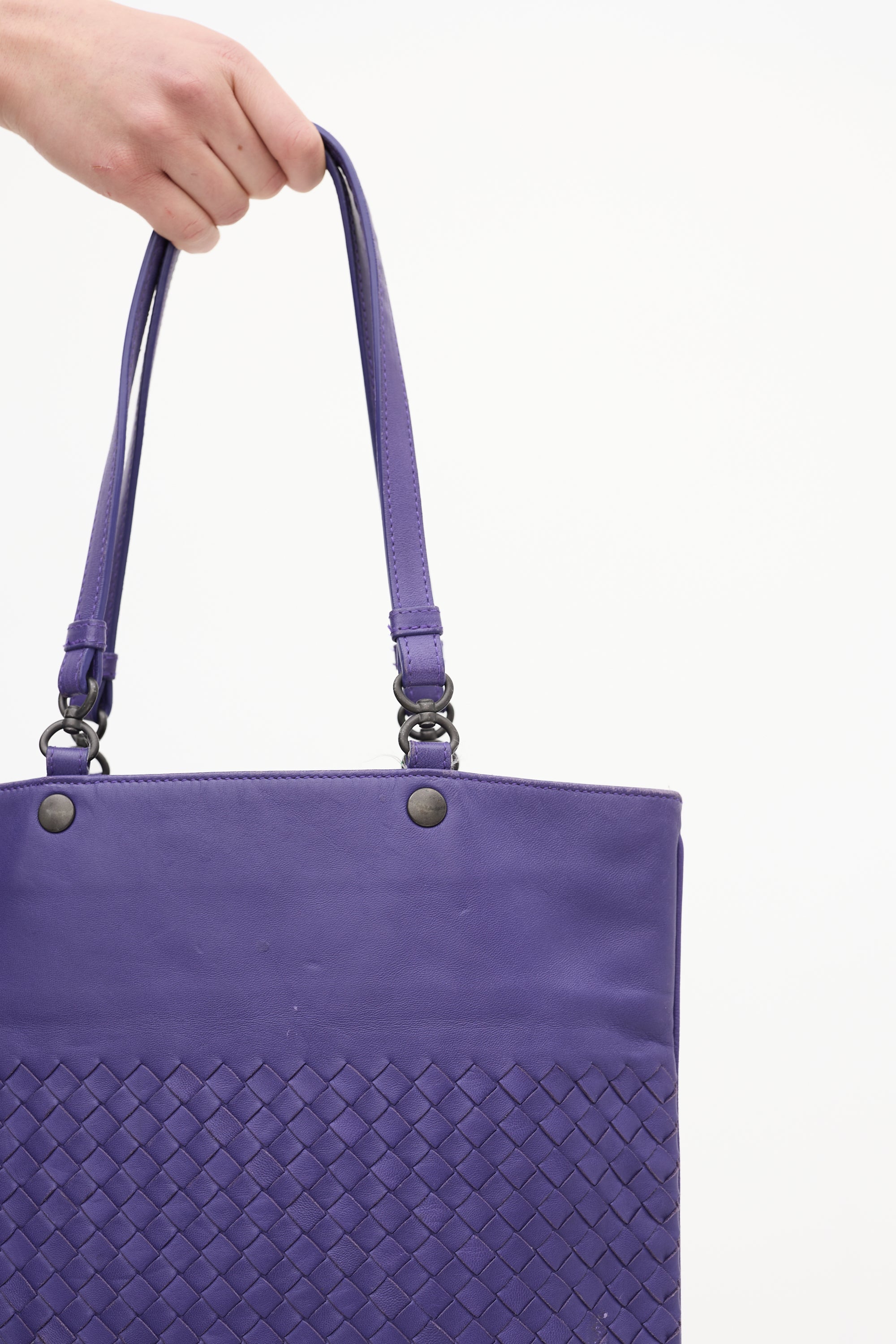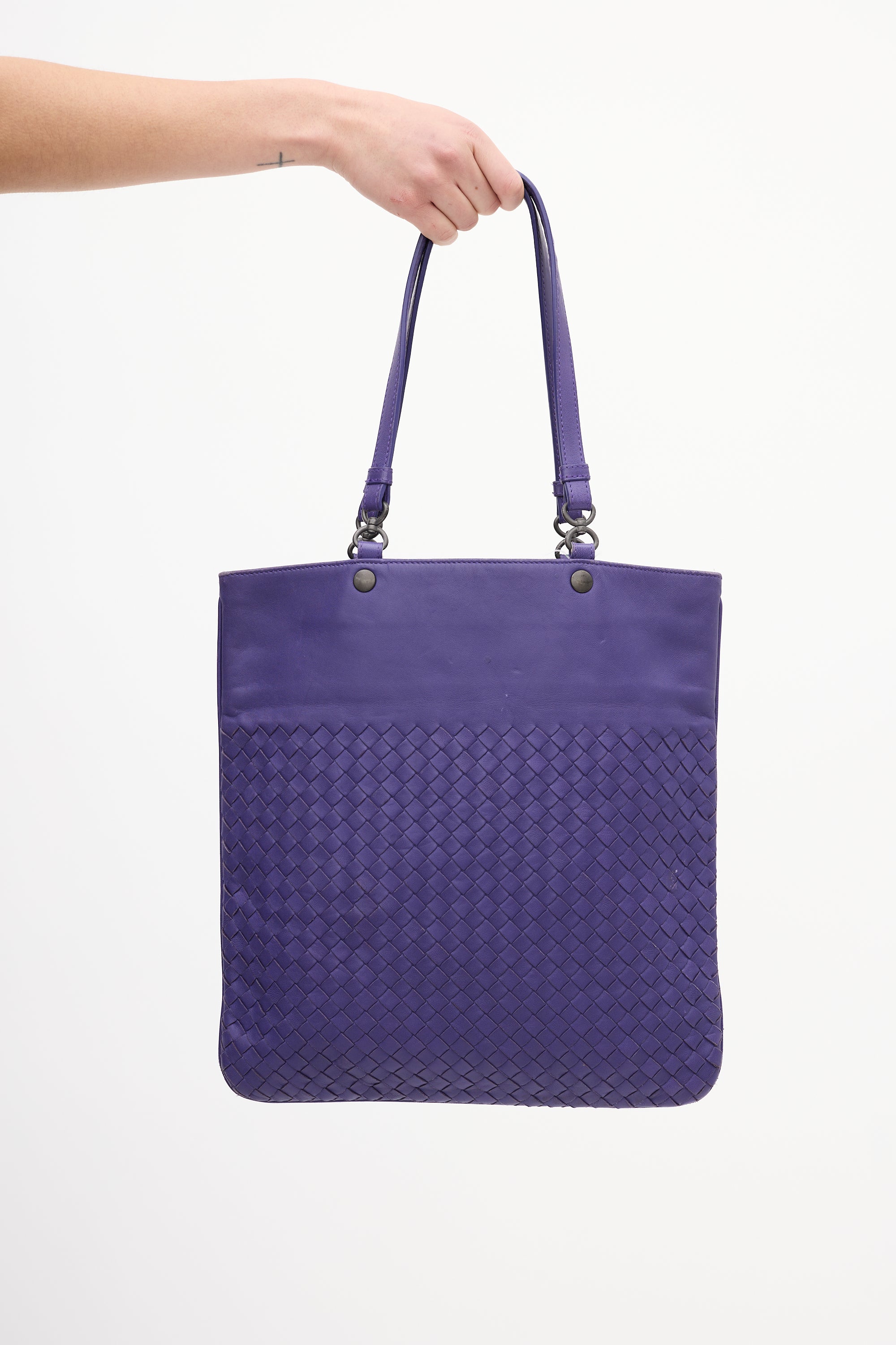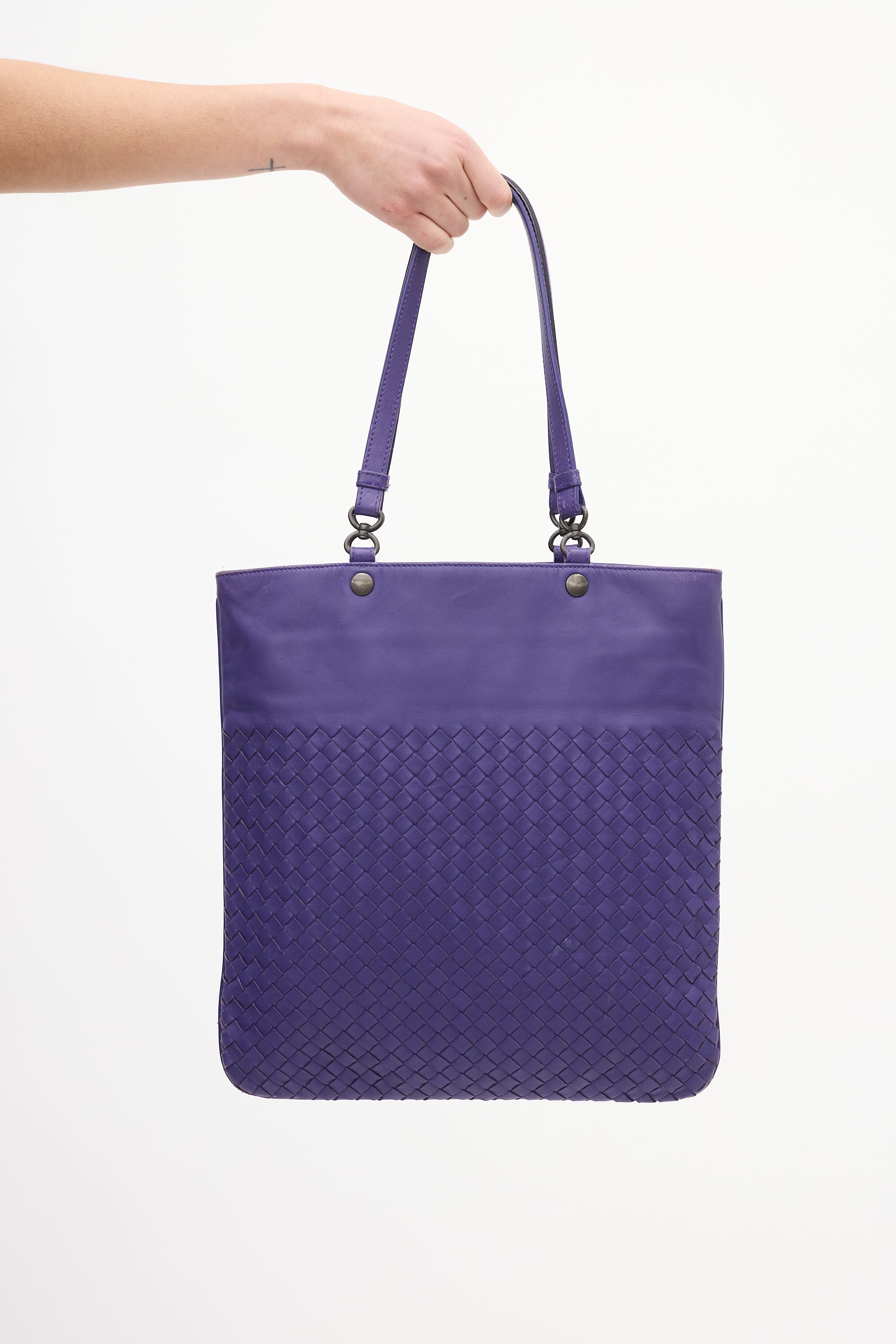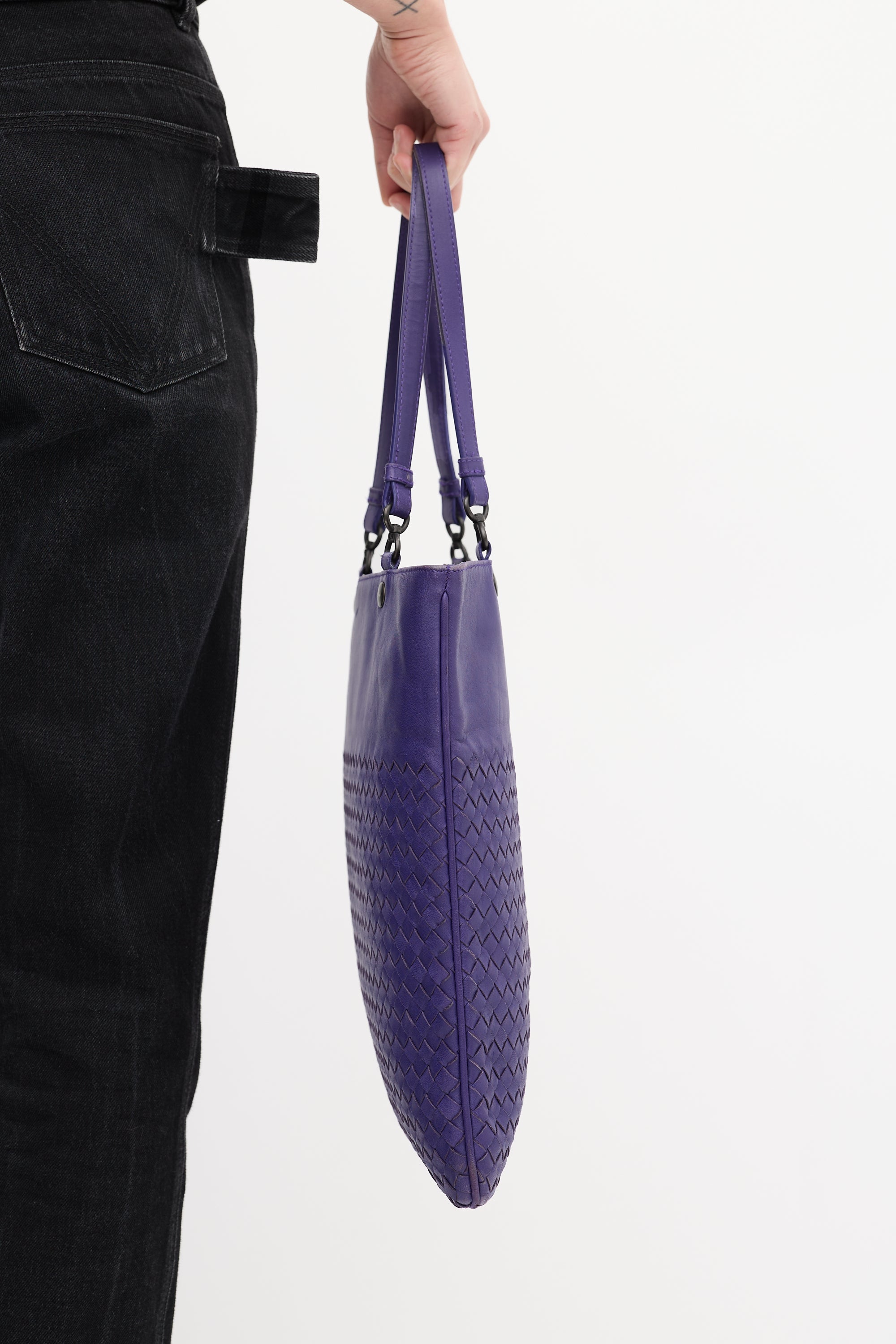 Pre-owned Bottega Veneta purple leather tote bag featuring signature Intrecciato woven body, dual flat carry handles, open top, and one lined main compartment with one zip pocket and one slip pocket. Comes with original care guide.
