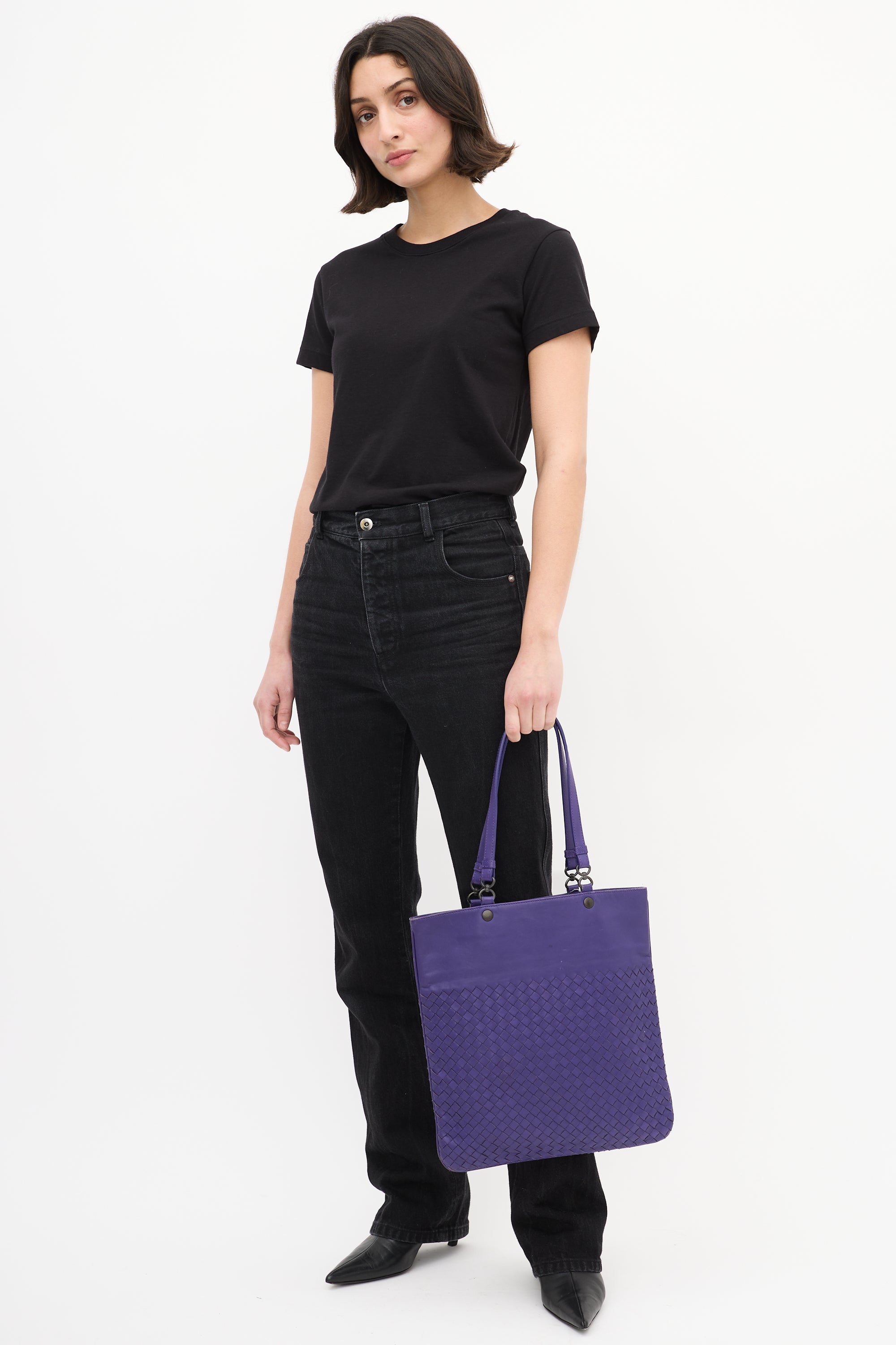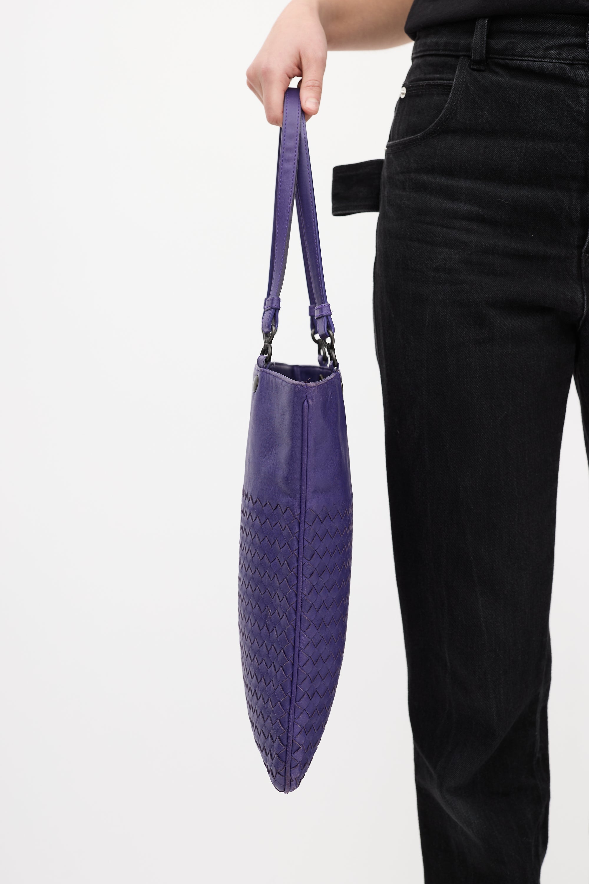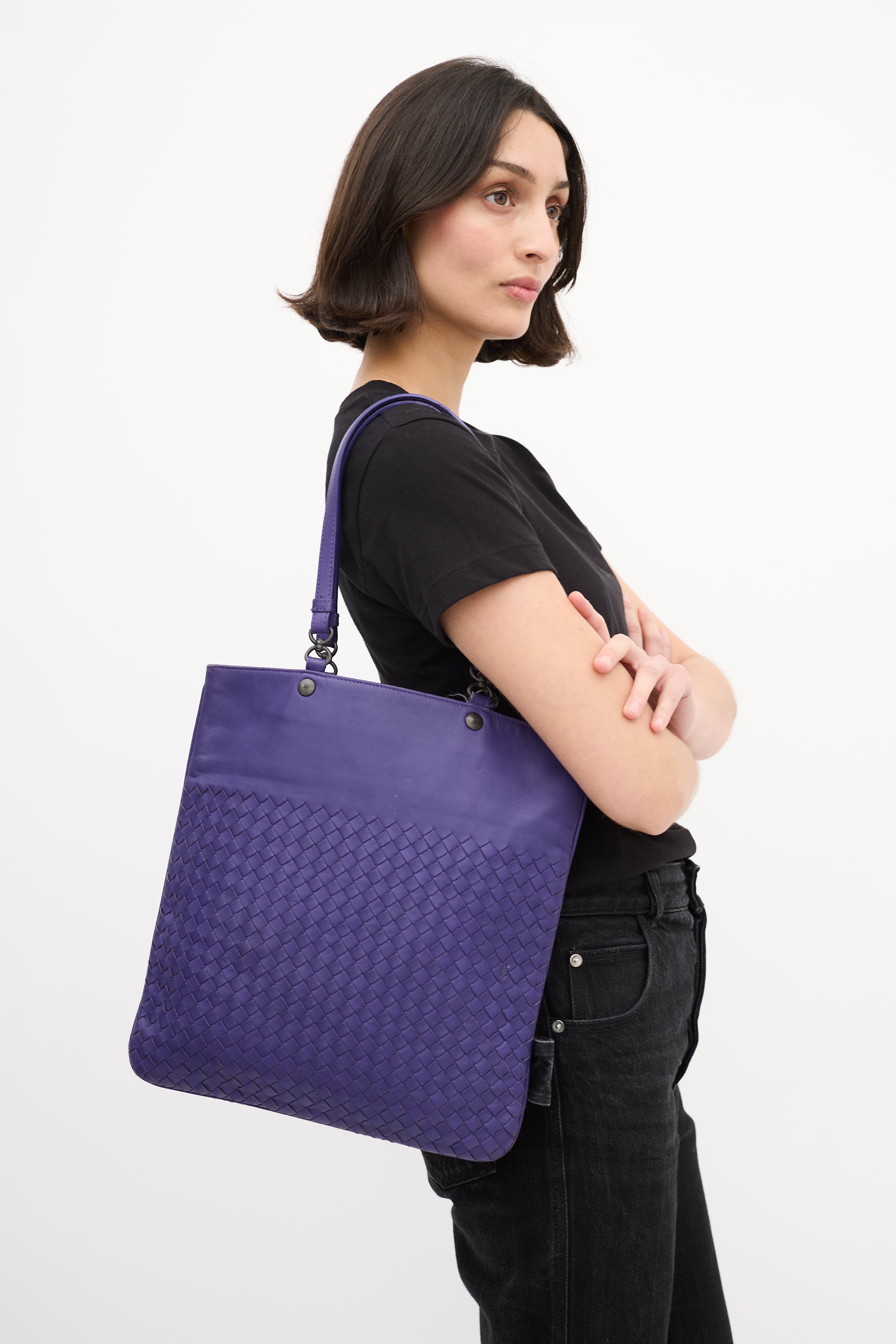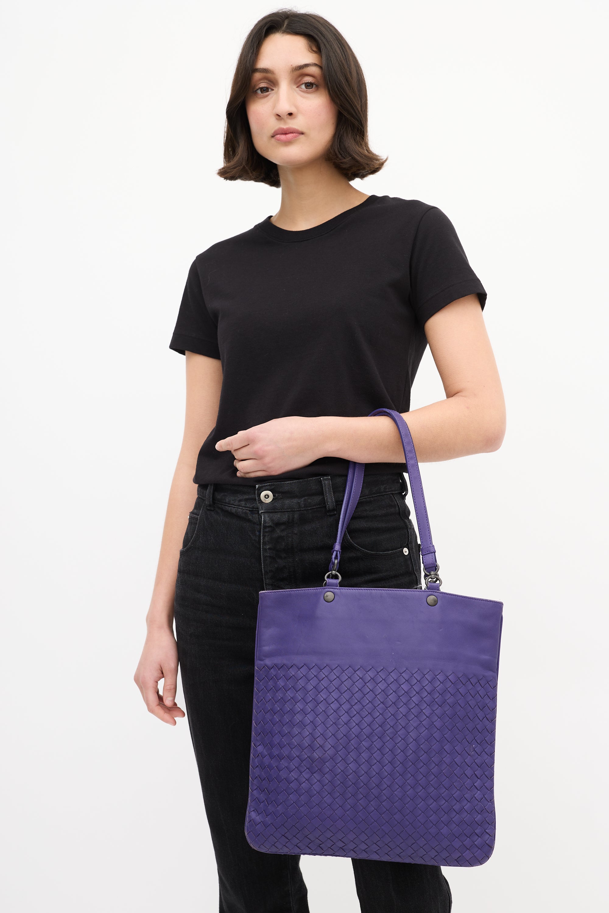 Pre-owned Bottega Veneta purple leather tote bag featuring signature Intrecciato woven body, dual flat carry handles, open top, and one lined main compartment with one zip pocket and one slip pocket. Comes with original care guide.