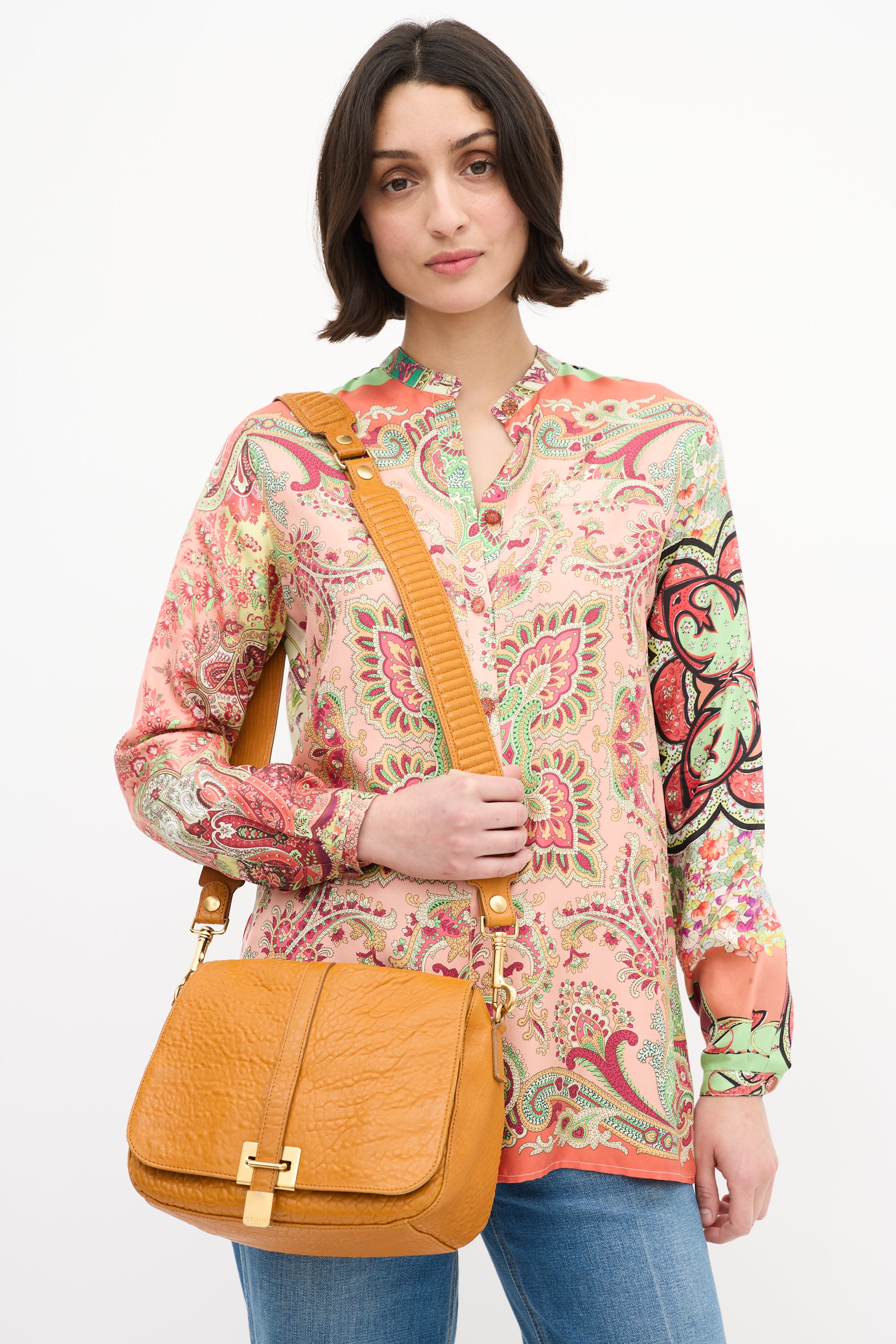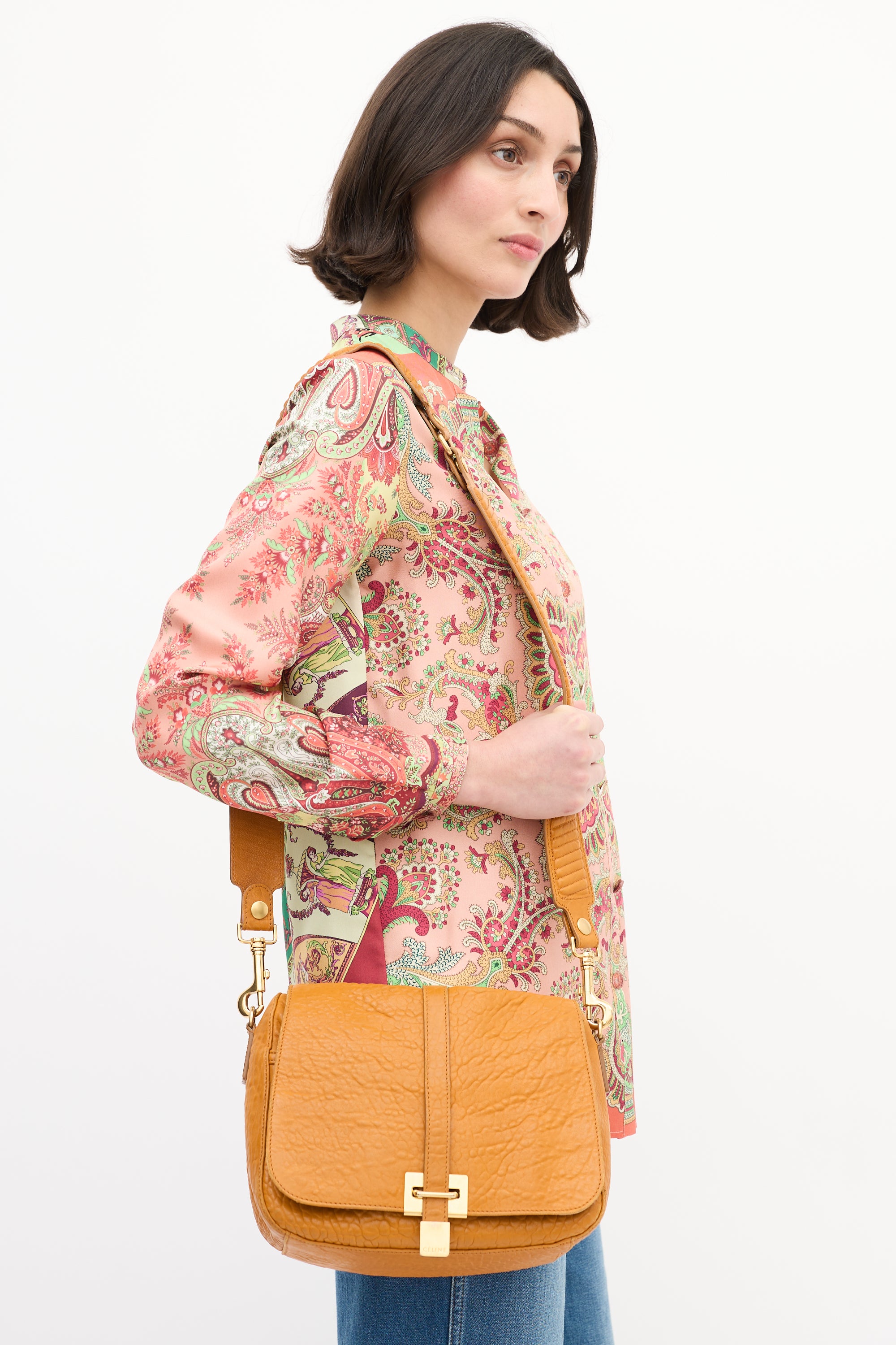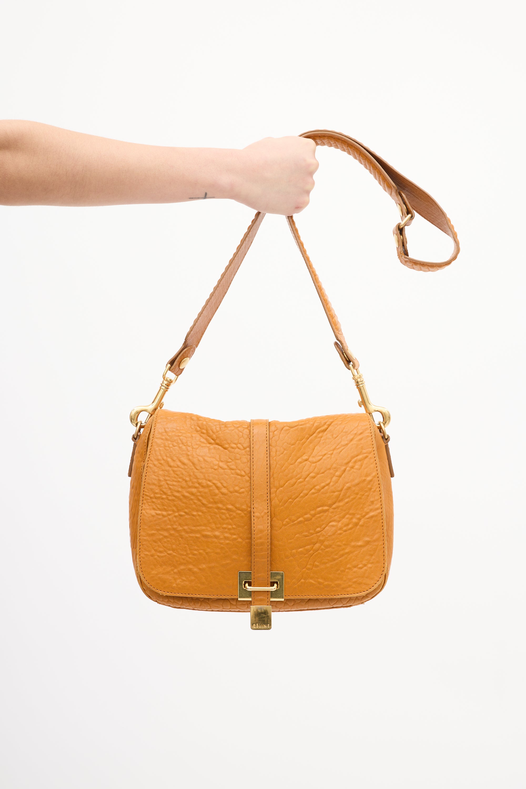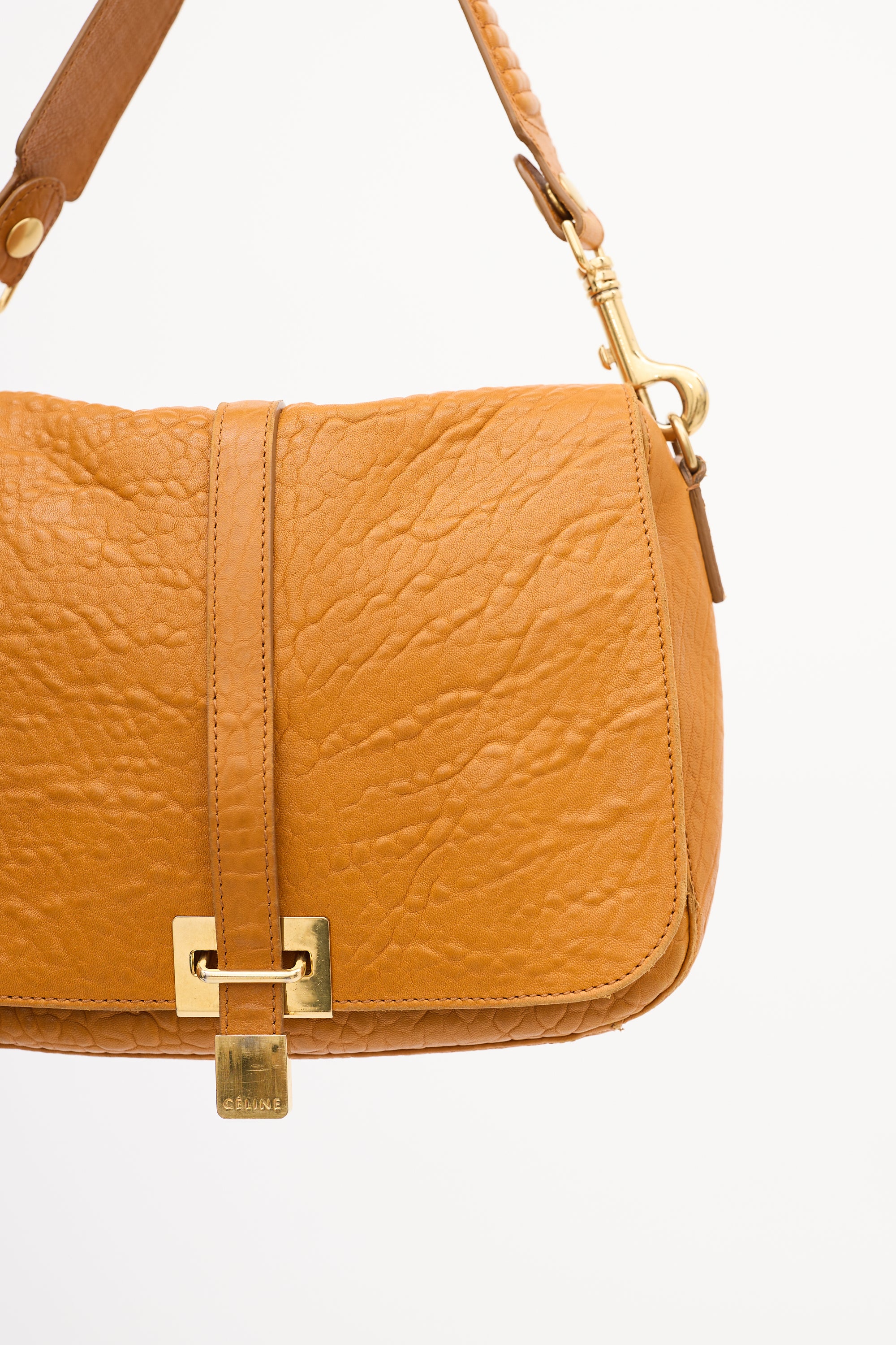 Pre-owned Celine 2011 orange leather shoulder bag featuring tonal stitching, gold tone hardware, detachable and adjustable leather shoulder strap, front flap, front strap closure with etched logo hardware, one slip pocket under flap, and one lined main compartment with one zip pocket and two slip pockets. Comes with original dust bag.