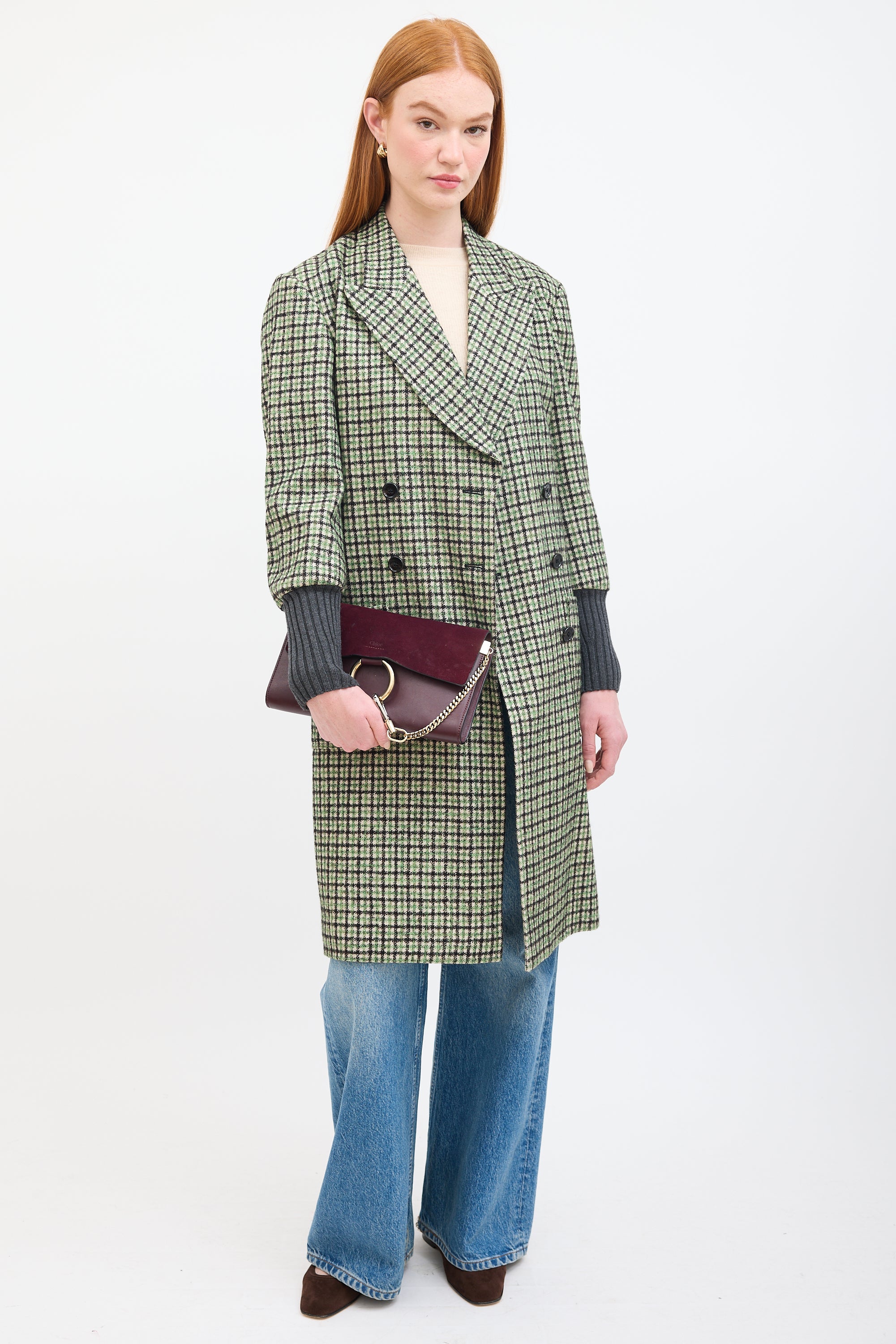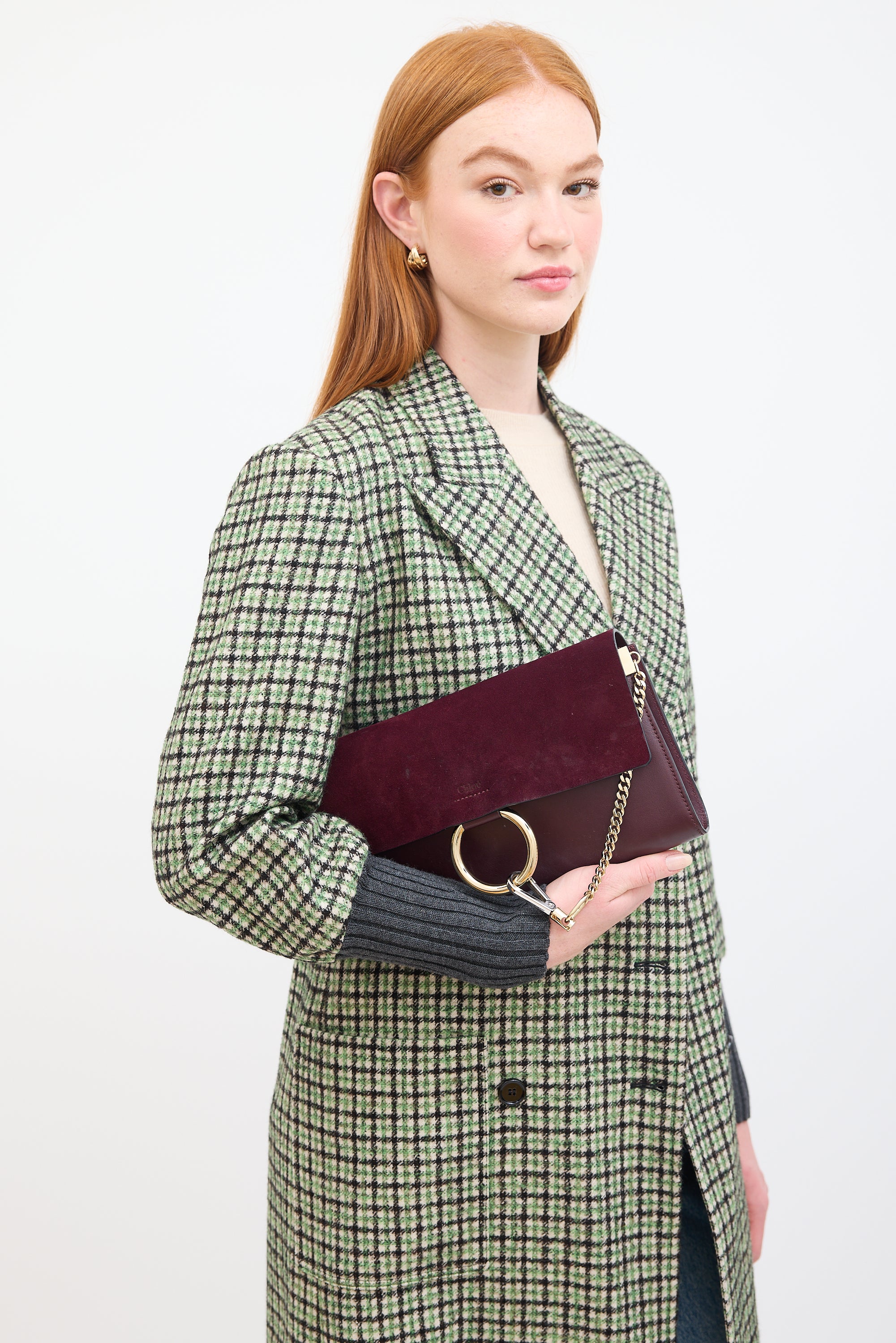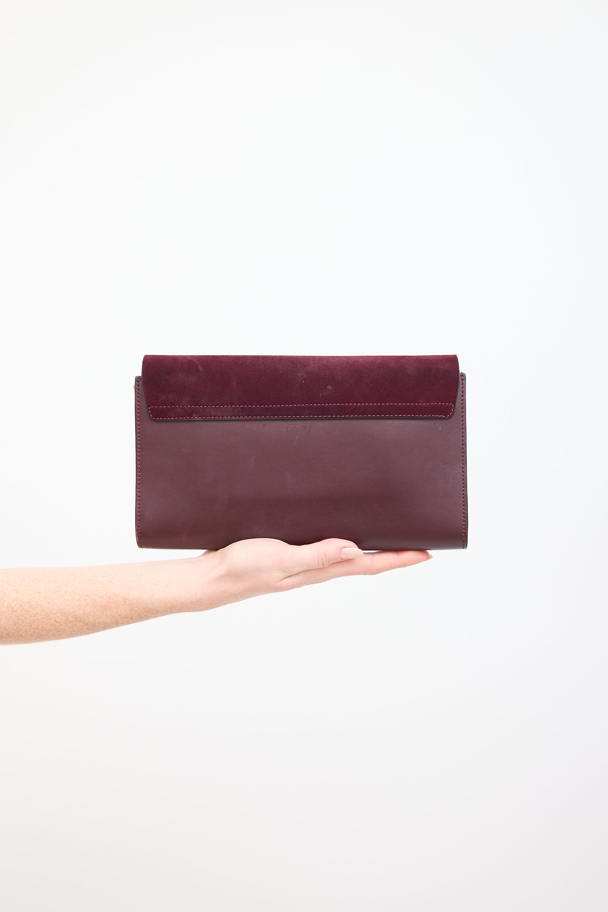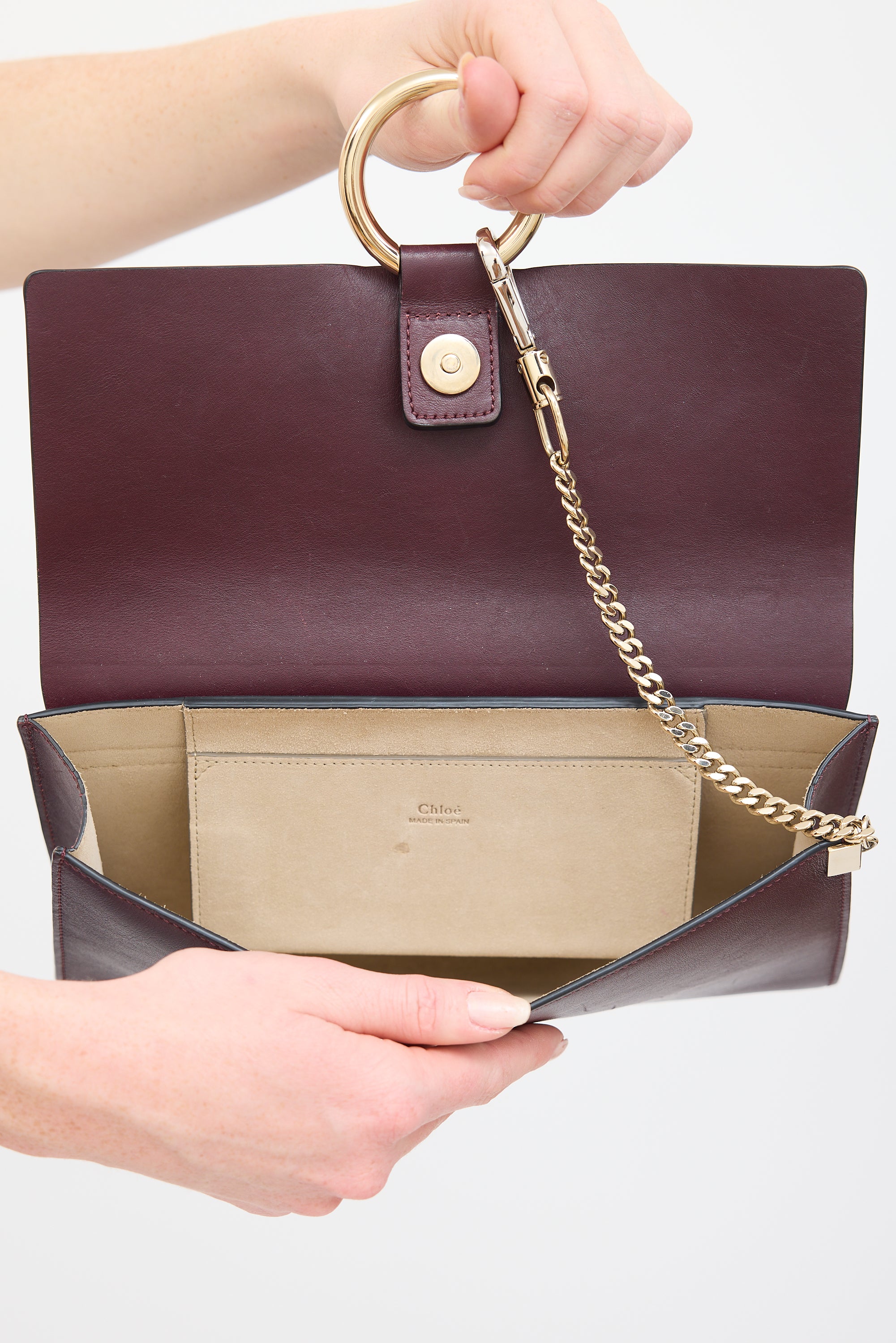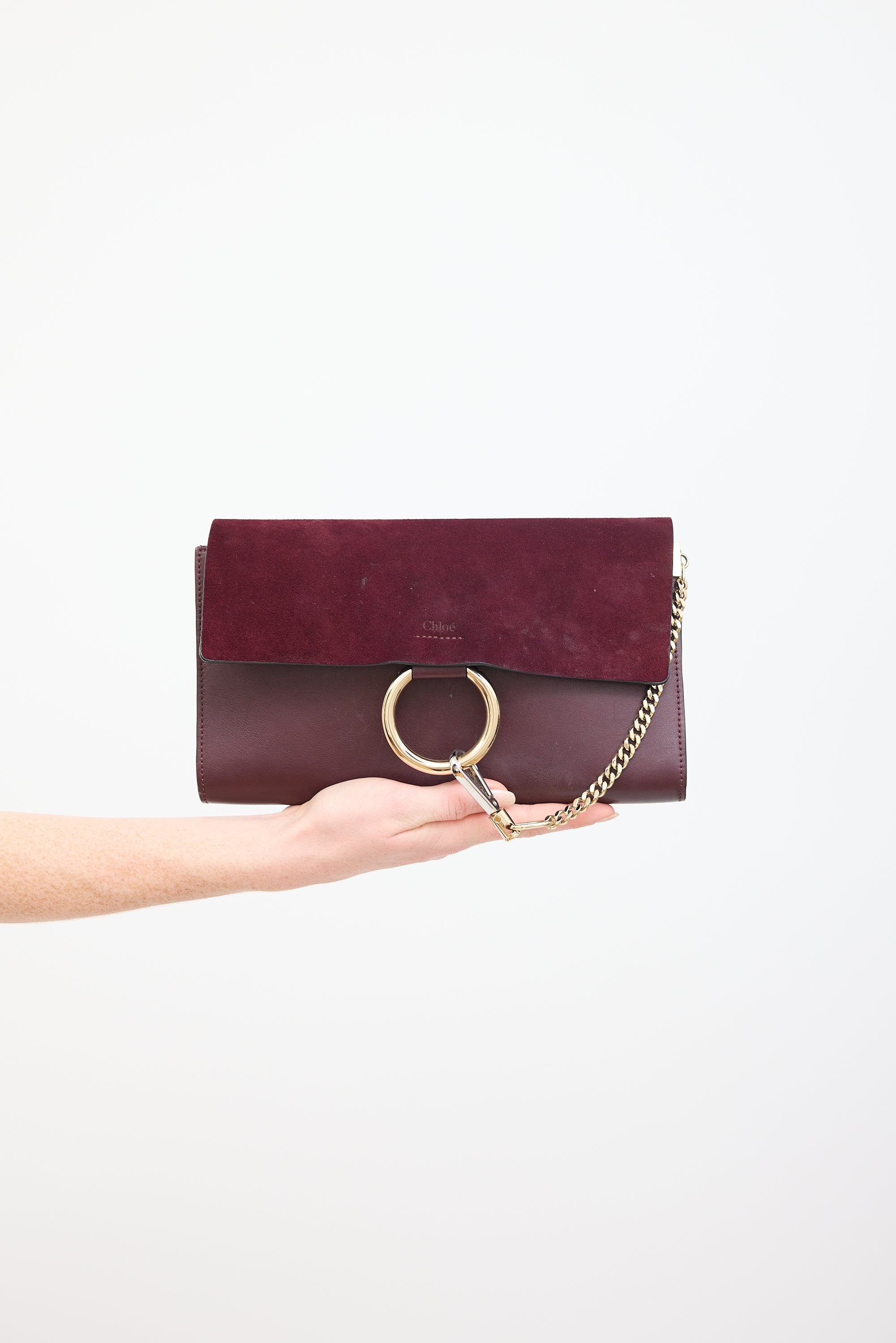 Pre-owned Chloé burgundy Faye leather clutch featuring suede top flap with snap button closure, gold tone ring and chain hardware at front, and one main compartment with one slip pocket. Comes with original dust bag.
