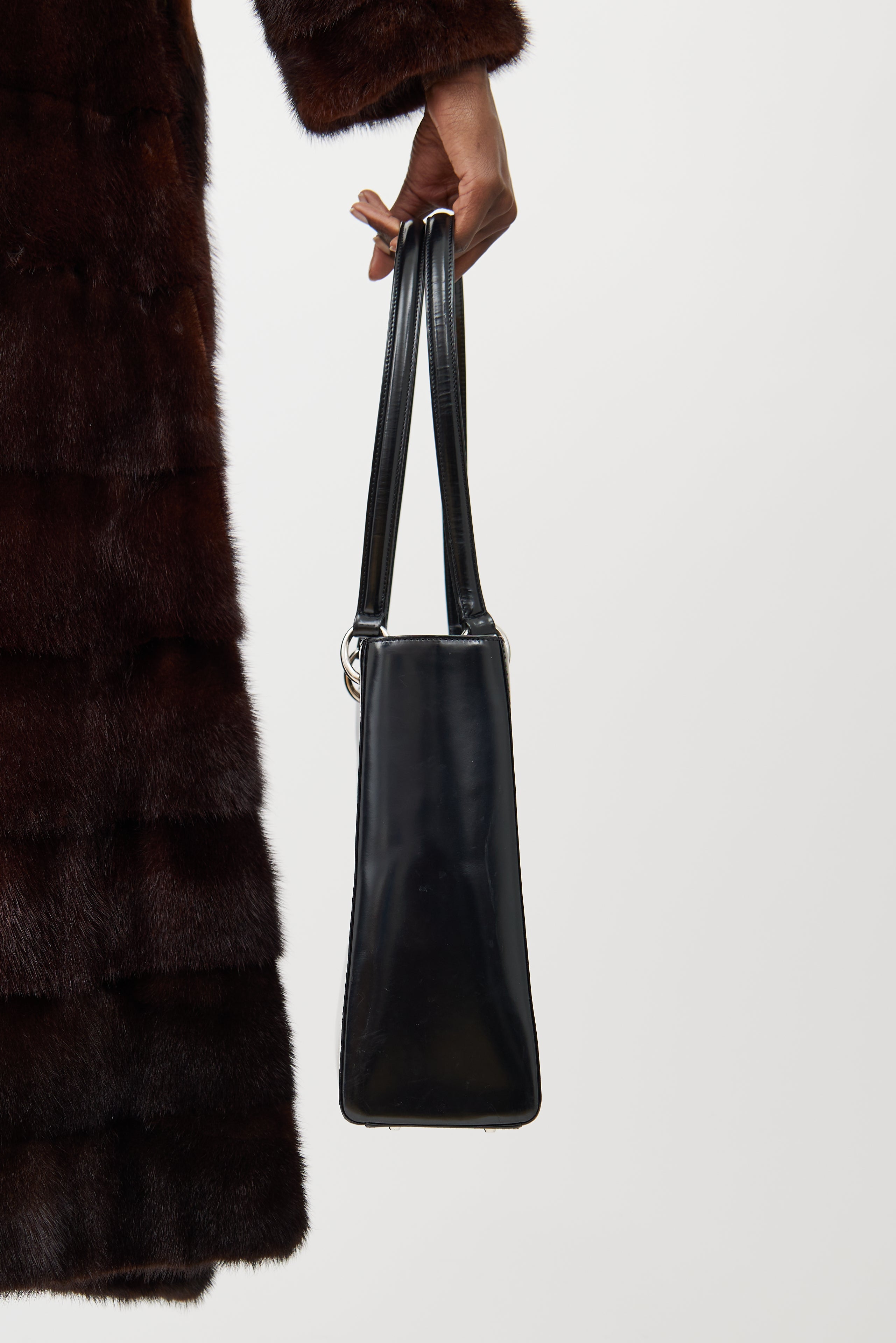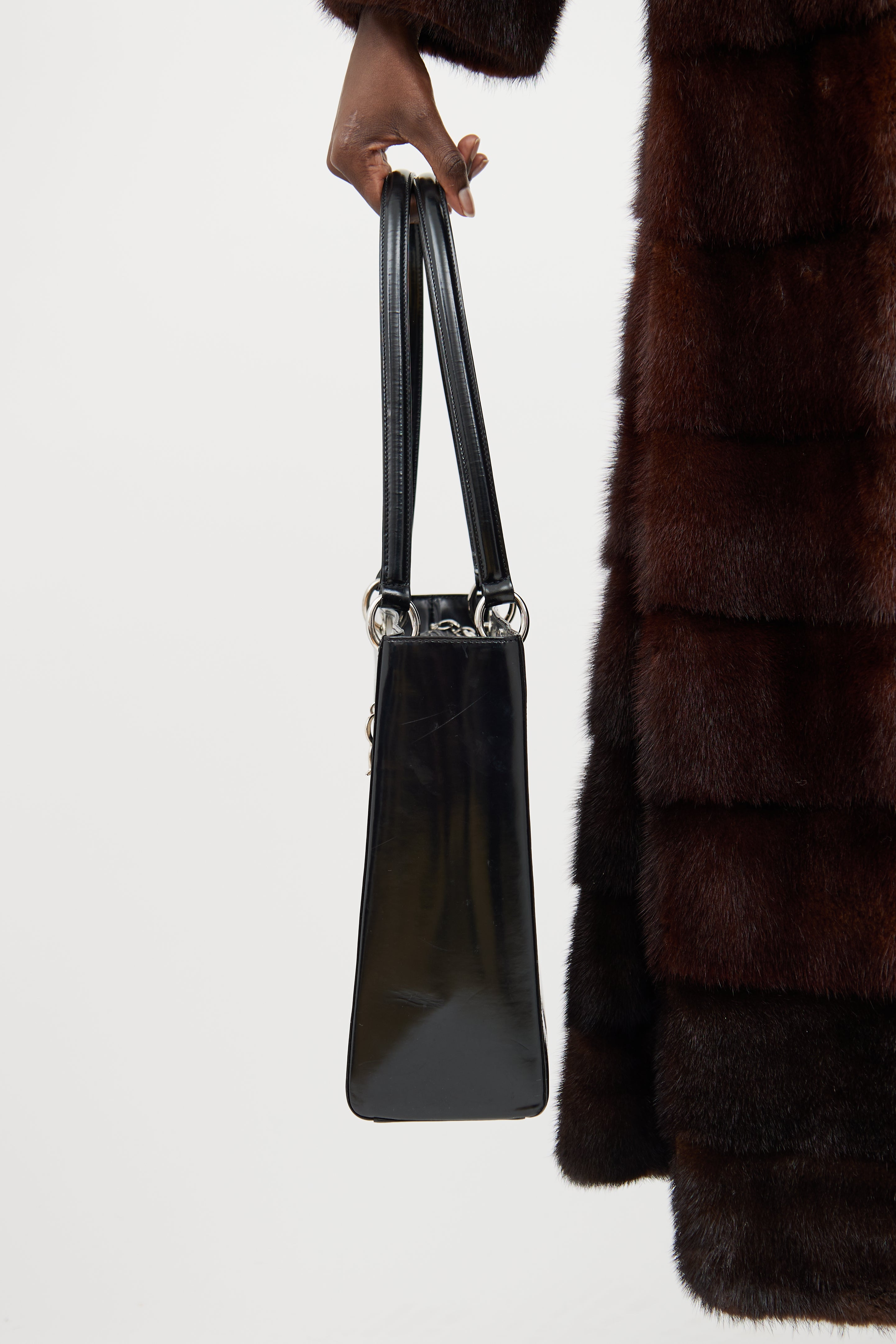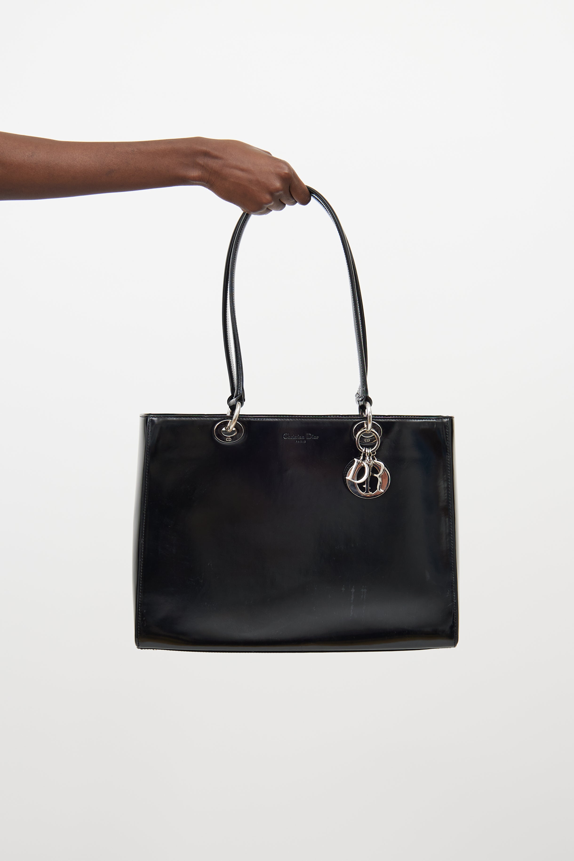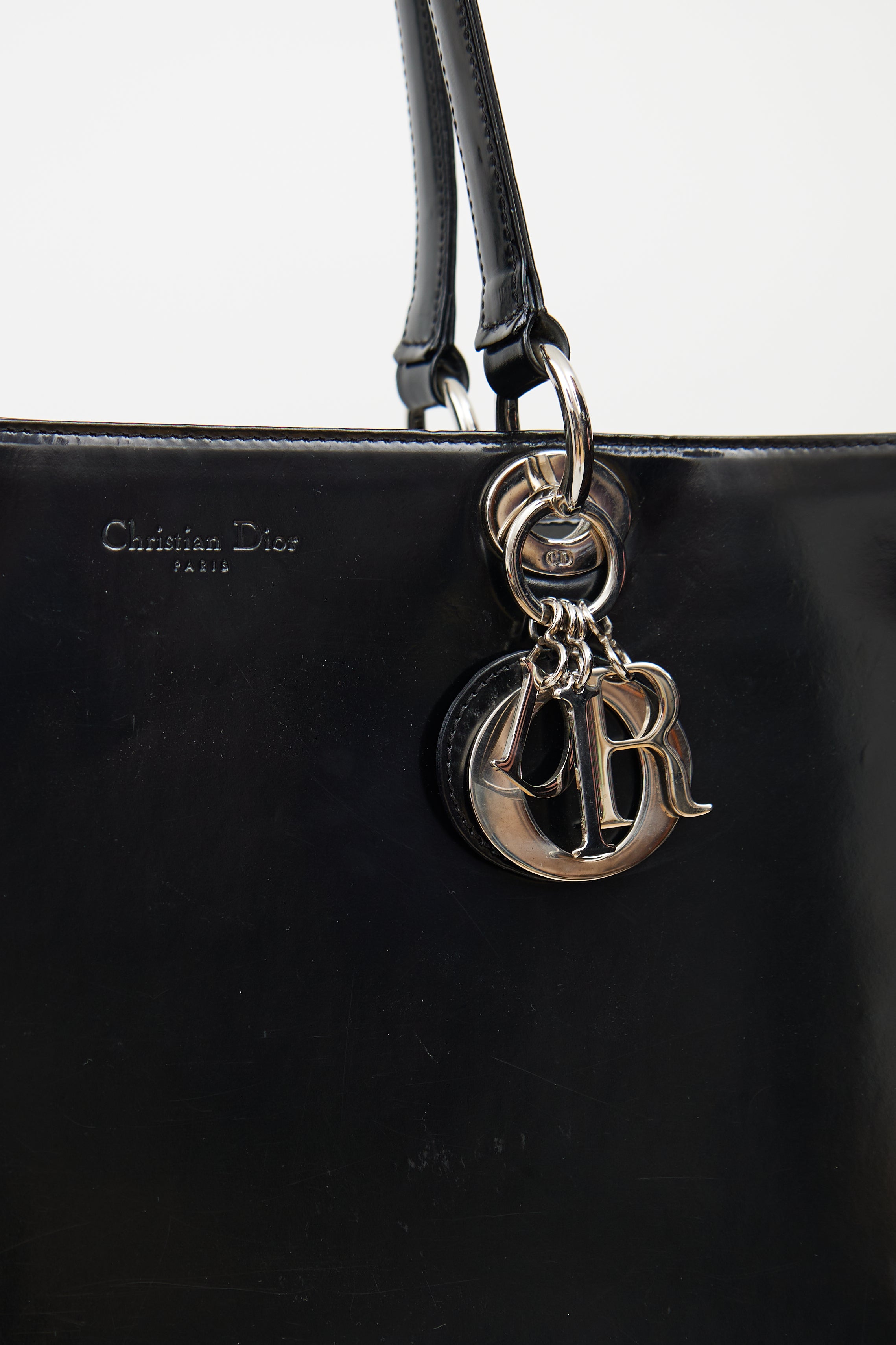 Pre-owned Dior black Lady Dior patent leather tote featuring two top handles, silver tone logo charms at front, one main compartment with one zip pocket, debossed logo at top, and top zip closure.