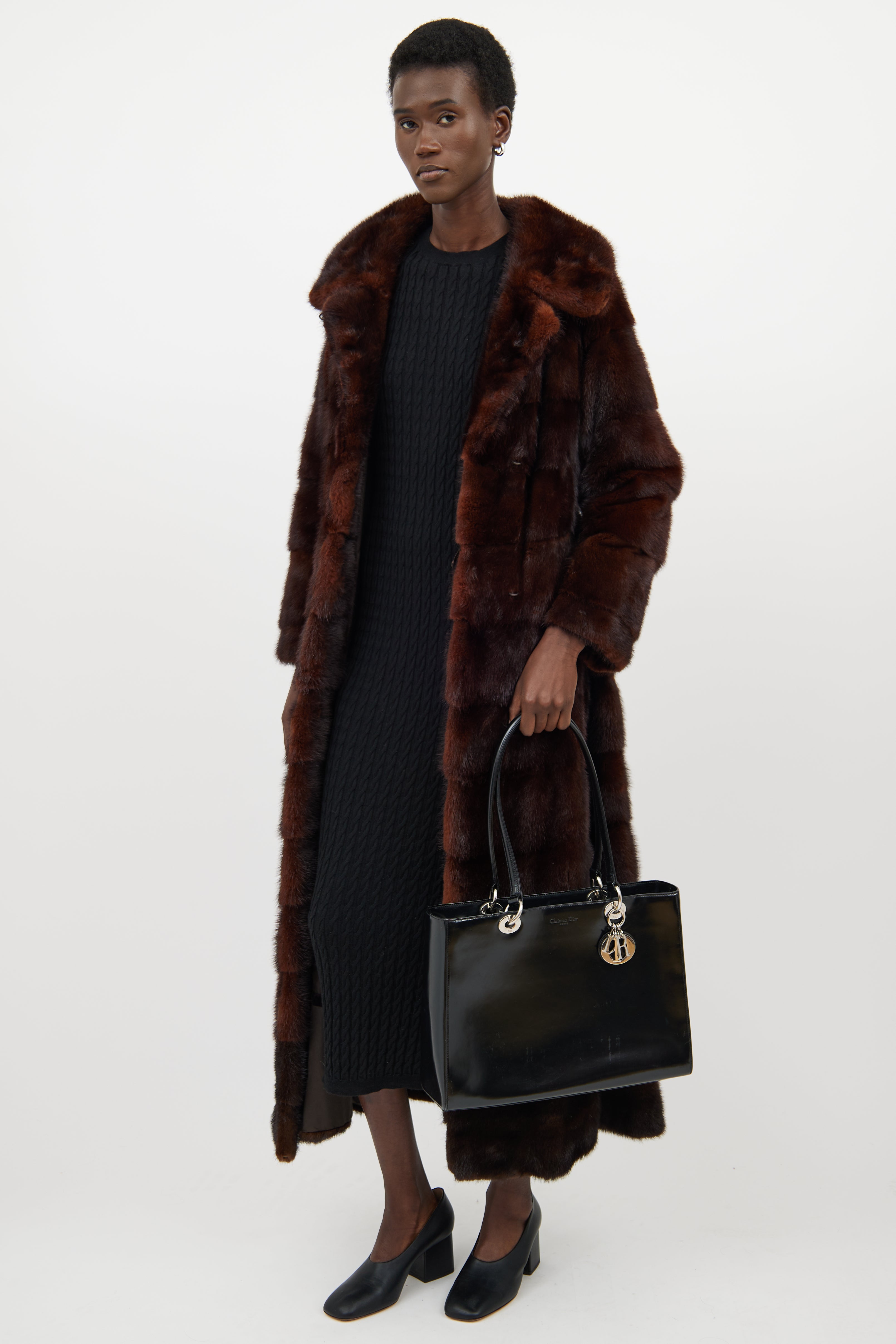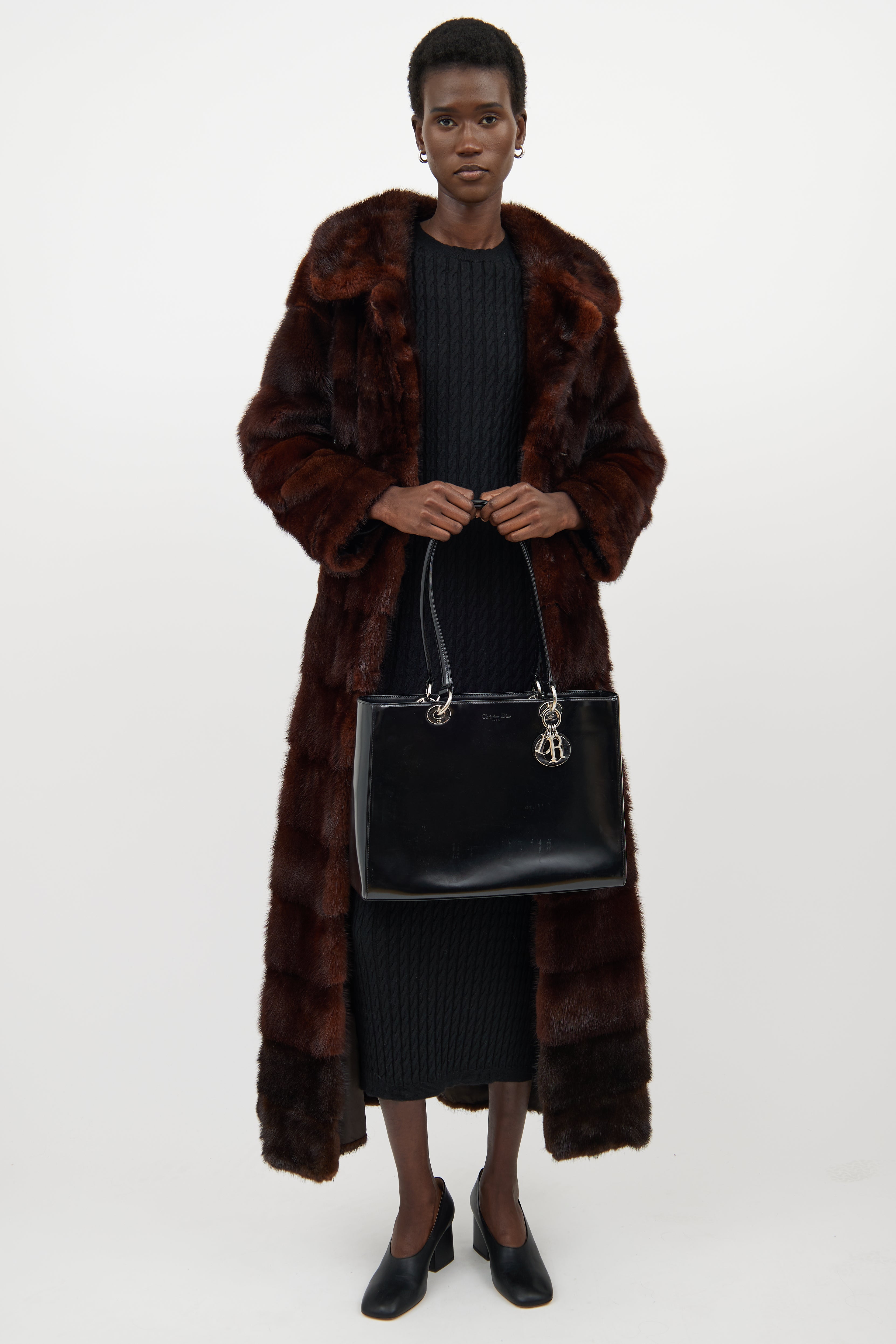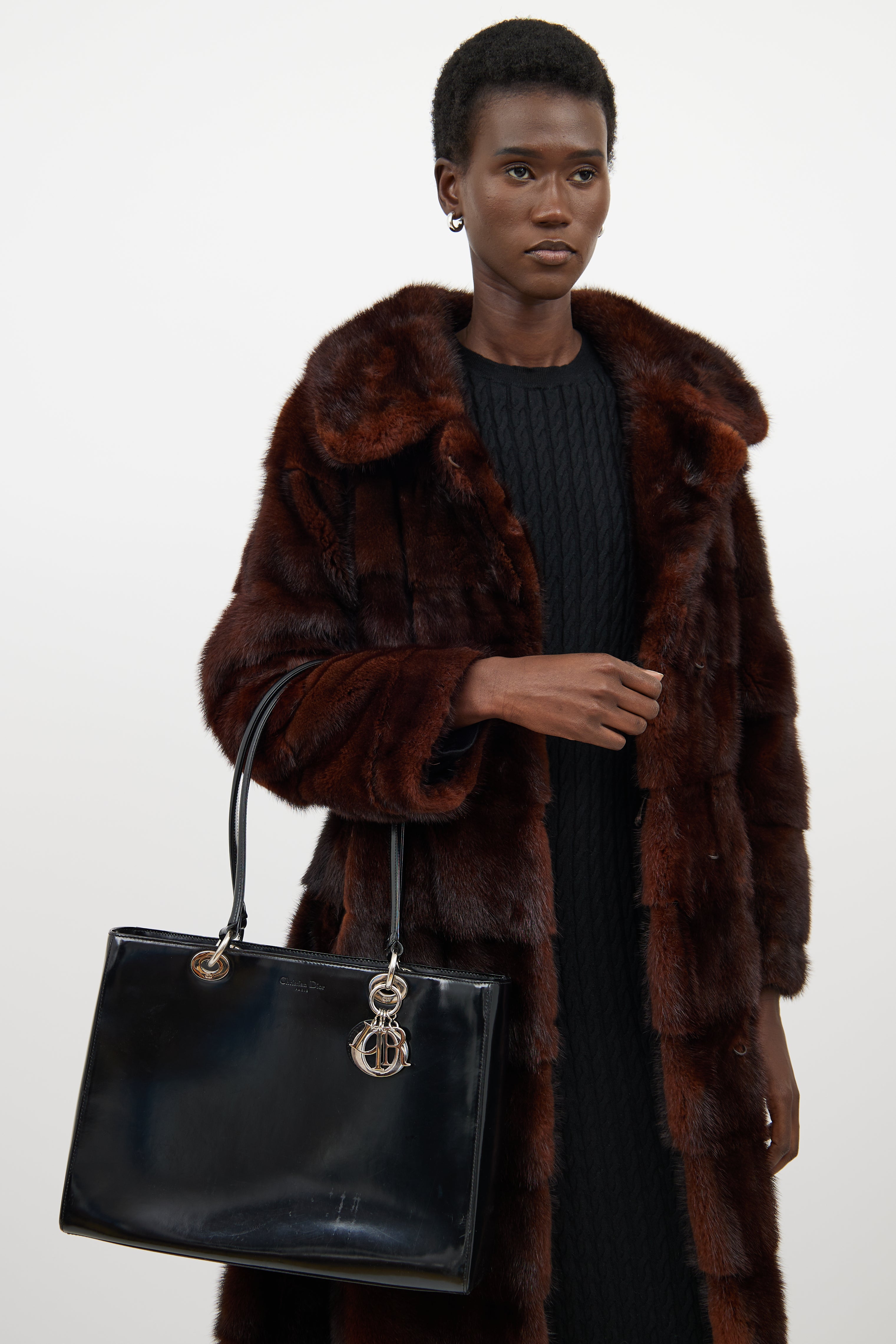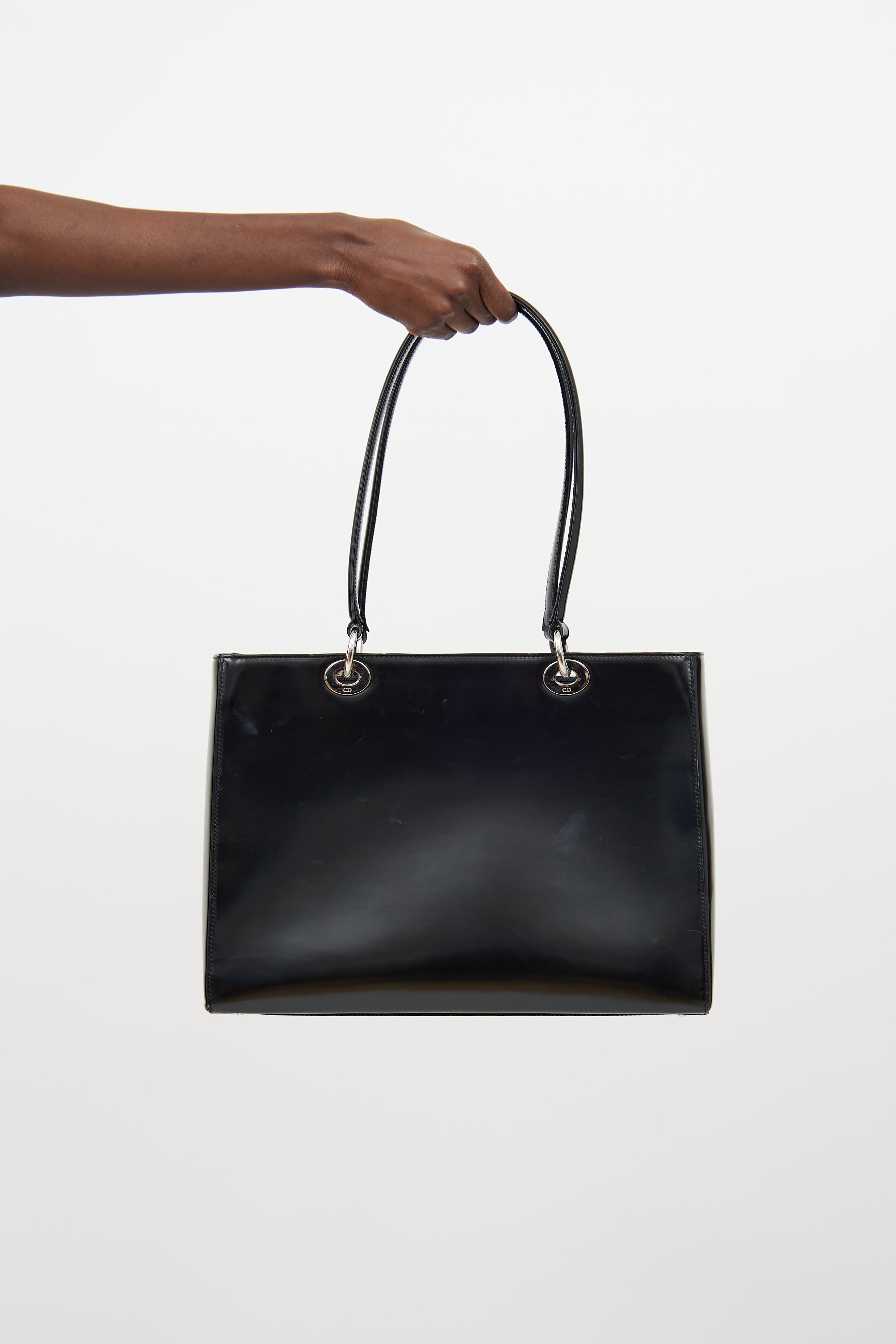 Pre-owned Dior black Lady Dior patent leather tote featuring two top handles, silver tone logo charms at front, one main compartment with one zip pocket, debossed logo at top, and top zip closure.