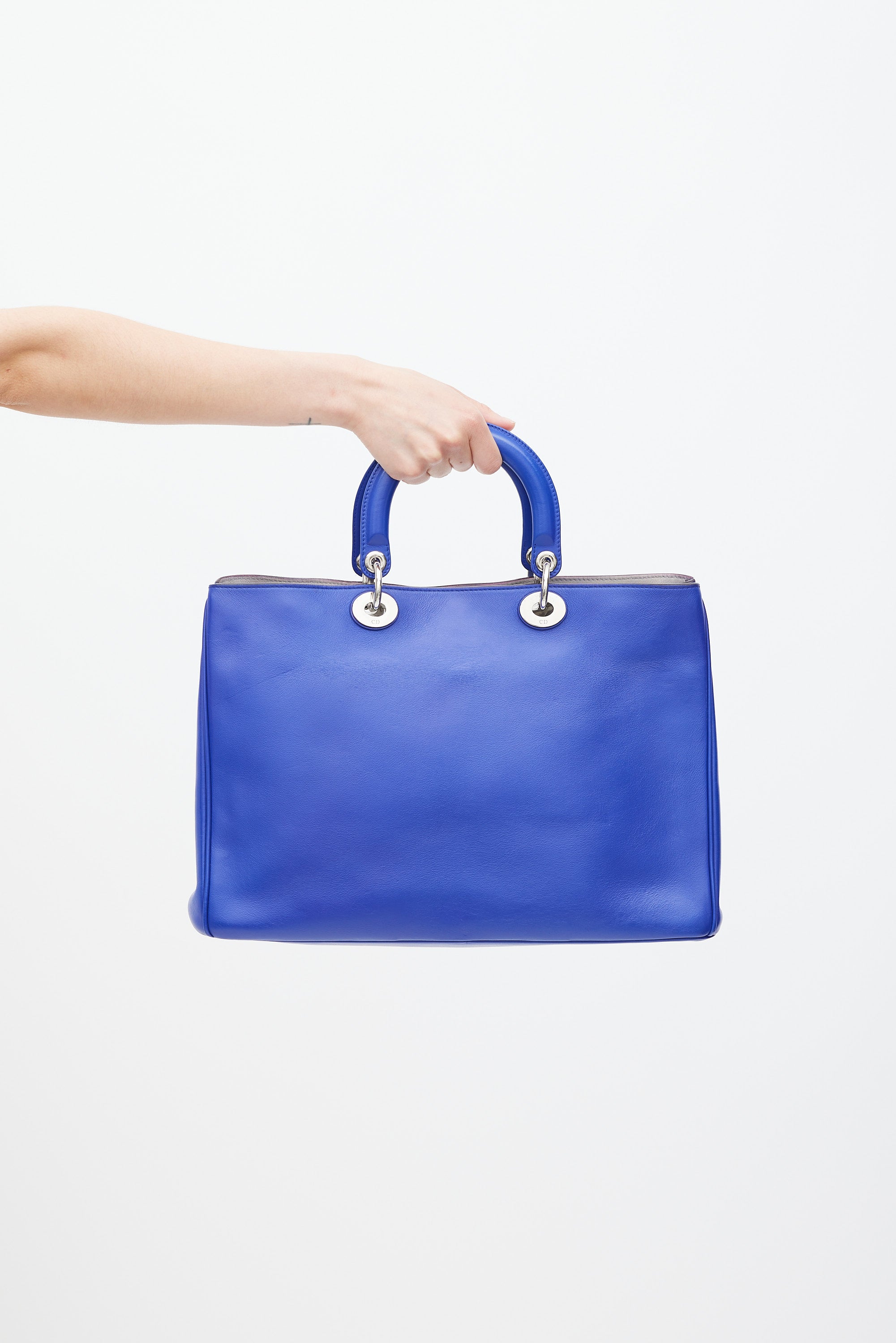 Pre-owned Dior blue Diorissimo leather bag featuring two top handles, silver tone logo charms at front, one main compartment with two slip pockets, removable shoulder strap, and magnetic top closure.