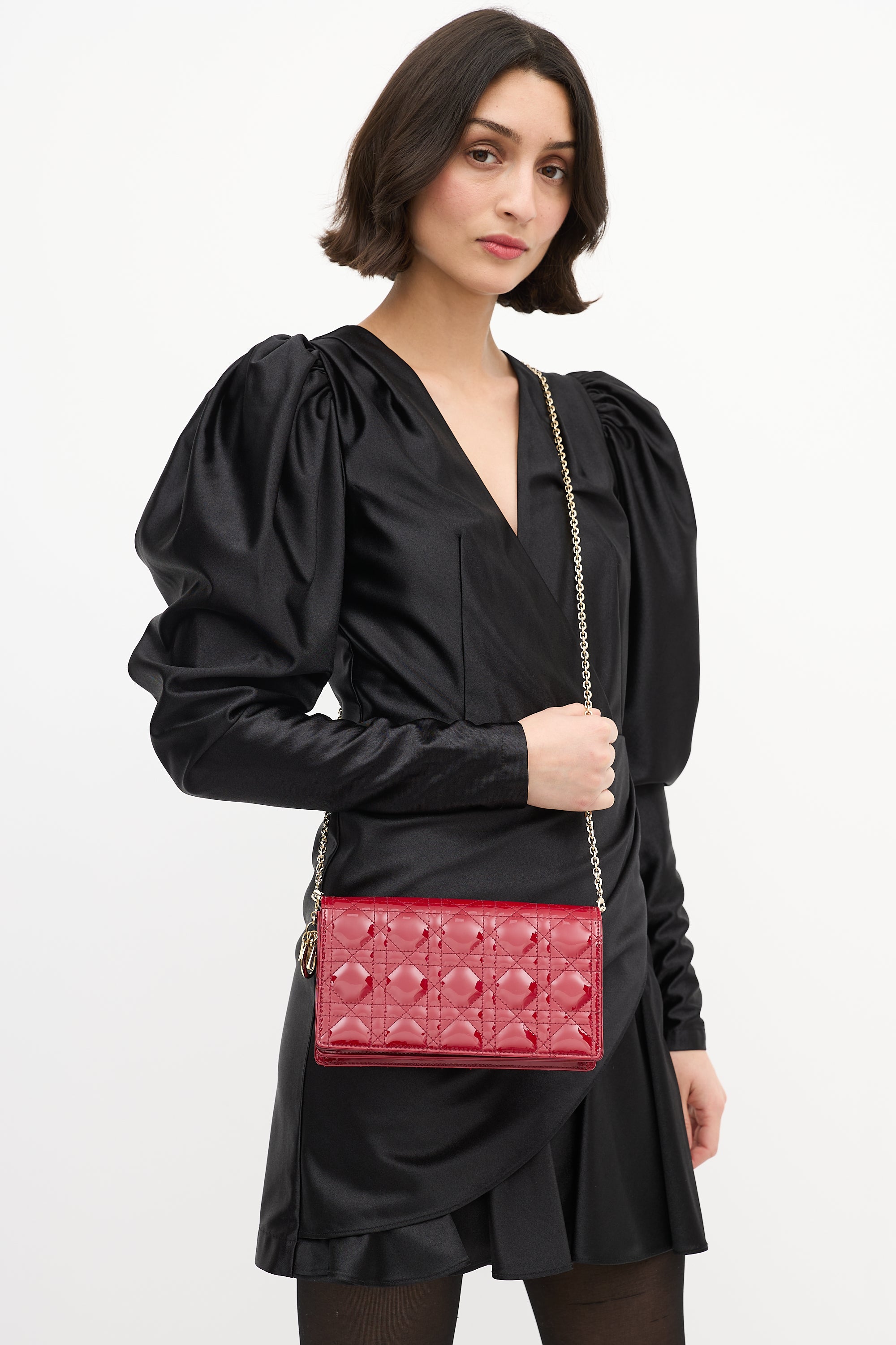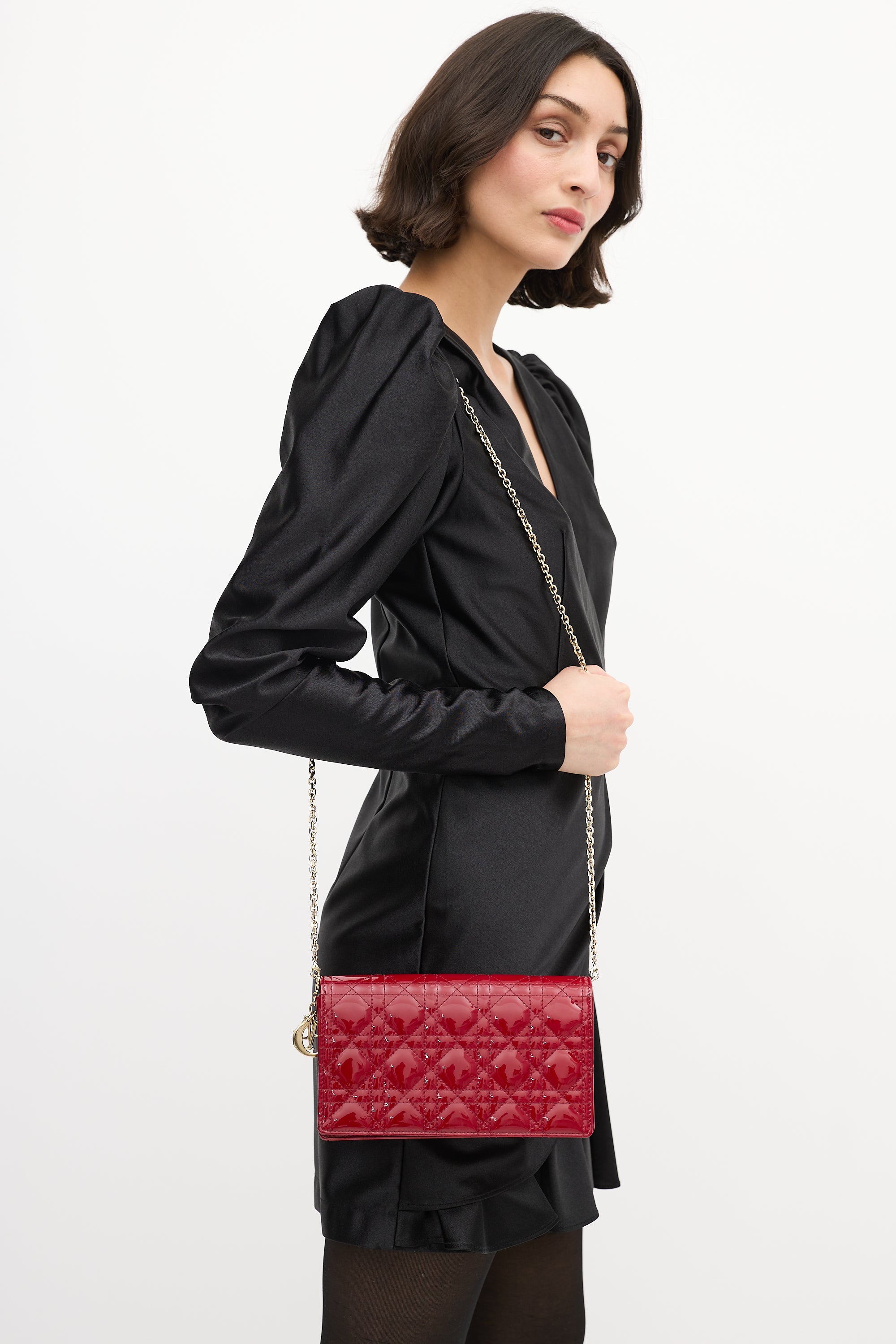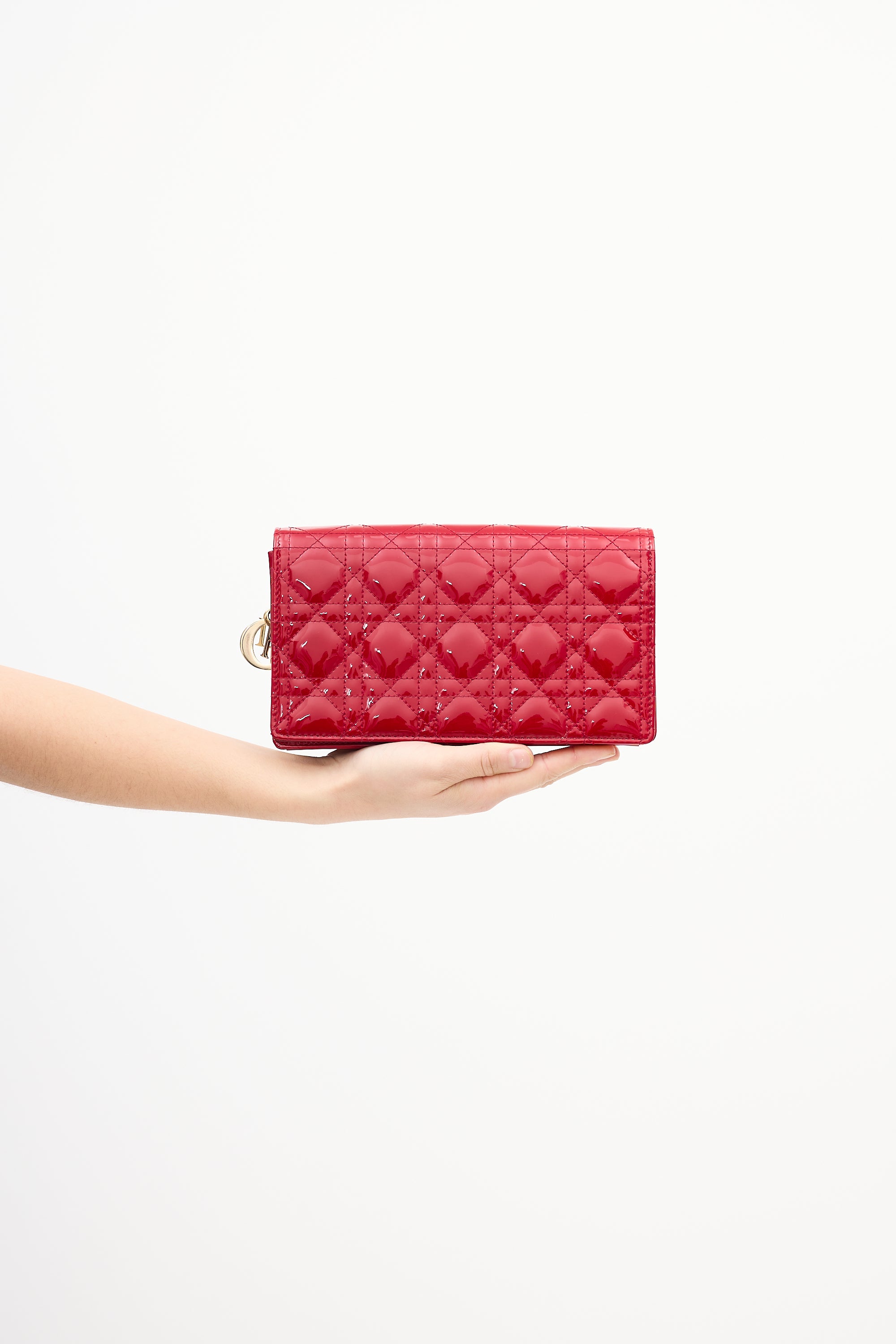 Pre-owned Christian Dior Lady Dior Pouch in red patent leather featuring Cannage stitch pattern throughout, gold tone 'D.I.O.R.' charms, removable chain strap with lobster claw clasps, magnetic closure, interior compartment with one slip pocket, detachable zippered insert, detachable pocket insert with eight card slots, and gold tone stamp logo at interior flap.