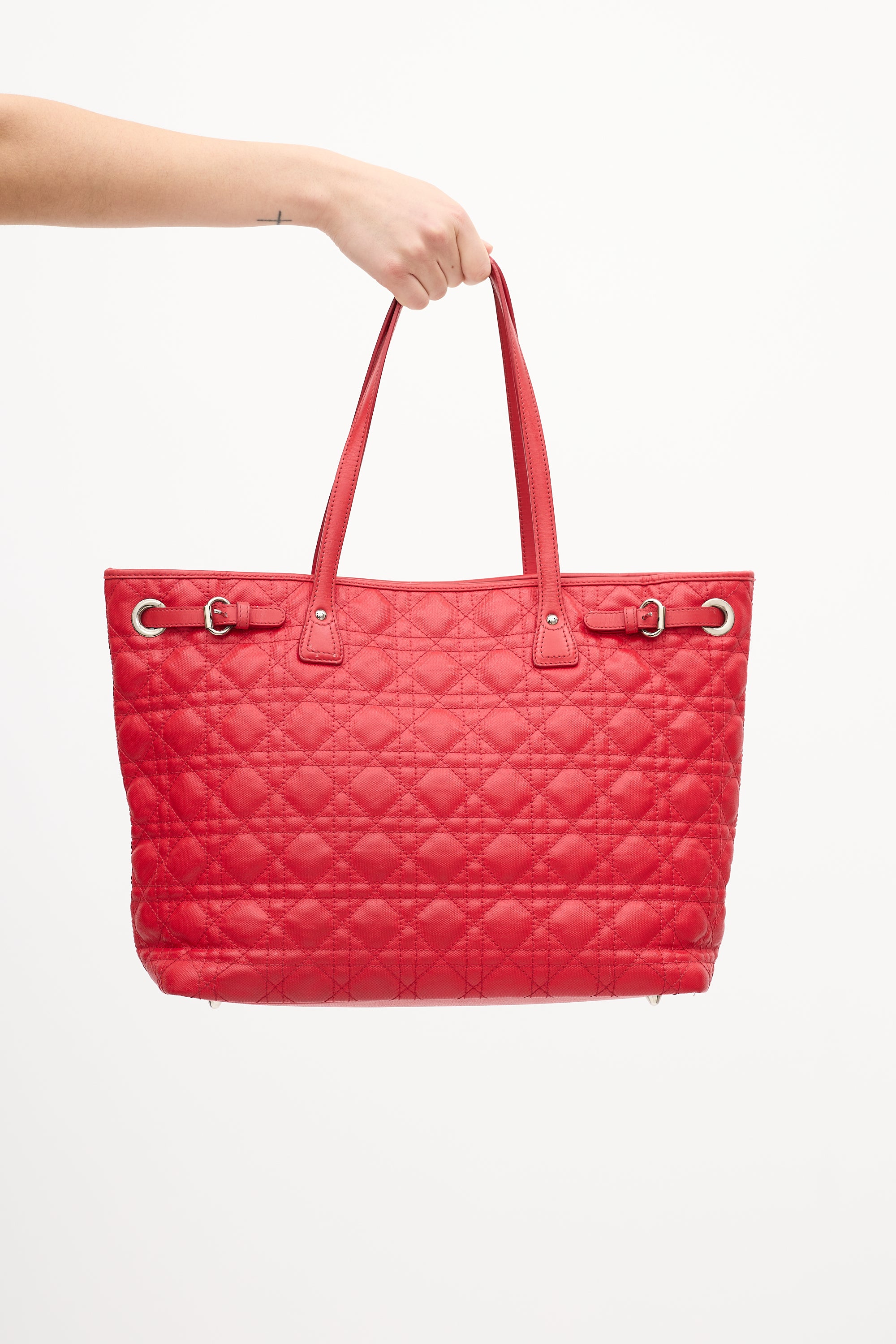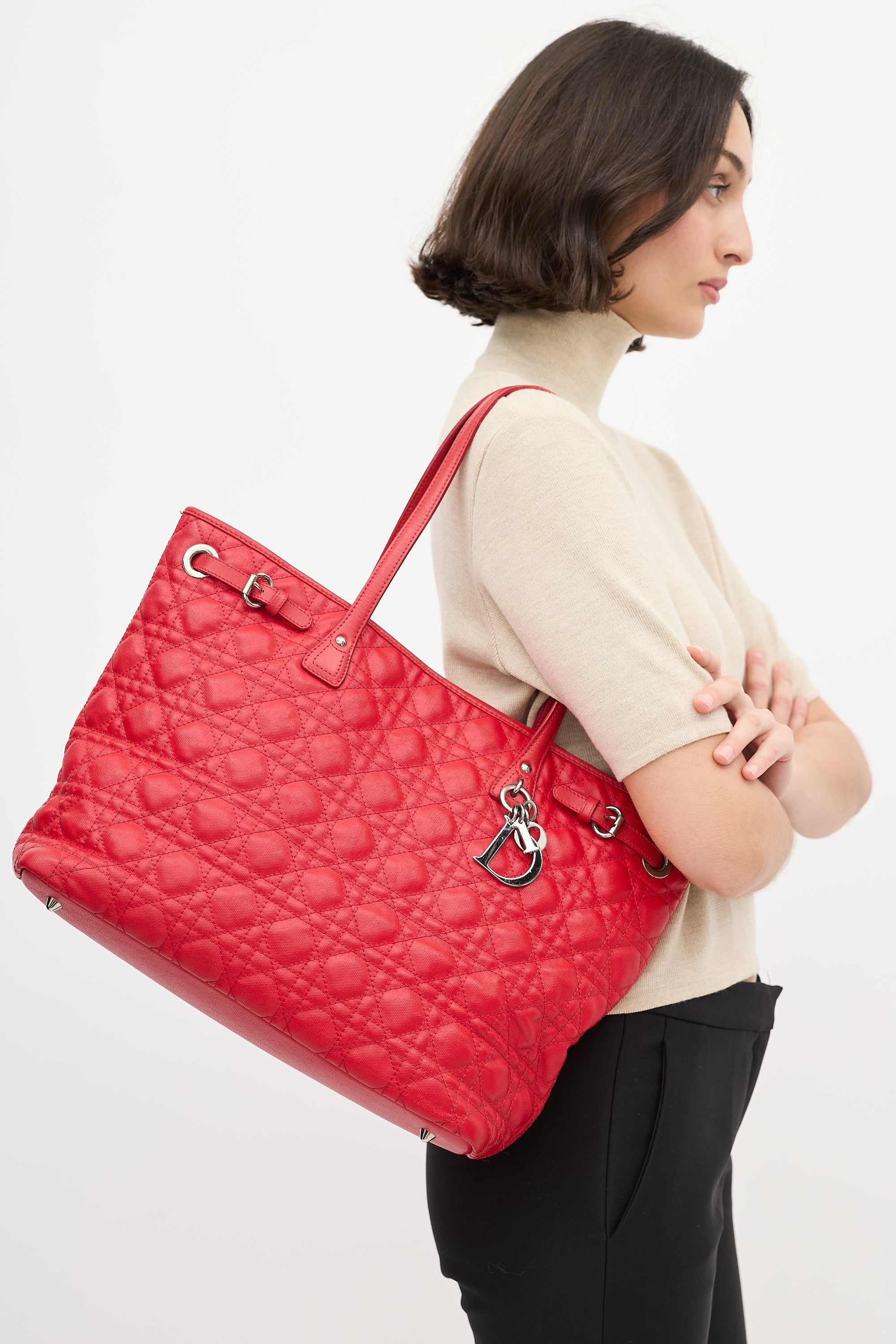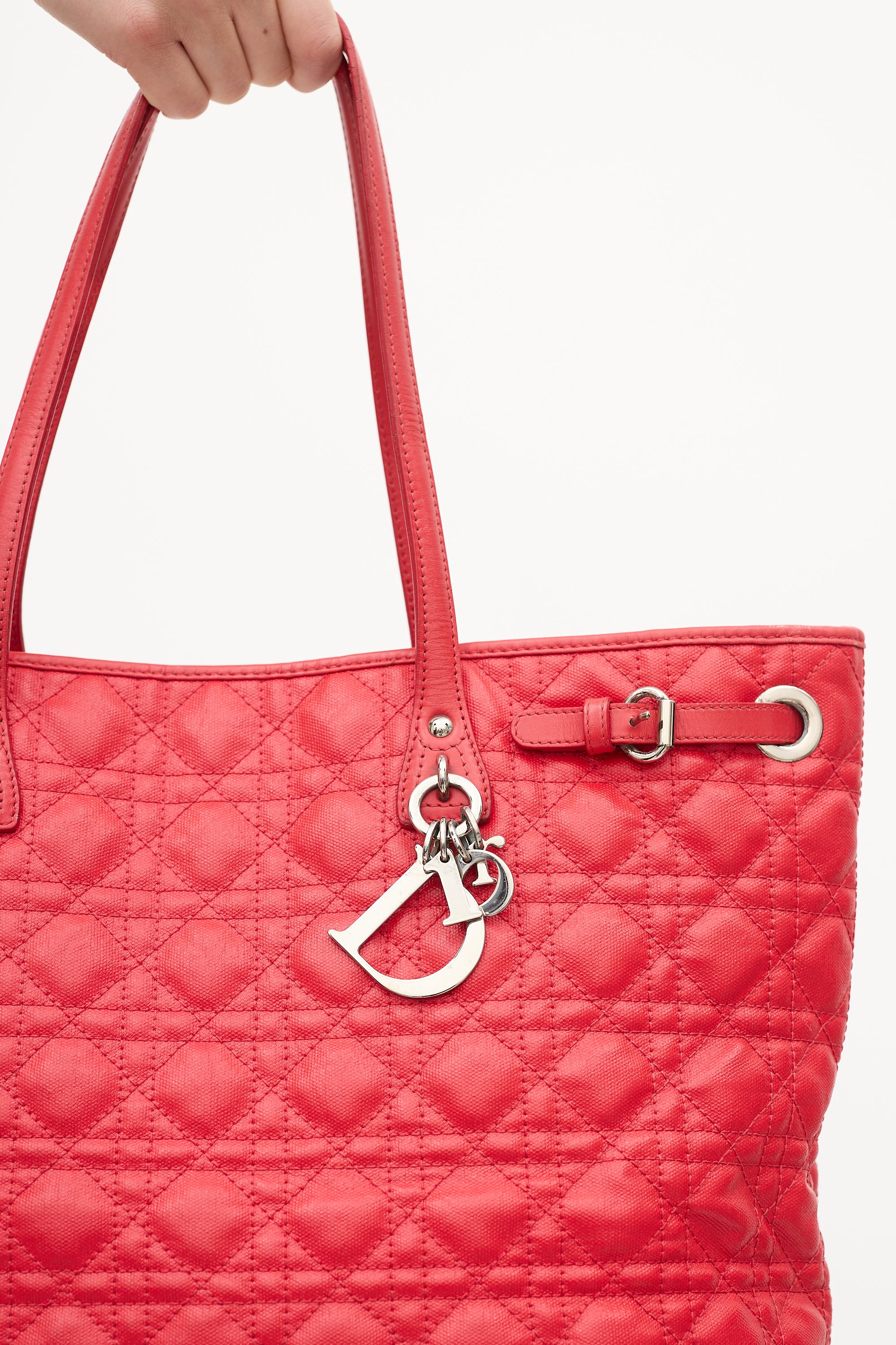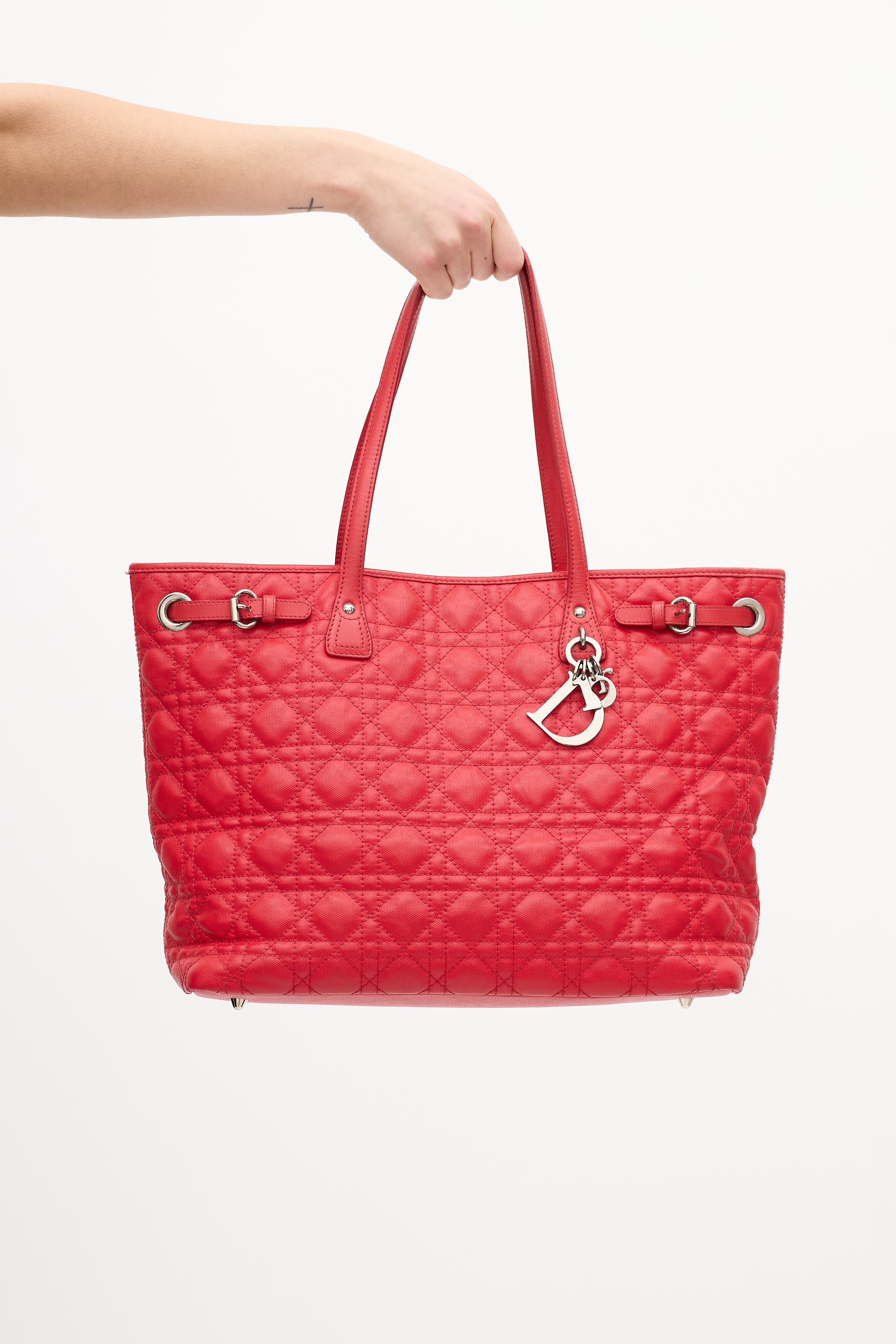 Pre-owned Dior red Panarea tote in signature Cannage quilted canvas featuring tonal stitching, silver tone hardware, four protective feet at base, buckled strap at top, dual flat leather handles, "D.I.O.R." charms at handle, magnetic top closure, and one lined main compartment with one zip pocket and two slip pockets.