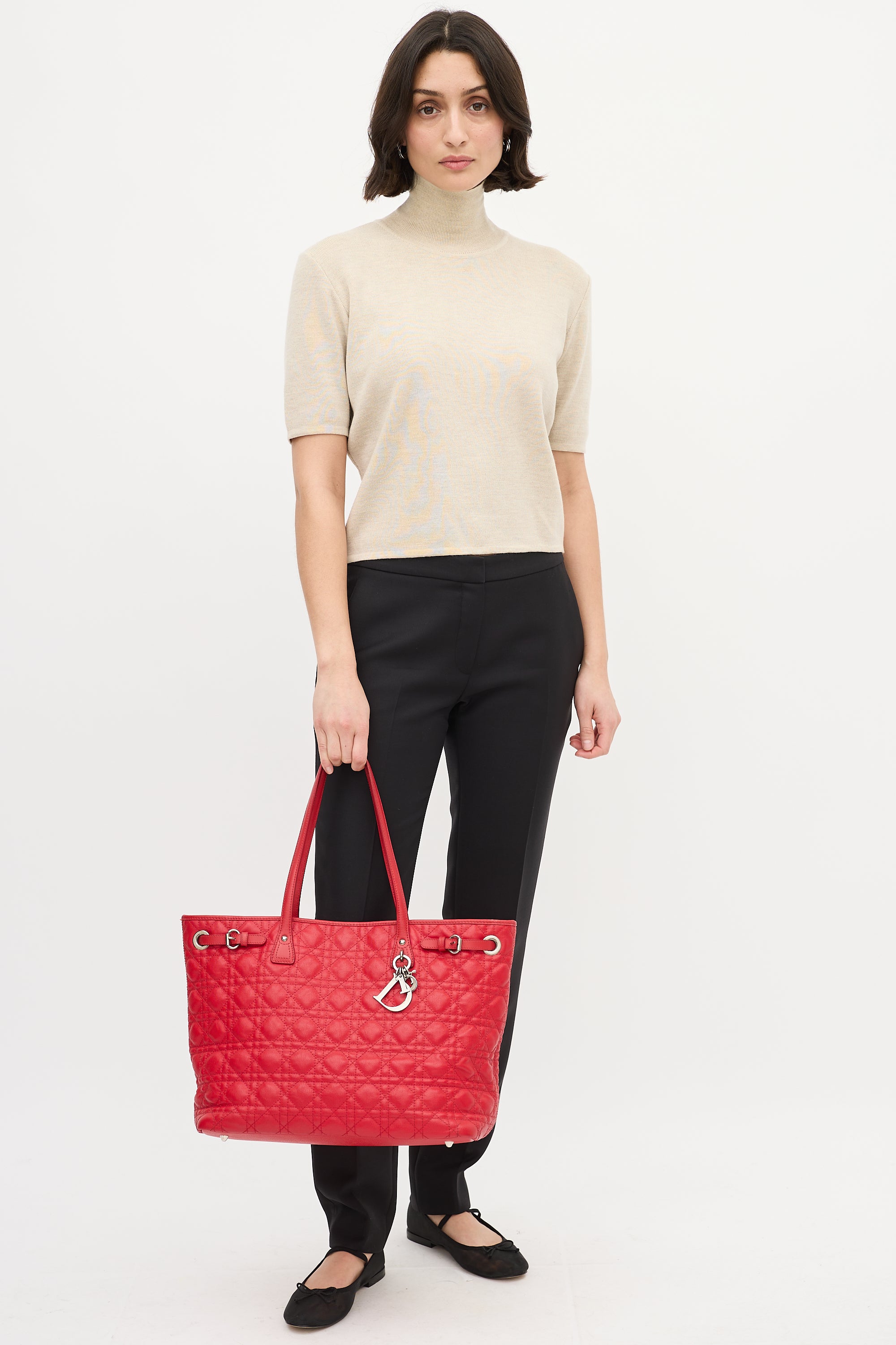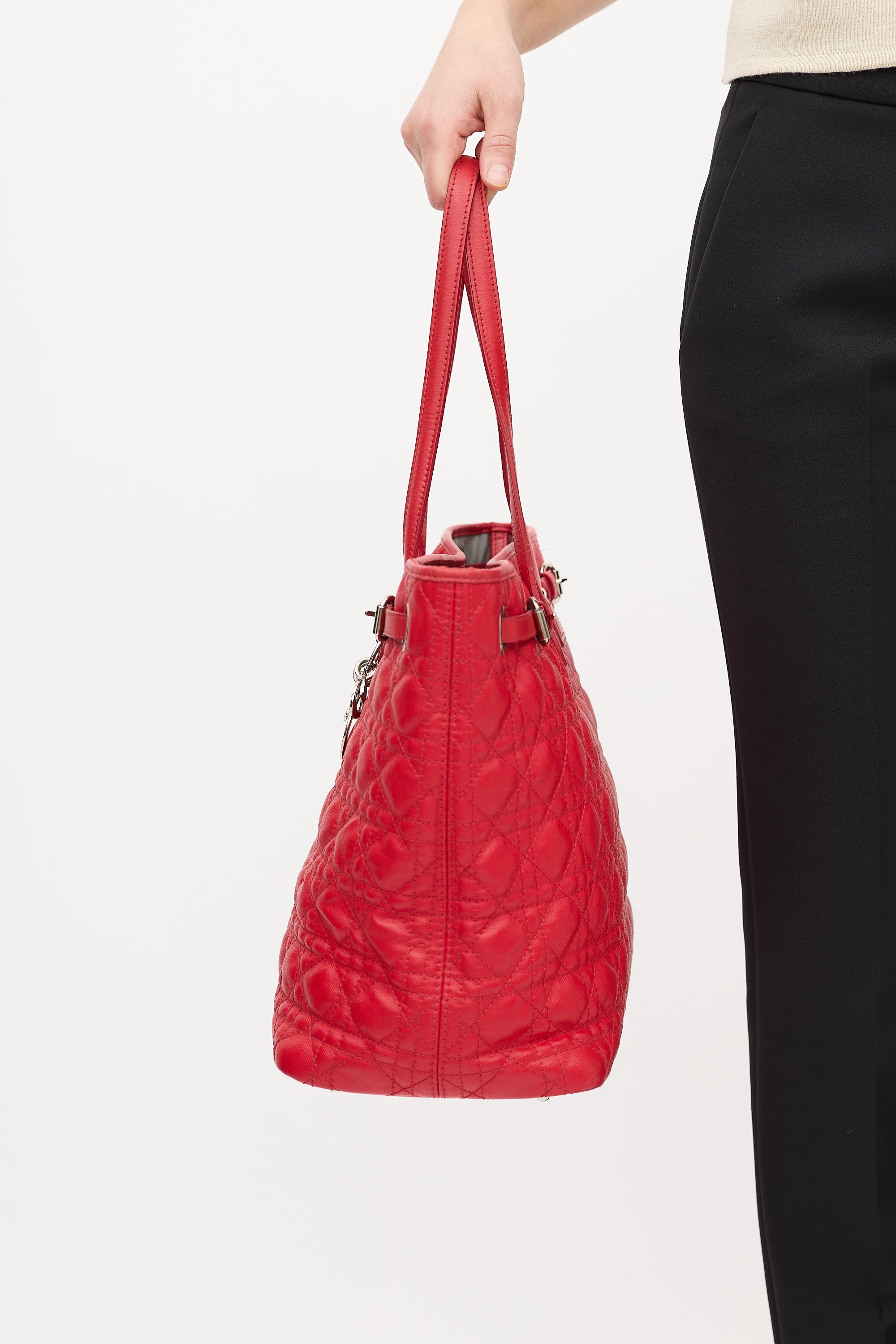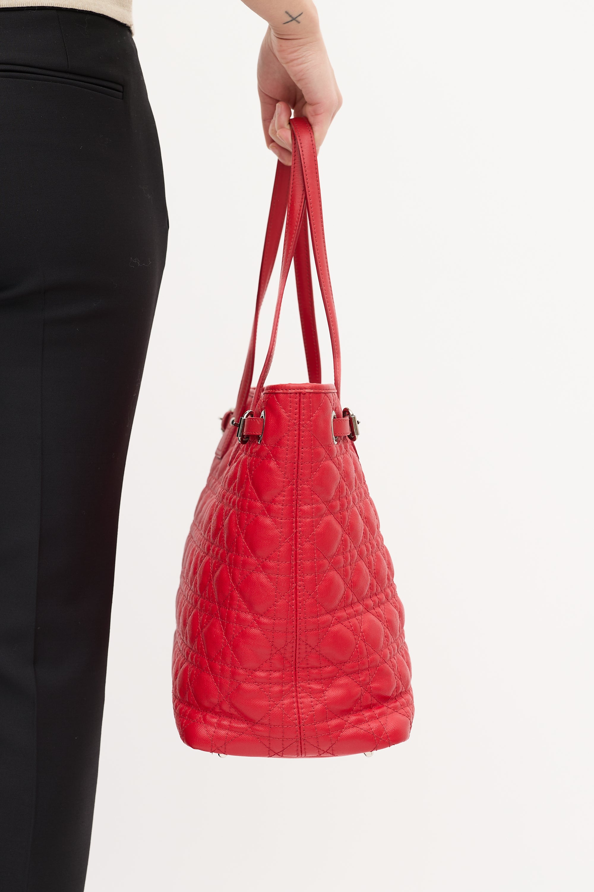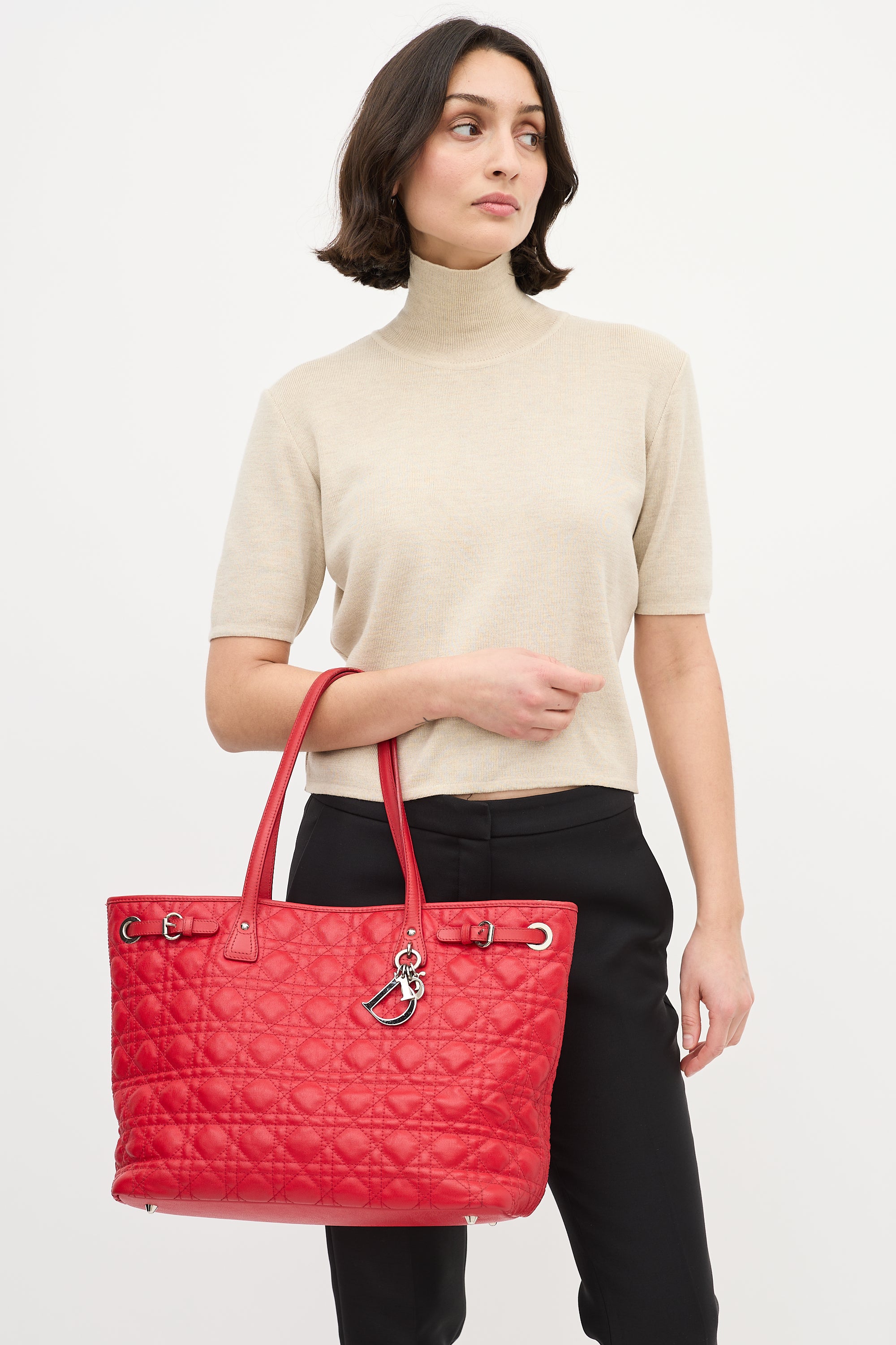 Pre-owned Dior red Panarea tote in signature Cannage quilted canvas featuring tonal stitching, silver tone hardware, four protective feet at base, buckled strap at top, dual flat leather handles, "D.I.O.R." charms at handle, magnetic top closure, and one lined main compartment with one zip pocket and two slip pockets.