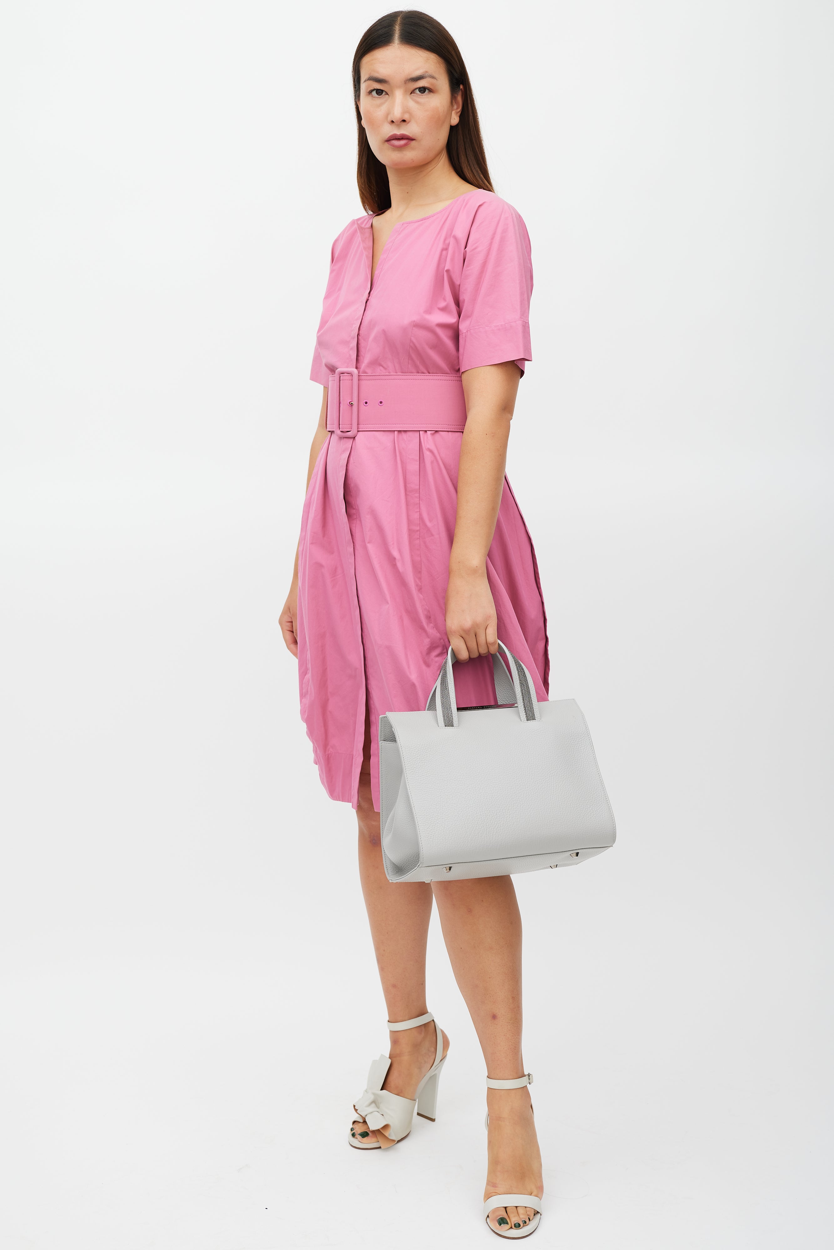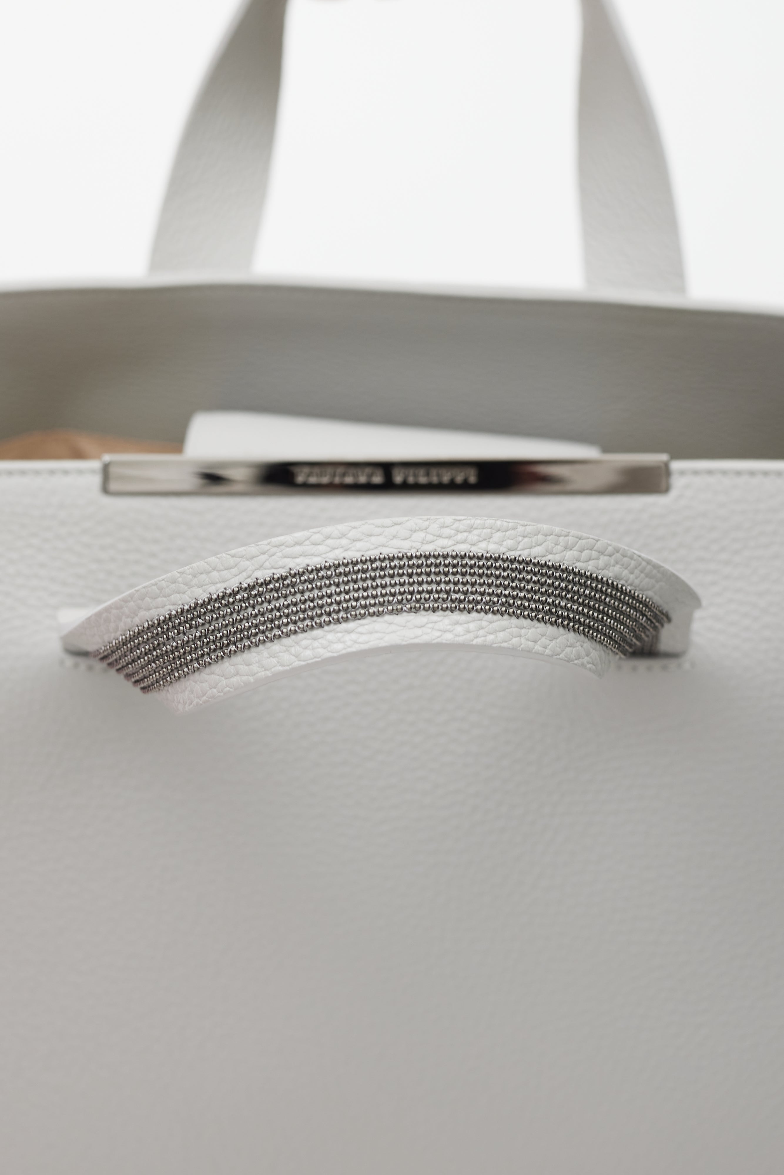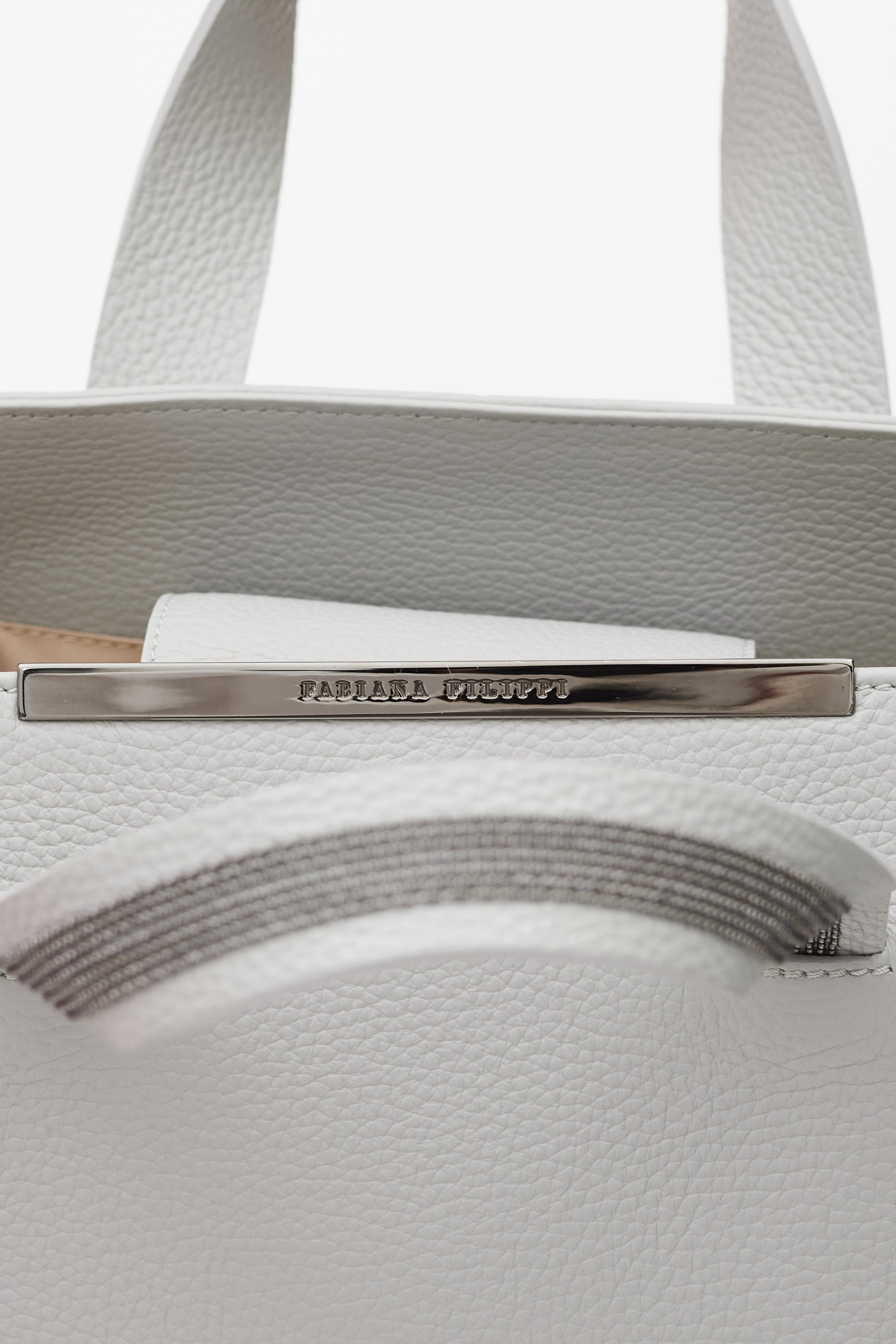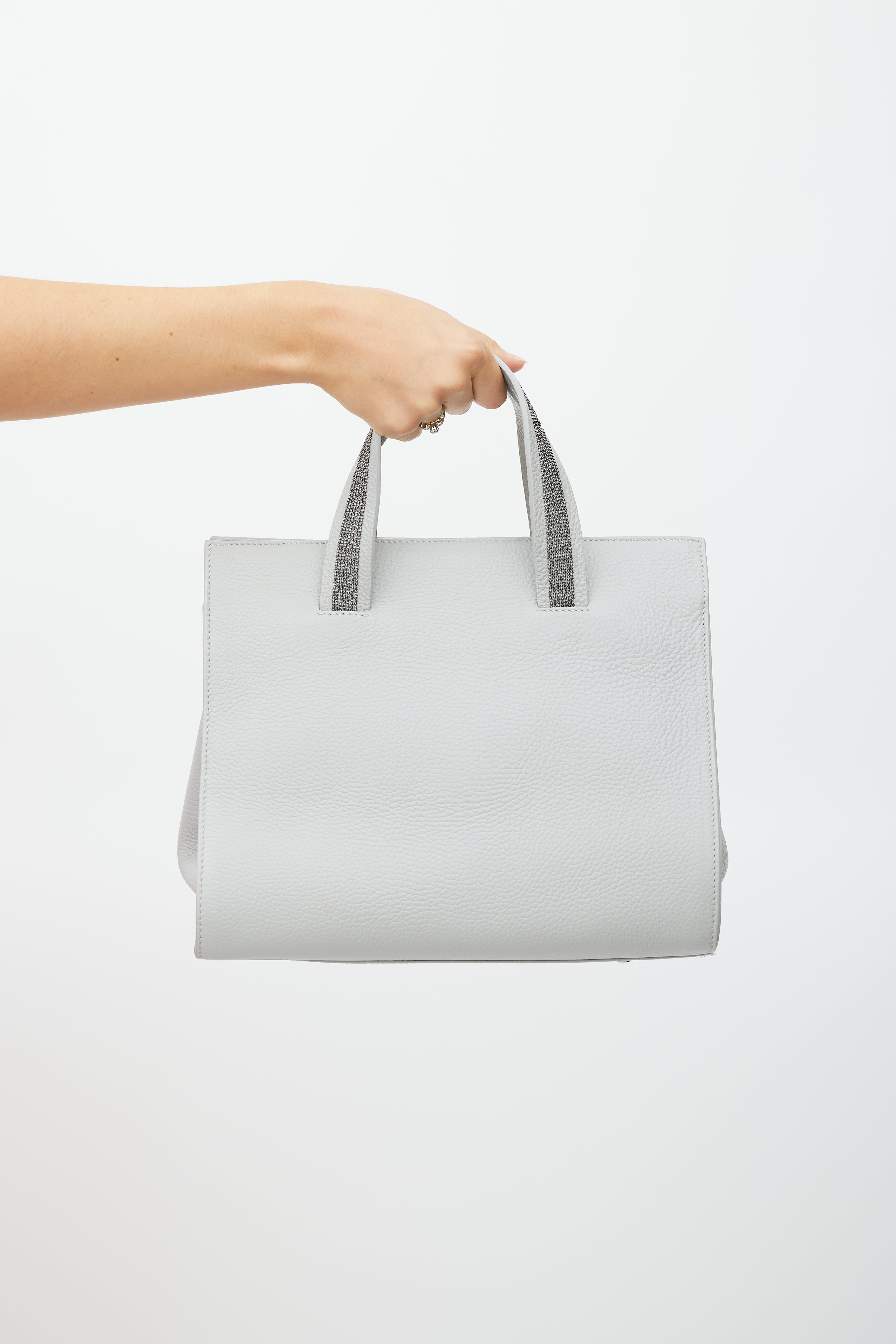 Pre-owned Fabiana Filippi grey leather bag featuring structured design, dual flat handles with gunmetal toned embellished stripe detail, gunmetal tone debossed logo plate at centre front top edge, side snap button fastenings, magnetic top closure, and one lined main compartment with single zip pocket. Comes with original dust bag.