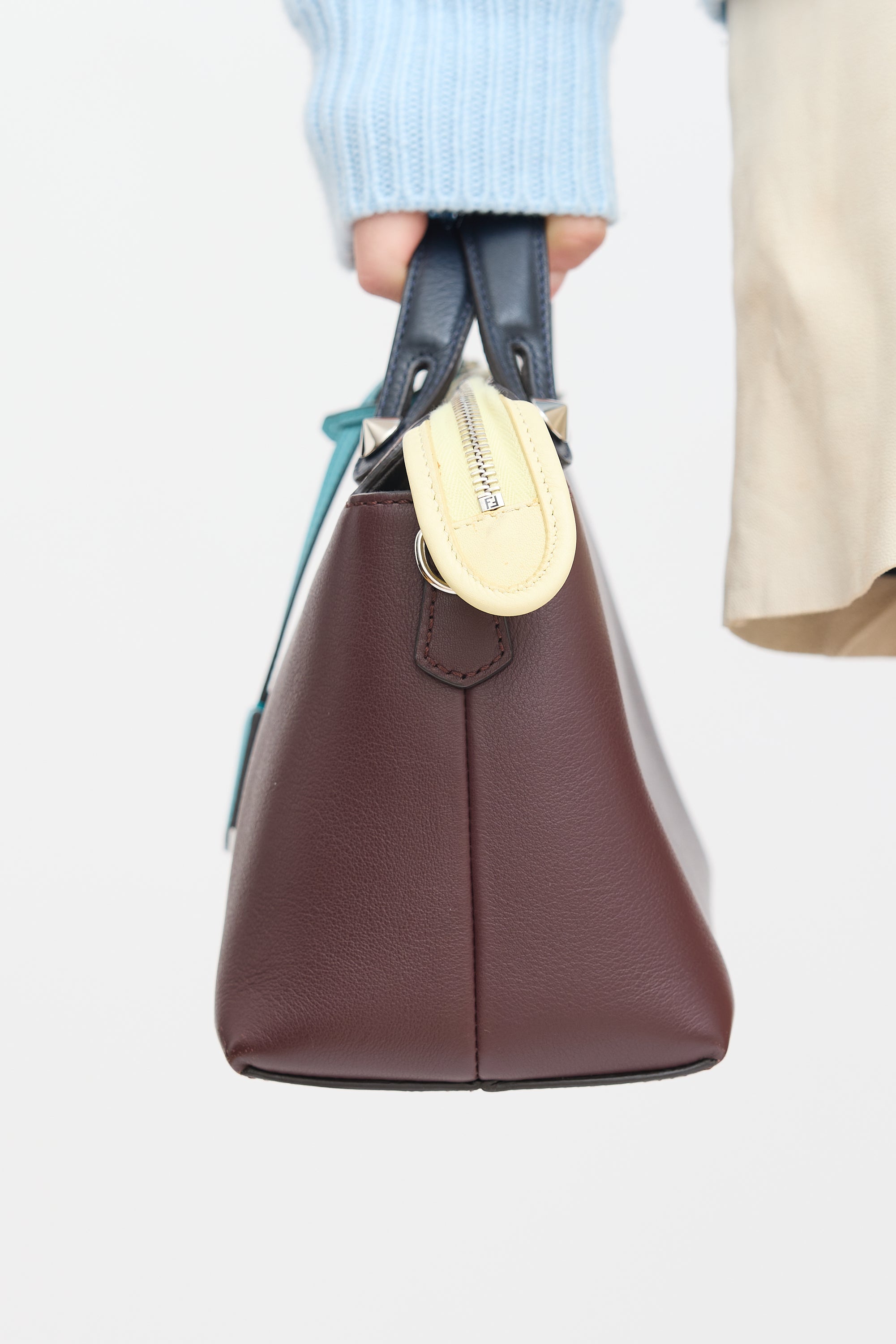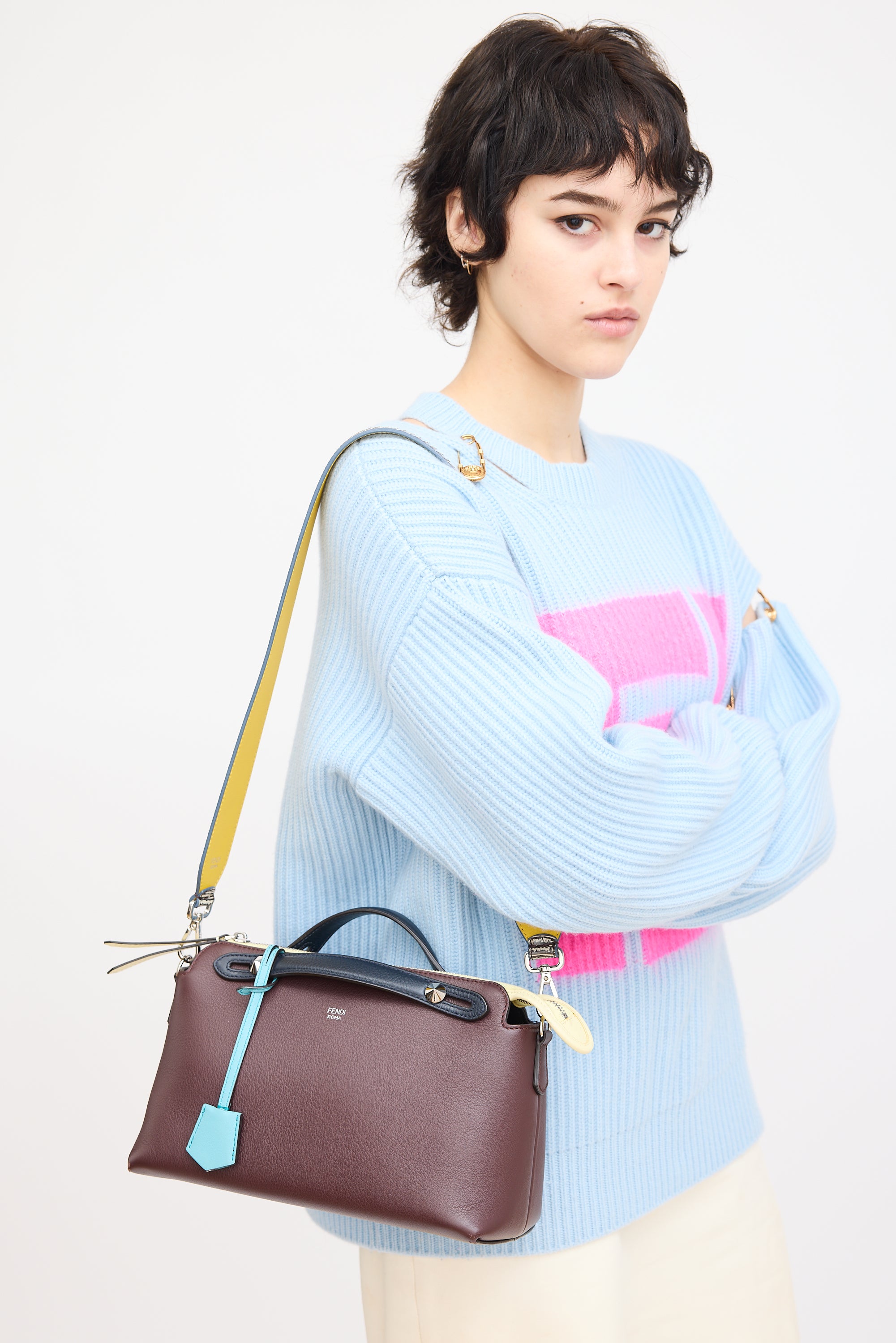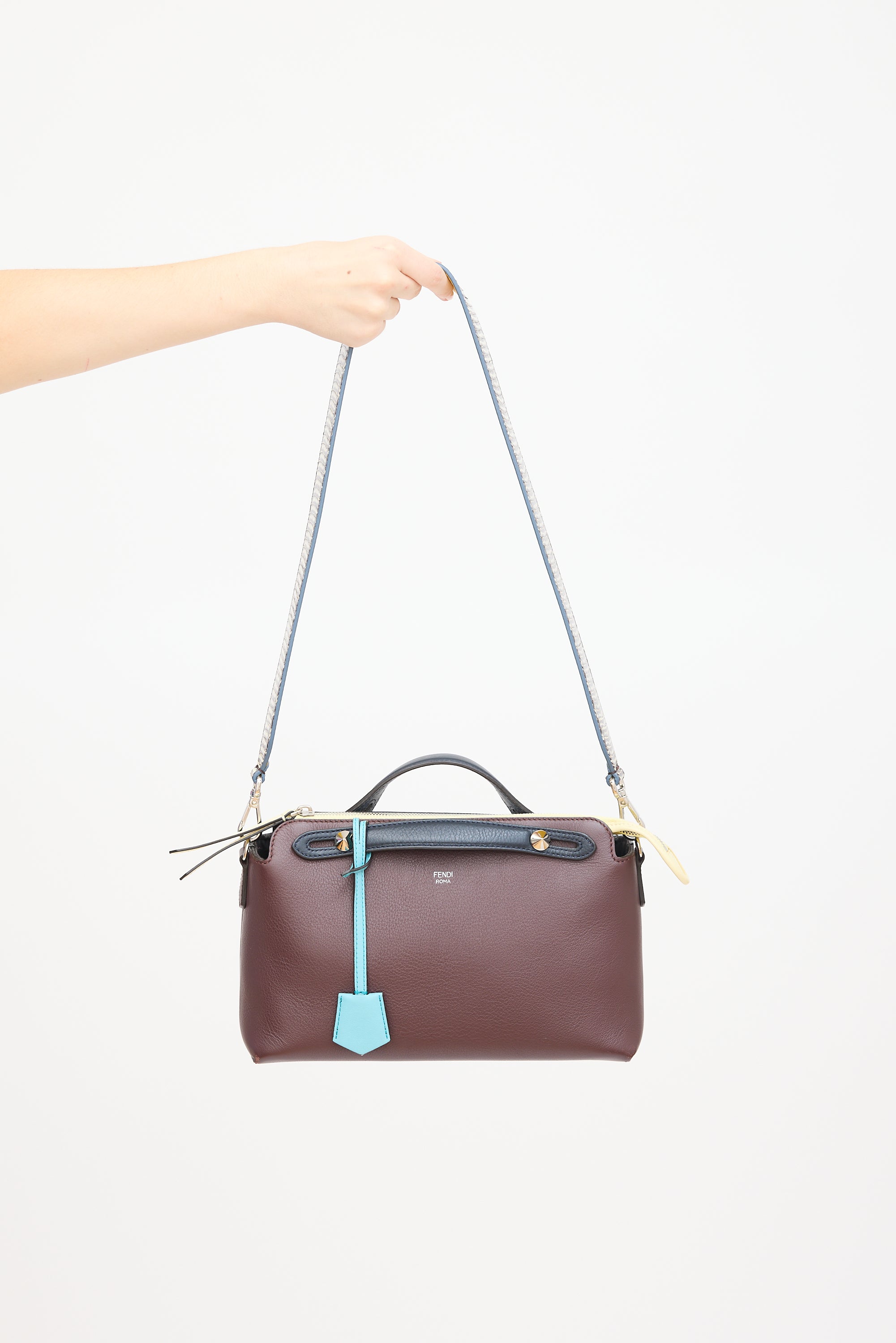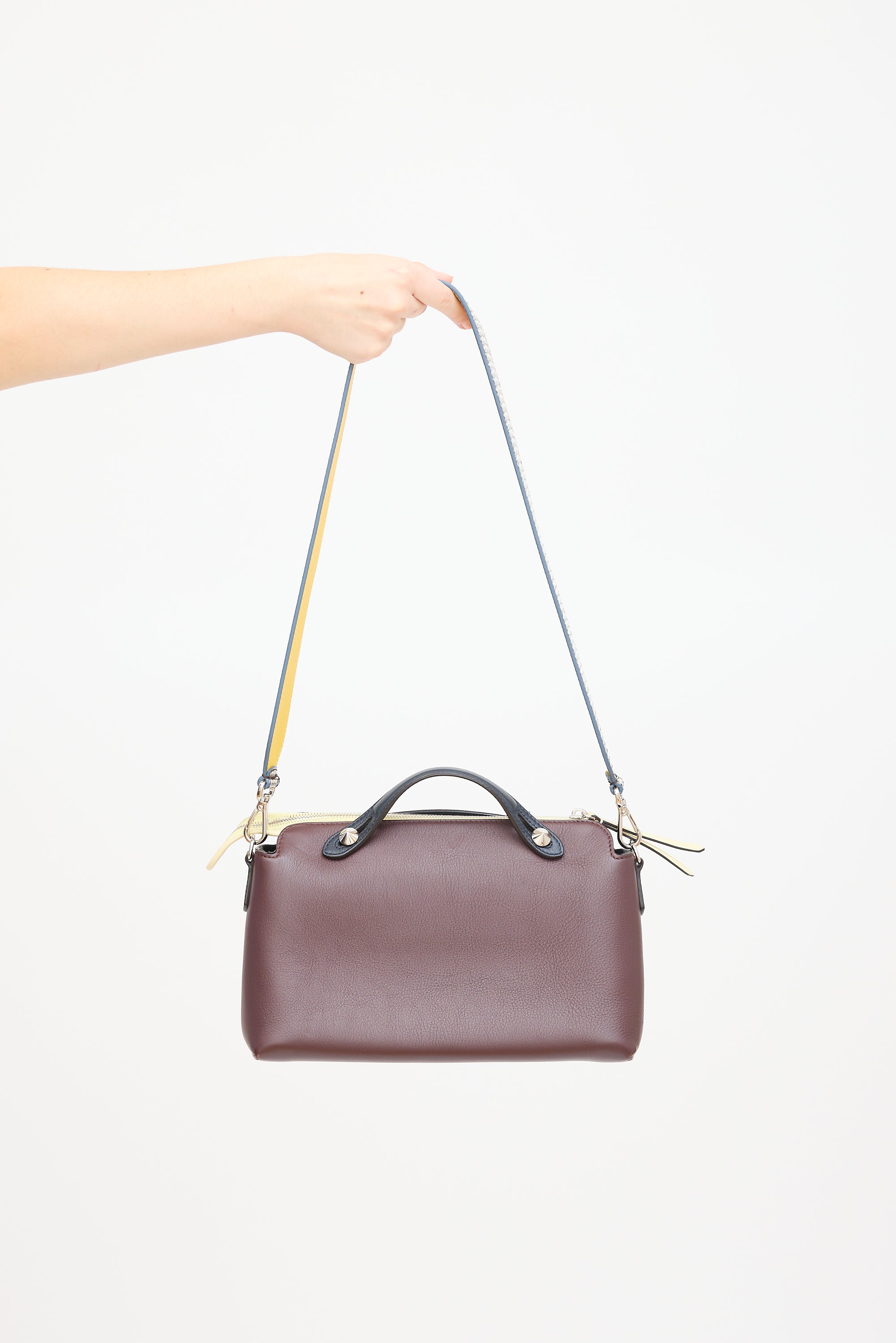 Pre-owned Fendi burgundy leather By The Way bag featuring dual top handles, removable clochette charm with logo plaque at handle, removable textured leather shoulder strap, removable and adjustable smooth leather shoulder strap, top zip closure, and two lined main compartments with zippered divider and two slip pockets. Comes with original dust bag and care guide.
