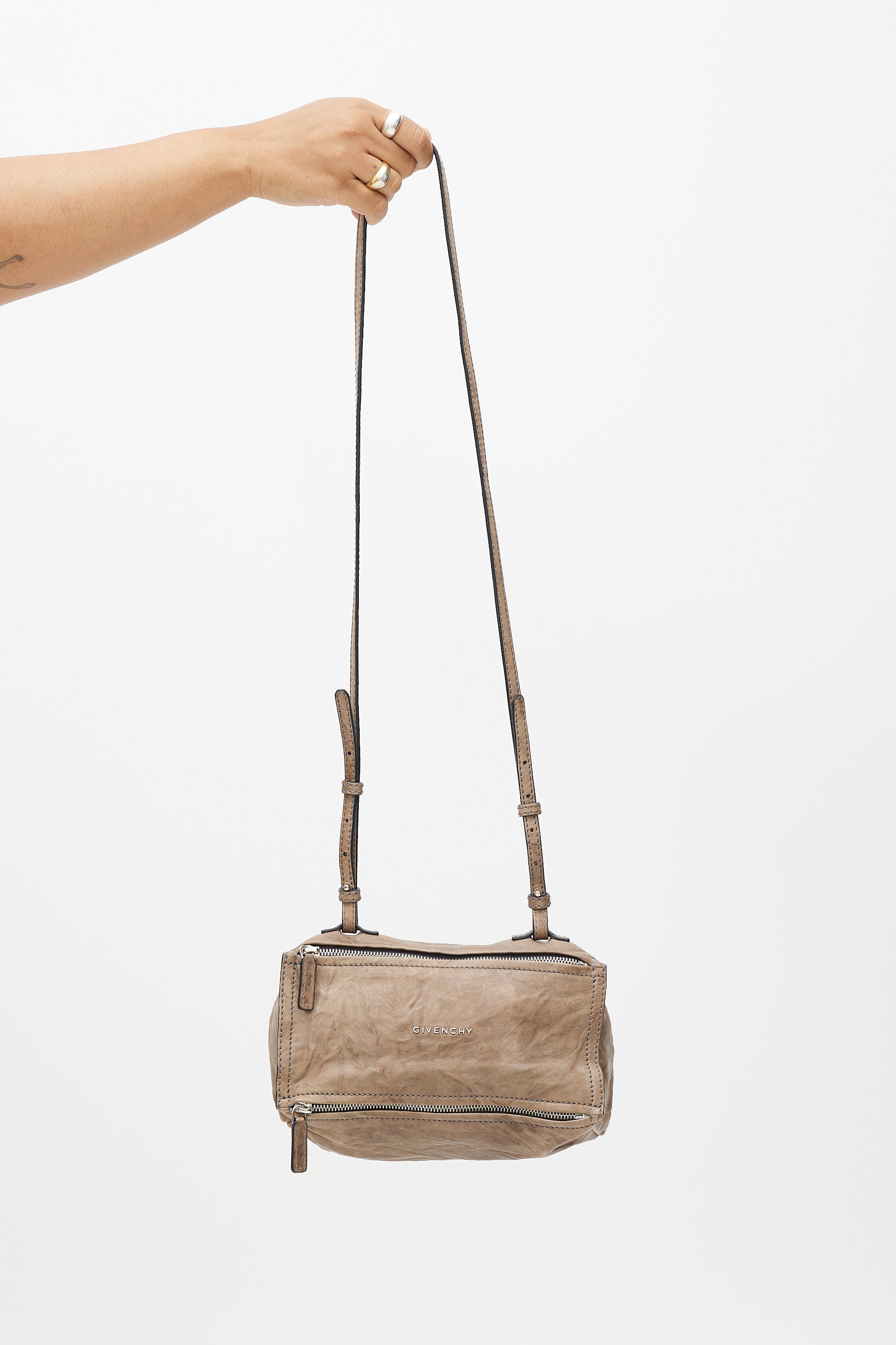 Pre-owned Givenchy brown Pandora leather bag featuring silver tone logo hardware at front, one zip pocket at bottom, one main compartment with one zip pocket, removable shoulder strap, and top zip closure. Comes with original dust bag.