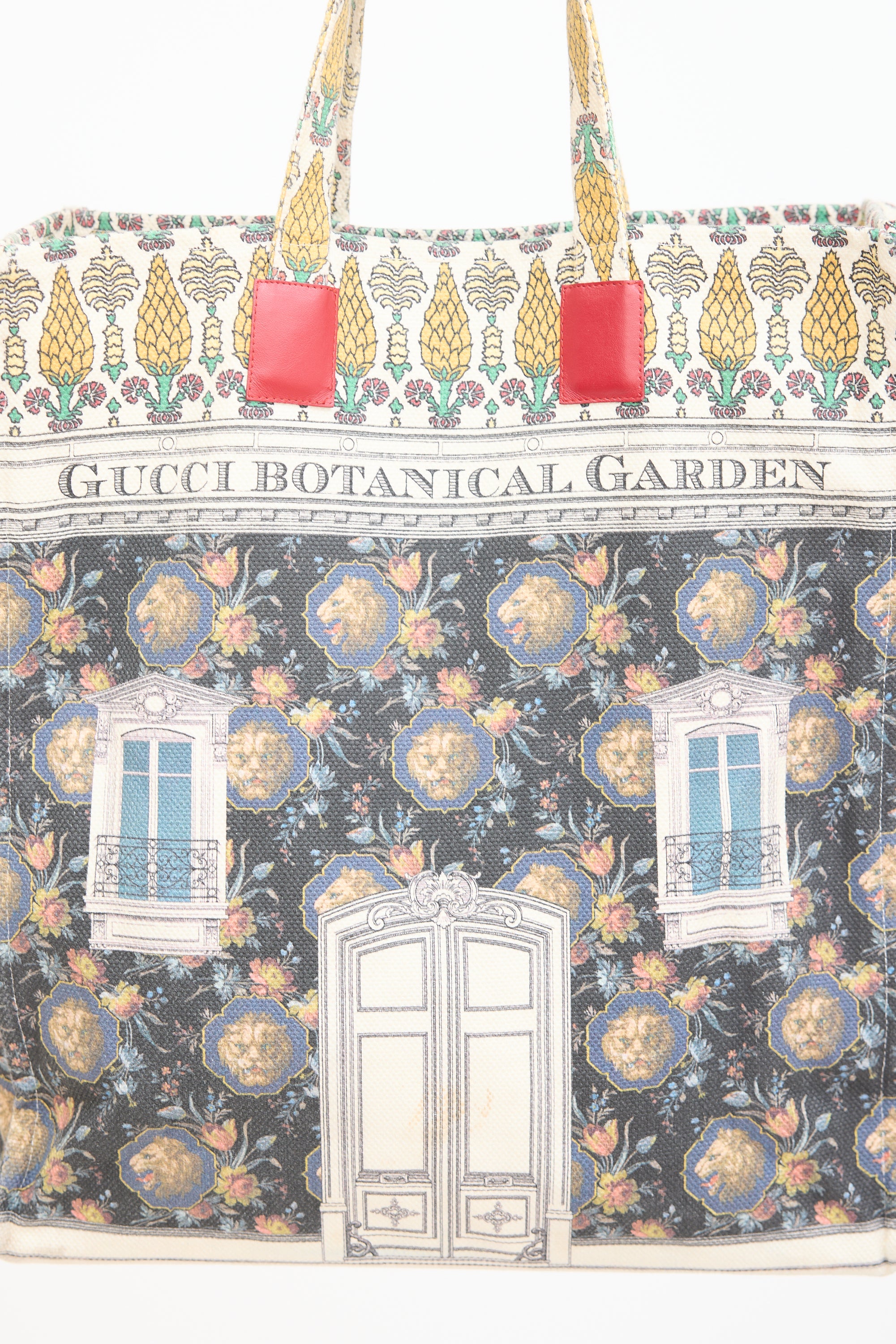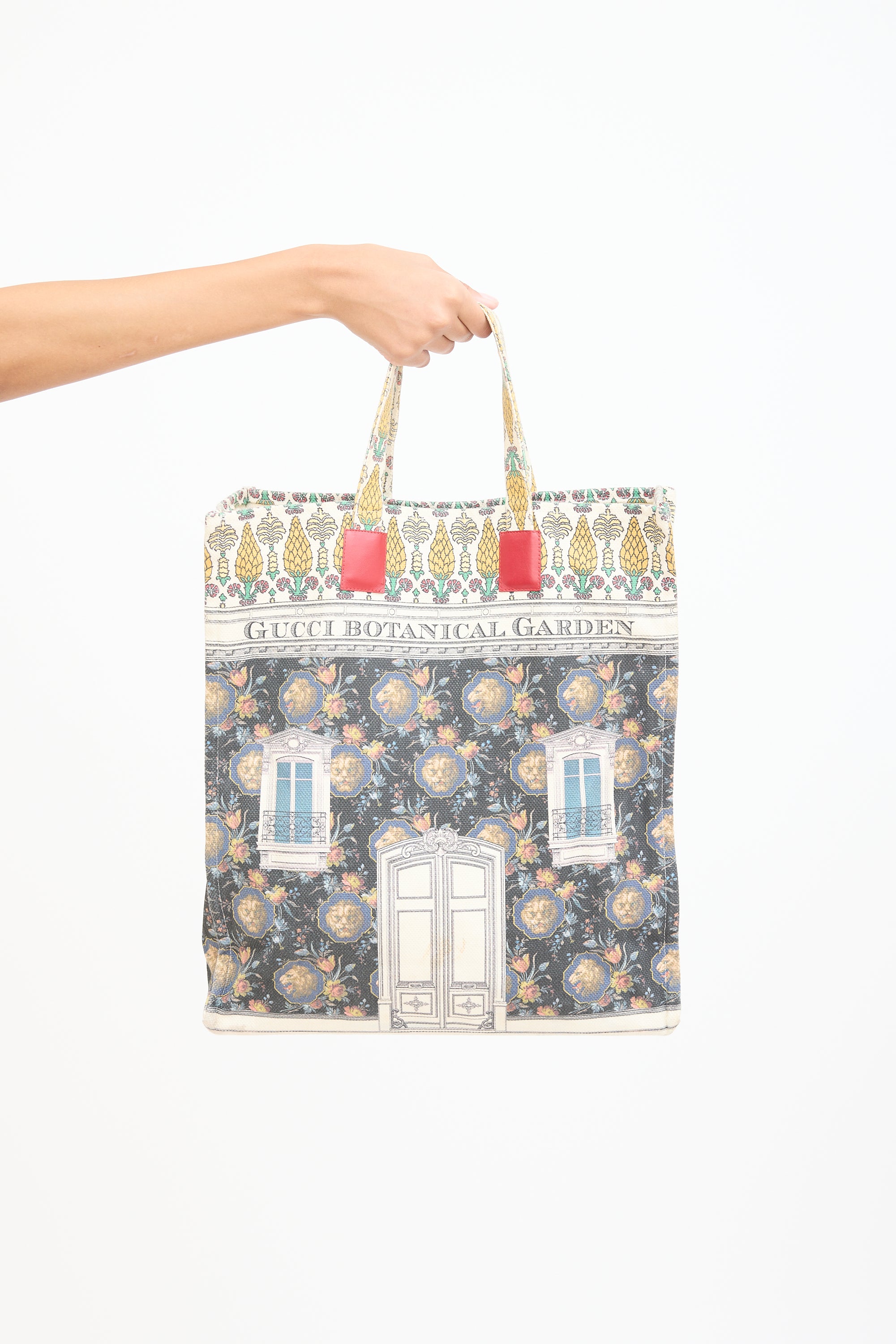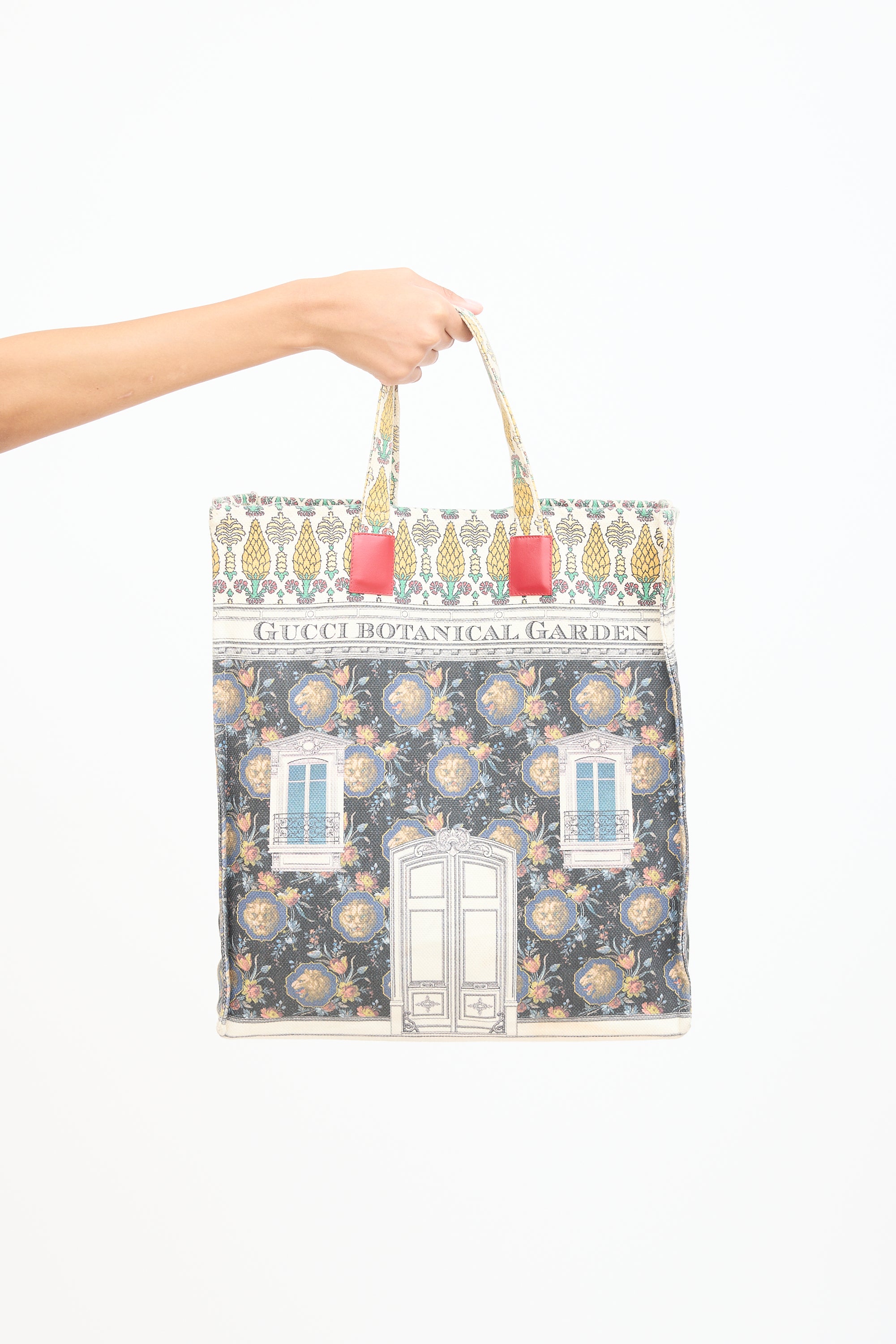 Pre-owned Gucci cream tote featuring a multicolour botanical garden pattern throughout, two top handles, and one main compartment.