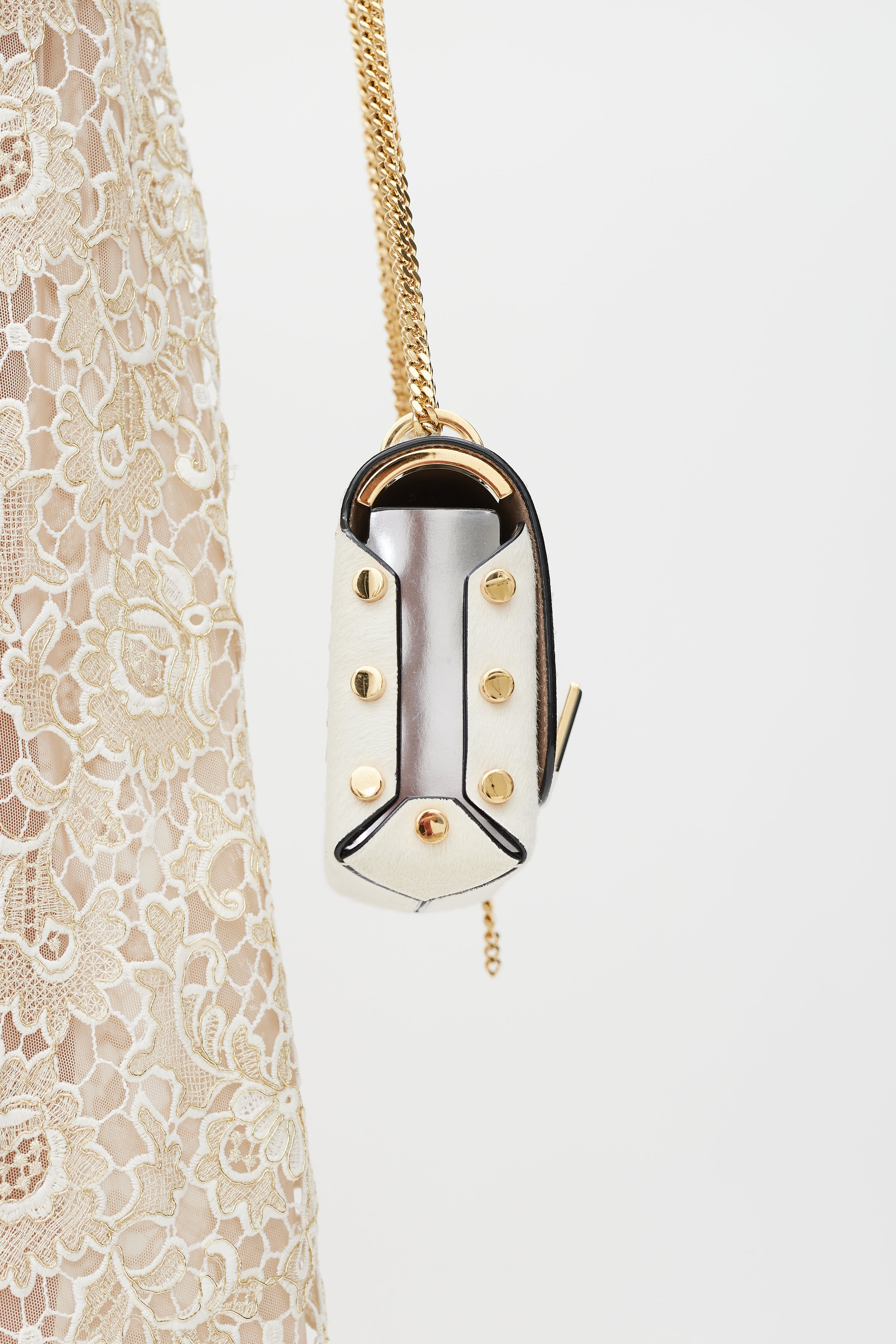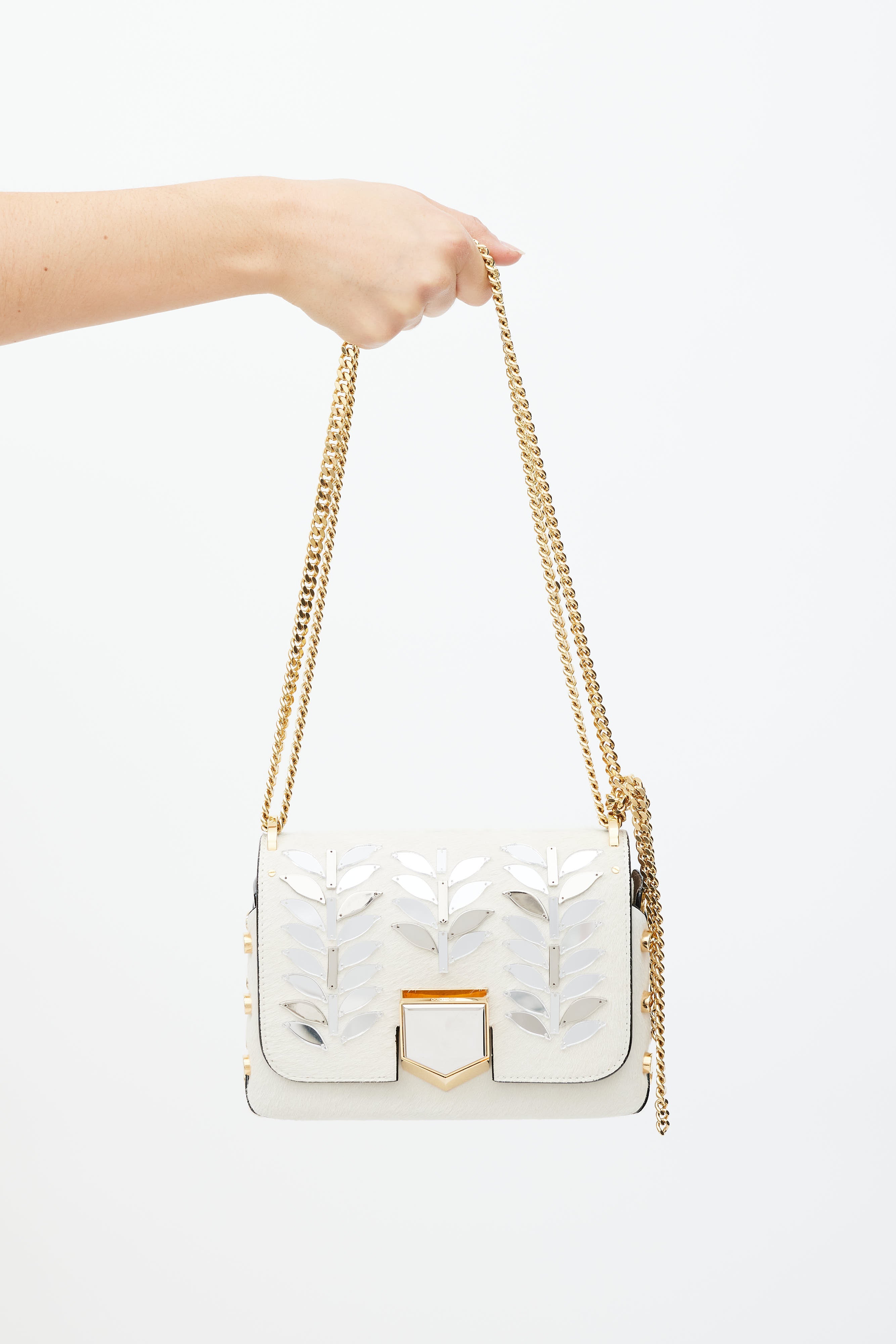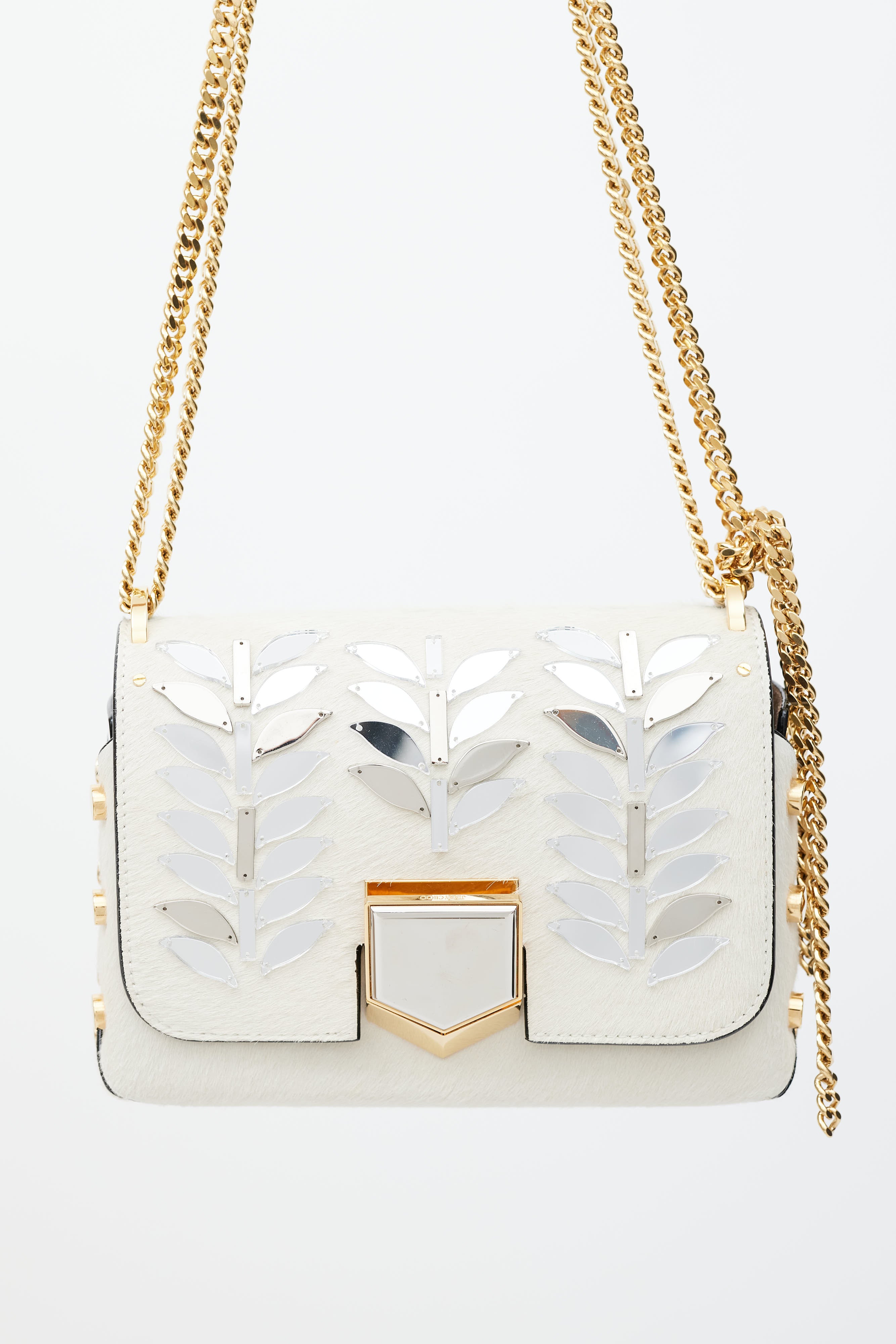 Pre-owned Jimmy Choo white Lockett bag in textured pony hair featuring a top flap, reflective mirror detailing, one main compartment, chainlink shoulder strap with knotted detail, gold tone hardware at sides, and clasp closure. Comes with original box.