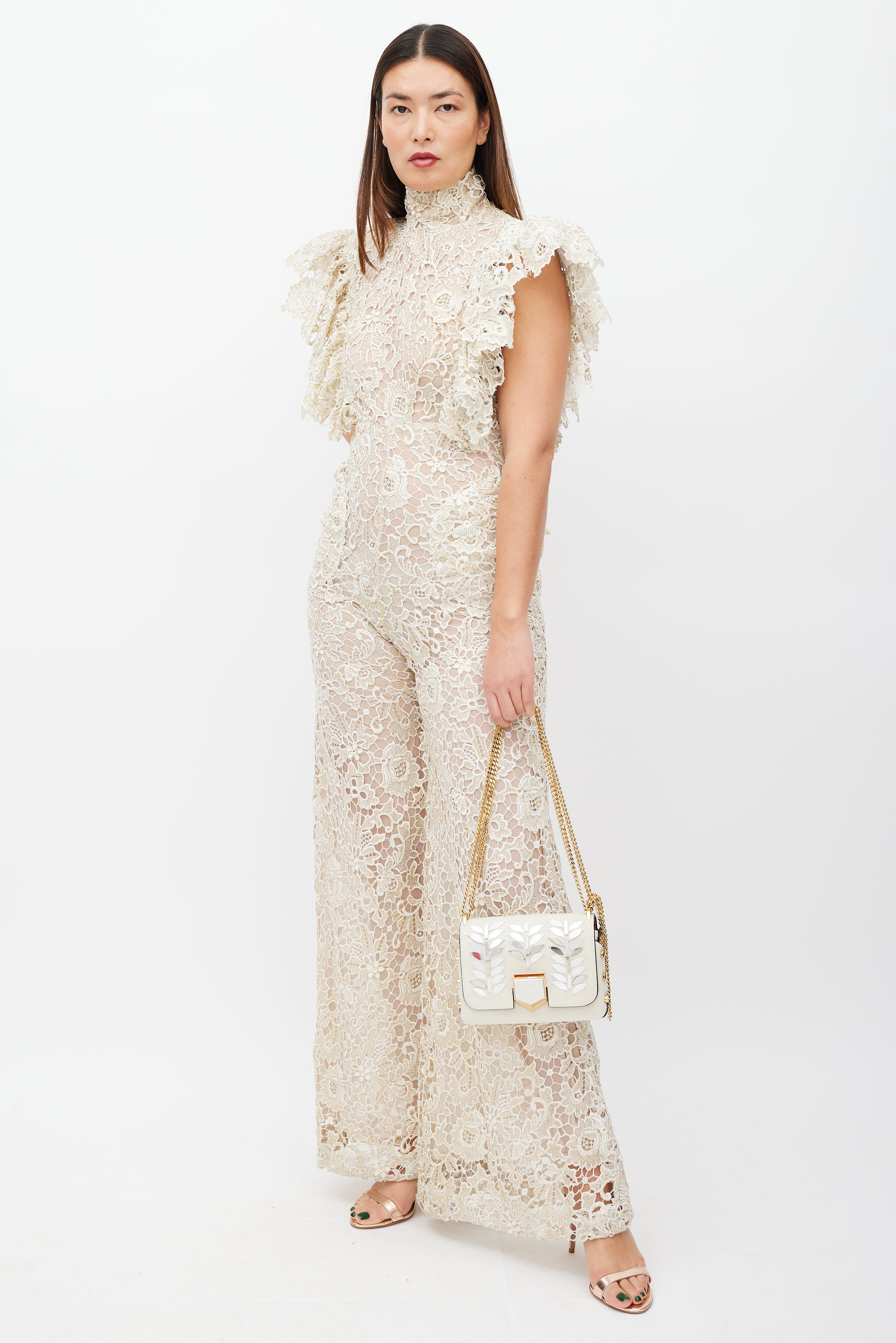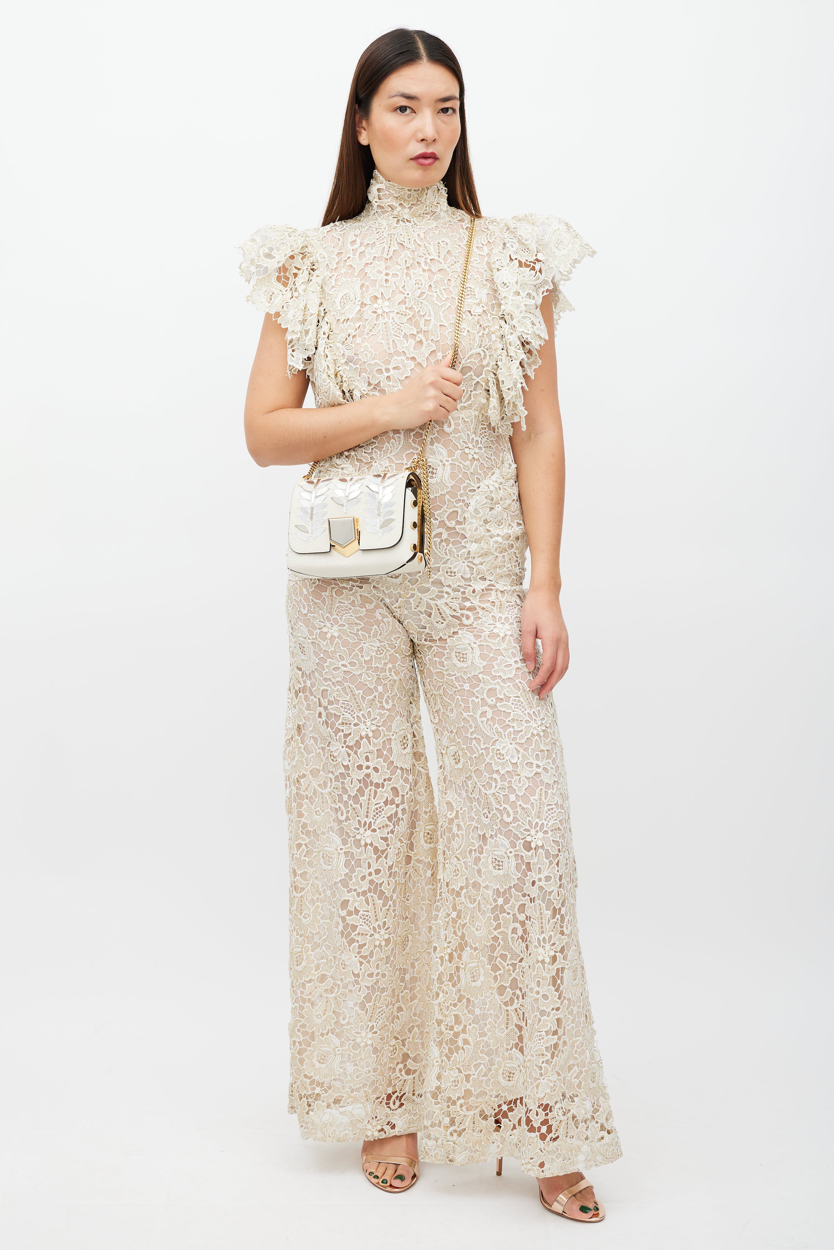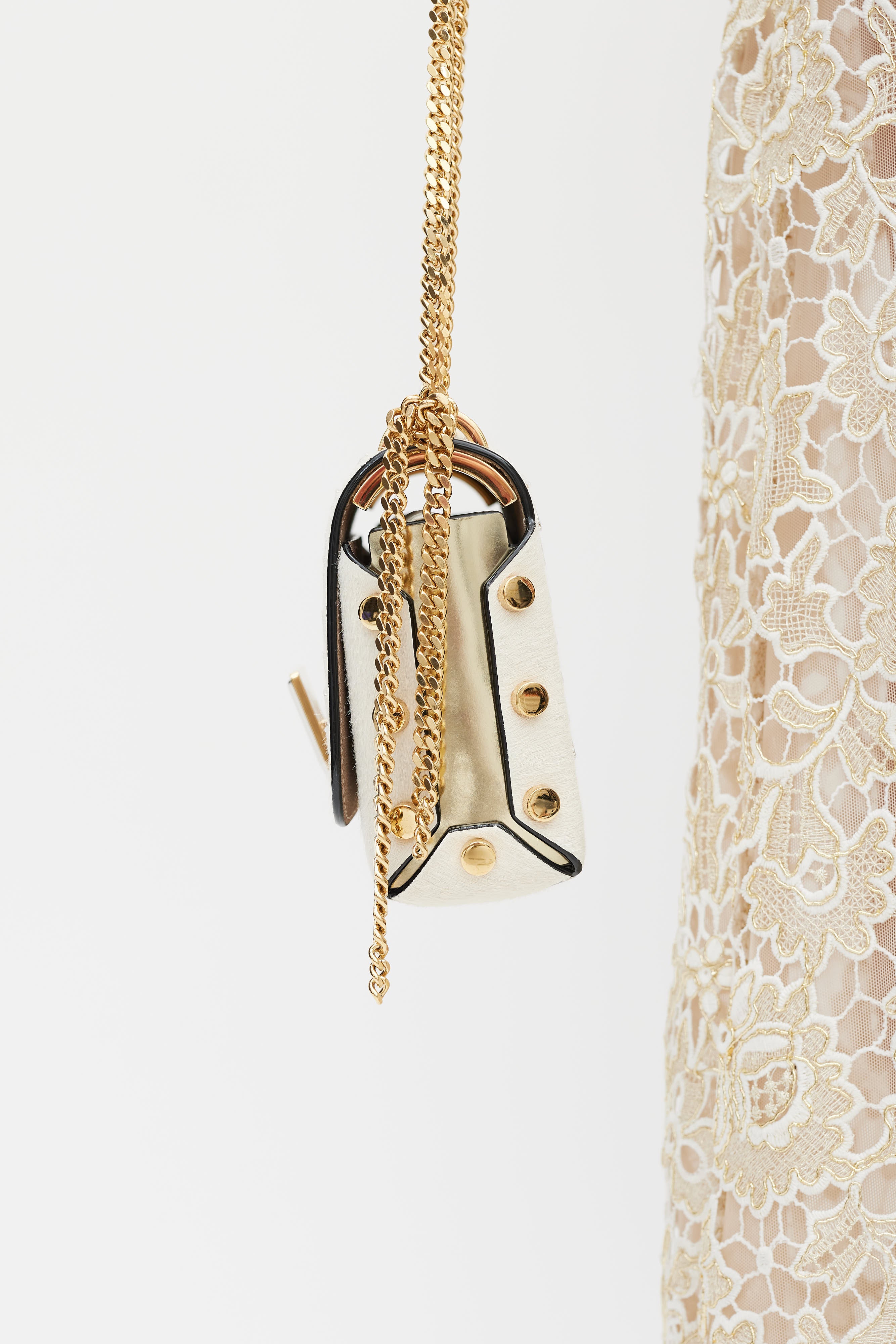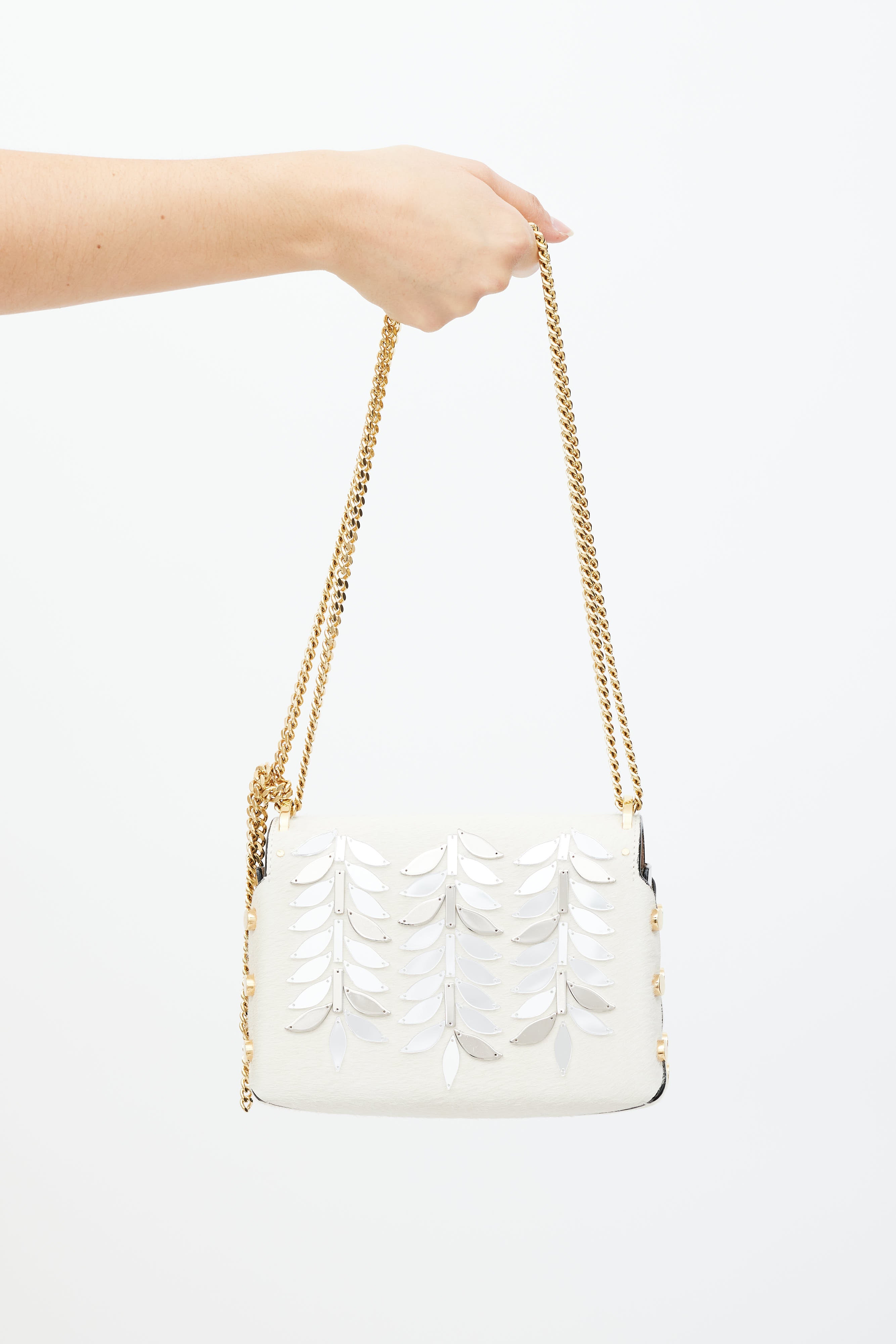 Pre-owned Jimmy Choo white Lockett bag in textured pony hair featuring a top flap, reflective mirror detailing, one main compartment, chainlink shoulder strap with knotted detail, gold tone hardware at sides, and clasp closure. Comes with original box.