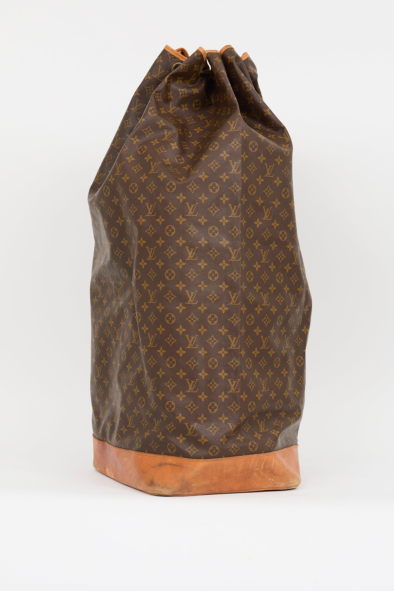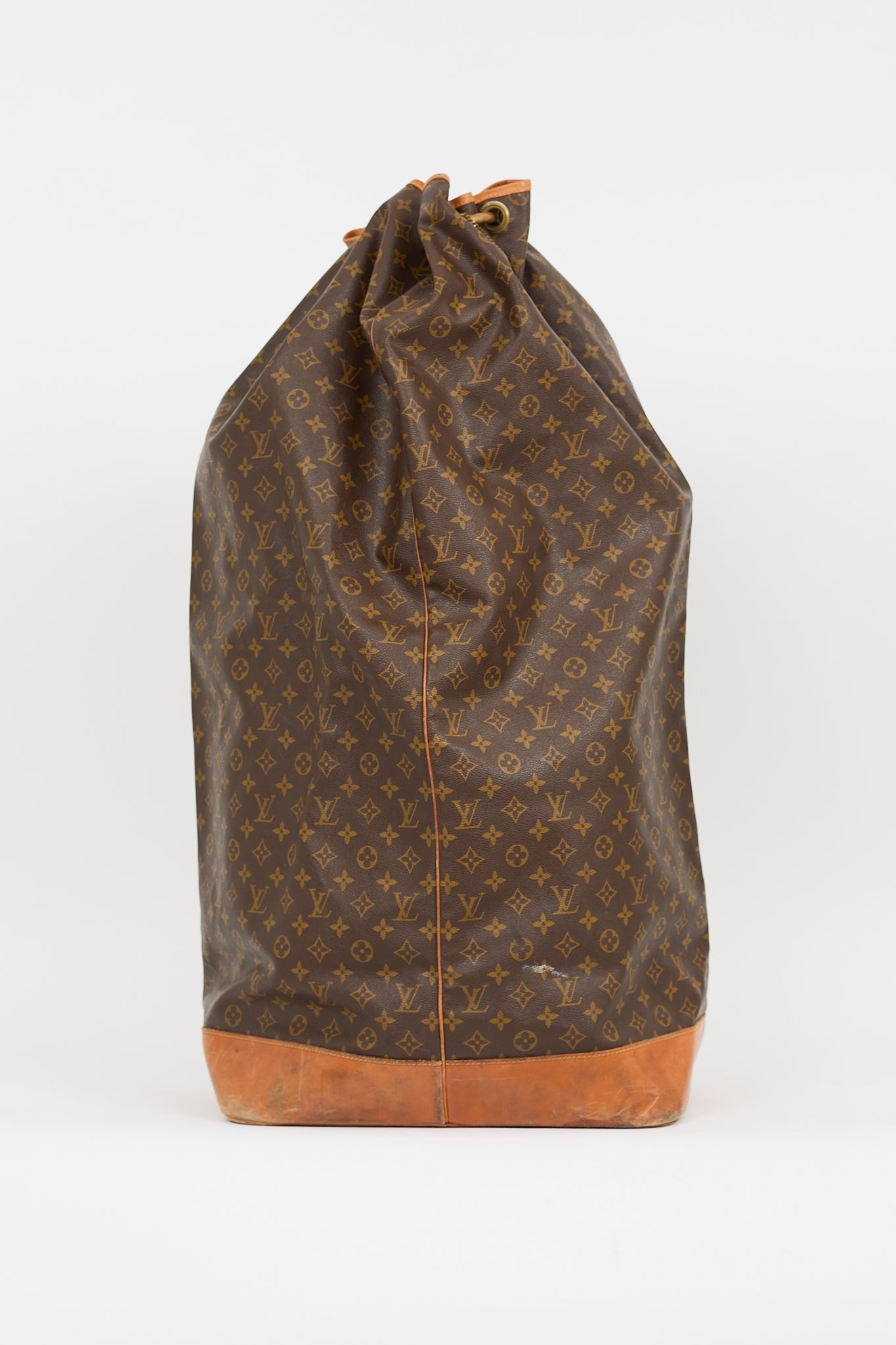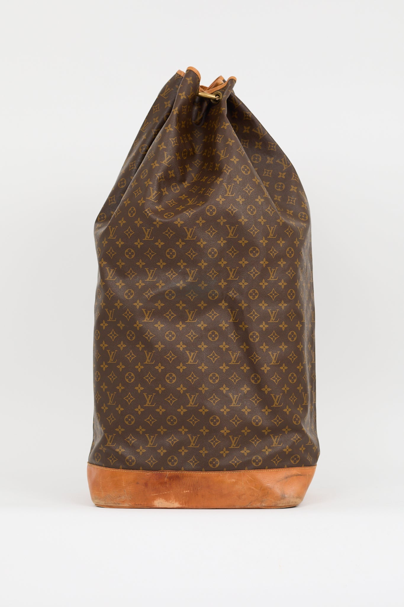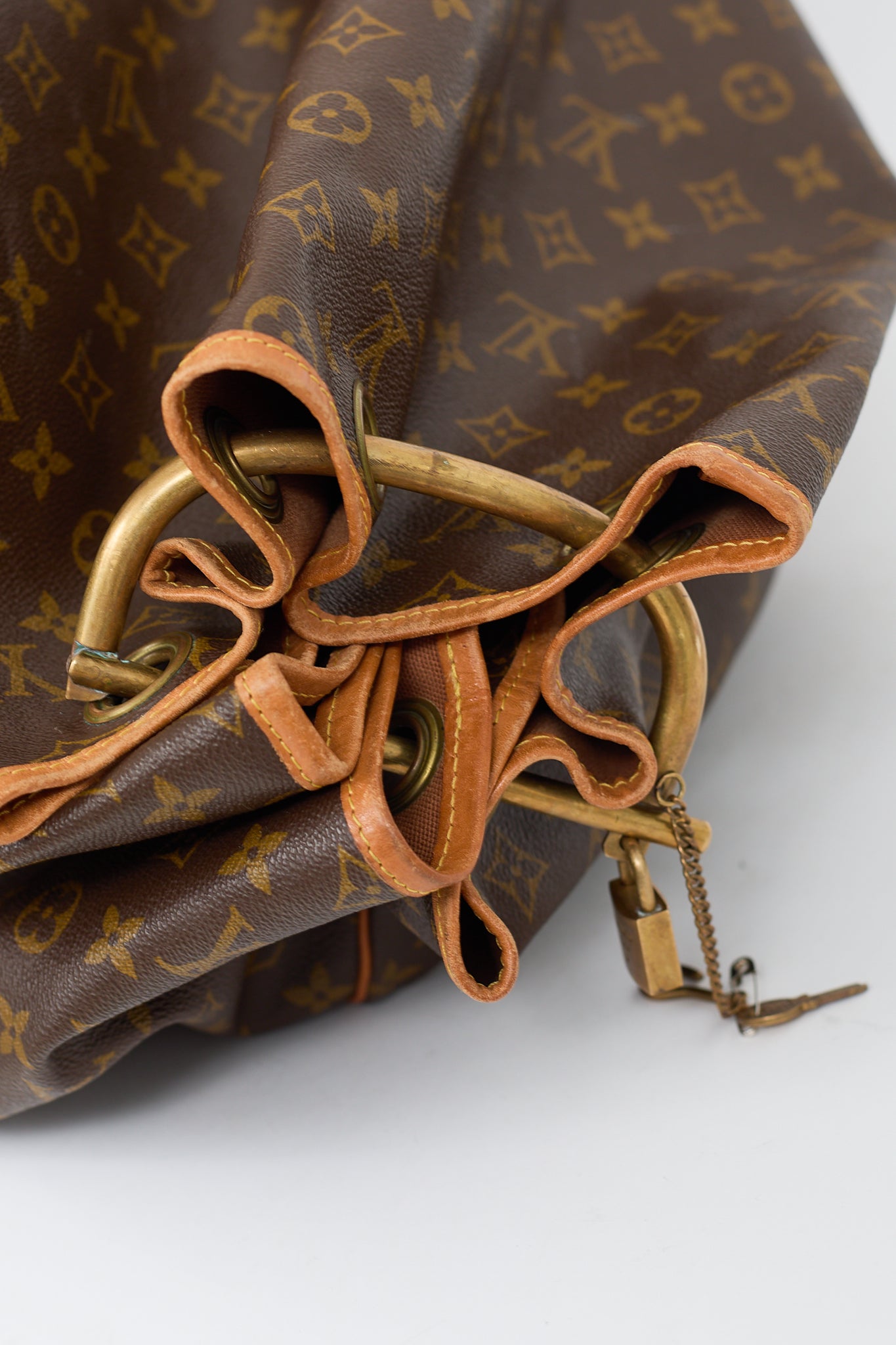 Pre-owned Louis Vuitton 1980s brown Marin sailor bag featuring monogram coated canvas, Vachetta leather trim, brass hardware, leather base with handle, open compartment, grommet at top, brass handle with detachable lock and key, detachable luggage tag, two D-ring inside, and canvas lining.