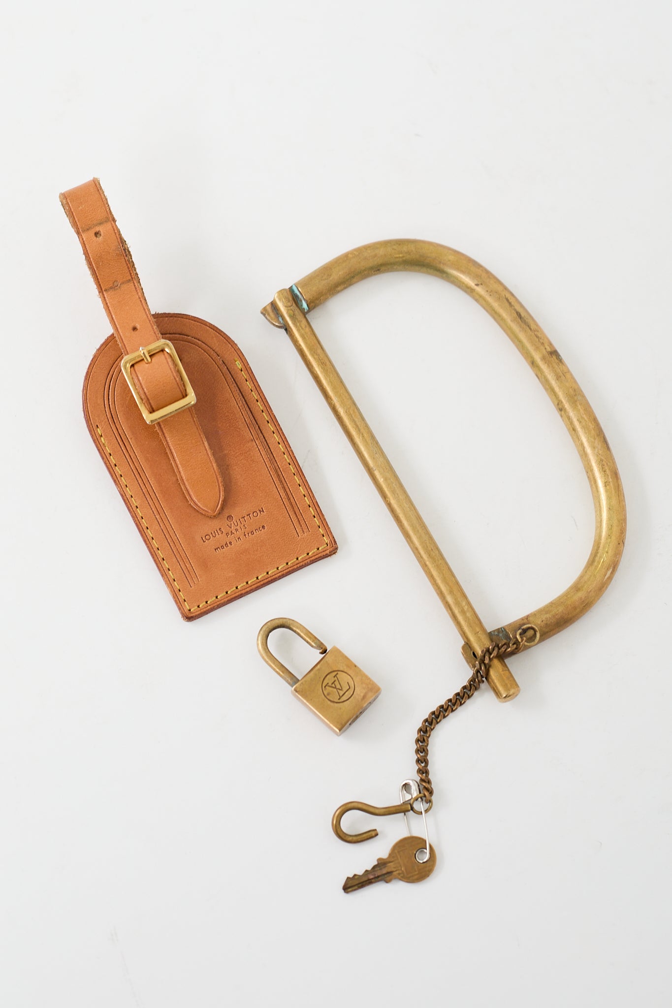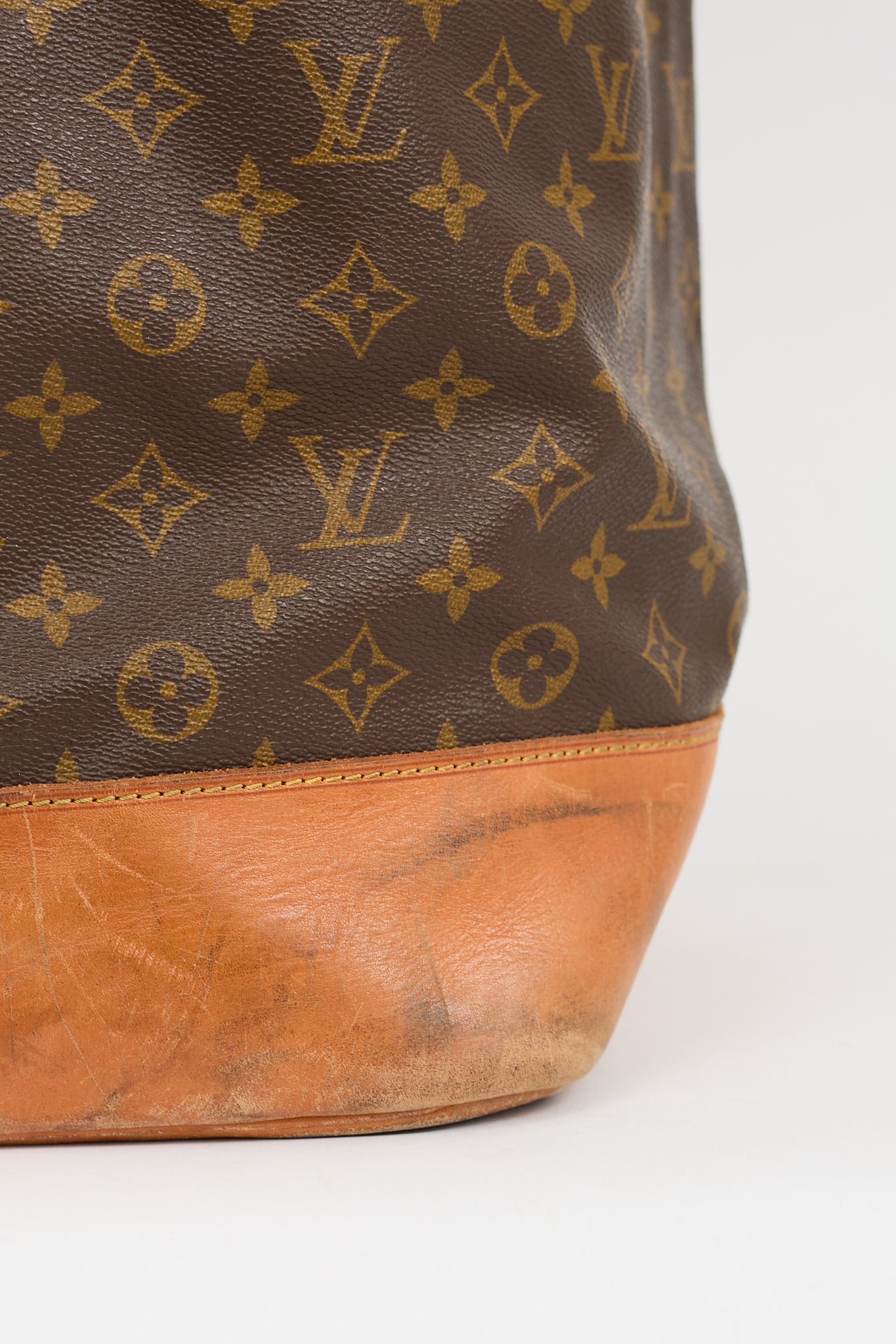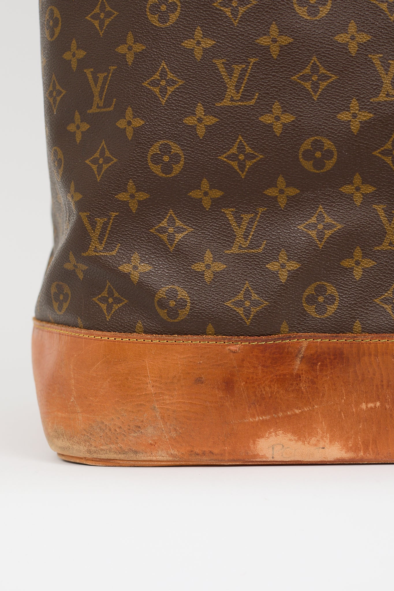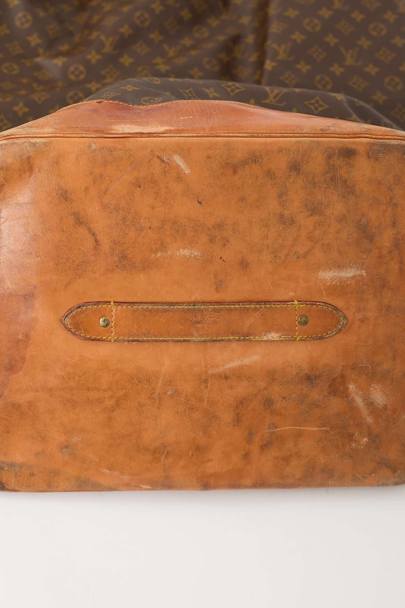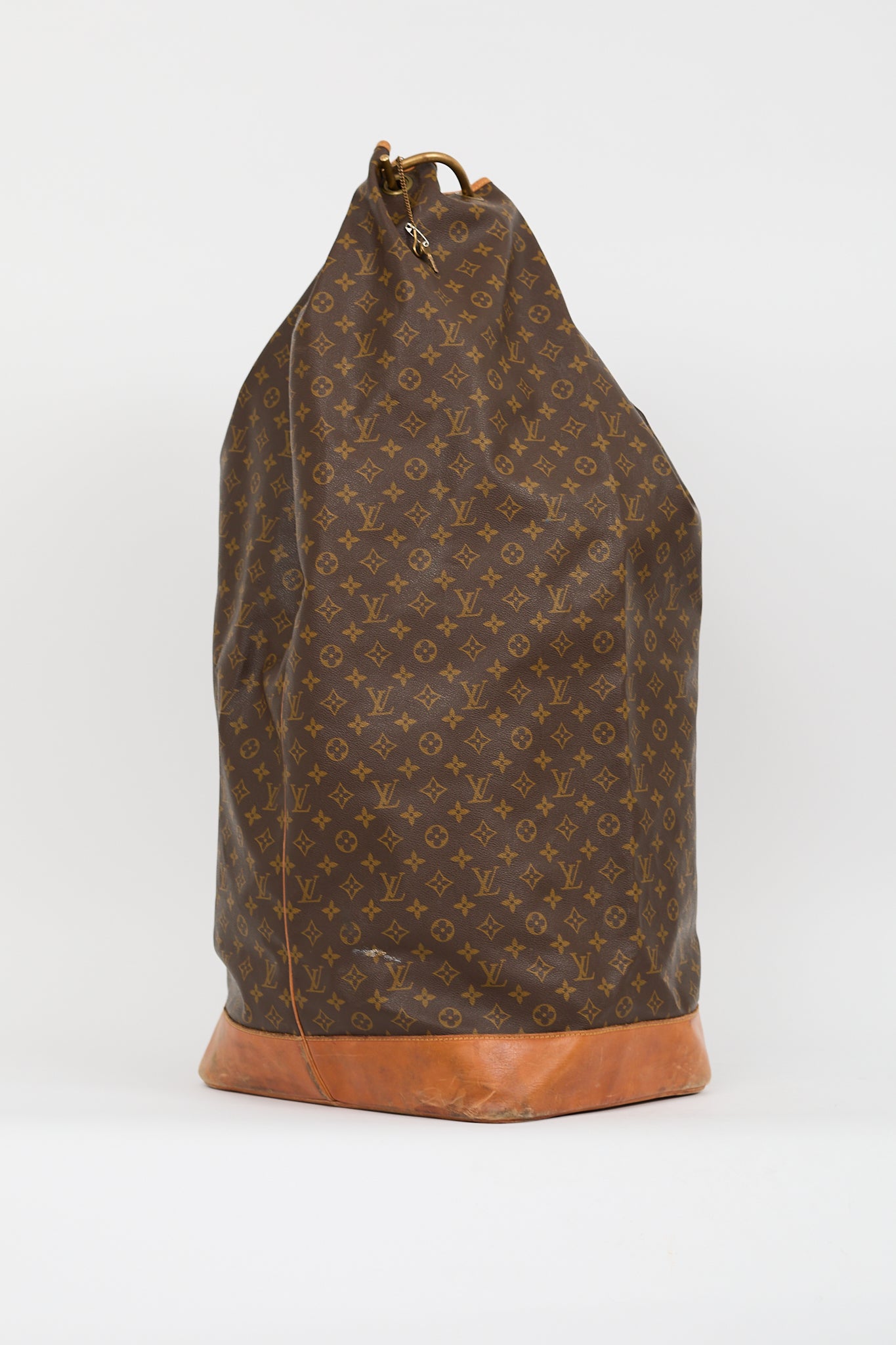 Pre-owned Louis Vuitton 1980s brown Marin sailor bag featuring monogram coated canvas, Vachetta leather trim, brass hardware, leather base with handle, open compartment, grommet at top, brass handle with detachable lock and key, detachable luggage tag, two D-ring inside, and canvas lining.