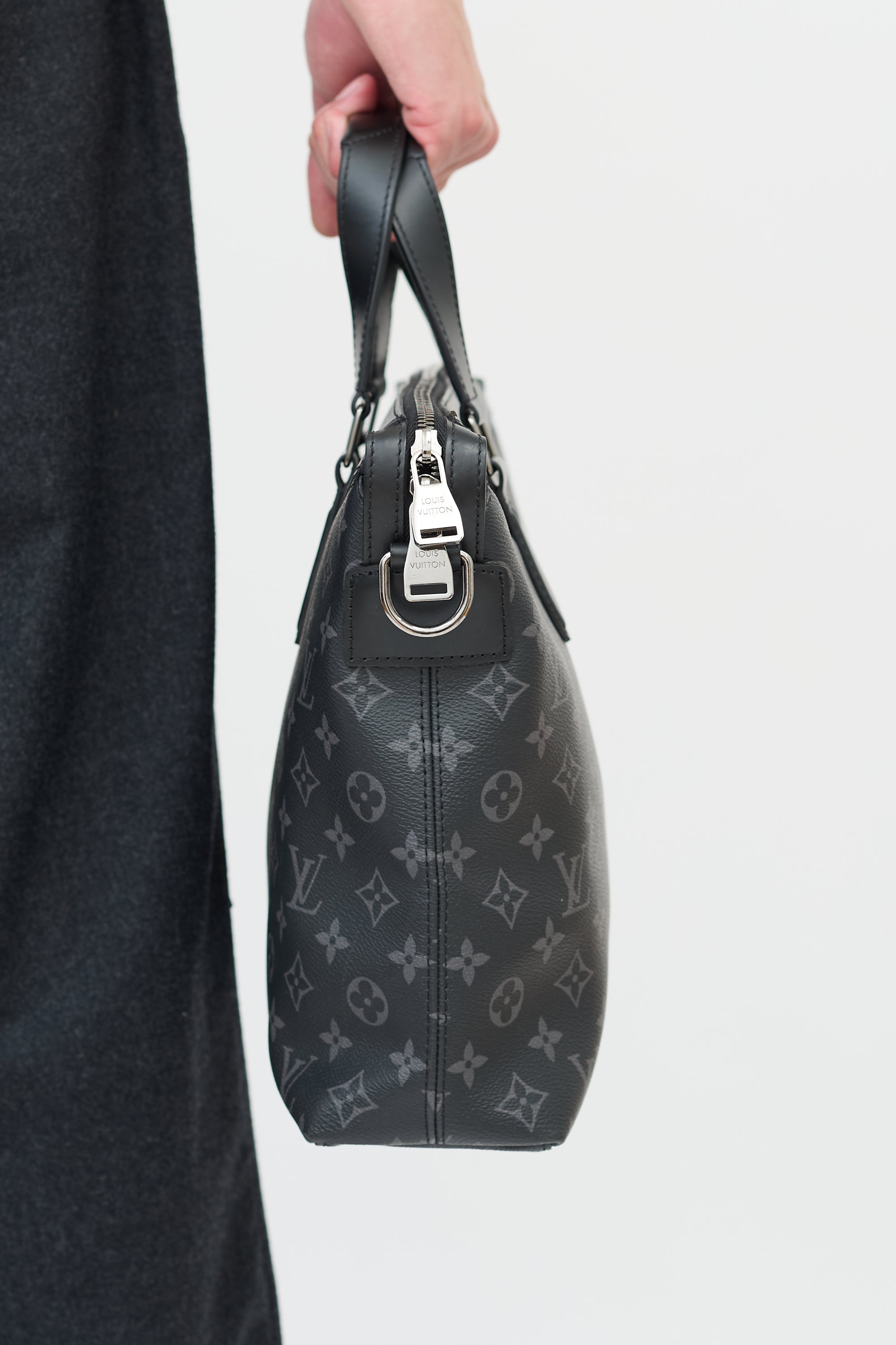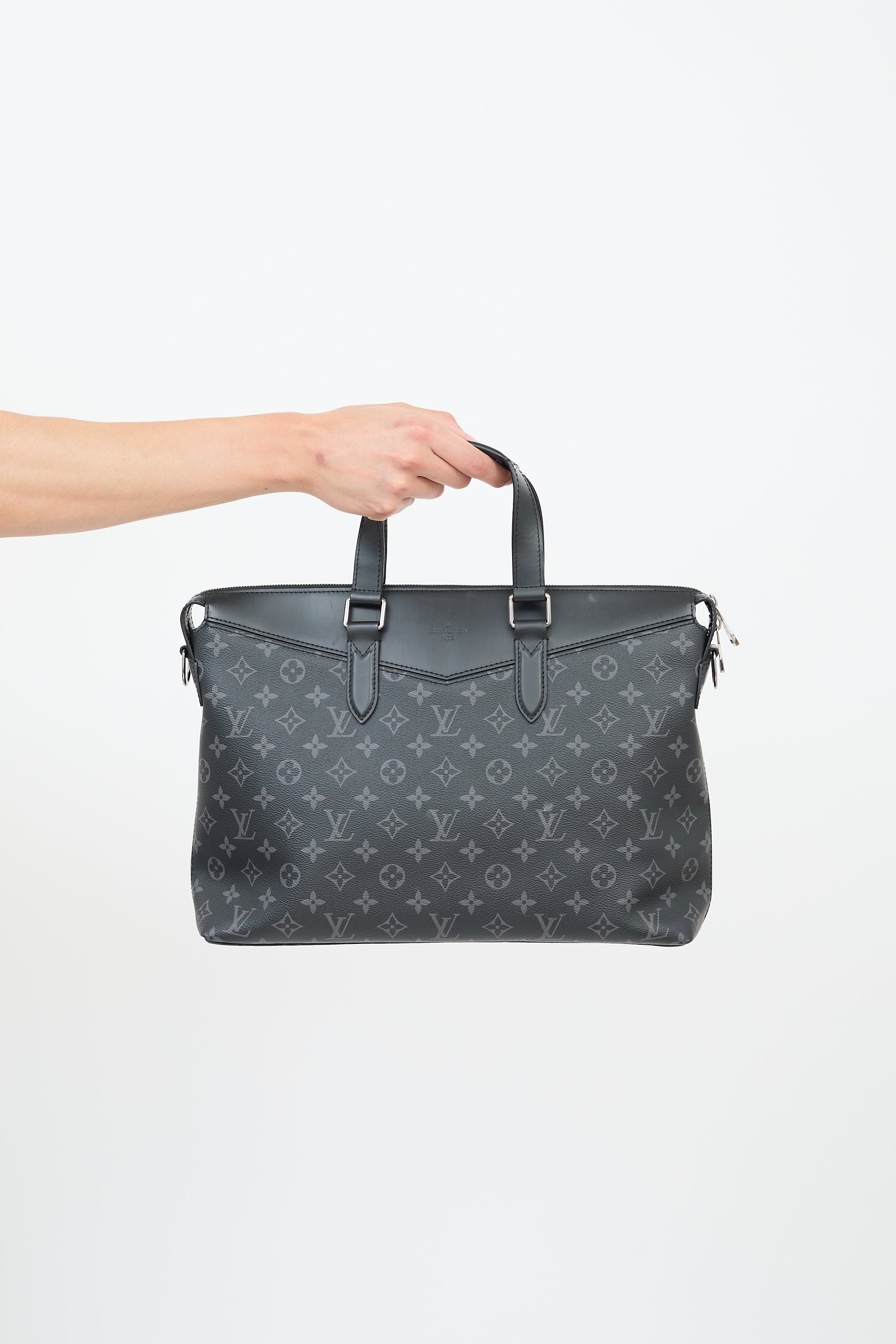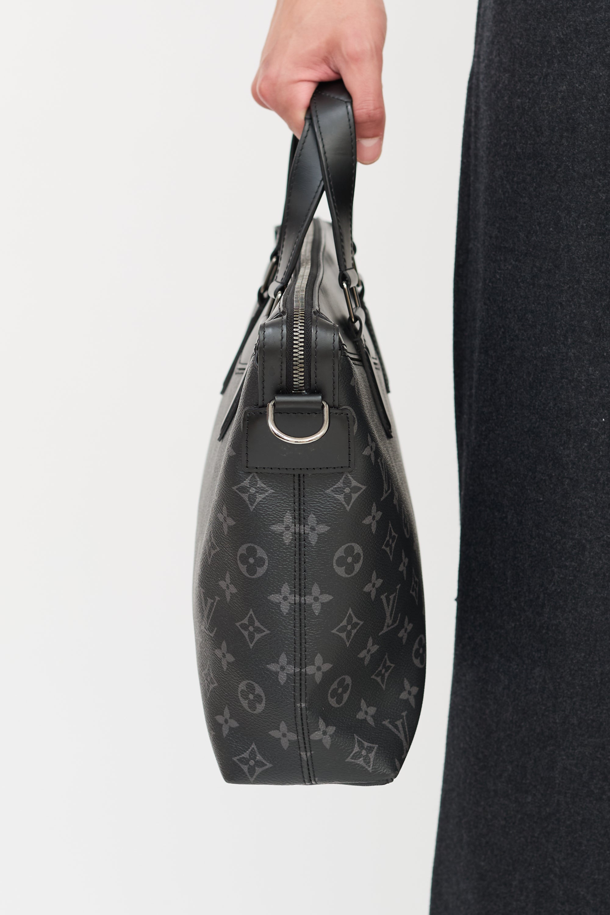 Pre-owned Louis Vuitton black Explorer briefcase featuring Monogram Eclipse canvas body, tonal stitching, silver tone hardware, black smooth leather top panelling with stamped logo at front, dual flat top handles, detachable and adjustable shoulder strap, top double zip closure, and one lined main compartment with four slip pockets.